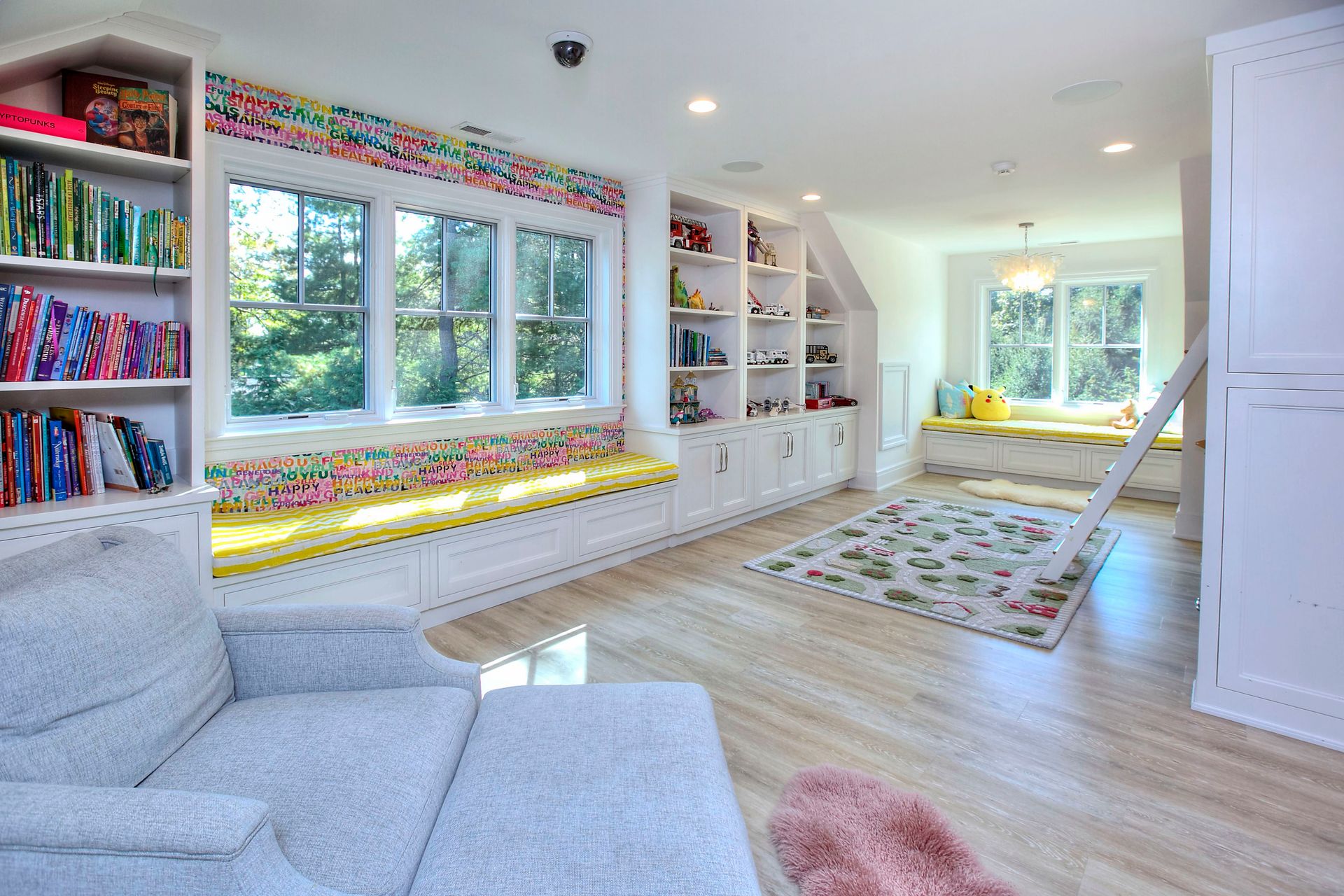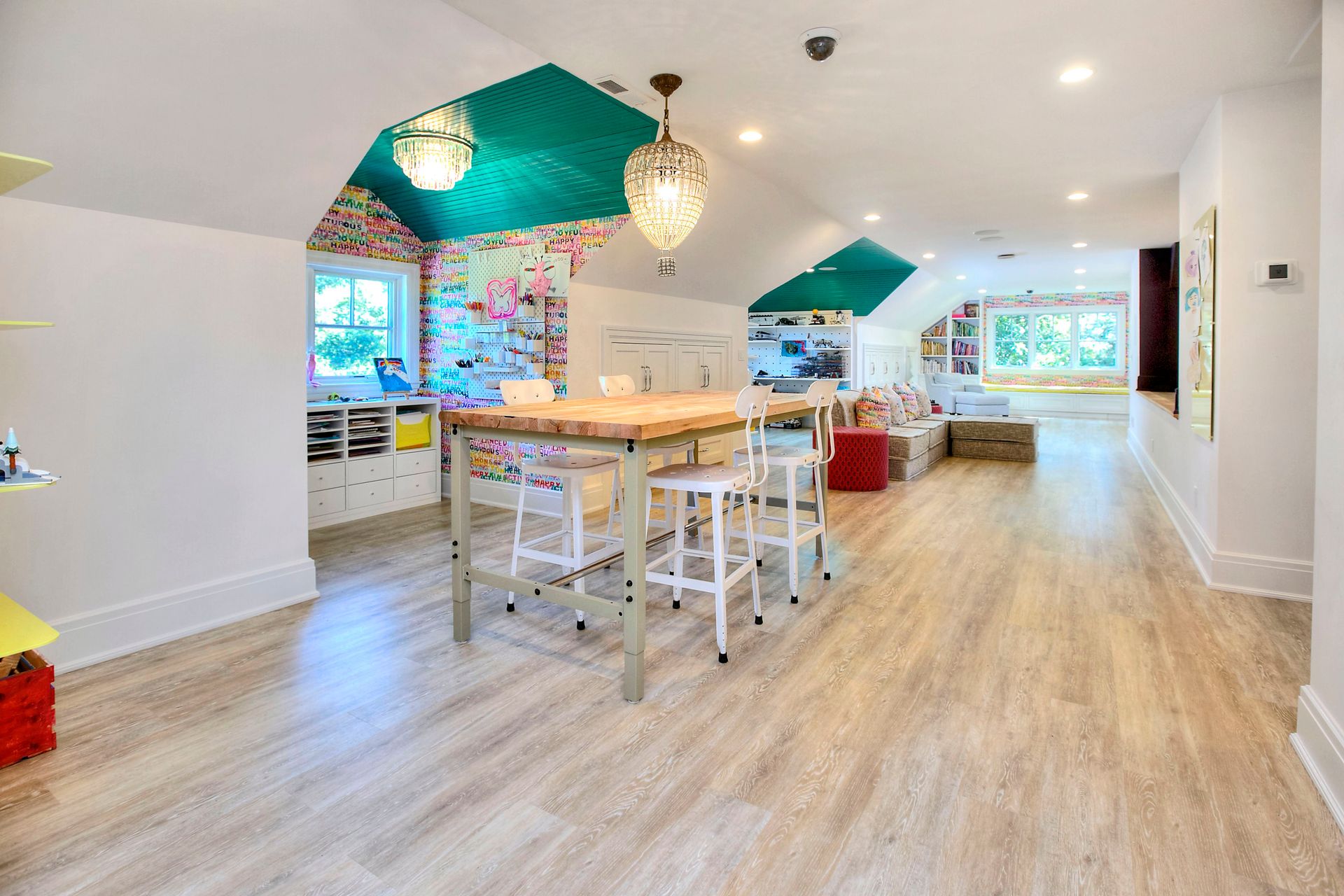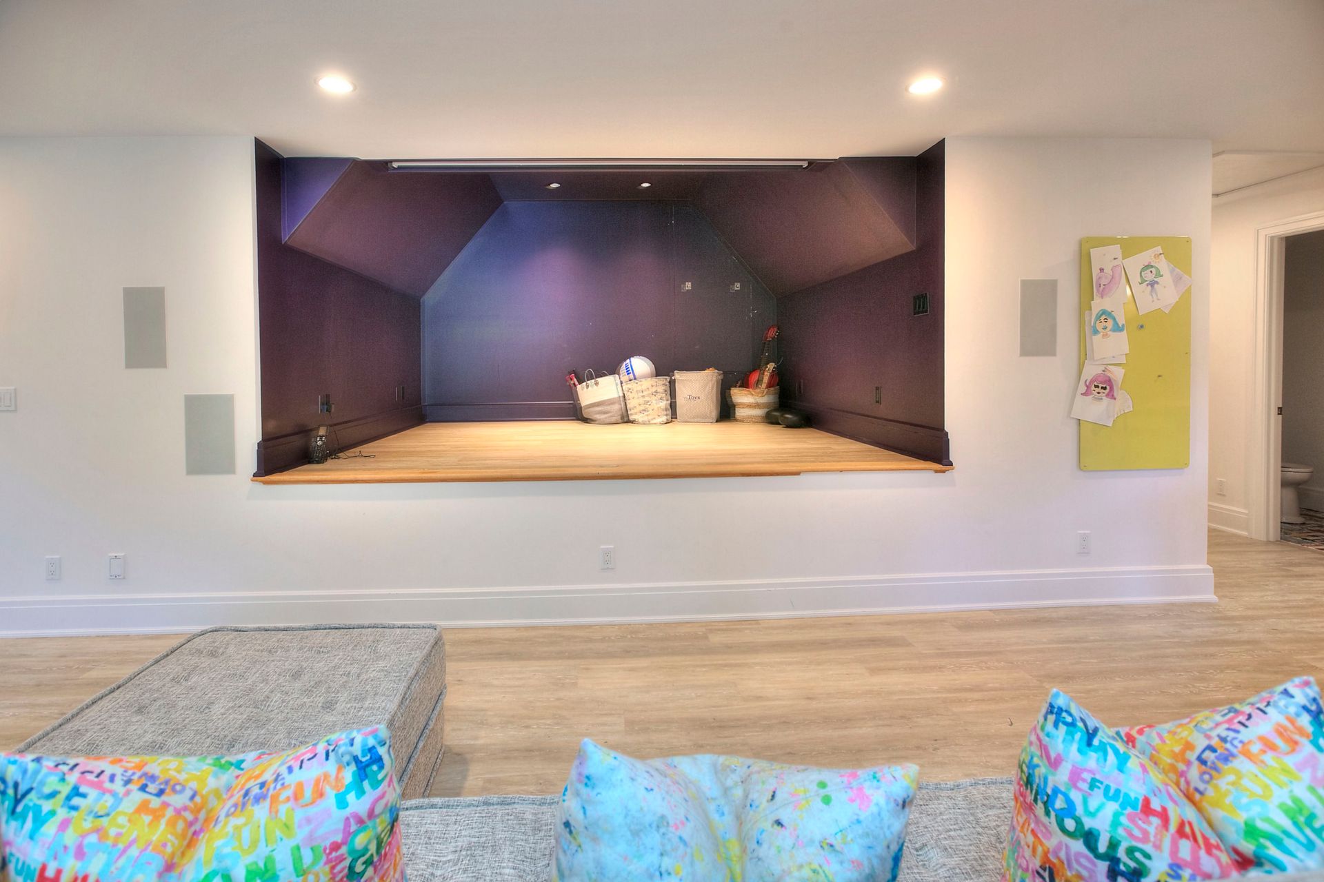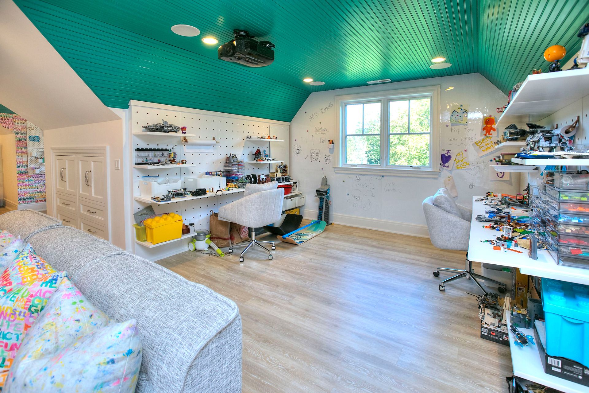A finished third floor offers bunk beds for sleepovers, a performance stage, an art area, a lounge, a cedar closet and abundant storage.