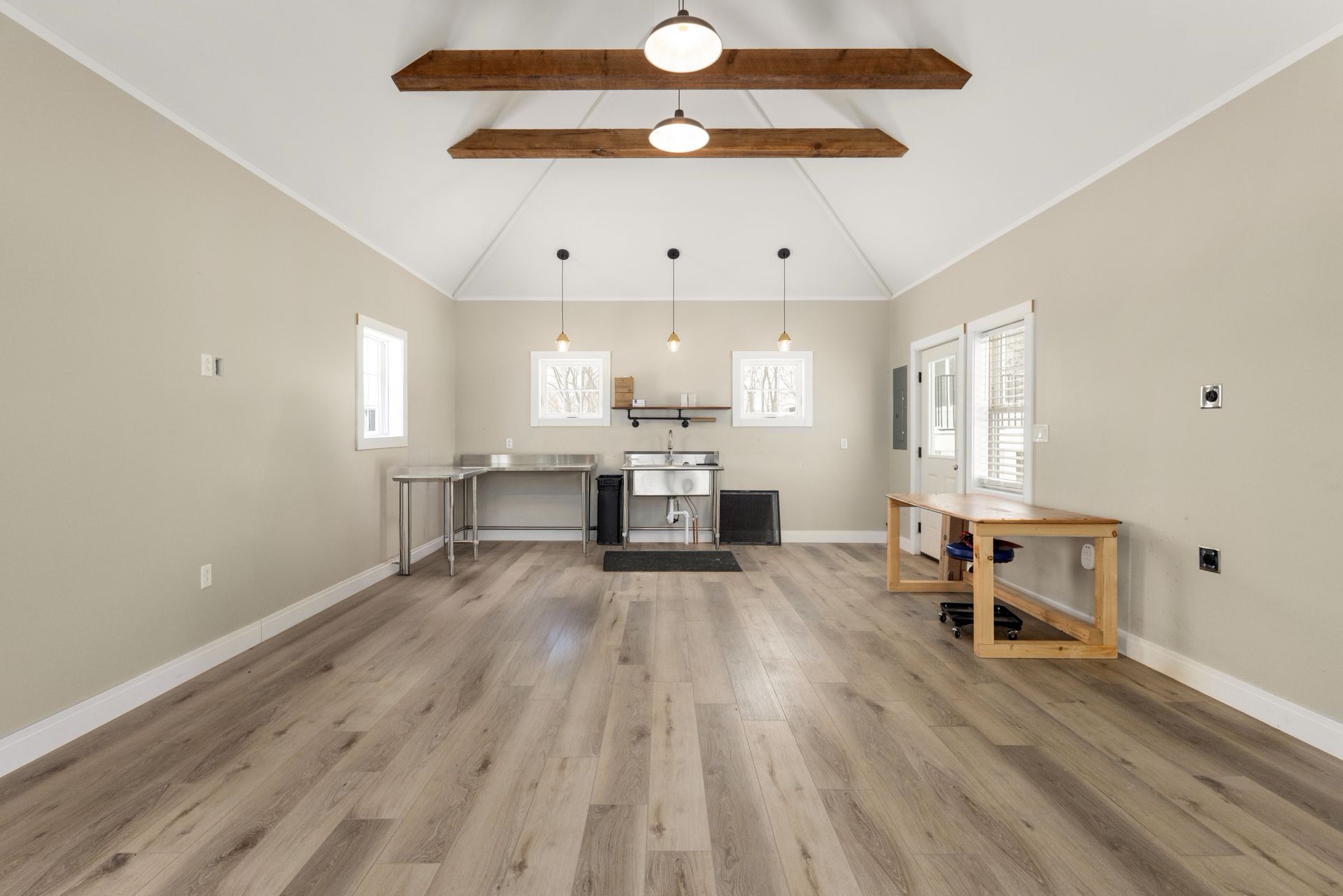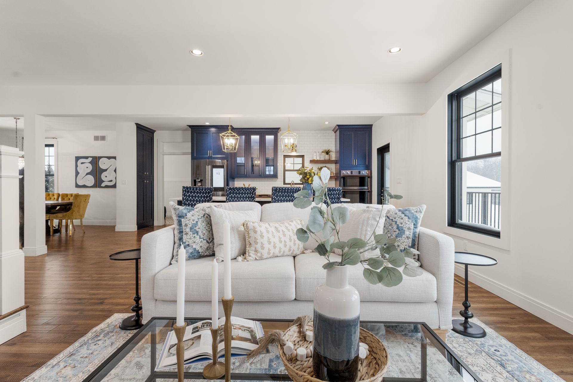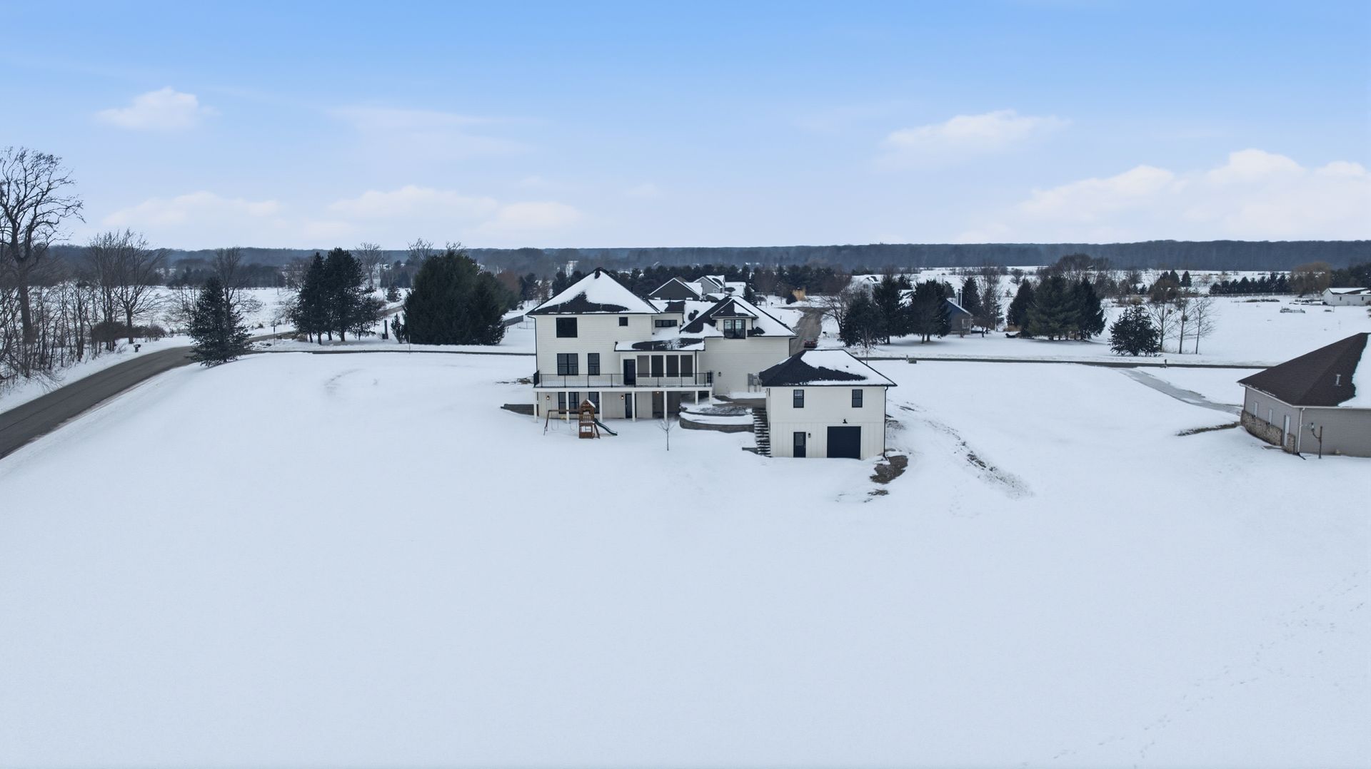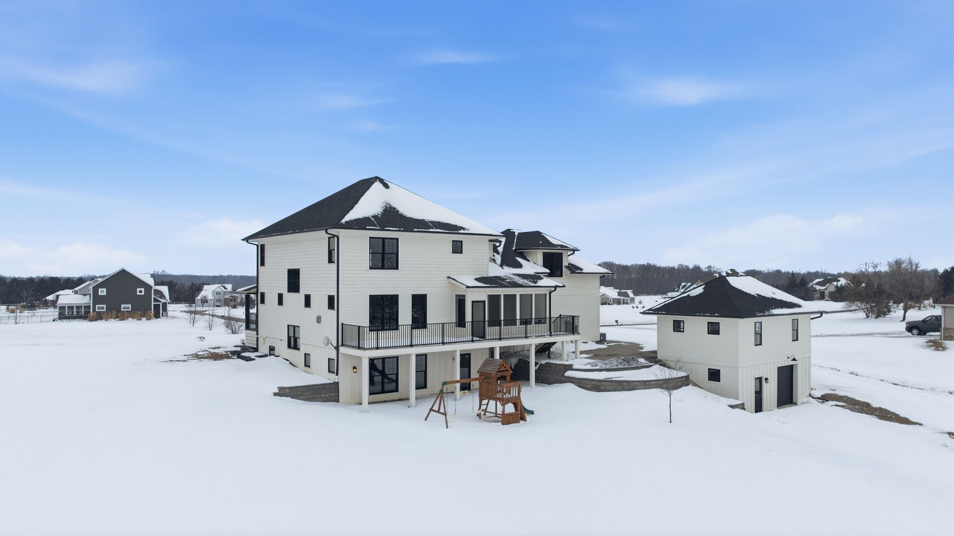 A showcase of quality construction and thoughtful design, this like-new 2018 custom home offers 4 bedrooms, 3.5 baths on 1+ acre with sweeping countryside views—minutes to New Buffalo and Lake Michigan beaches. Enjoy sunsets on the AZEK front porch and sunrises from the rear AZEK deck over a serene backyard. Premium finishes include LP SmartSide siding, aluminum-clad wood windows, quartz countertops, and a wood front door. The open-concept main level features a light-filled living room with gas fireplace and kitchen with custom maple cabinetry, double ovens, and an island. From the kitchen, step to the rear deck and a covered, screened porch—ideal for indoor-outdoor entertaining. A sound-insulated den, mudroom, half bath, and access to the oversized attached garage complete the main floor. Upstairs, the primary suite offers dual walk-in closets, double vanity, and tiled glass-enclosed shower. Two additional bedrooms share a double-sink bath; a large bonus room above the garage adds flexibility. Second-floor laundry includes a utility sink and built-in ironing station. The finished walkout basement provides a bright family room, a fourth bedroom, a new ¾ bath, ample storage, and a rough-in for a kitchen or wet bar—ideal for entertaining or secondary living. A 29x26 attached garage with 12' ceiling, wall-mounted door, and a heat-ready gas line pairs with an 882-sq-ft detached outbuilding (2023) with a vaulted retreat on the main level and a workshop below; both levels heated and cooled. Includes stainless sink, a powered garage door, and its own 200-amp service, complementing the home's 200-amp service for a rare 400-amp total. Extras: whole-house Generac generator, tankless water heater, Kinetico water system with reverse osmosis, whole-house humidifier, 9' ceilings, iron railing and wood staircase, gas line for a patio fireplace, and dedicated subpanel with level ground ready for a future, sun-filled pool. This home exceeds expectations at every turn!
