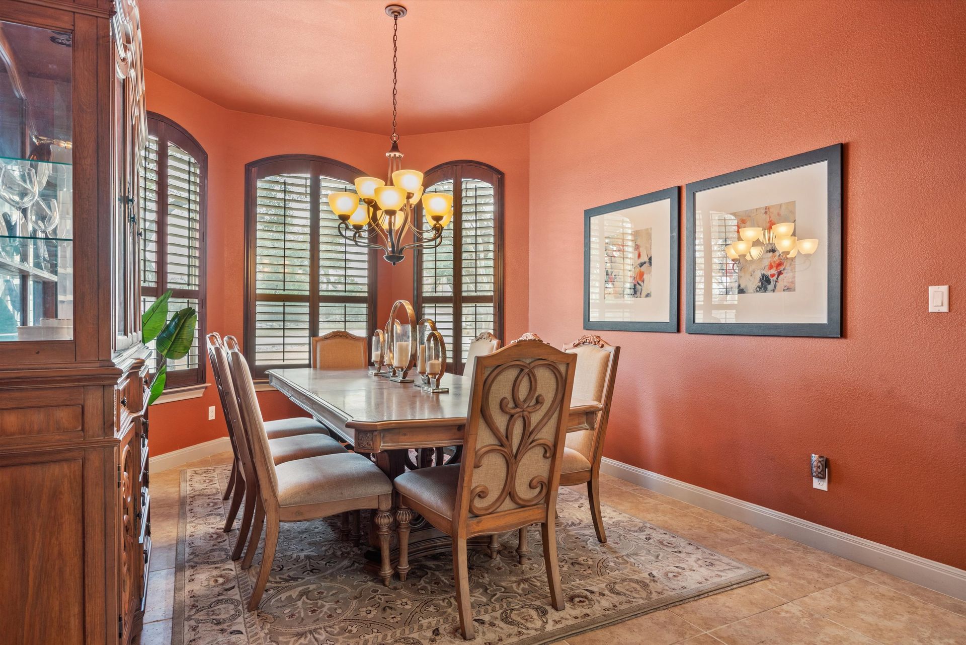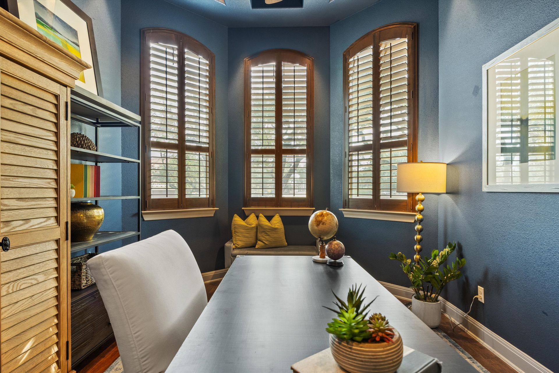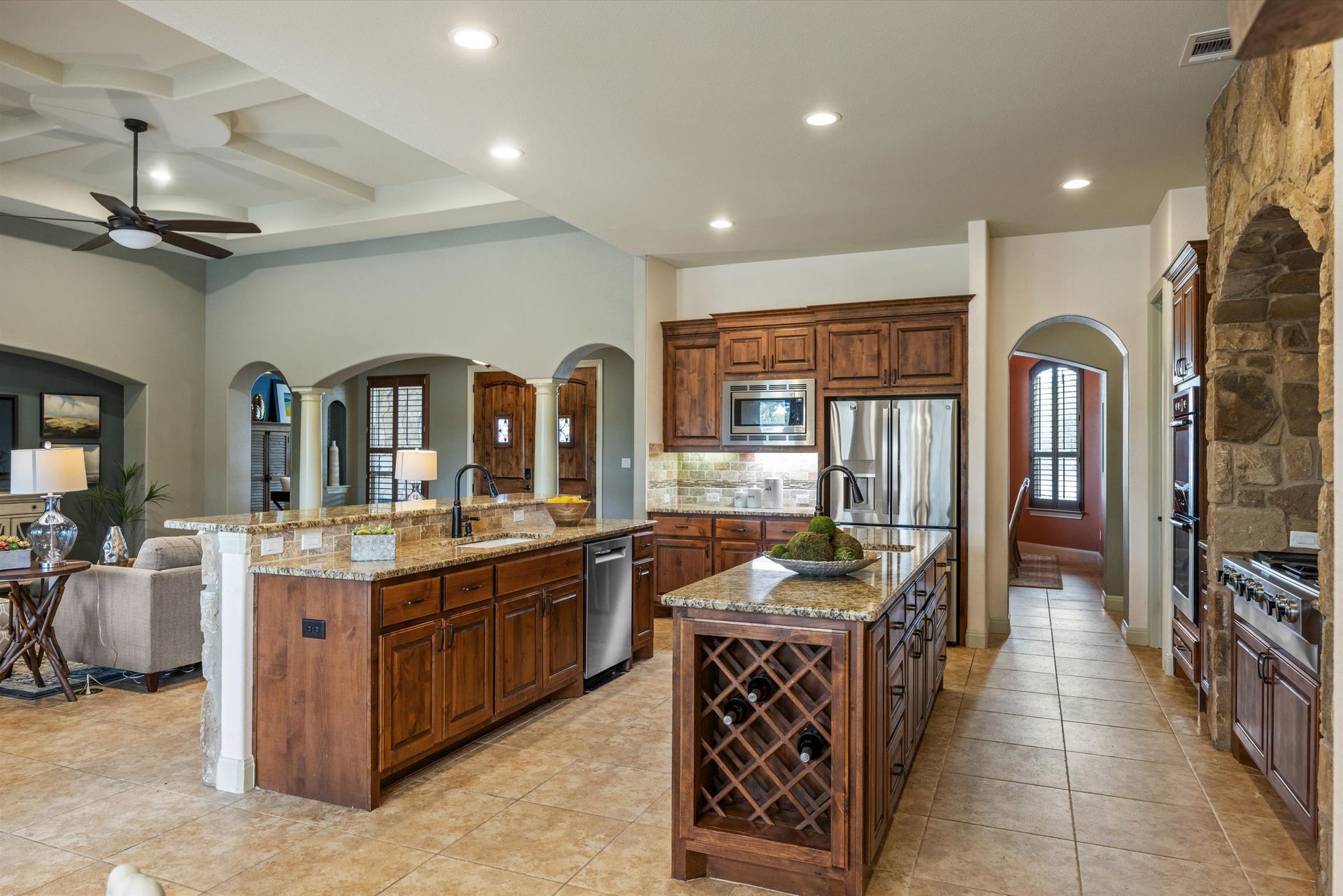 Architectural details shine throughout the home. The open chef’s kitchen is designed for both everyday living and entertaining, showcasing dual granite-topped islands, abundant cabinetry, two sinks, stainless appliances, including a Jenn-Air cooktop with grill, and a Bosch double oven. A striking stone arch and backsplash add warmth and character, beautifully echoed in the breakfast bar.