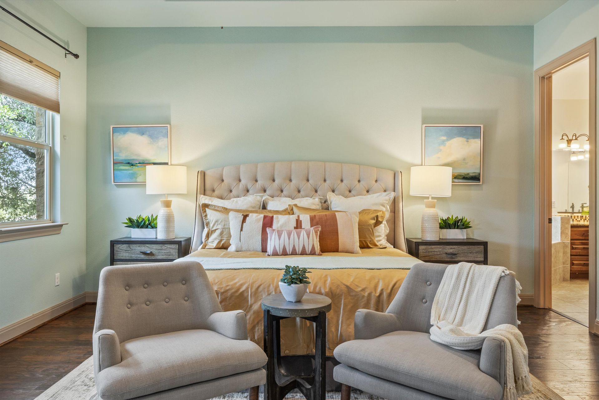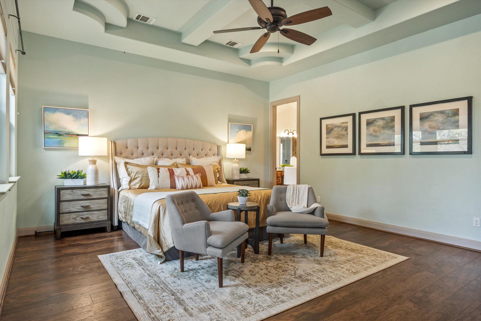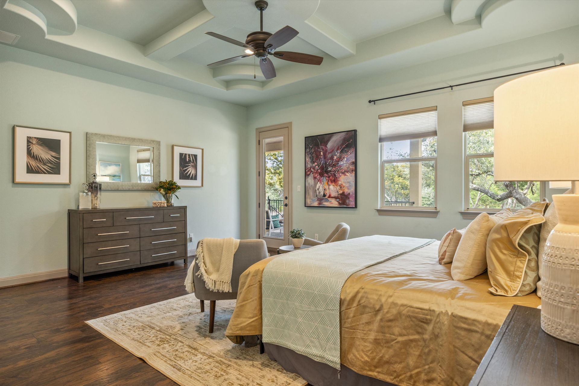 The inviting family room features soaring coffered ceilings, expansive windows overlooking the serene backyard, and a dramatic floor-to-ceiling stone fireplace. The private primary suite is thoughtfully separated from the secondary bedrooms and offers wood-look tile flooring, a coffered ceiling, and direct patio access. The spa-inspired ensuite bath includes a garden tub, extended vanities with seating, and an oversized walk-in shower with multiple showerheads, bench seating, and elegant tile finishes.