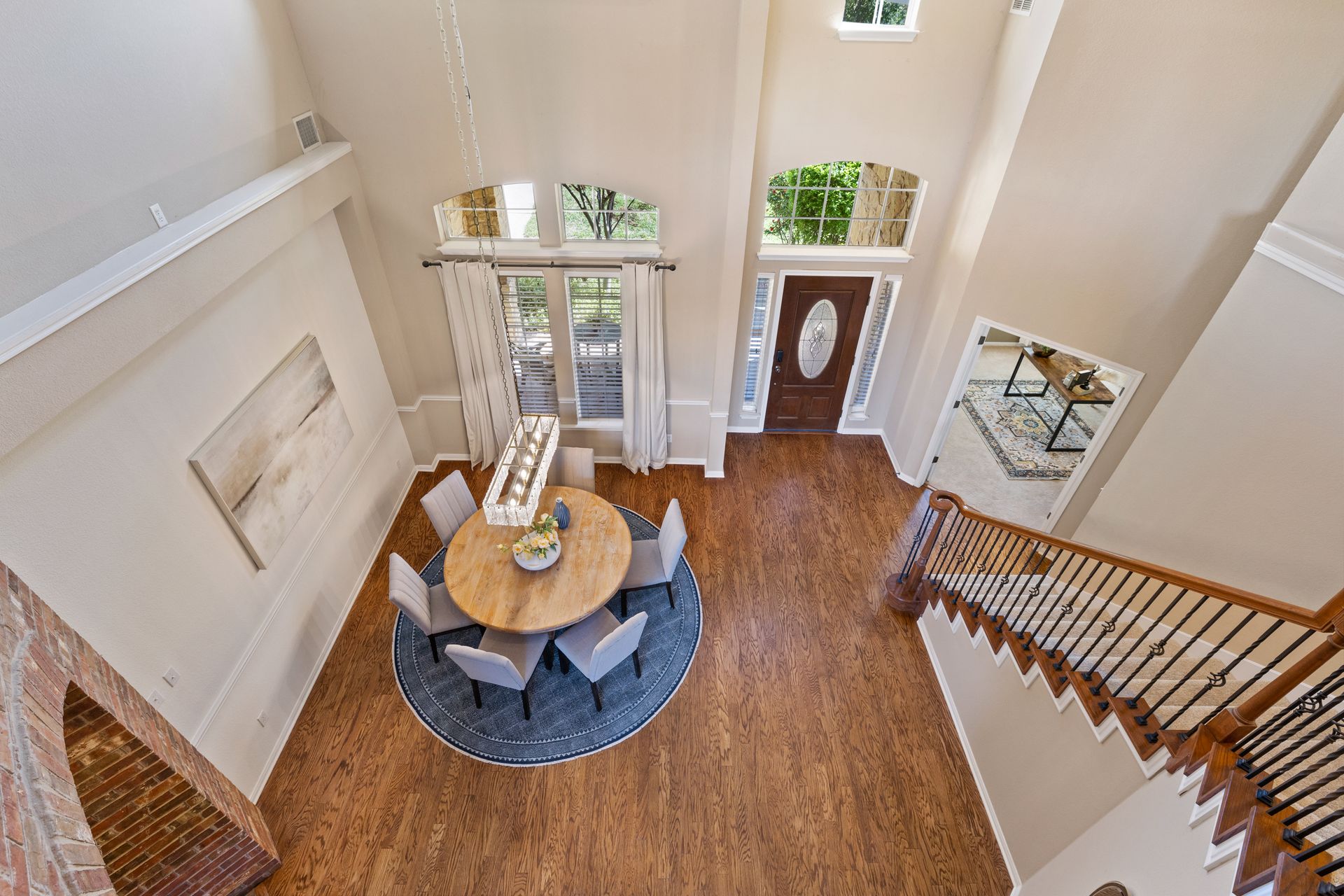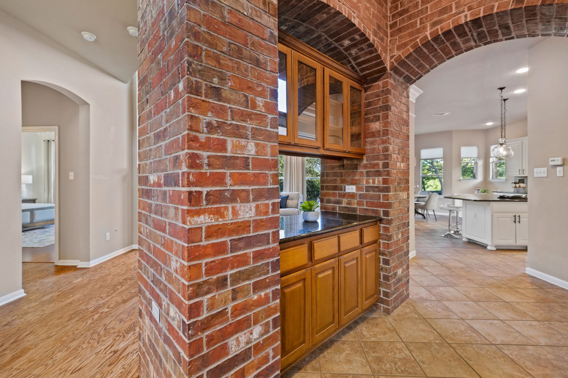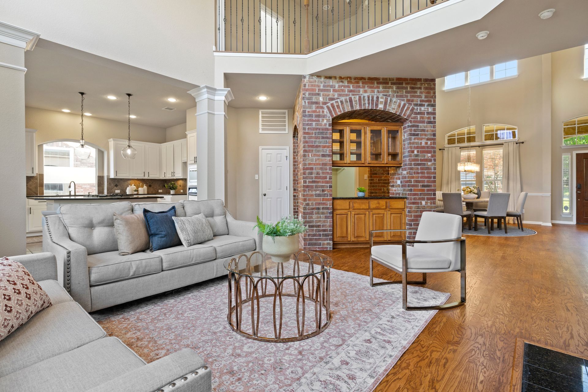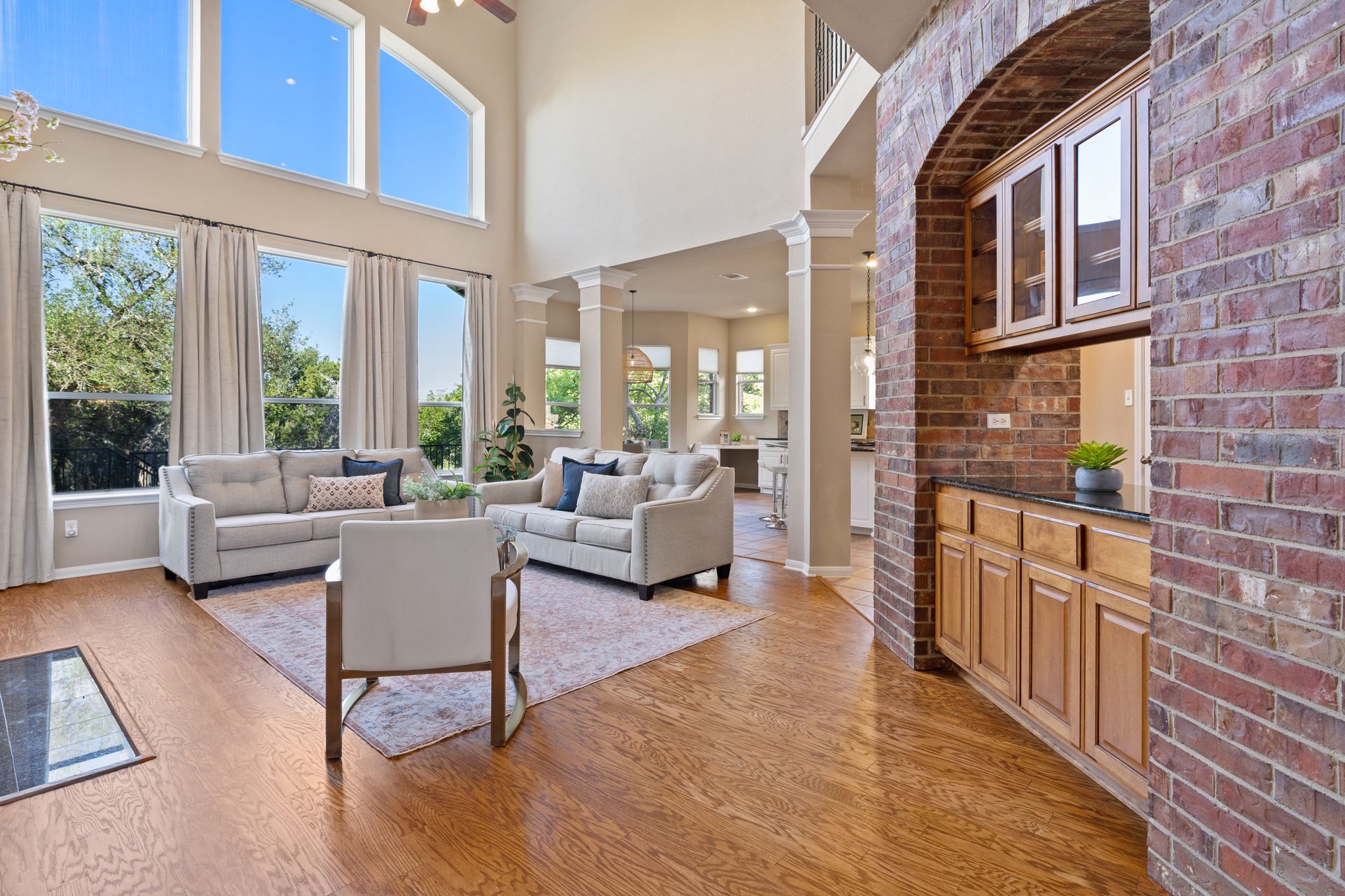 Set on a spacious lot with lush landscaping and mature trees, the classic brick exterior creates a warm, inviting curb appeal. Inside, rich refinished hardwood flooring flows throughout the open-concept main level, where abundant natural light enhances the home’s bright and airy atmosphere.