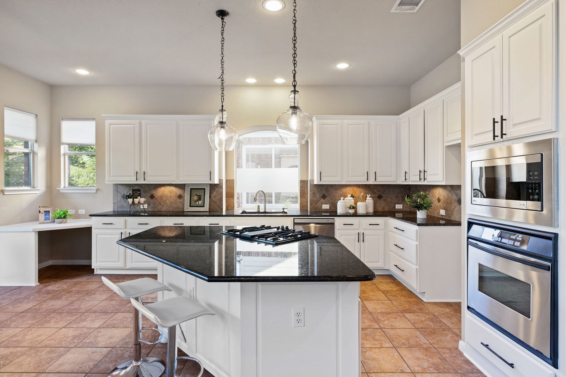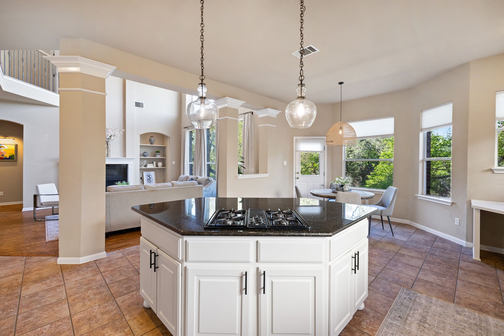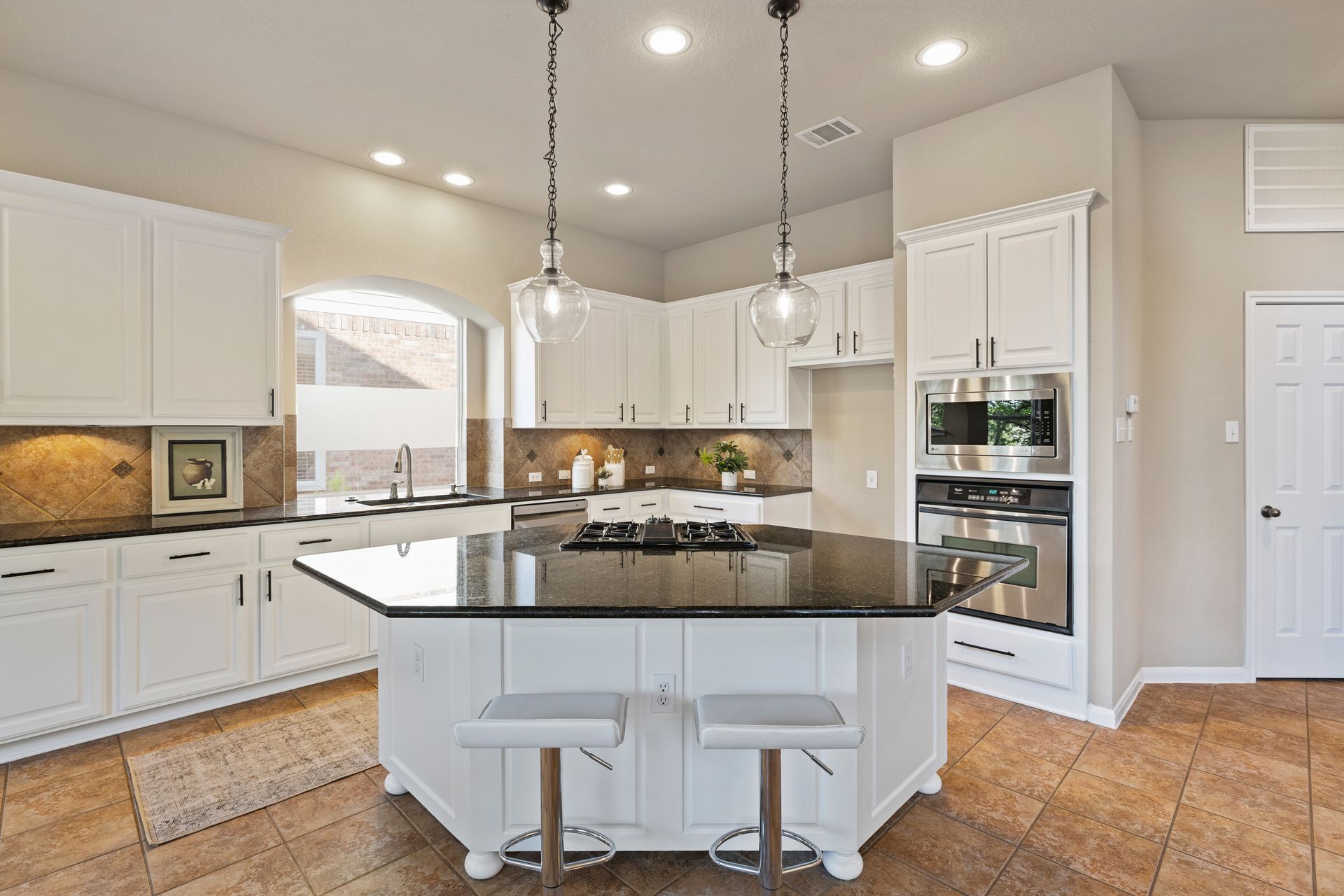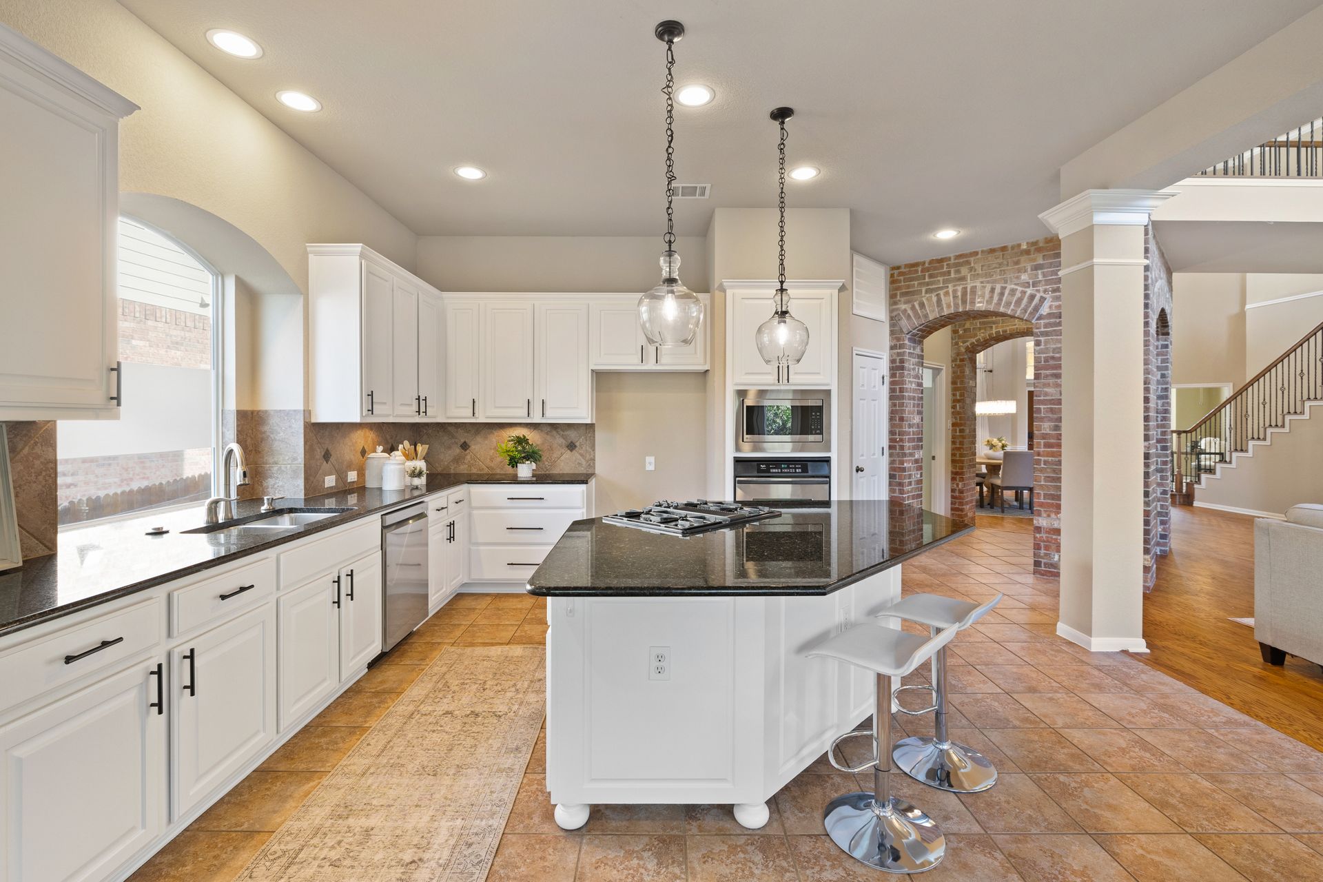 At the heart of the home is a spacious kitchen complete with a large island, stainless steel appliances, ample counter space, and abundant cabinetry—perfect for daily living or entertaining. Elegant architectural details, including crown molding and arched entryways, add a touch of sophistication throughout.