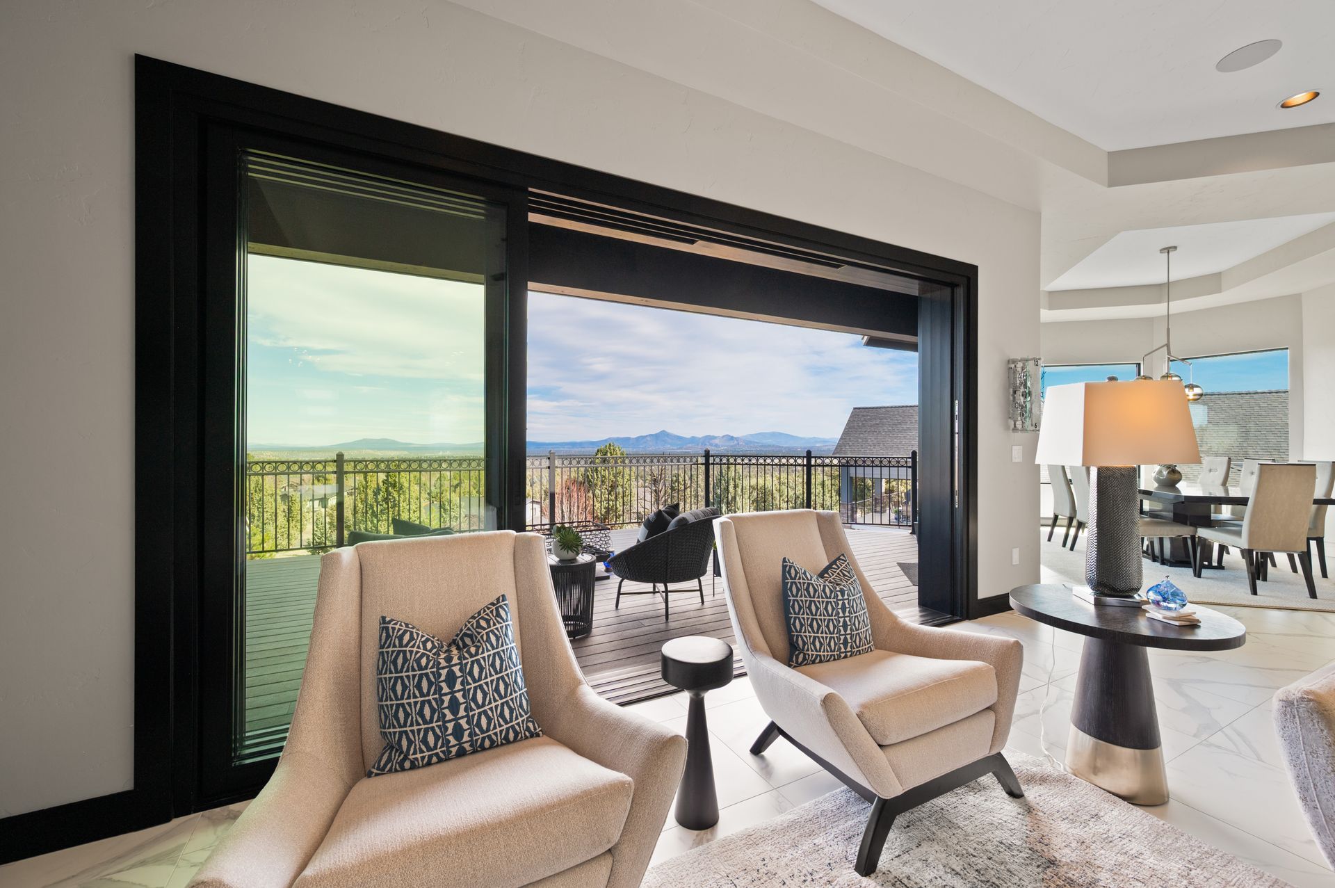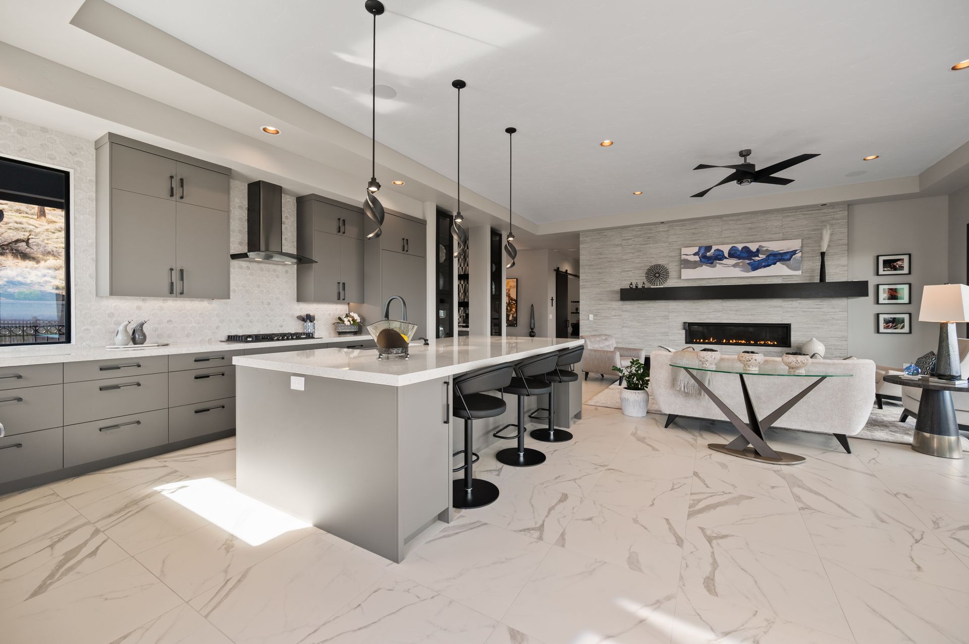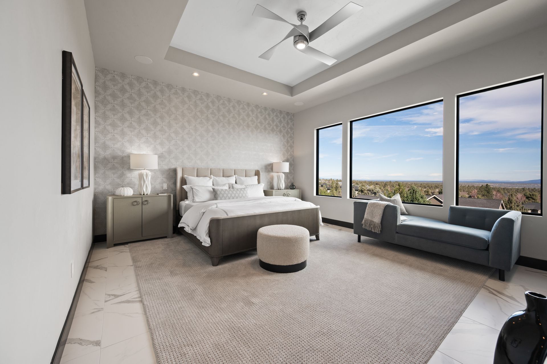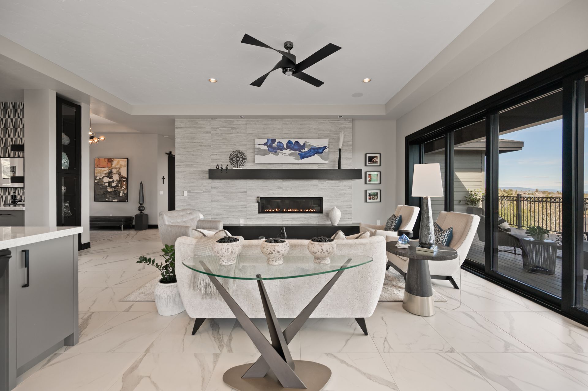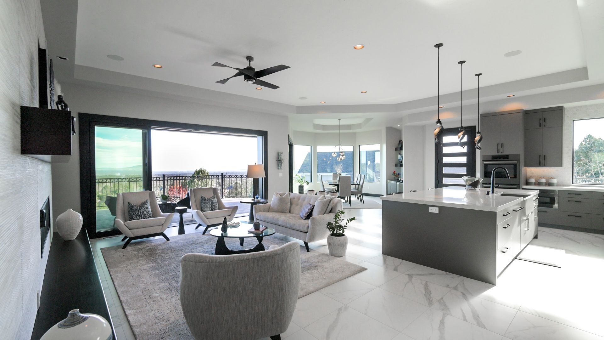Designed to embrace its surroundings, the home features an expansive open-concept floor plan filled with natural light and framed by unobstructed vistas of Mt. Jefferson, Mt. Hood, Smith Rock, and Mt. Adams. The Great Room is a true showpiece, with sleek marble flooring, a statement gas fireplace, and dramatic four-panel retractable glass doors that seamlessly merge indoors and out, opening to a partially covered deck ideal for year-round entertaining.