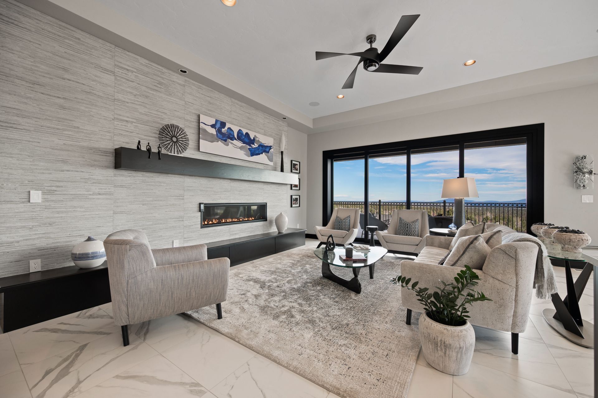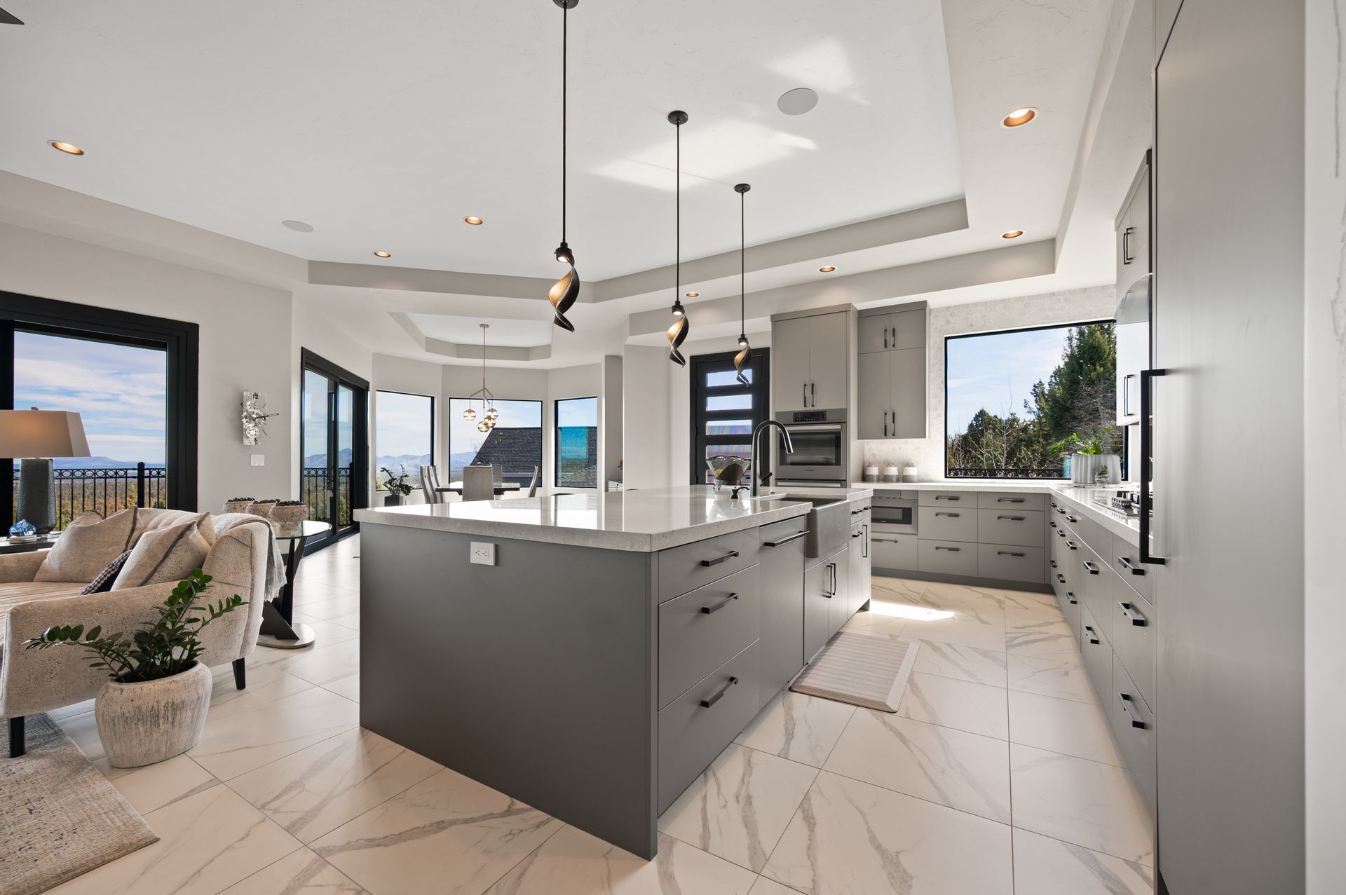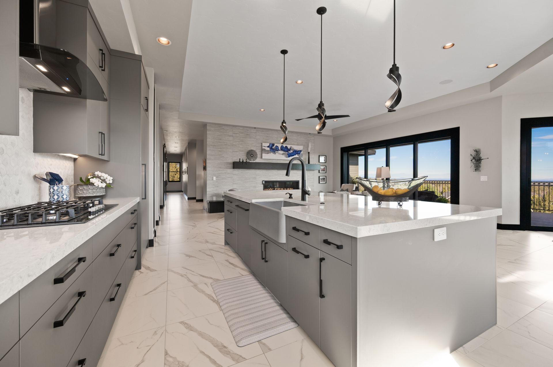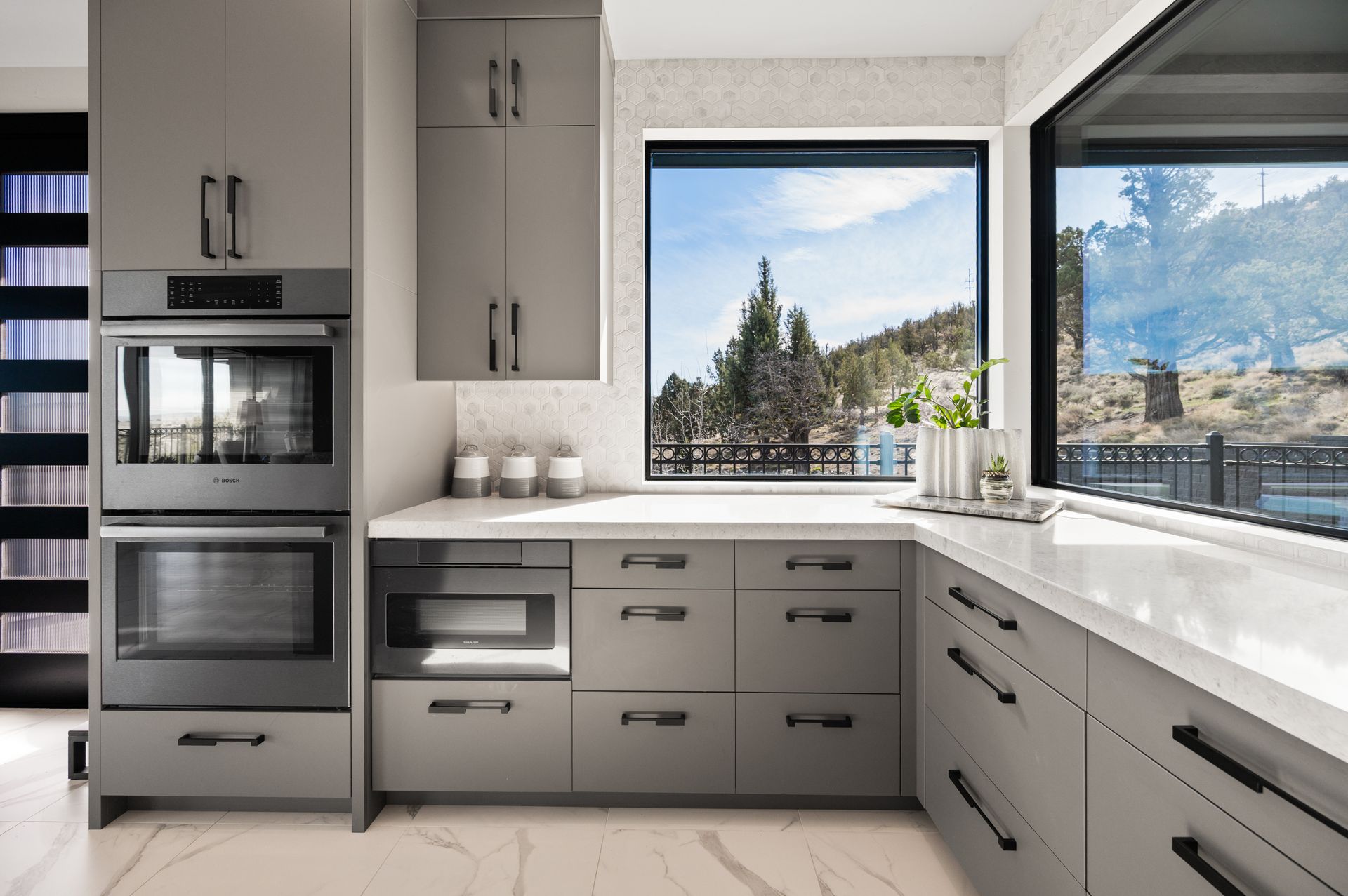 Designed to embrace its surroundings, the home features an expansive open-concept floor plan filled with natural light and framed by unobstructed vistas of Mt. Jefferson, Mt. Hood, Smith Rock, and Mt. Adams. The Great Room is a true showpiece, with sleek marble flooring, a statement gas fireplace, and dramatic four-panel retractable glass doors that seamlessly merge indoors and out, opening to a partially covered deck ideal for year-round entertaining.