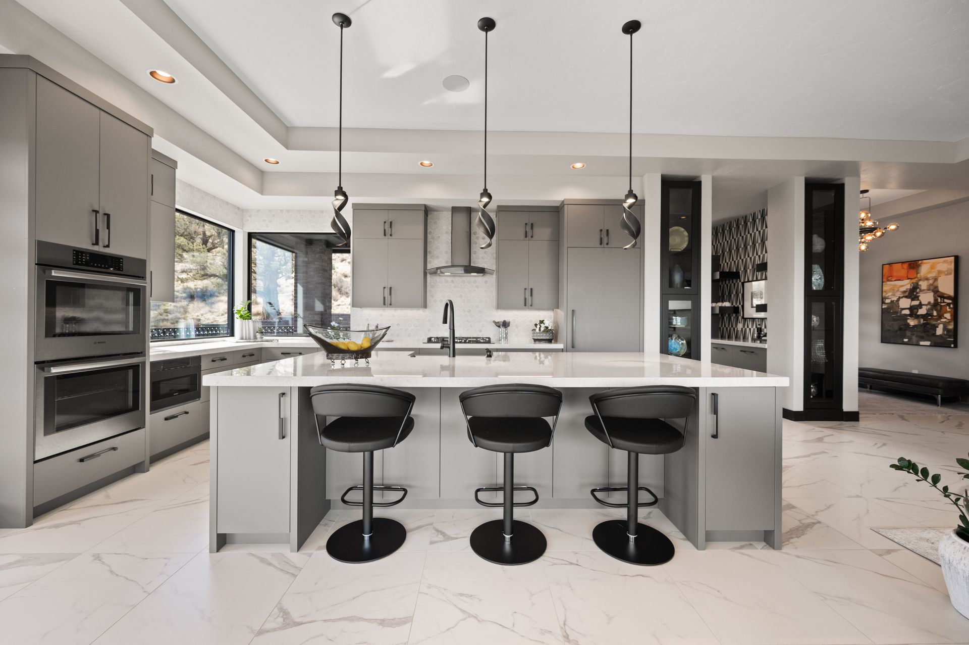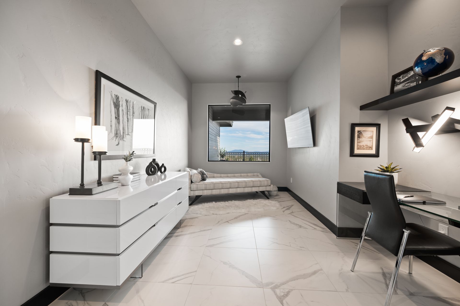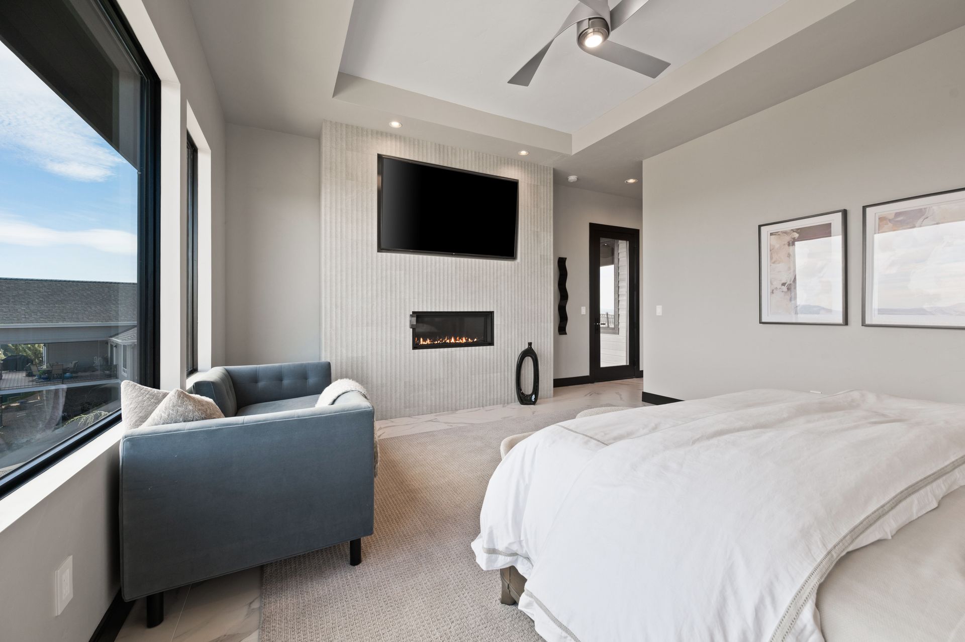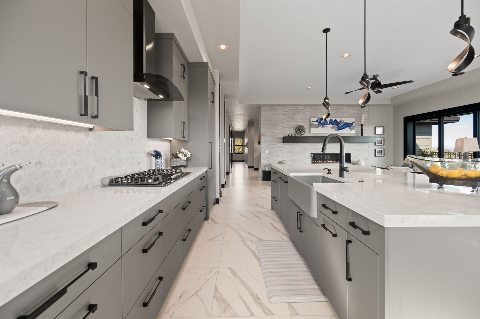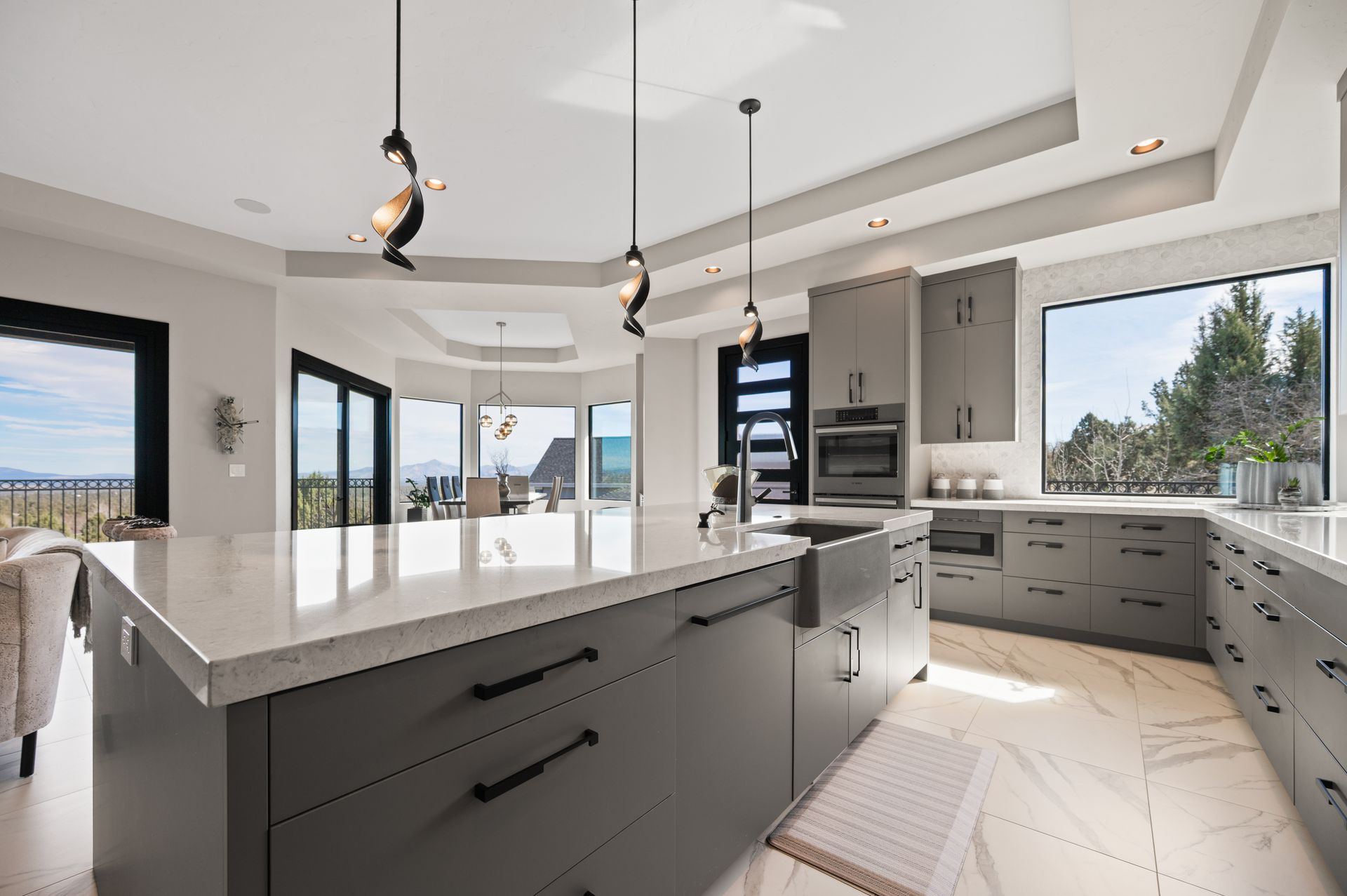 Designed to embrace its surroundings, the home features an expansive open-concept floor plan filled with natural light and framed by unobstructed vistas of Mt. Jefferson, Mt. Hood, Smith Rock, and Mt. Adams. The Great Room is a true showpiece, with sleek marble flooring, a statement gas fireplace, and dramatic four-panel retractable glass doors that seamlessly merge indoors and out, opening to a partially covered deck ideal for year-round entertaining.