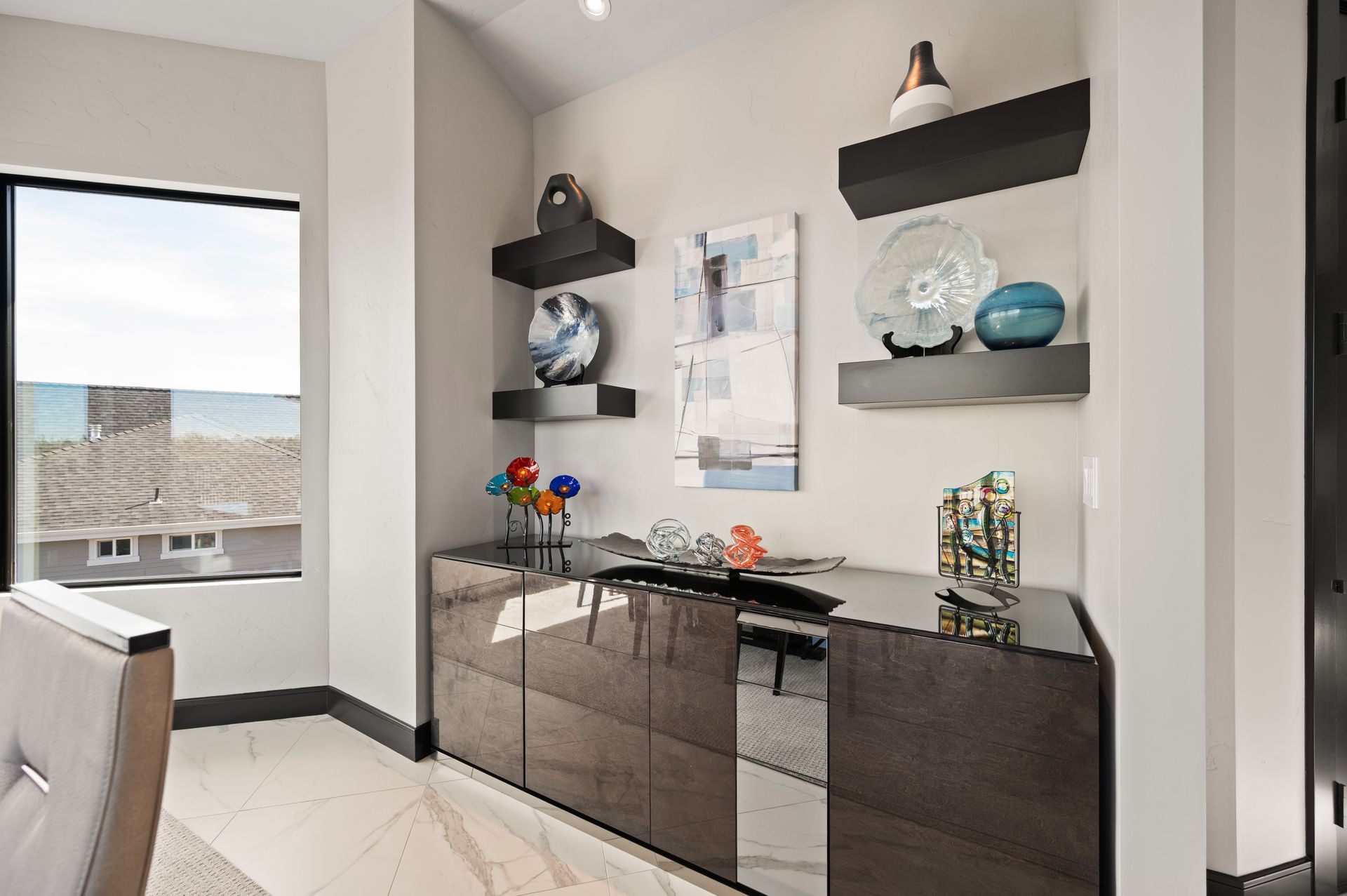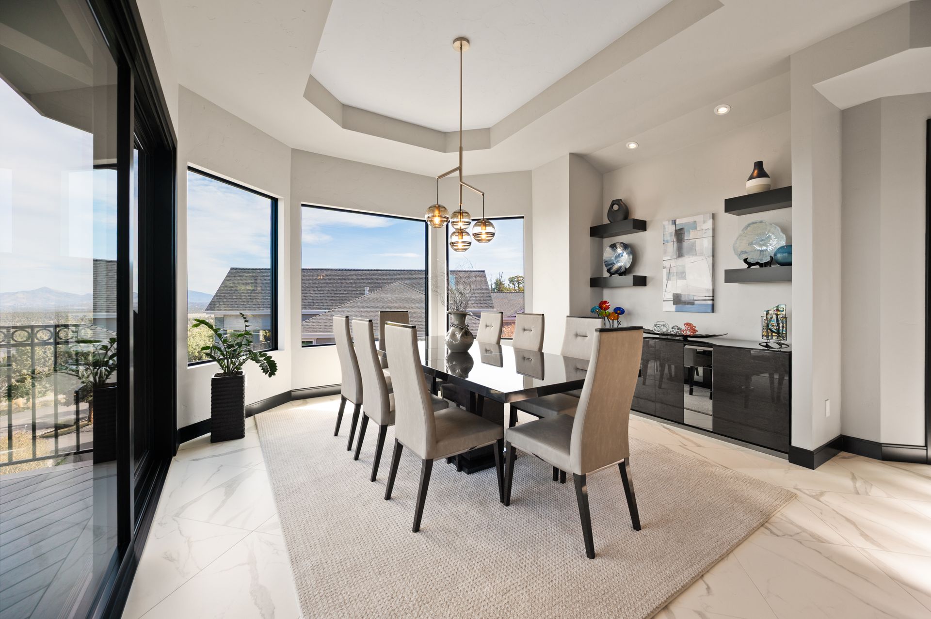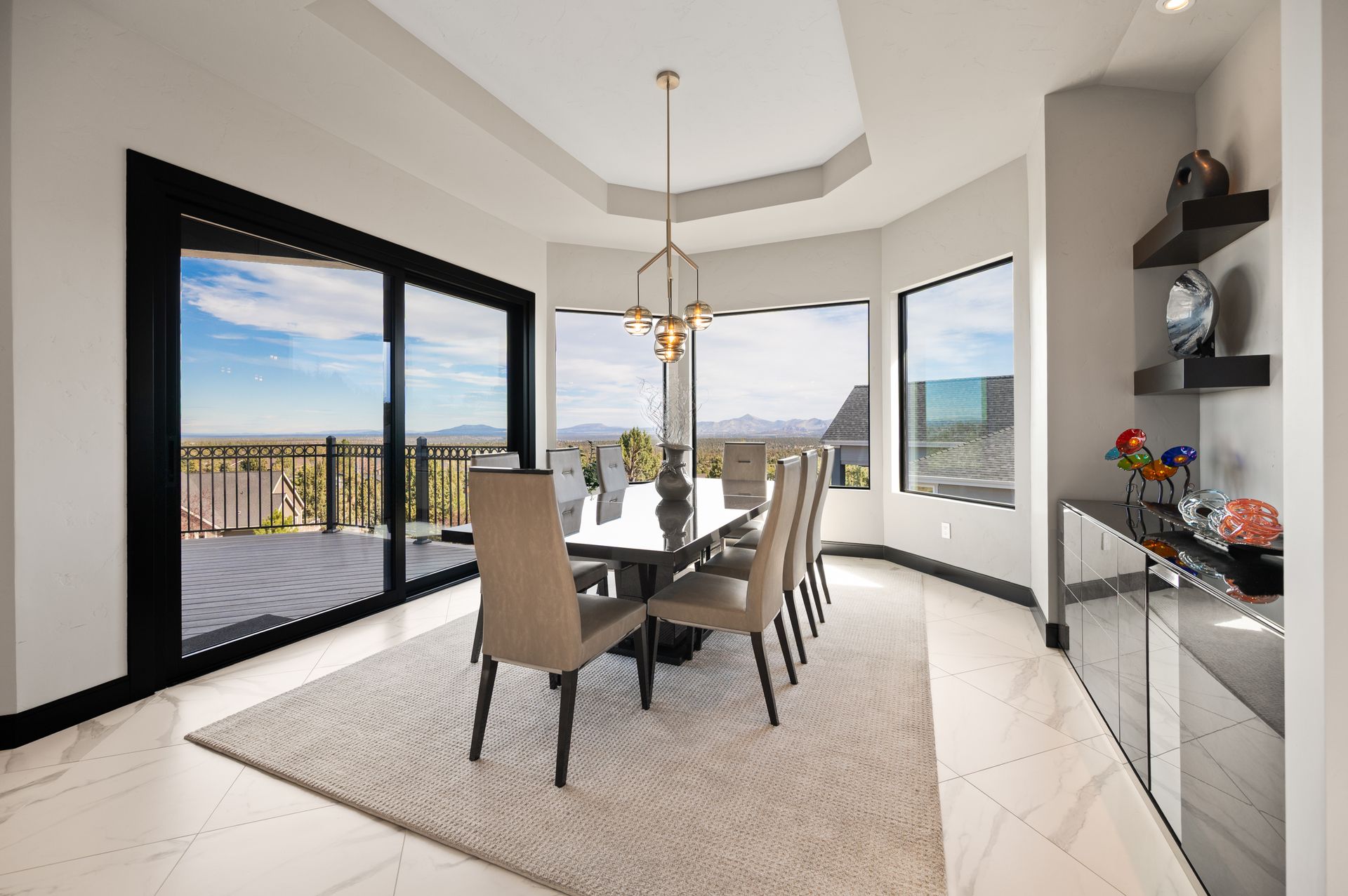 At the heart of the home, the chef’s kitchen blends beauty and function with quartz countertops, custom cabinetry, a Thermador built-in refrigerator, Bosch ovens, gas cooktop, and an oversized island designed for gathering. A fully appointed butler’s pantry elevates the experience with a wine cooler, refrigerator/freezer drawers, coffee bar, and additional prep space. The dining area is equally impressive, anchored by a wall of windows that captures the surrounding landscape like living artwork, and built-in cabinetry provides ample storage.