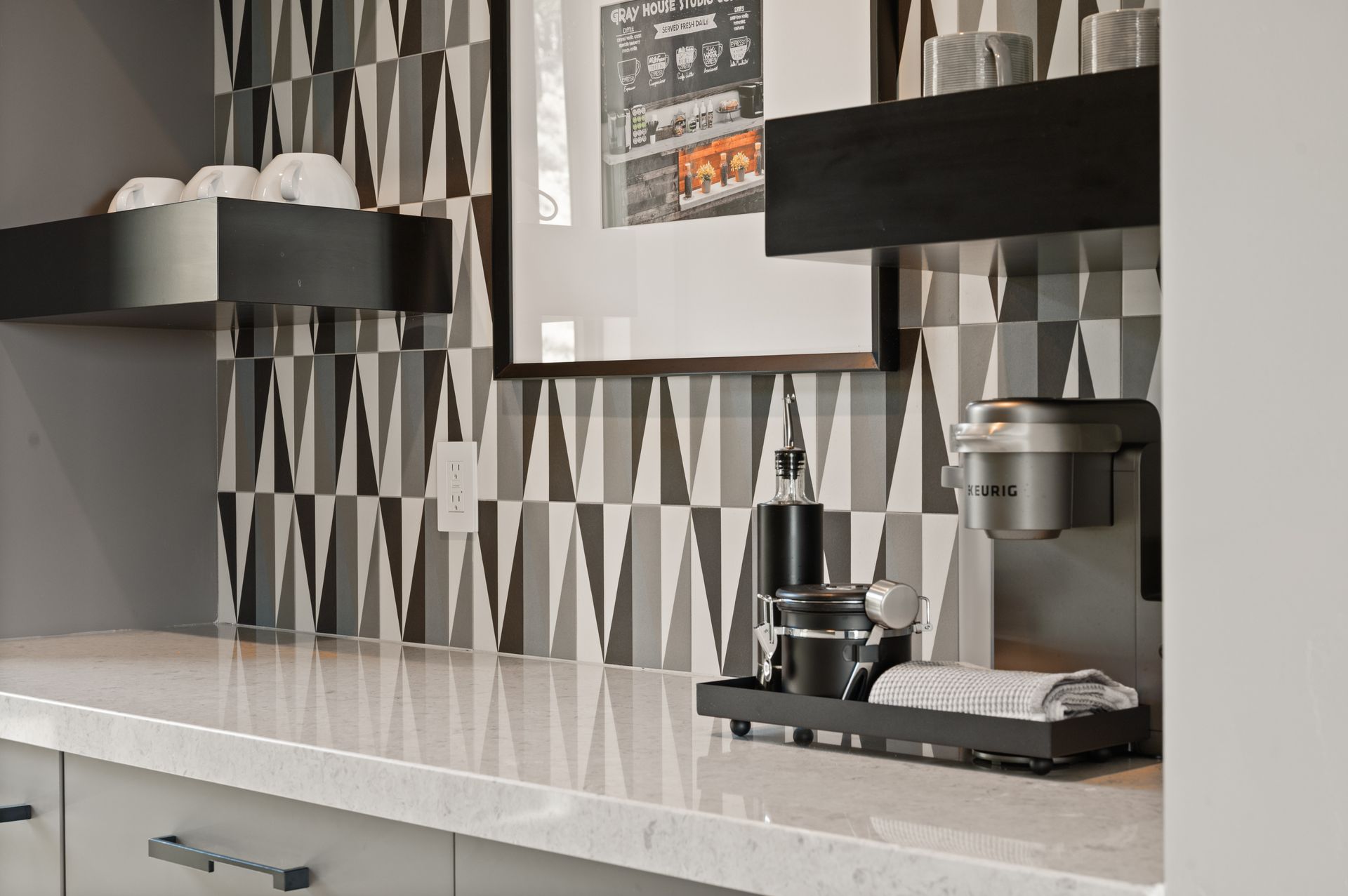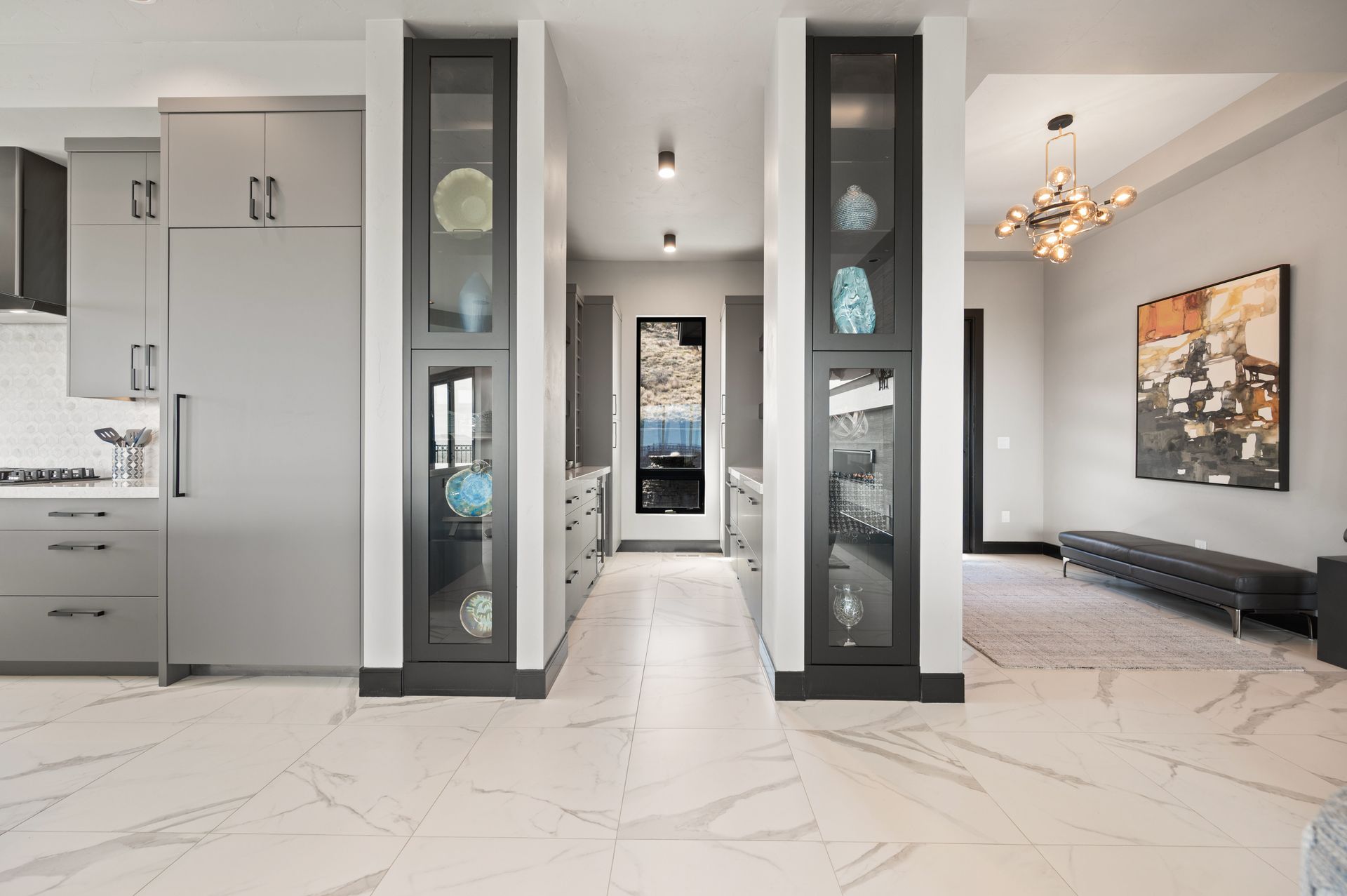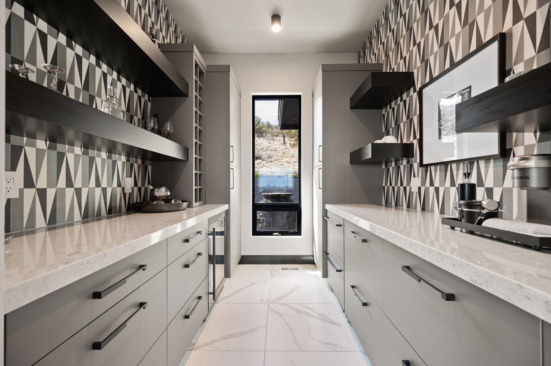 At the heart of the home, the chef’s kitchen blends beauty and function with quartz countertops, custom cabinetry, a Thermador built-in refrigerator, Bosch ovens, gas cooktop, and an oversized island designed for gathering. A fully appointed butler’s pantry elevates the experience with a wine cooler, refrigerator/freezer drawers, coffee bar, and additional prep space. The dining area is equally impressive, anchored by a wall of windows that captures the surrounding landscape like living artwork, and built-in cabinetry provides ample storage.