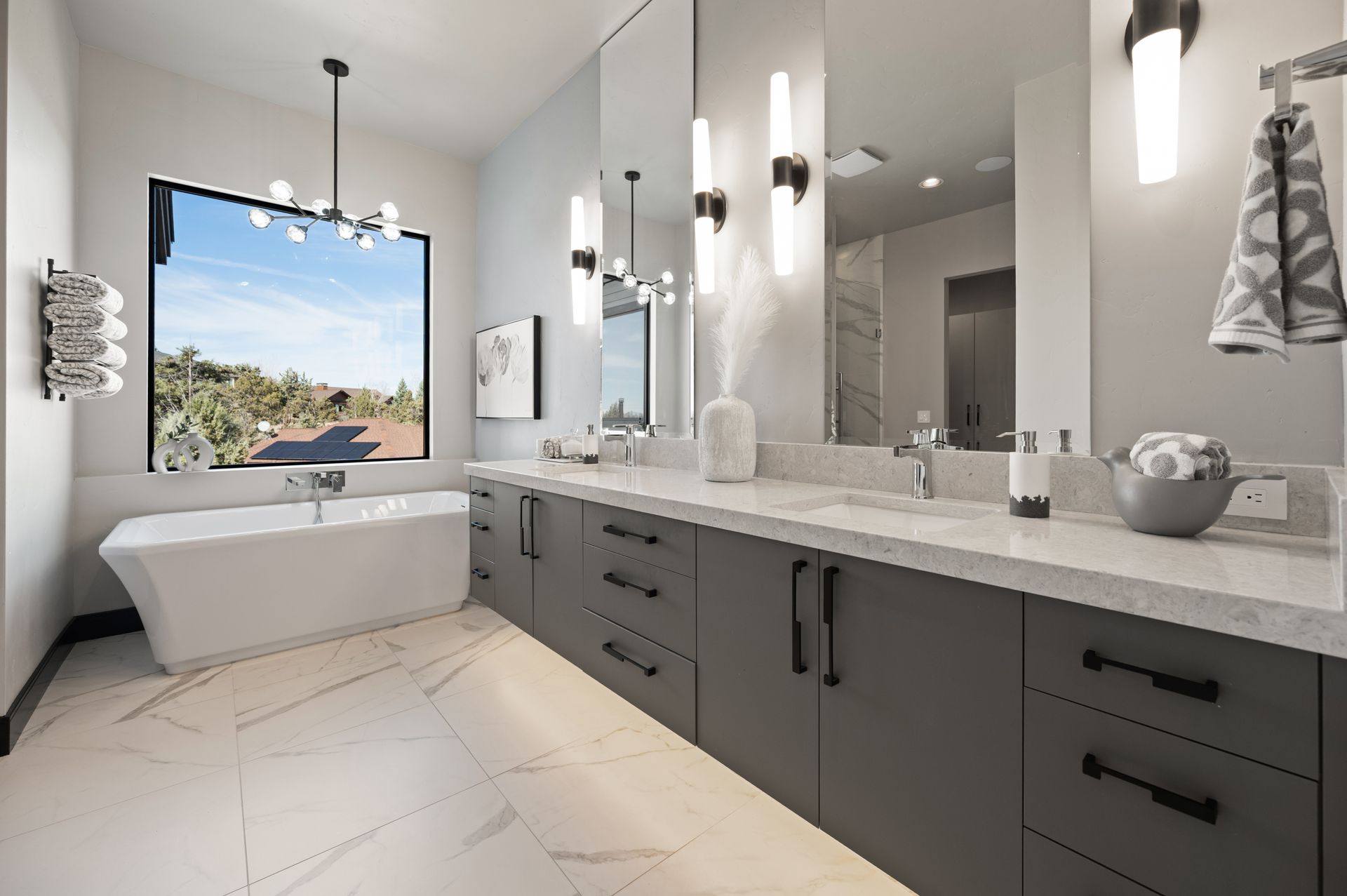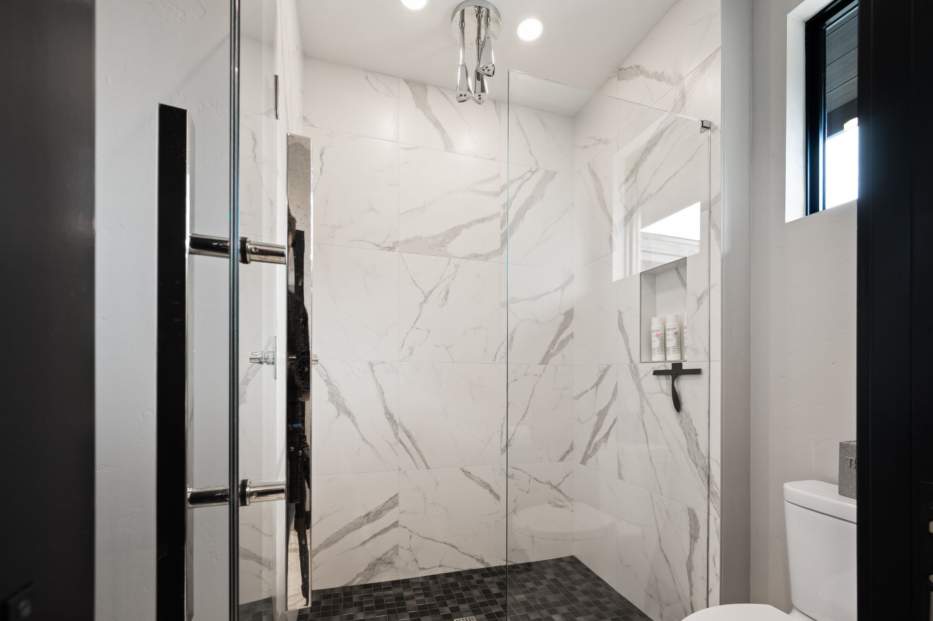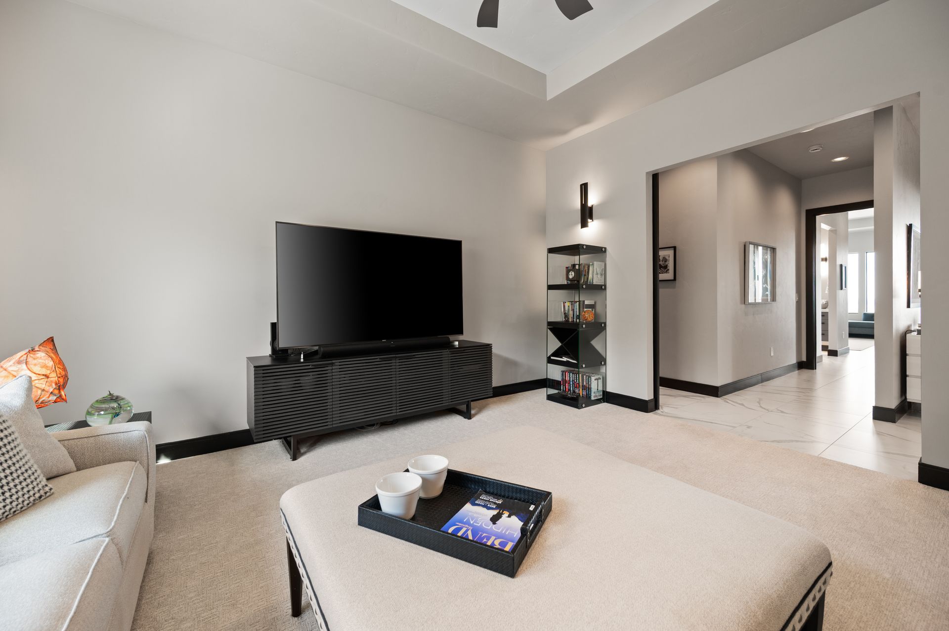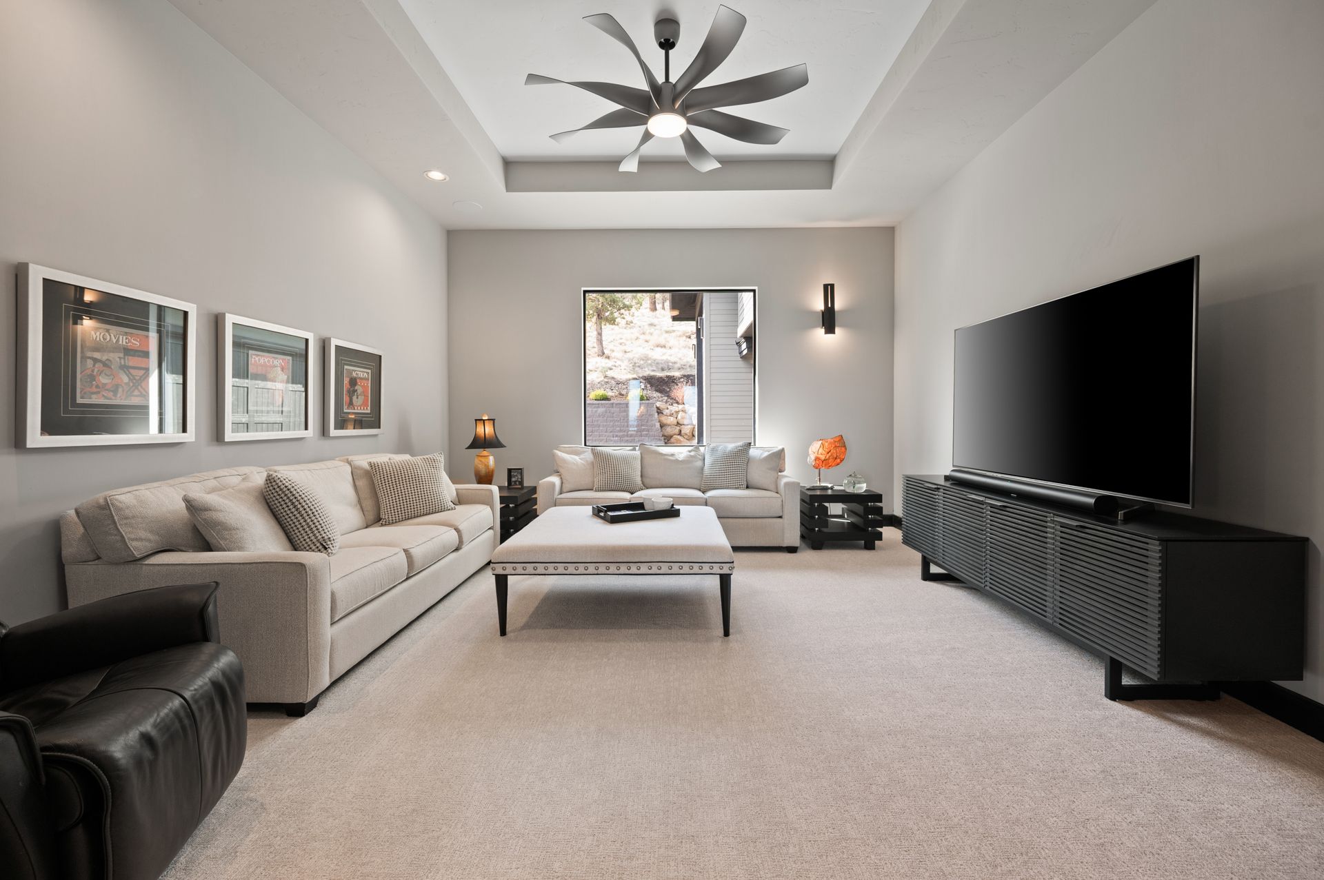 The main-level Primary Suite is a private retreat, offering serene views, direct deck access, and a spa-inspired bath complete with soaking tub, tiled shower with rain and body jets, heated floors, and a generous walk-in closet. Additional main-level spaces include a dedicated office, a comfortable family/media room, and well-designed utility spaces and storage that enhance everyday living.