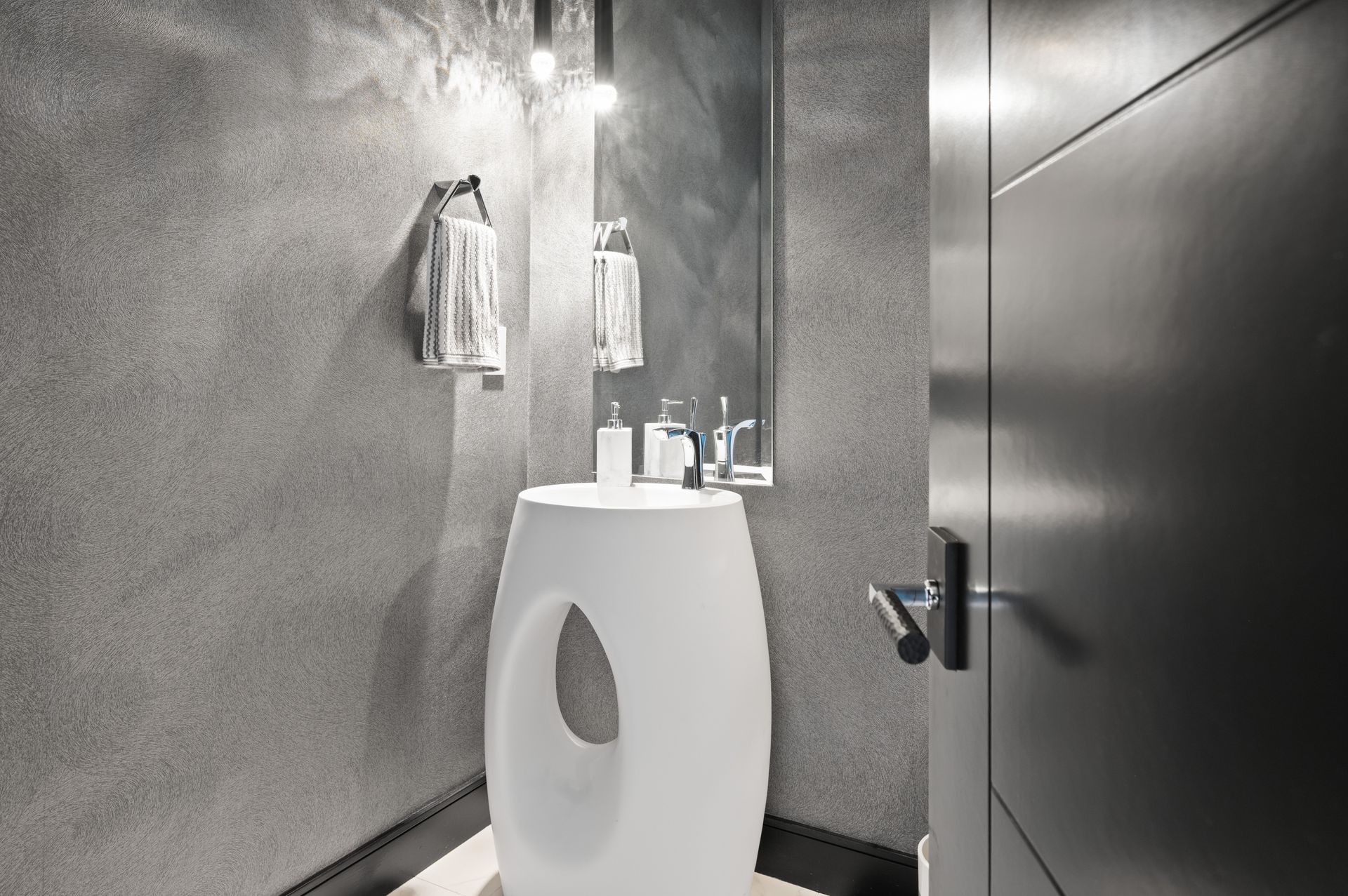 Powder Room with stone pedestal, German wallpaper and custom lighting