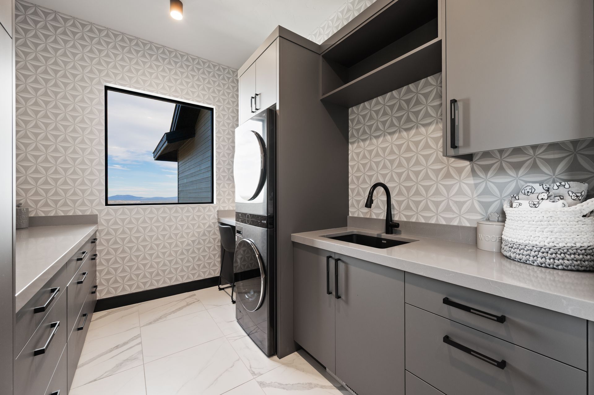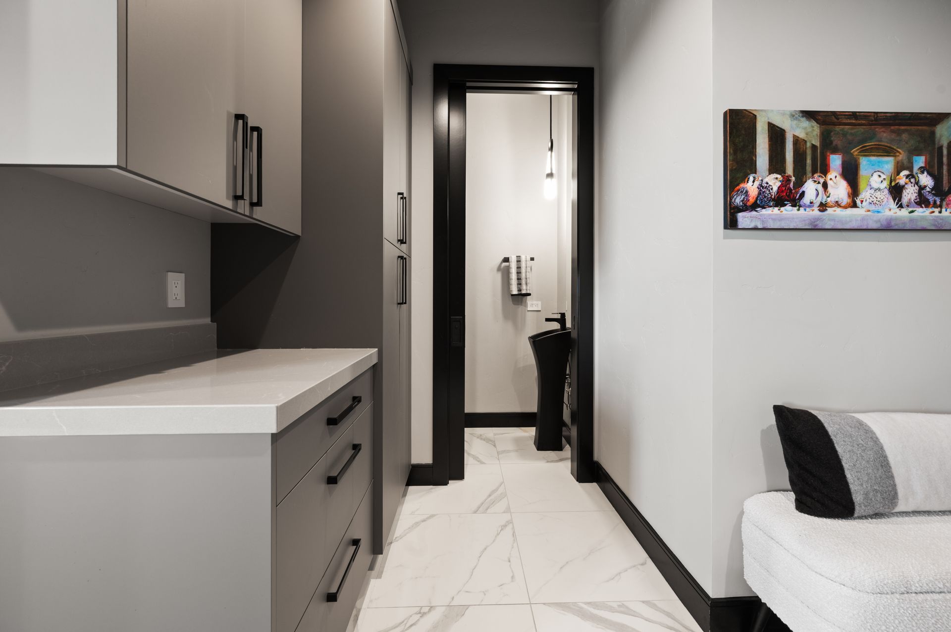 Laundry room with cabinetry, LG washer/dryer and workspace