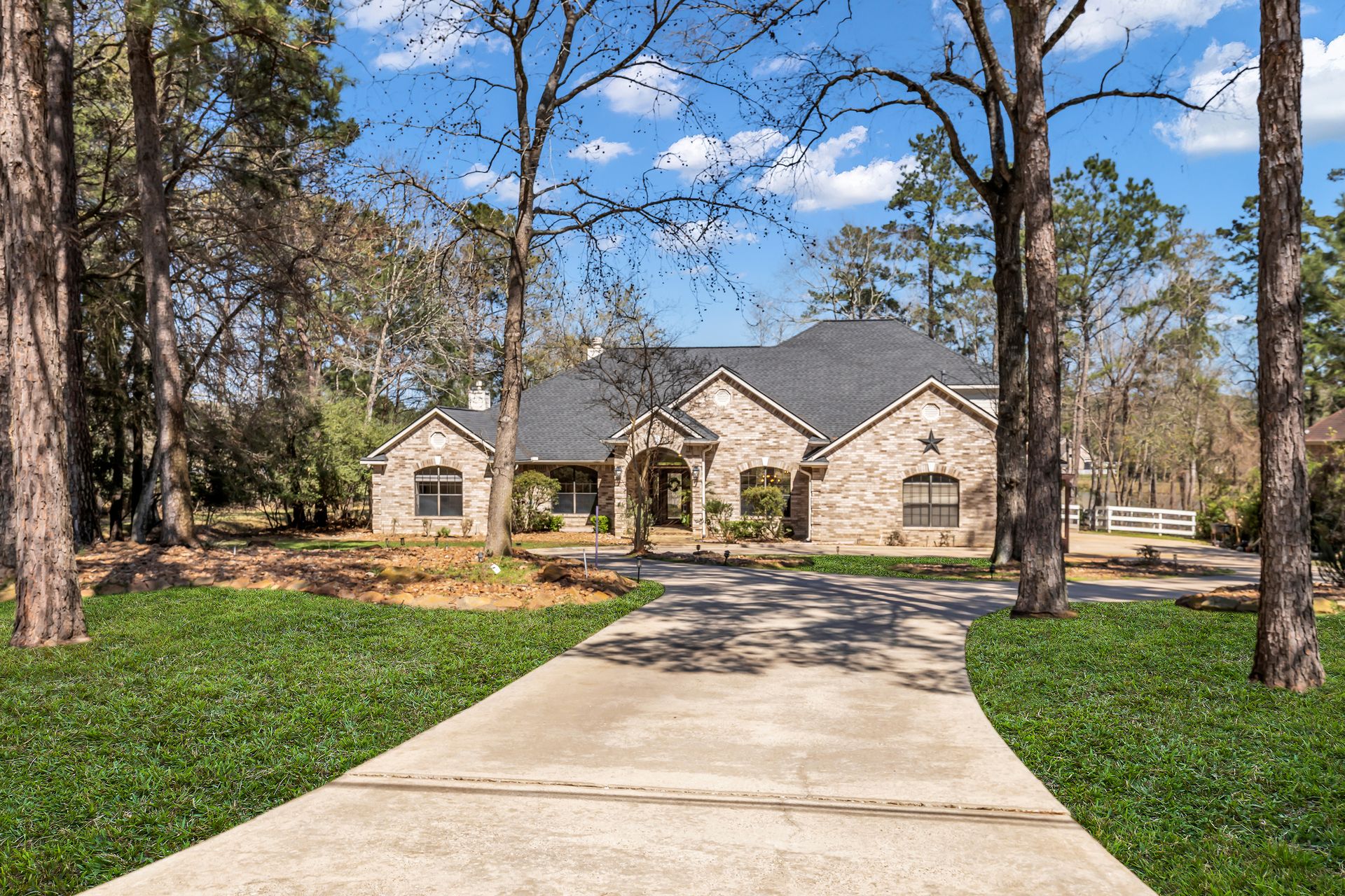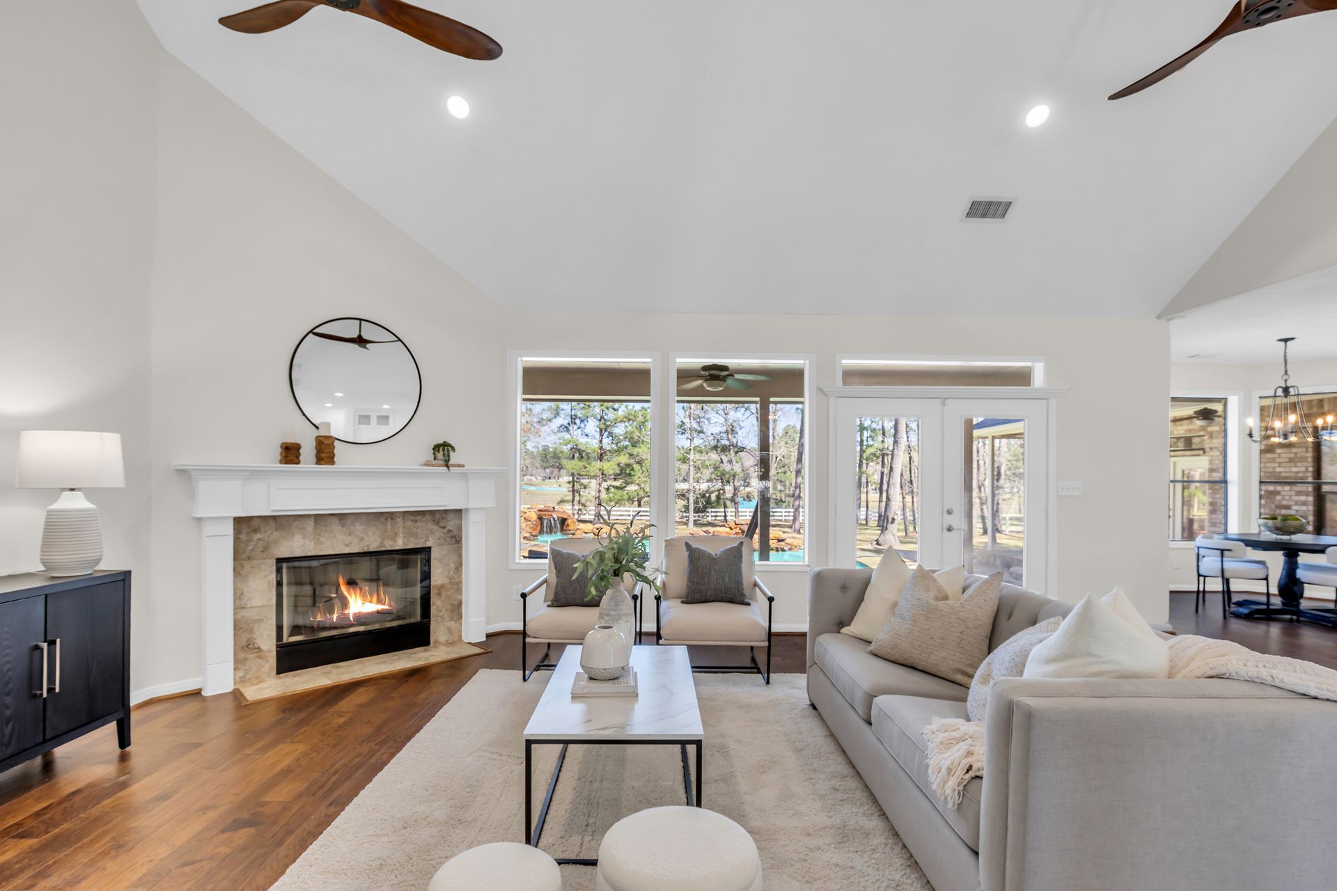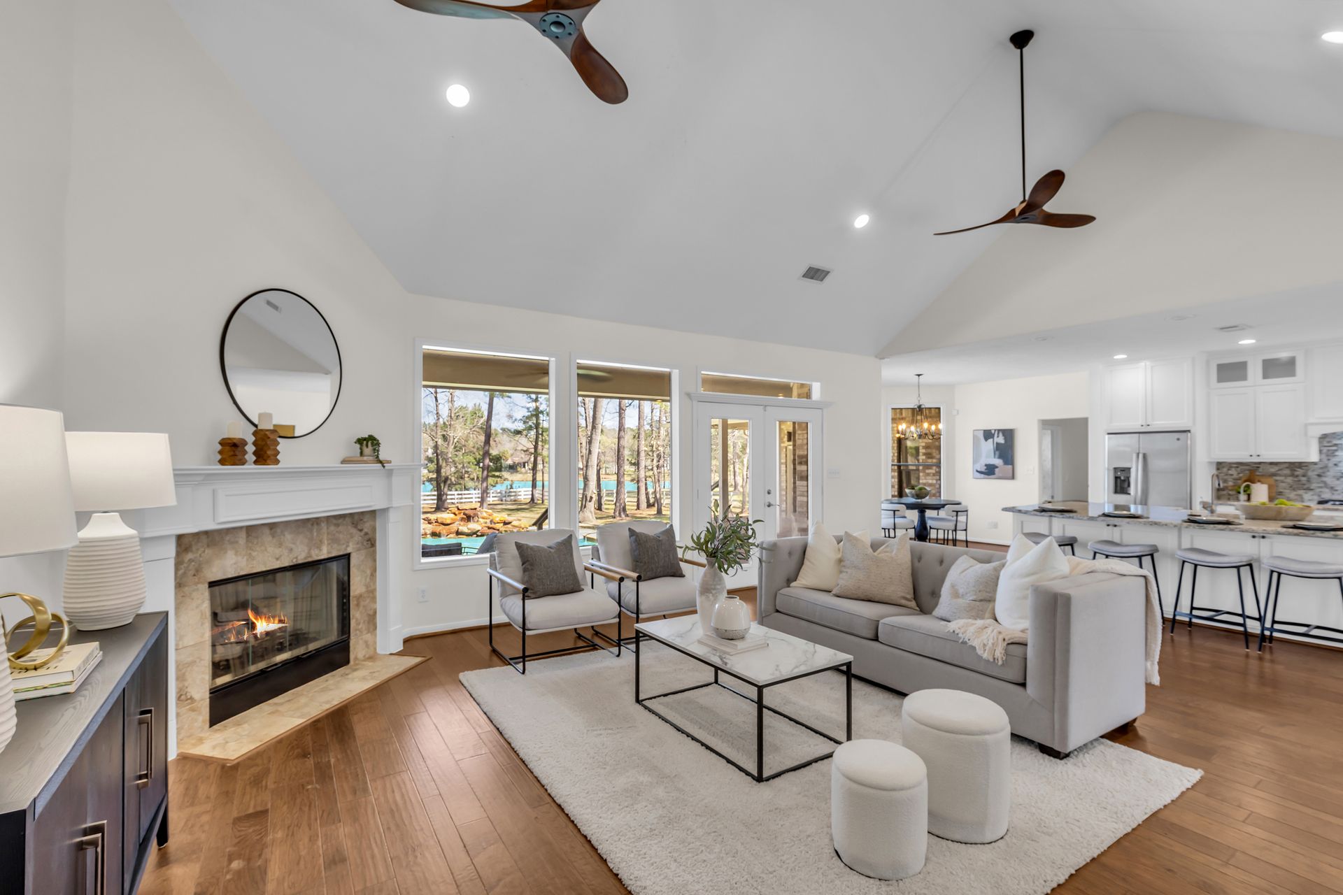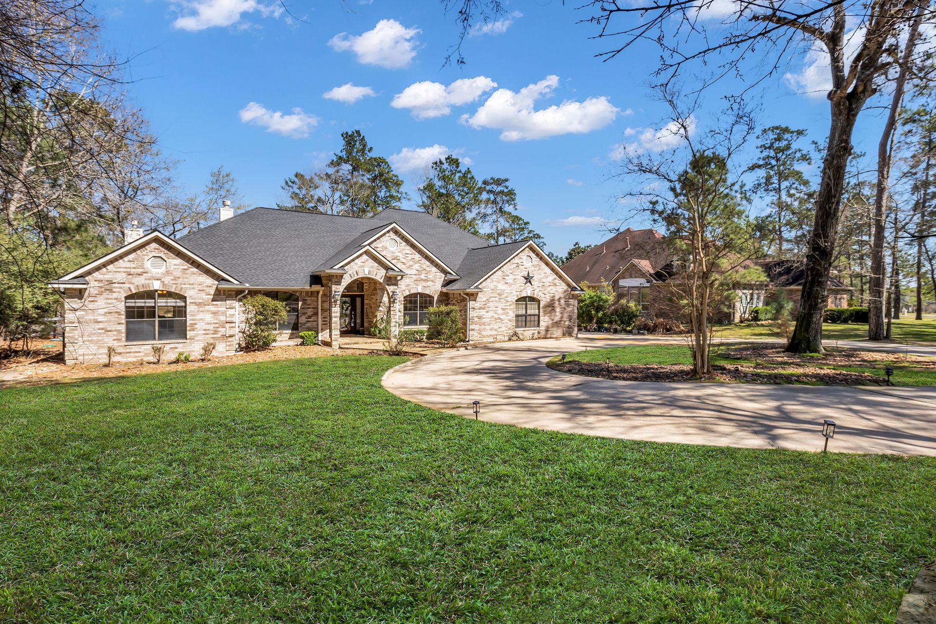 Exceptional lakefront living in Lake Windcrest. This beautifully updated seven-bedroom estate offers rare first-floor amenities, including a serene primary suite with a fireplace, custom closet, and private access to the backyard. Two additional first-floor guest suites, one ideal for multigenerational living, provides comfort and privacy. Enjoy dining spaces, a dedicated office, and a chef’s kitchen with double ovens, an oversized island with storage, a farmhouse sink, a pot filler, and a five-burner gas cooktop. Upstairs features four bedrooms, a game/flex room, and stunning views. Outdoors, relax by the pool/spa, fire pit, and tranquil lake. Additional highlights include a pool bathroom, water filtration system, central vacuum, and epoxy garage floors with extra storage. A few recent updates include all new paint on the first floor, one A/C unit (2026), one water heater (2026), new blinds downstairs (2026), updated pool equipment (2022), and a roof (2020). Located near trails, lakes, golf, and top-rated schools with easy access to The Woodlands.