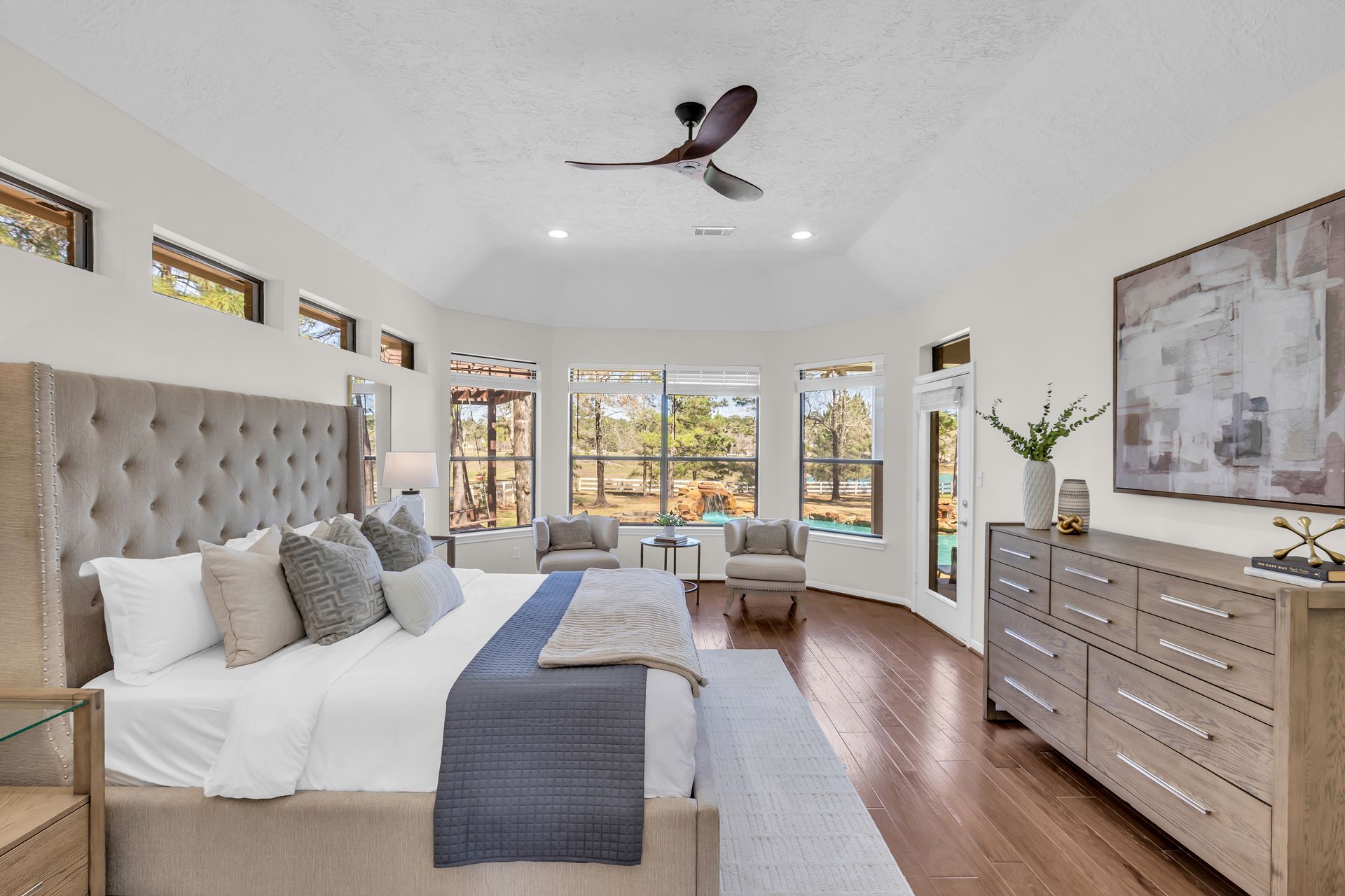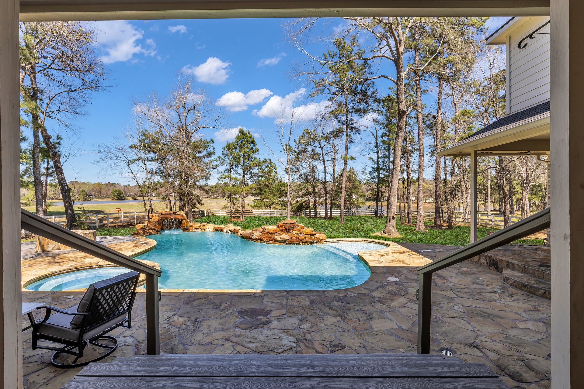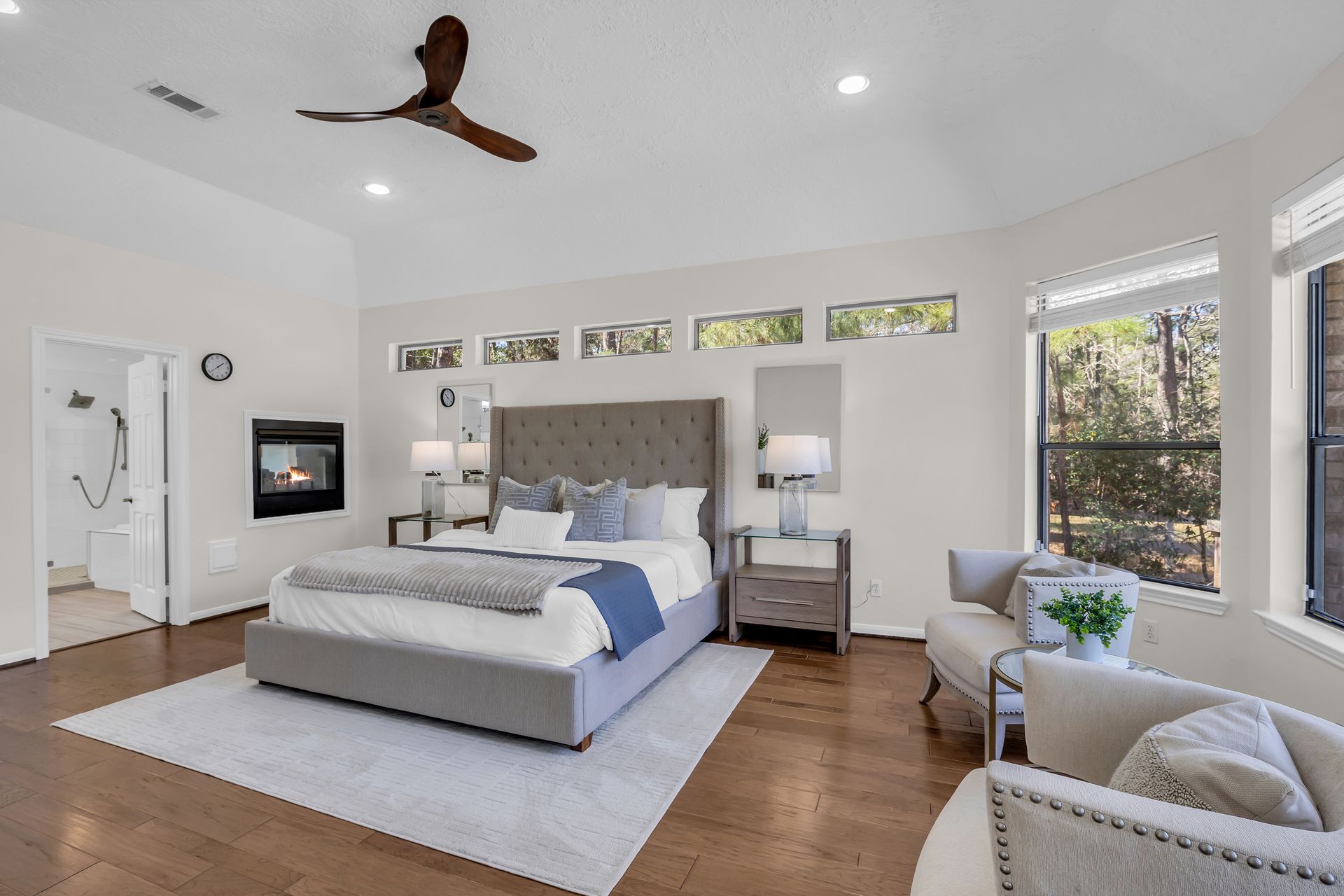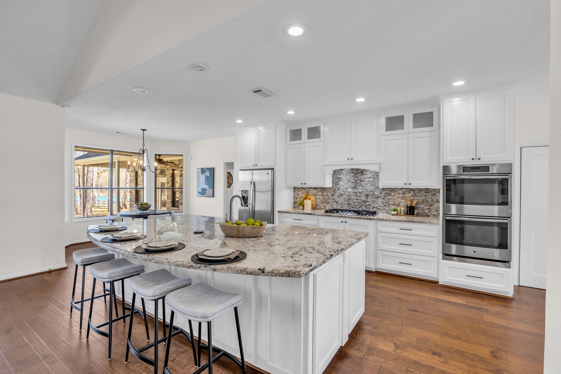 Exceptional lakefront living in Lake Windcrest. This beautifully updated seven-bedroom estate offers rare first-floor amenities, including a serene primary suite with a fireplace, custom closet, and private access to the backyard. Two additional first-floor guest suites, one ideal for multigenerational living, provides comfort and privacy. Enjoy dining spaces, a dedicated office, and a chef’s kitchen with double ovens, an oversized island with storage, a farmhouse sink, a pot filler, and a five-burner gas cooktop. Upstairs features four bedrooms, a game/flex room, and stunning views. Outdoors, relax by the pool/spa, fire pit, and tranquil lake. Additional highlights include a pool bathroom, water filtration system, central vacuum, and epoxy garage floors with extra storage. A few recent updates include all new paint on the first floor, one A/C unit (2026), one water heater (2026), new blinds downstairs (2026), updated pool equipment (2022), and a roof (2020). Located near trails, lakes, golf, and top-rated schools with easy access to The Woodlands.