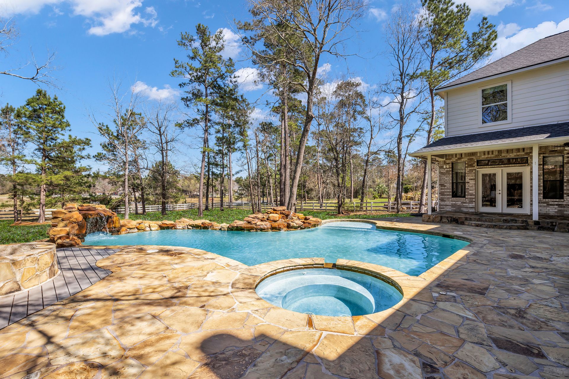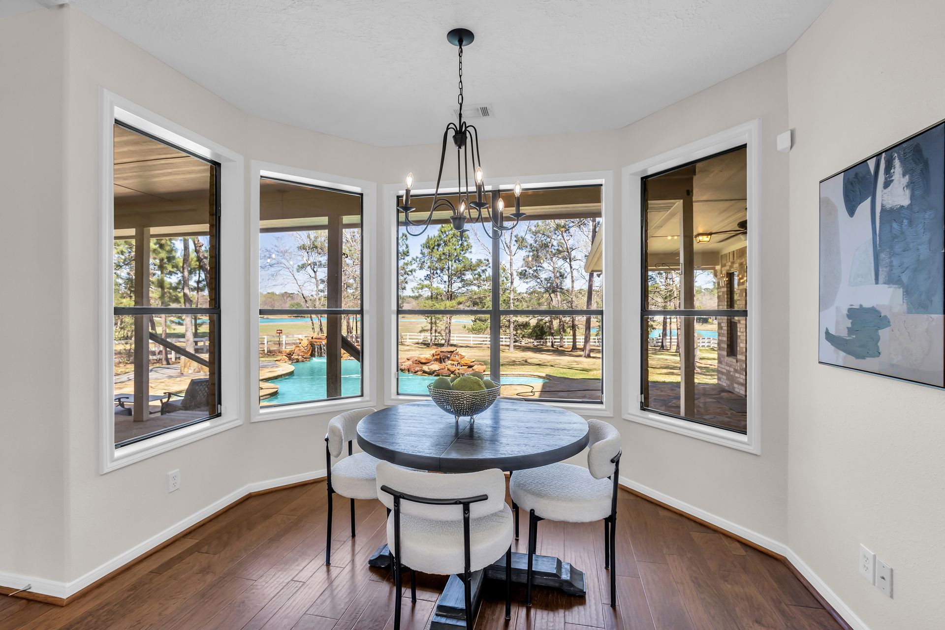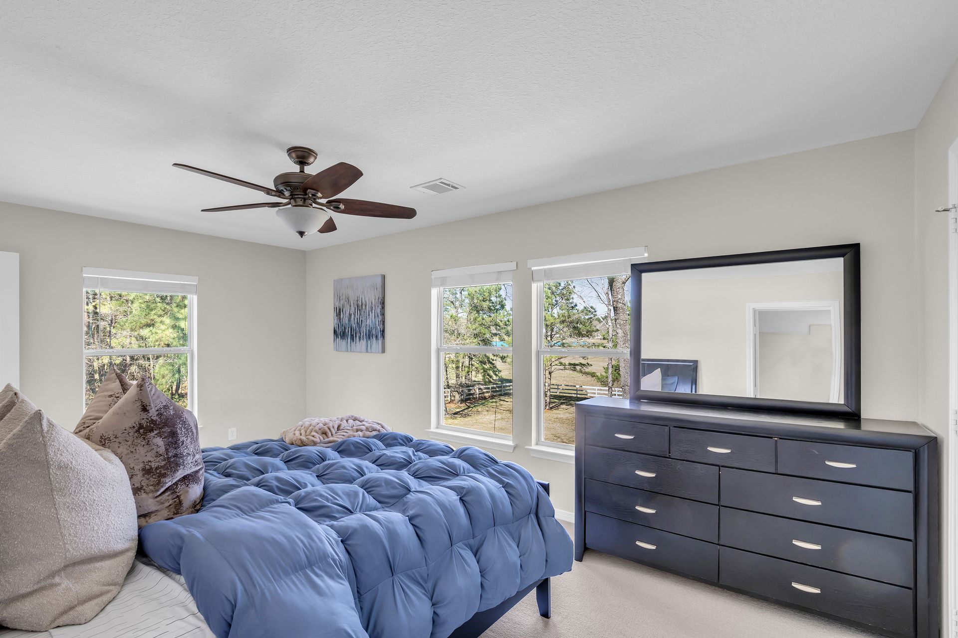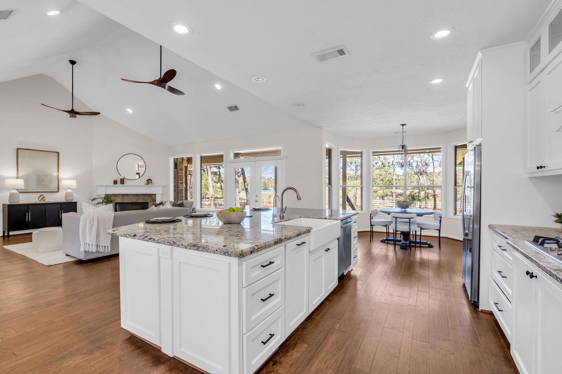 Exceptional lakefront living in Lake Windcrest. This beautifully updated seven-bedroom estate offers rare first-floor amenities, including a serene primary suite with a fireplace, custom closet, and private access to the backyard. Two additional first-floor guest suites, one ideal for multigenerational living, provides comfort and privacy. Enjoy dining spaces, a dedicated office, and a chef’s kitchen with double ovens, an oversized island with storage, a farmhouse sink, a pot filler, and a five-burner gas cooktop. Upstairs features four bedrooms, a game/flex room, and stunning views. Outdoors, relax by the pool/spa, fire pit, and tranquil lake. Additional highlights include a pool bathroom, water filtration system, central vacuum, and epoxy garage floors with extra storage. A few recent updates include all new paint on the first floor, one A/C unit (2026), one water heater (2026), new blinds downstairs (2026), updated pool equipment (2022), and a roof (2020). Located near trails, lakes, golf, and top-rated schools with easy access to The Woodlands.