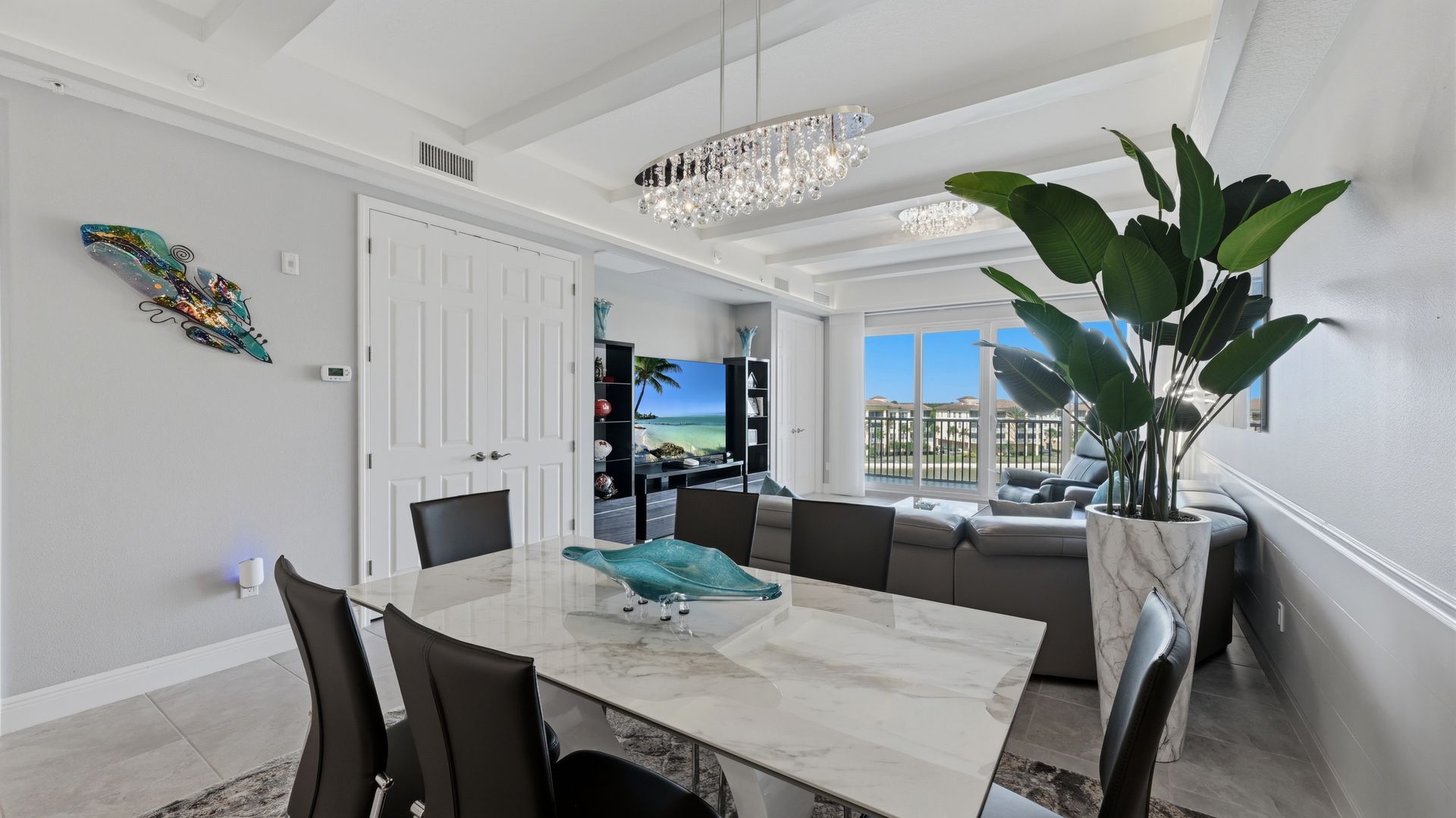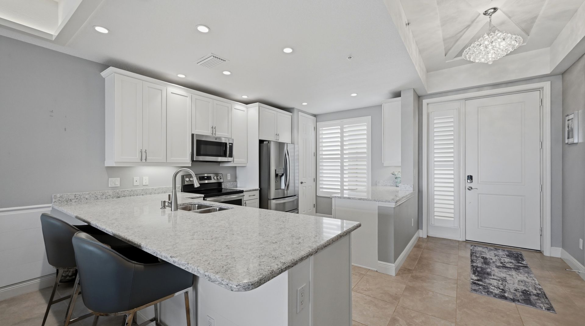 This light-filled two-bedroom, two-bath condominium features an open-concept layout ideal for both everyday living and entertaining. The spacious kitchen flows seamlessly into the dining and living areas and is complemented by quality cabinetry, stone countertops, stainless steel appliances, and a generous breakfast bar. Large sliding glass doors lead to a private screened lanai where you can enjoy morning coffee or evening sunsets with tranquil water views and abundant Florida wildlife.