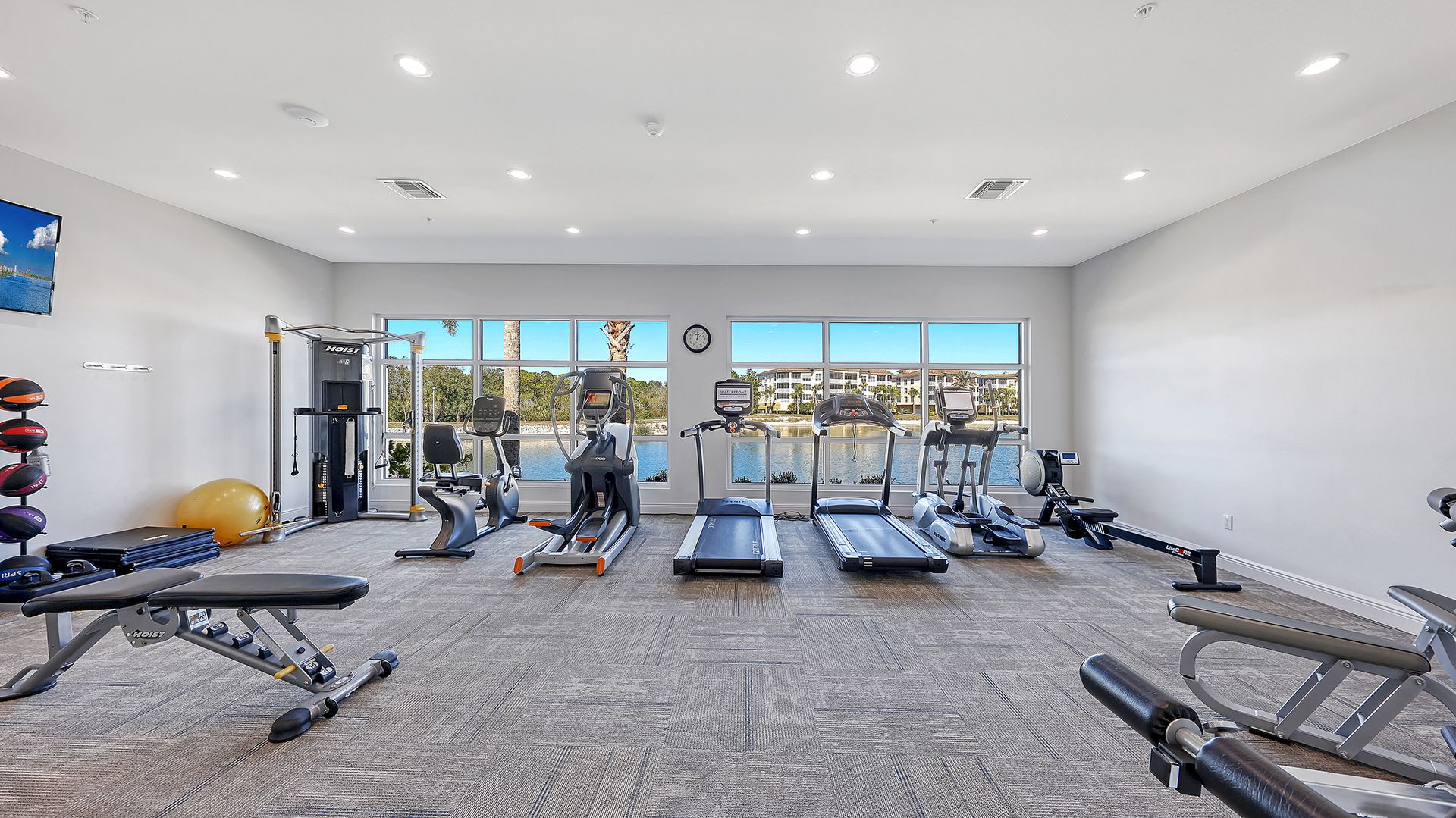 Residents enjoy a secure, gated lifestyle with resort-style amenities including a heated saltwater pool and spa, lakeside fitness center, clubhouse, fire pit, outdoor grilling areas, and kayak storage.