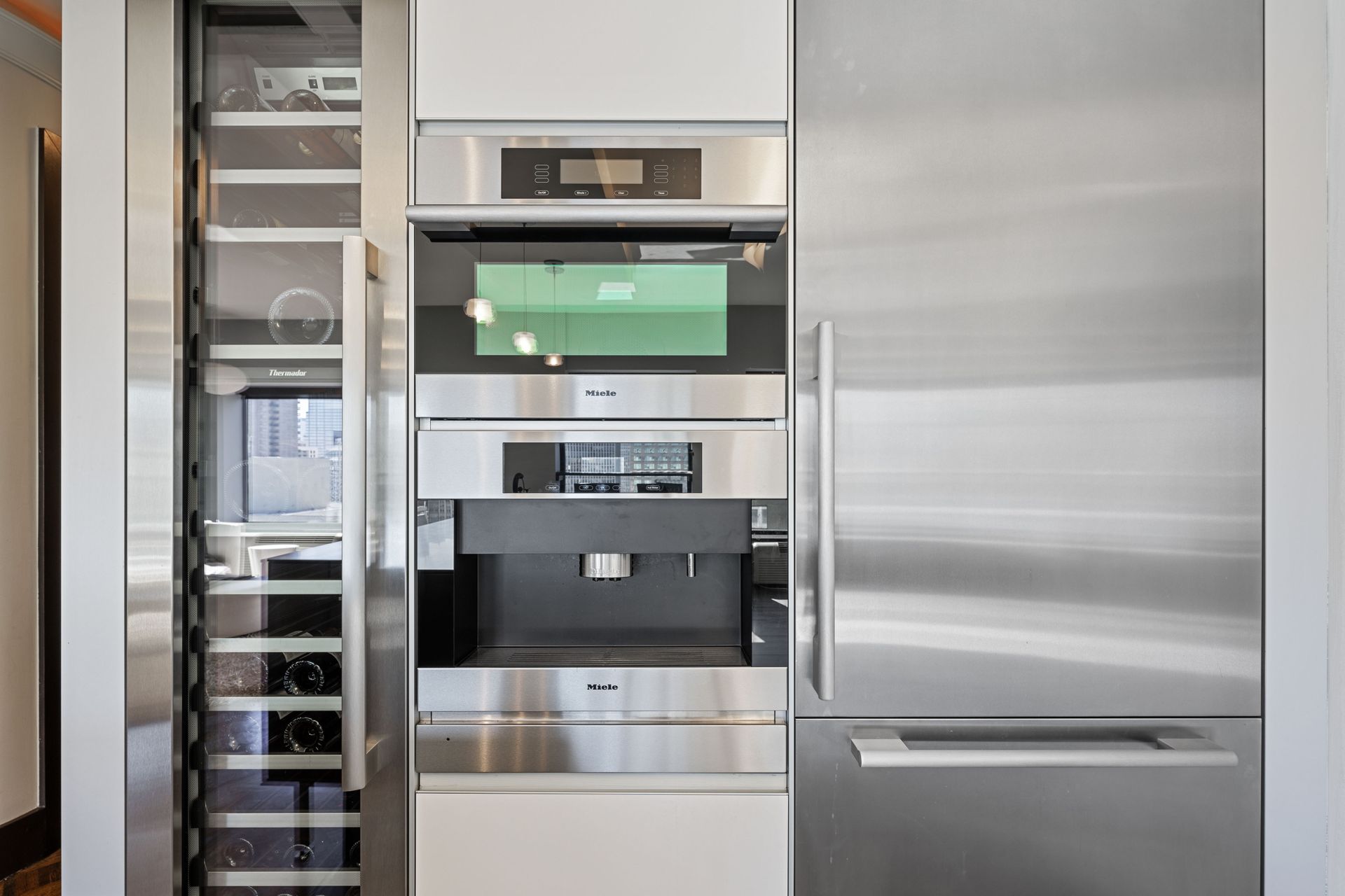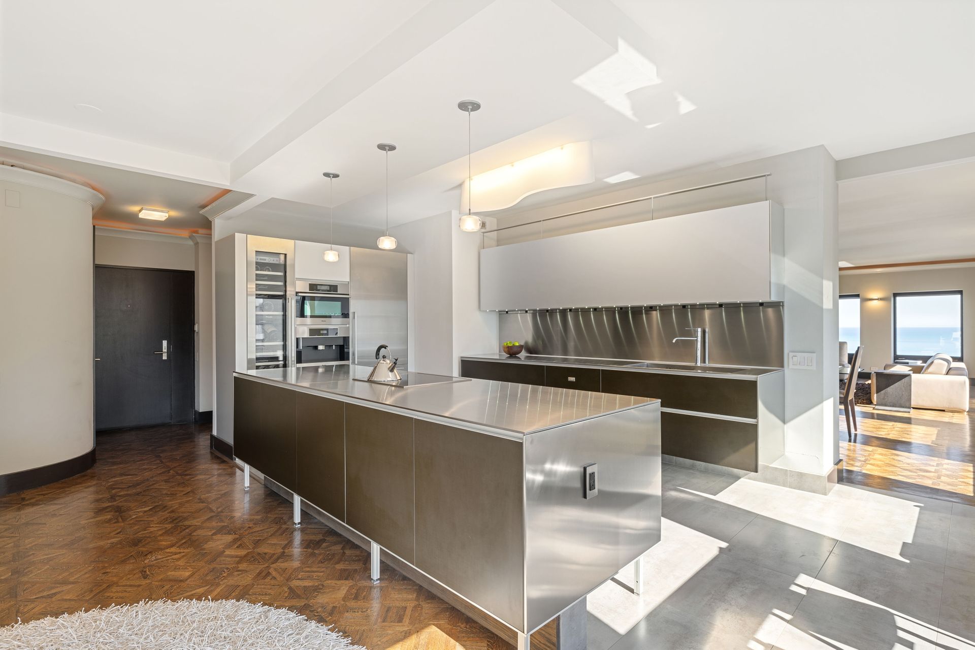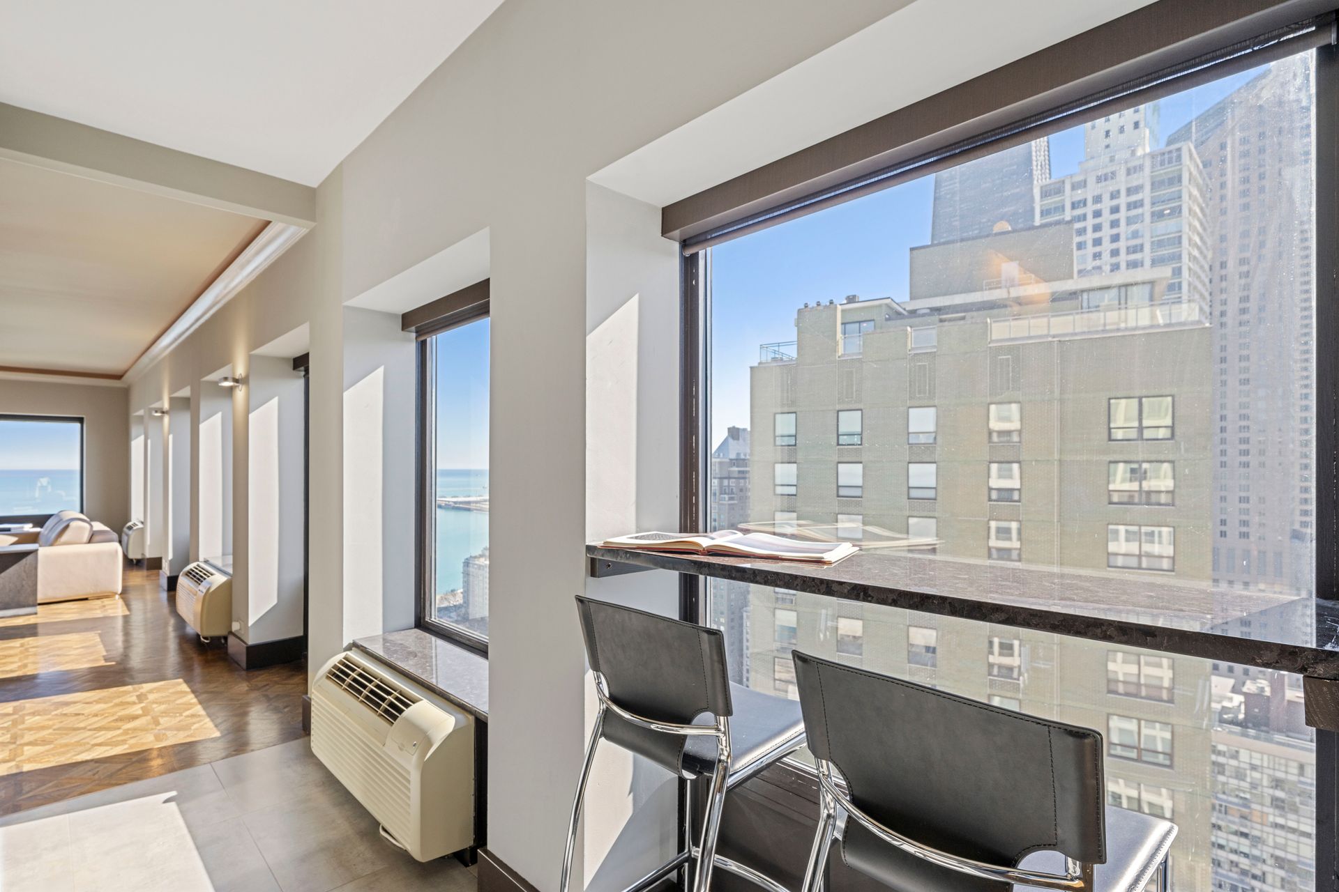 The space boasts abundant natural light through windowed walls with remote-controlled blinds, parquet flooring, raised door frames, and crown molding with cove lighting. The gourmet kitchen includes a 10-ft stainless steel island, Vallcucine Italian cabinetry, and high-end appliances like a Miele refrigerator, Thermador wine fridge, and Kuppersbusch cooktop and oven. The adjoining den enhances hospitality possibilities. The oversized living/dining area, perfect for entertaining, provides unparalleled vistas of the dynamic city and lake, complete with a wet bar. The primary bedroom offers custom closets, a luxurious en suite with a soaking tub, dual-sink vanity, and spa shower. The spacious second bedroom also features a custom closet. A full bath with natural stone finishes, an elegant powder room, and a walk-in closet with Bosch washer/dryer complete the unit. Residents enjoy private elevator access and boutique building amenities like 24-hour door staff, valet parking, fitness and hospitality rooms, a sundeck, storage, and a bike room.
