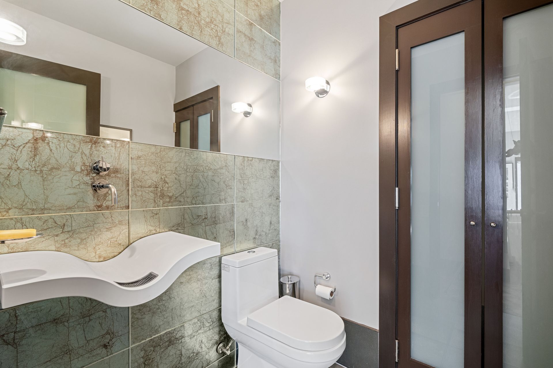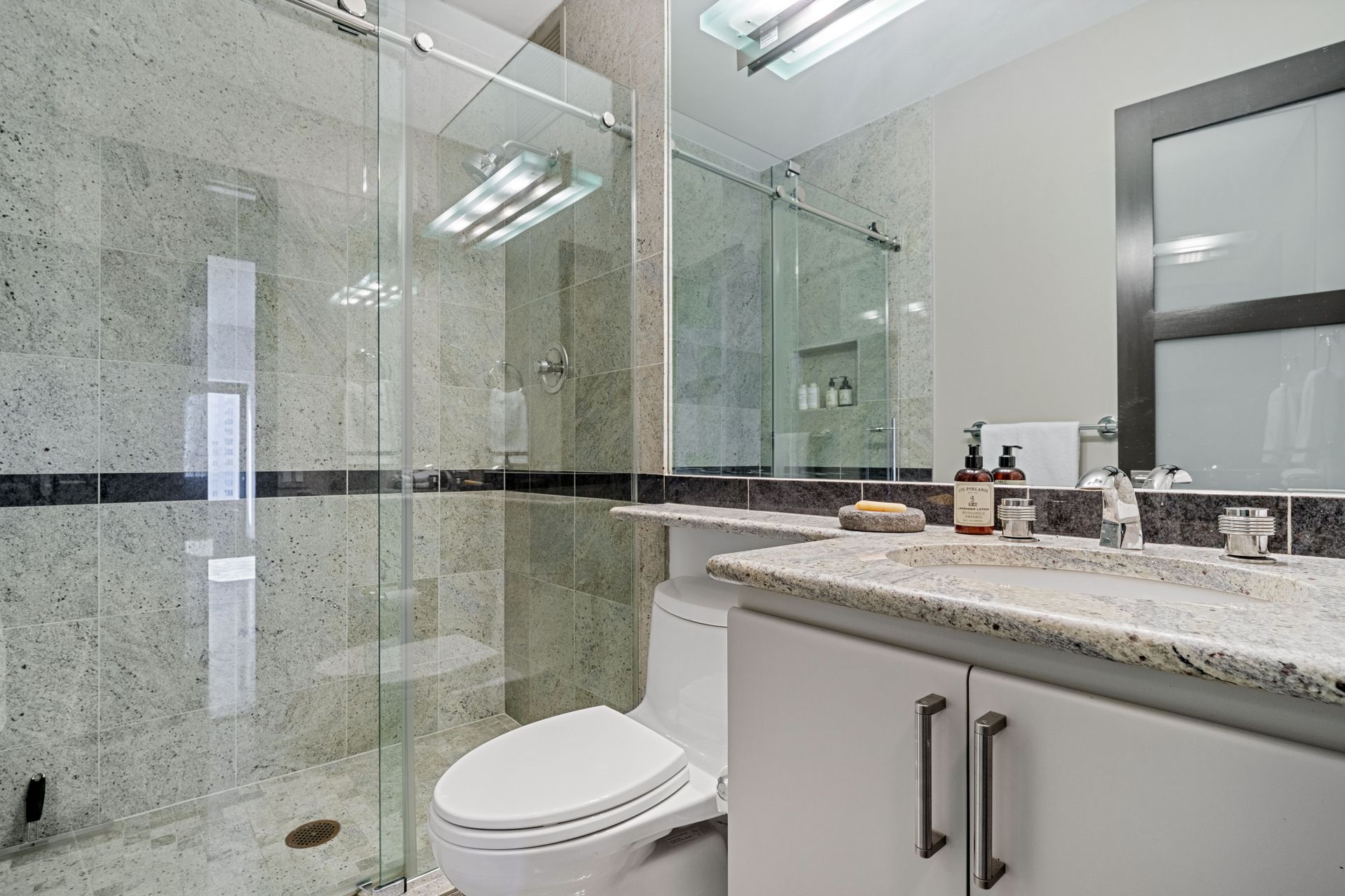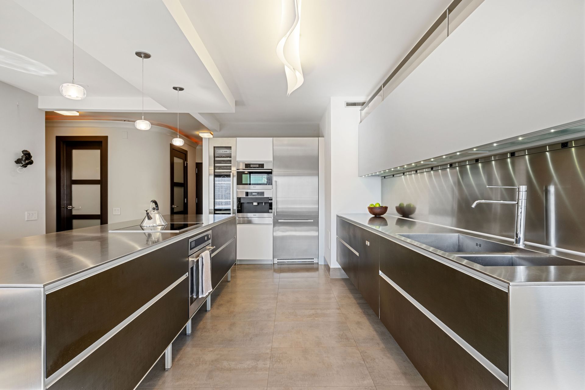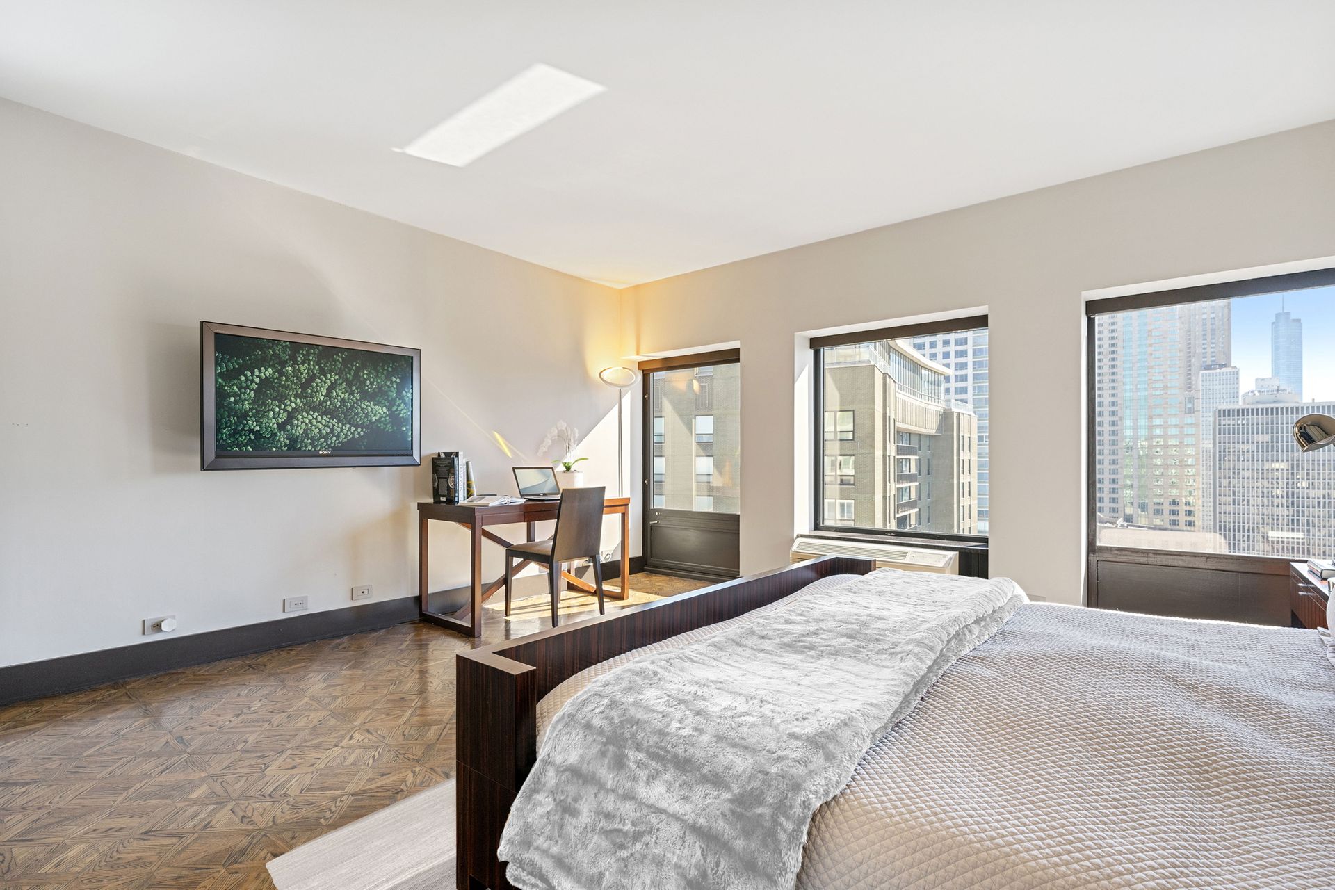 The space boasts abundant natural light through windowed walls with remote-controlled blinds, parquet flooring, raised door frames, and crown molding with cove lighting. The gourmet kitchen includes a 10-ft stainless steel island, Vallcucine Italian cabinetry, and high-end appliances like a Miele refrigerator, Thermador wine fridge, and Kuppersbusch cooktop and oven. The adjoining den enhances hospitality possibilities. The oversized living/dining area, perfect for entertaining, provides unparalleled vistas of the dynamic city and lake, complete with a wet bar. The primary bedroom offers custom closets, a luxurious en suite with a soaking tub, dual-sink vanity, and spa shower. The spacious second bedroom also features a custom closet. A full bath with natural stone finishes, an elegant powder room, and a walk-in closet with Bosch washer/dryer complete the unit. Residents enjoy private elevator access and boutique building amenities like 24-hour door staff, valet parking, fitness and hospitality rooms, a sundeck, storage, and a bike room.