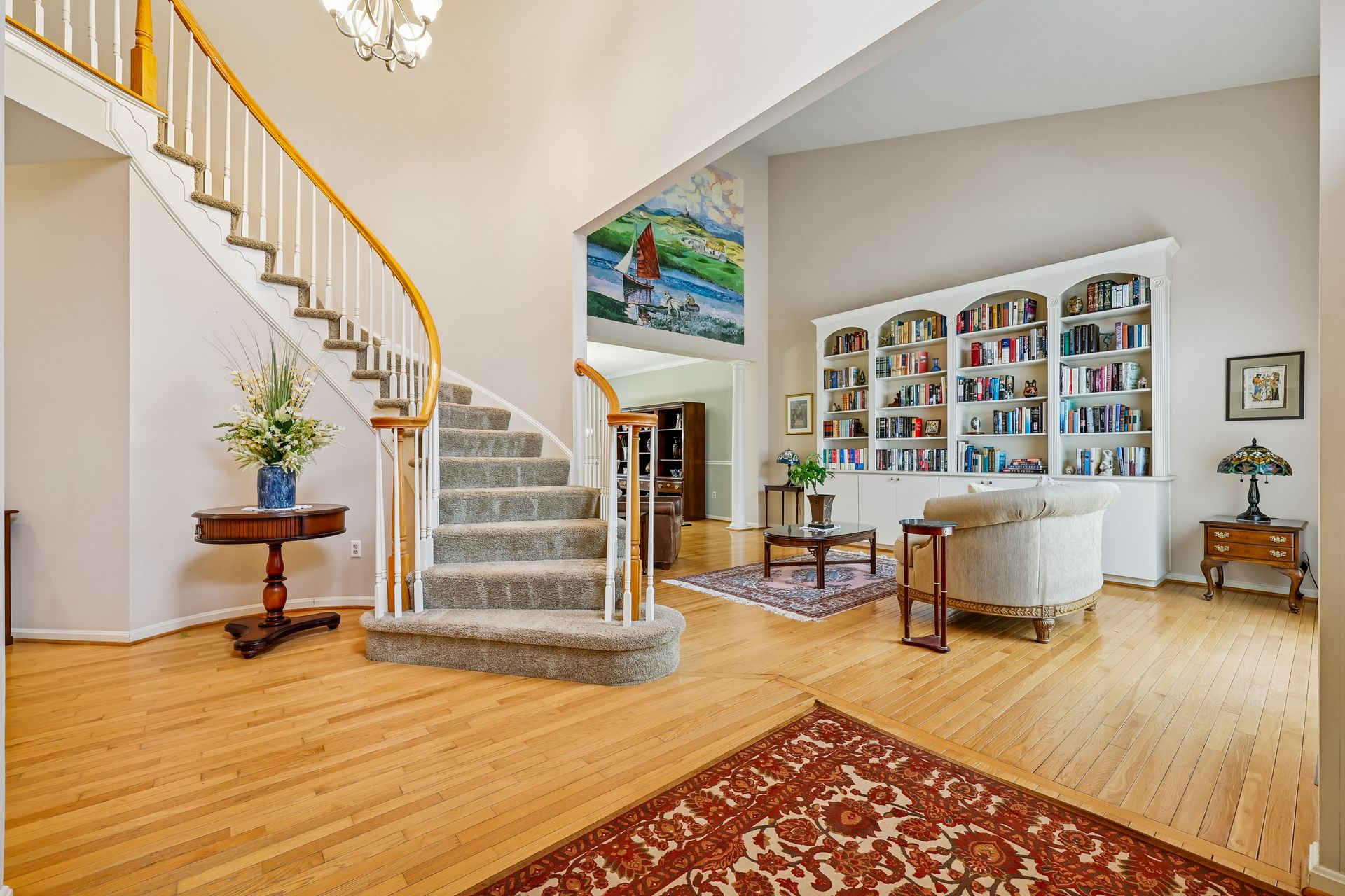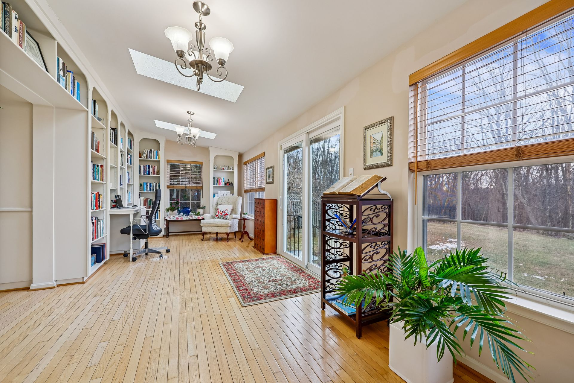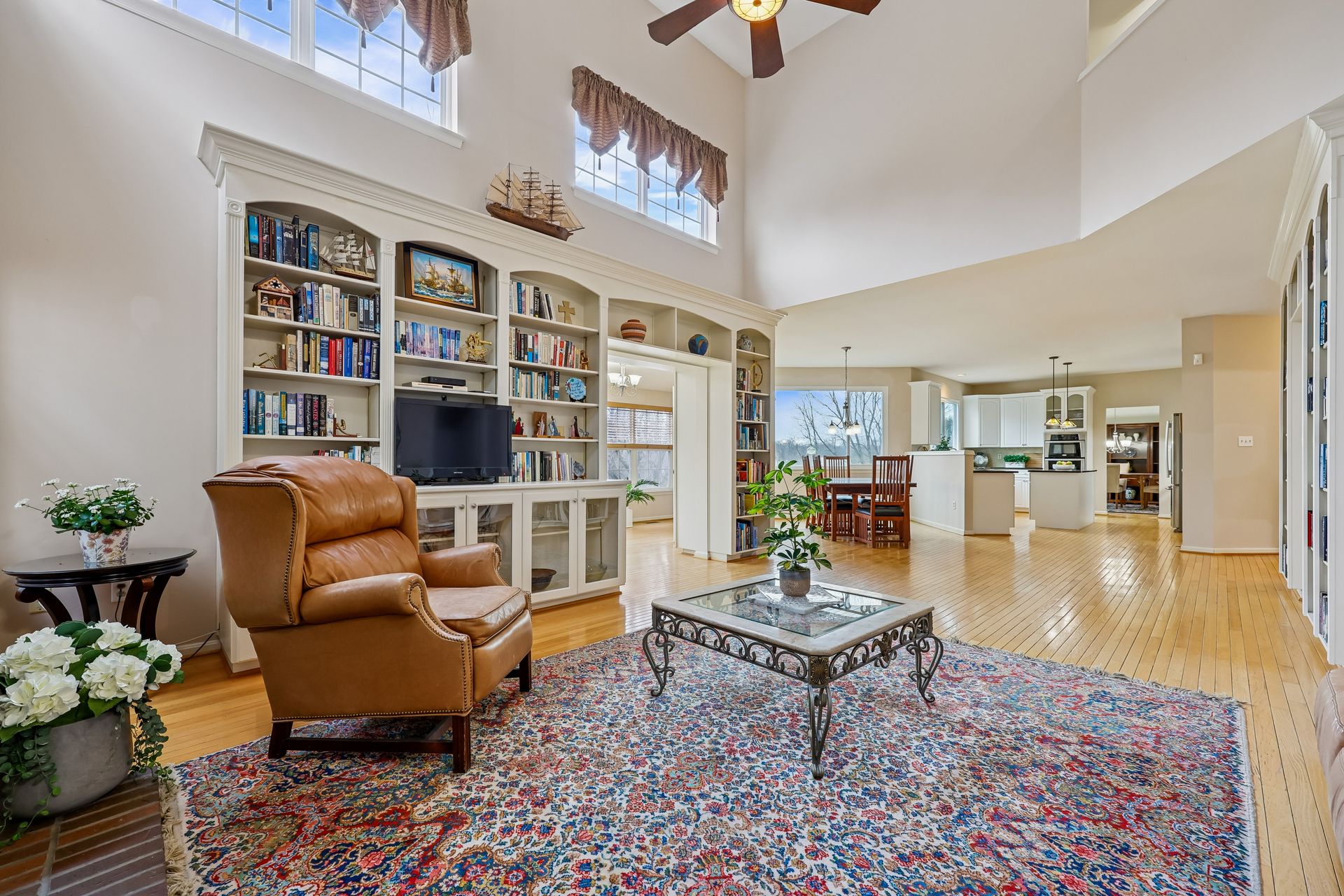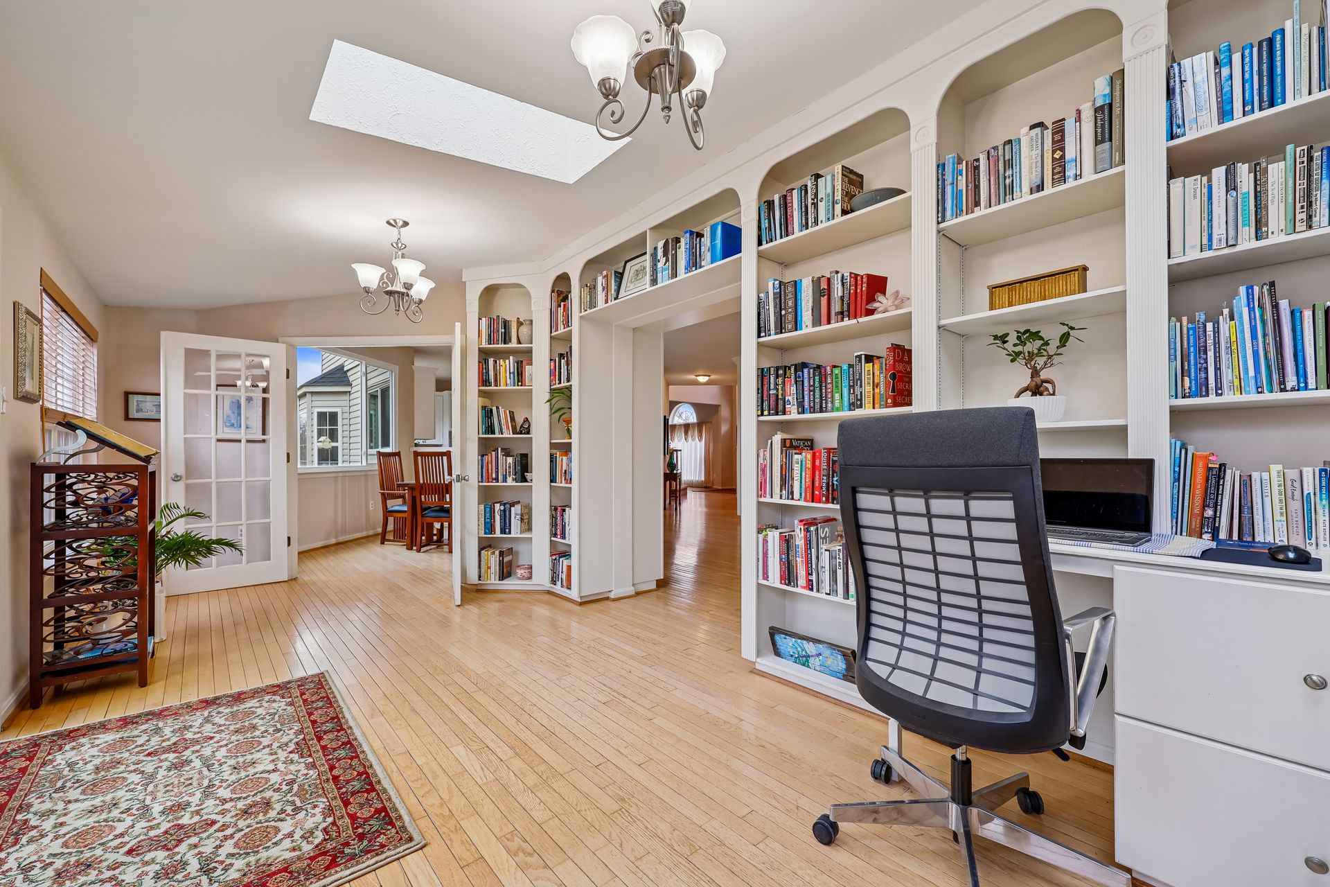 The main level features a separate family room with 20-foot ceilings, a gas fireplace, and a second staircase. The spacious sunroom is perfect for morning coffee, reading, or simply enjoying peaceful views of the backyard. A dedicated den provides a quiet retreat for a home office, study, or library, complemented by custom built-in bookshelves that add both charm and functionality. The fully finished, spacious basement has two dens, a full bath, a gas fireplace, and storage rooms.