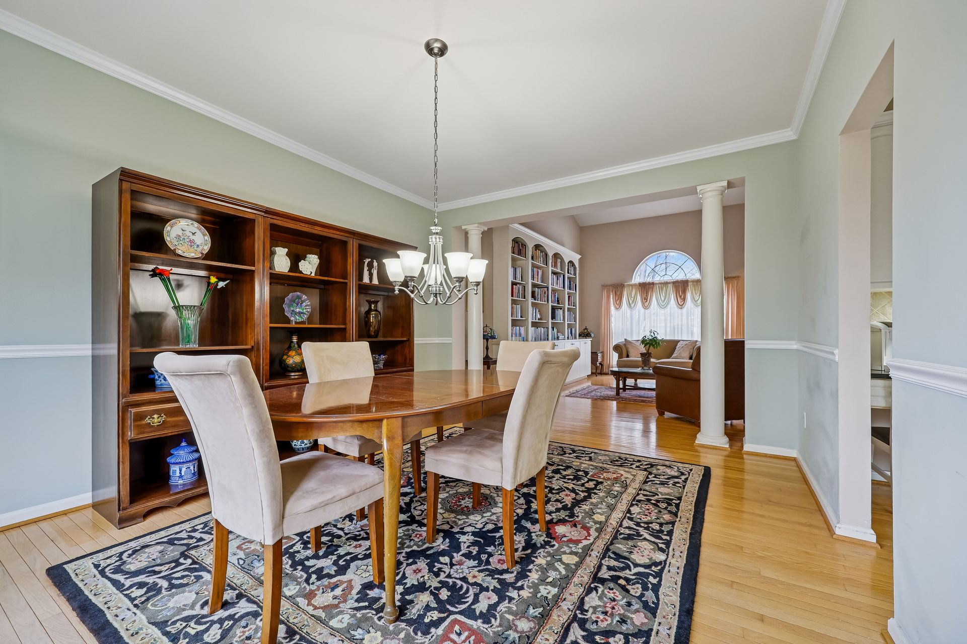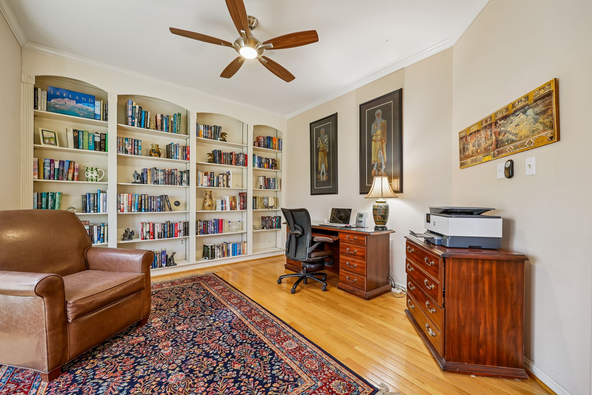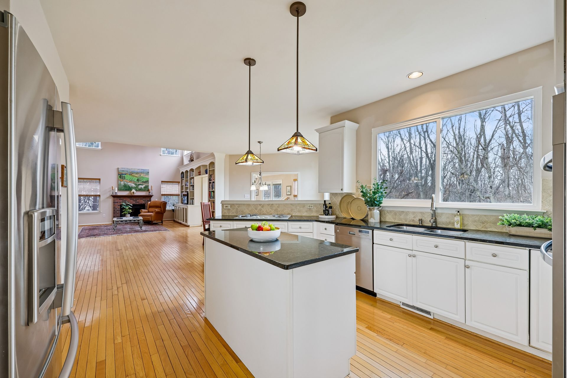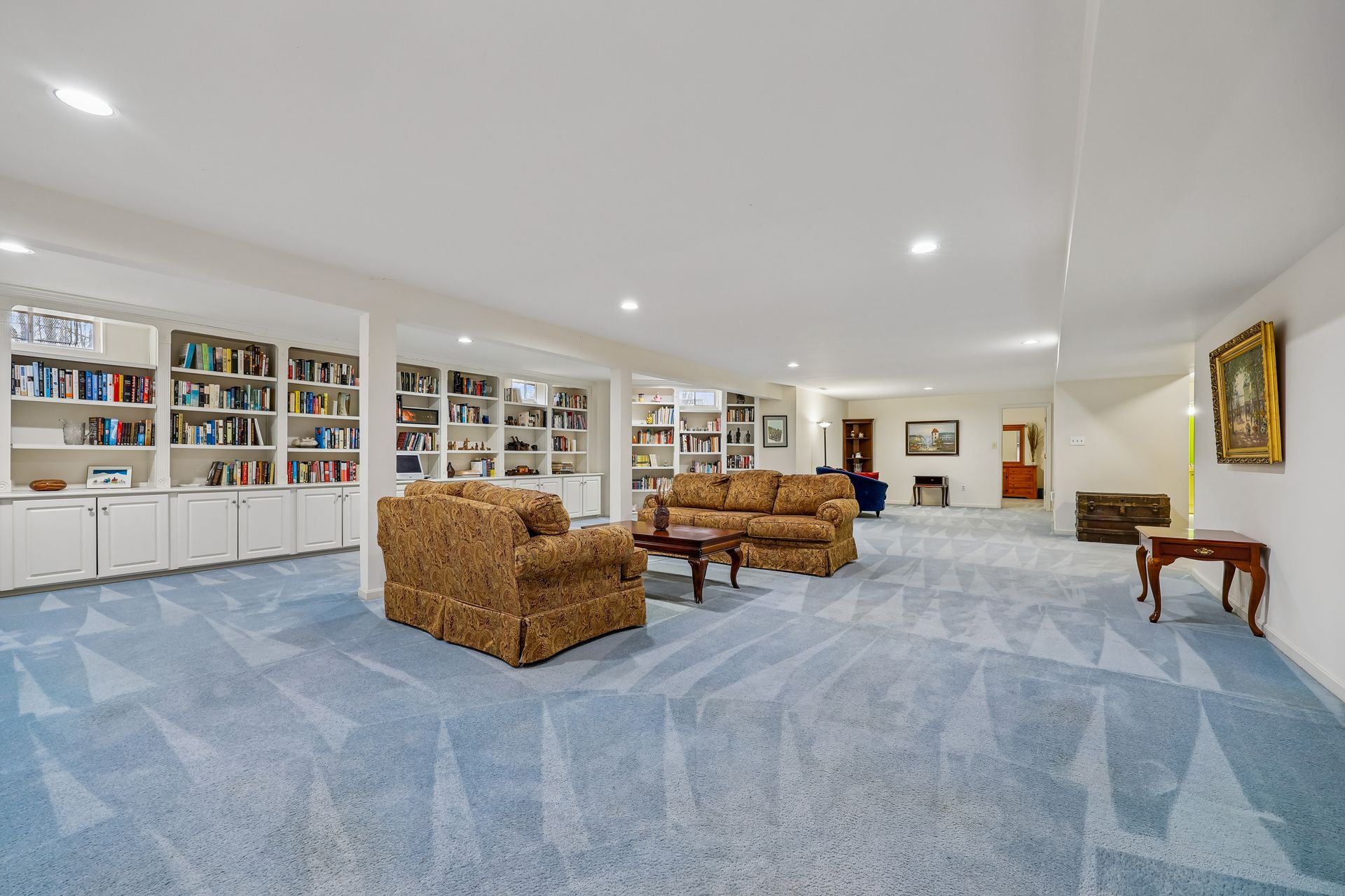 The main level features a separate family room with 20-foot ceilings, a gas fireplace, and a second staircase. The spacious sunroom is perfect for morning coffee, reading, or simply enjoying peaceful views of the backyard. A dedicated den provides a quiet retreat for a home office, study, or library, complemented by custom built-in bookshelves that add both charm and functionality. The fully finished, spacious basement has two dens, a full bath, a gas fireplace, and storage rooms.