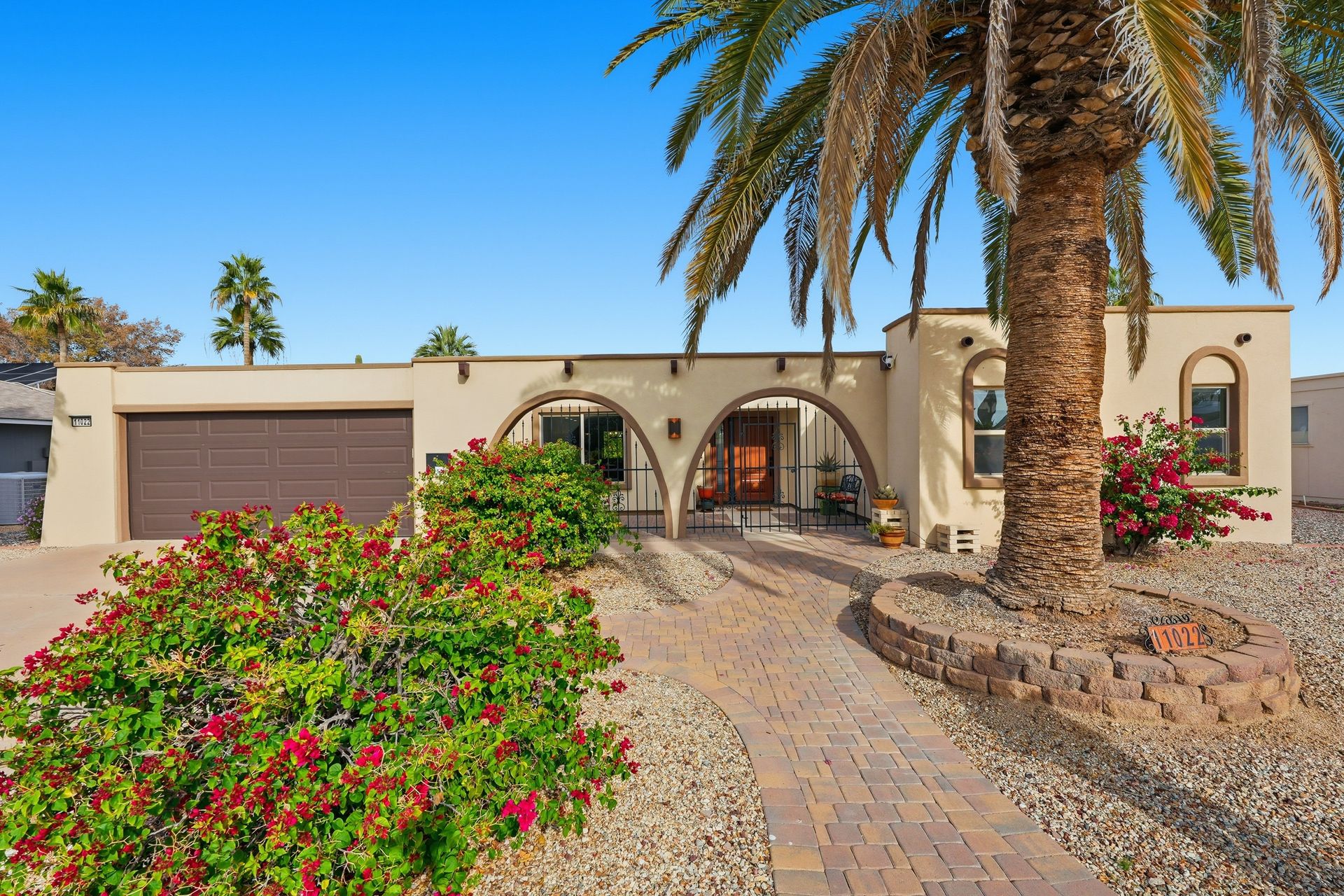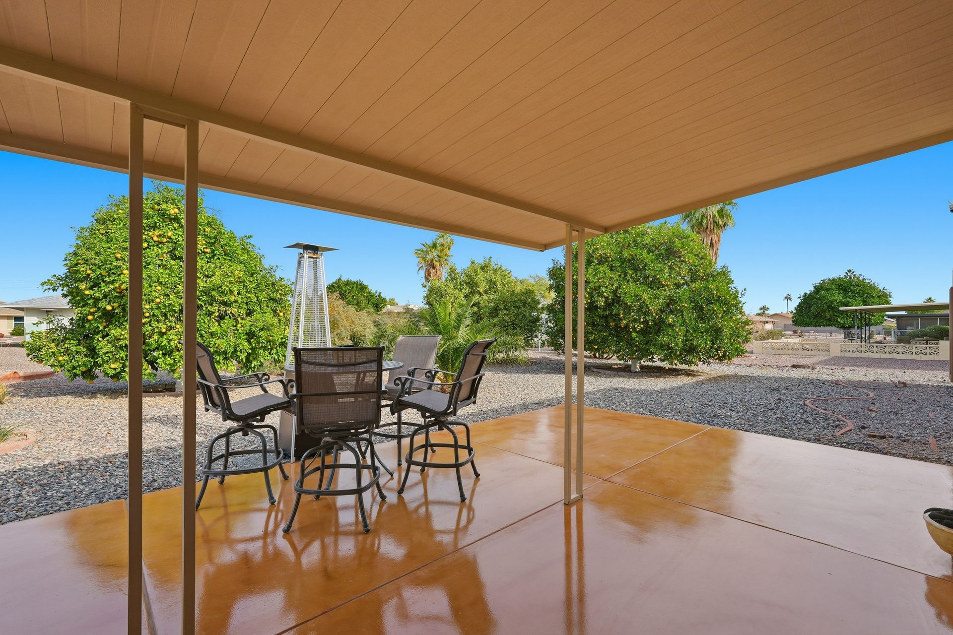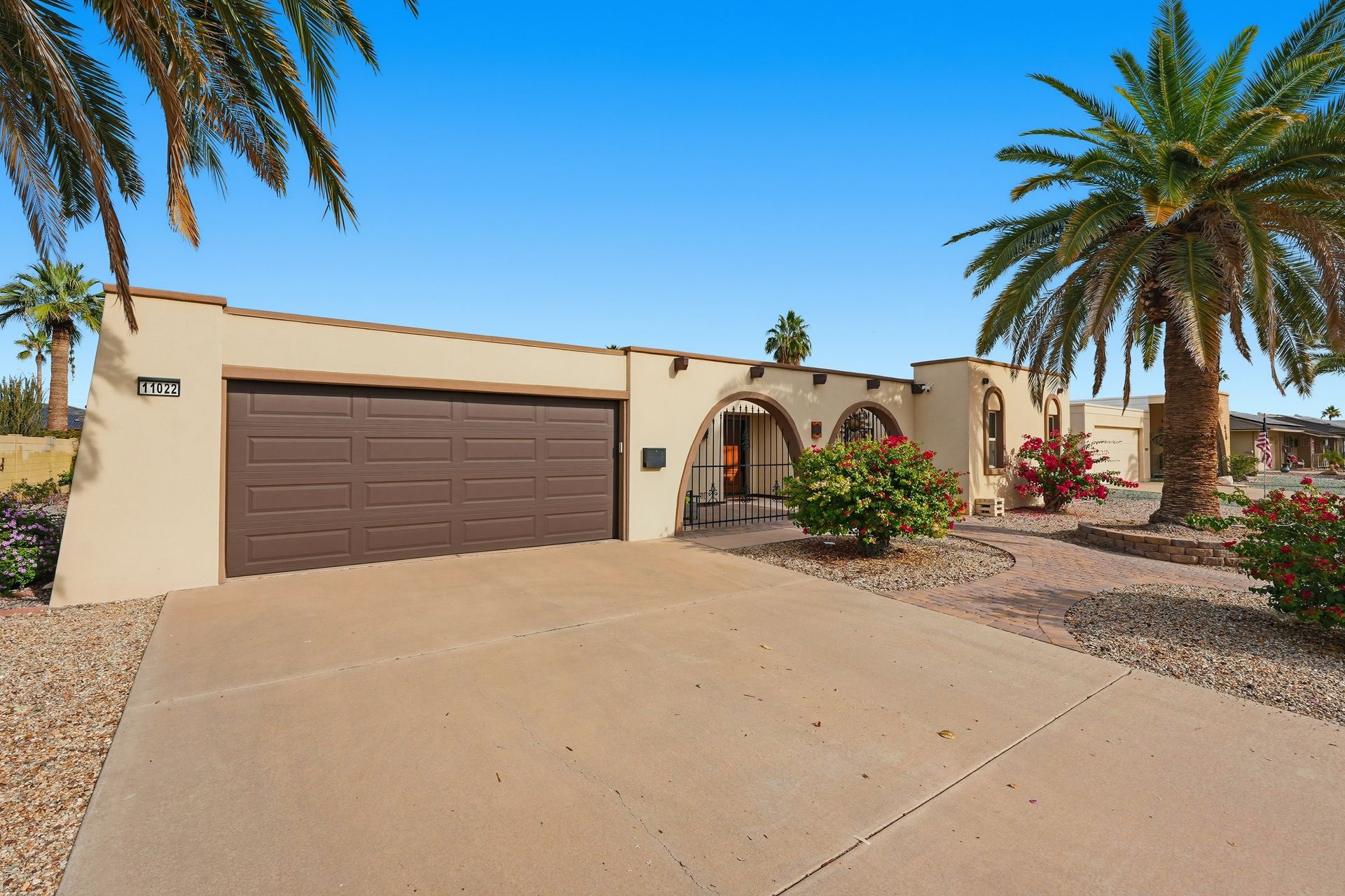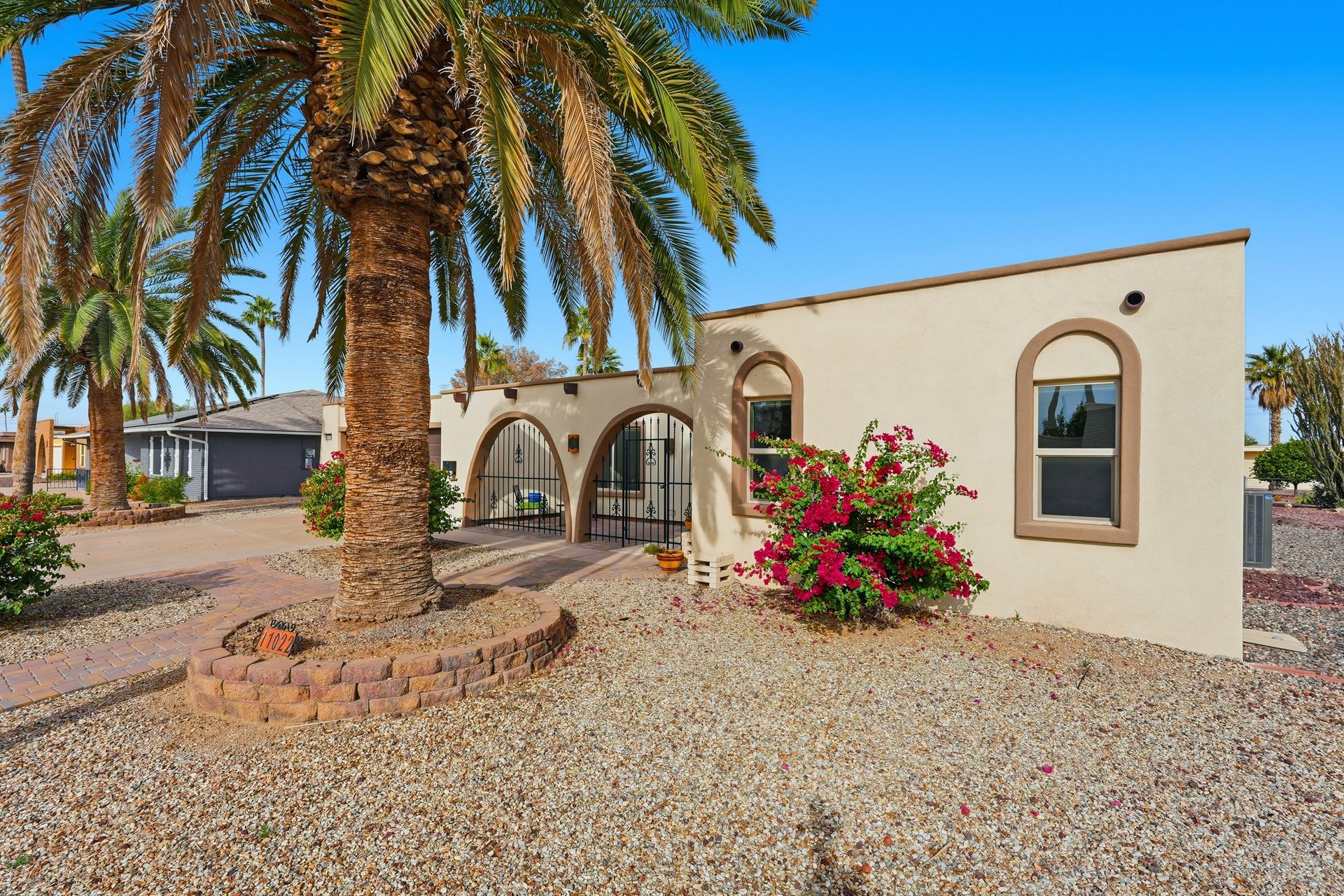 This immaculately maintained two-bedroom, two-bath home boasts approximately 1,600 square feet of living space with an extended garage/workshop on a large private lot. The interior features custom curtains and blinds, and new interior paint applied in 2021. This home has been tastefully updated throughout, including a new garage door, custom front lighting, and a custom front door and interior door. The primary bedroom and bath have been thoughtfully designed with dual sinks and a tile and stone walk-in shower. The additional bedroom has a Murphy bed and a second updated bathroom for guests. The backyard is a true oasis, featuring a stamped concrete-covered patio that is perfect for outdoor relaxation and entertainment. The property also includes several fruit trees, including an Arizona Sweet Orange tree, a pomegranate tree, a pink grapefruit tree, and a variegated pink lemon tree, adding to the lush and natural ambiance. For added security and convenience, the home is equipped with an owned security system. Other updates include stainless steel appliances, recessed kitchen lighting, a new A/C unit installed in 2022, and a new roof in 2021, ensuring energy-efficiency and well-maintained comfort. This property offers a wonderful opportunity to enjoy a comfortable and updated living experience located near stores, hospitals, and much, much more. Sun City has seven recreation centers that include golf, recreation, swimming, sports, arts/crafts, and numerous clubs to keep you engaged year-round. Welcome Home!