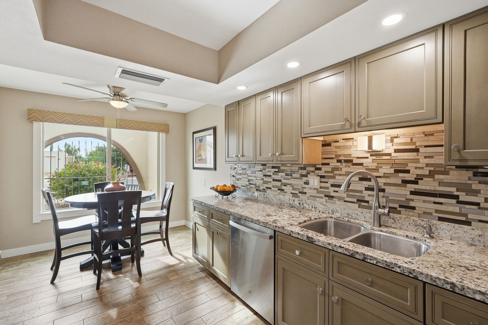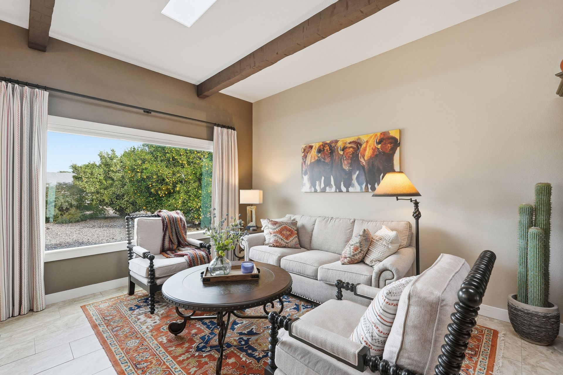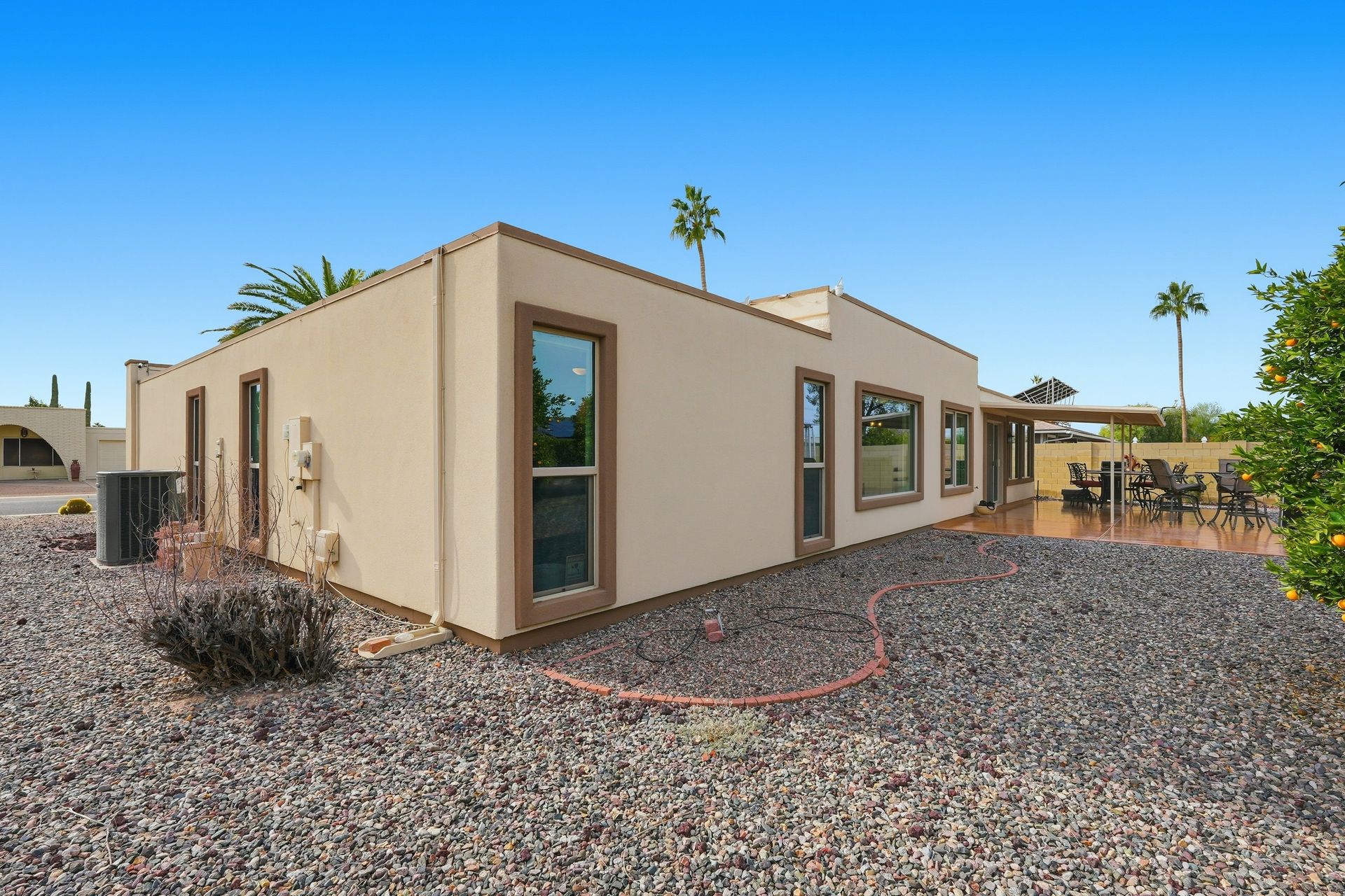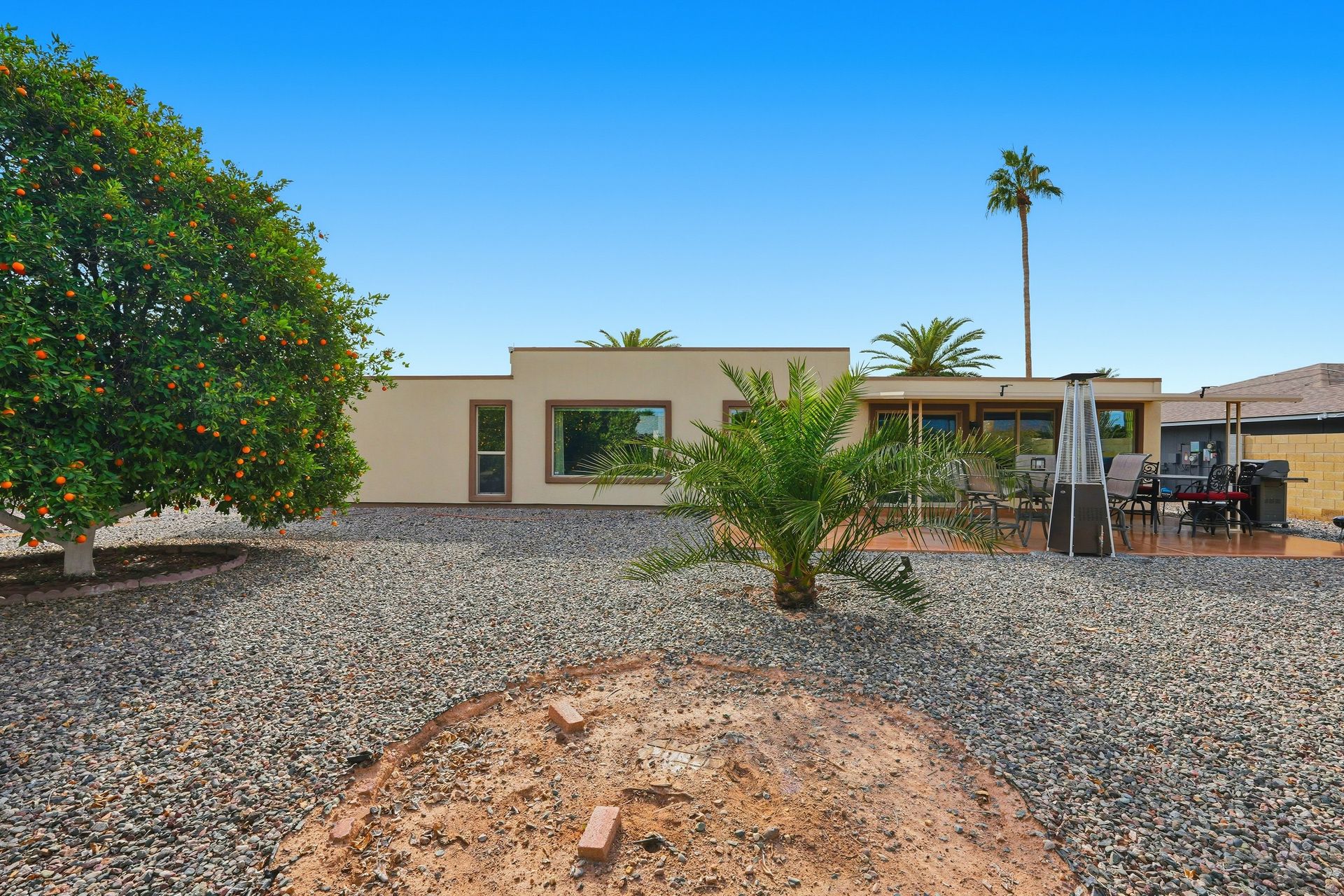 This immaculately maintained two-bedroom, two-bath home boasts approximately 1,600 square feet of living space with an extended garage/workshop on a large private lot. The interior features custom curtains and blinds, and new interior paint applied in 2021. This home has been tastefully updated throughout, including a new garage door, custom front lighting, and a custom front door and interior door. The primary bedroom and bath have been thoughtfully designed with dual sinks and a tile and stone walk-in shower. The additional bedroom has a Murphy bed and a second updated bathroom for guests. The backyard is a true oasis, featuring a stamped concrete-covered patio that is perfect for outdoor relaxation and entertainment. The property also includes several fruit trees, including an Arizona Sweet Orange tree, a pomegranate tree, a pink grapefruit tree, and a variegated pink lemon tree, adding to the lush and natural ambiance. For added security and convenience, the home is equipped with an owned security system. Other updates include stainless steel appliances, recessed kitchen lighting, a new A/C unit installed in 2022, and a new roof in 2021, ensuring energy-efficiency and well-maintained comfort. This property offers a wonderful opportunity to enjoy a comfortable and updated living experience located near stores, hospitals, and much, much more. Sun City has seven recreation centers that include golf, recreation, swimming, sports, arts/crafts, and numerous clubs to keep you engaged year-round. Welcome Home!