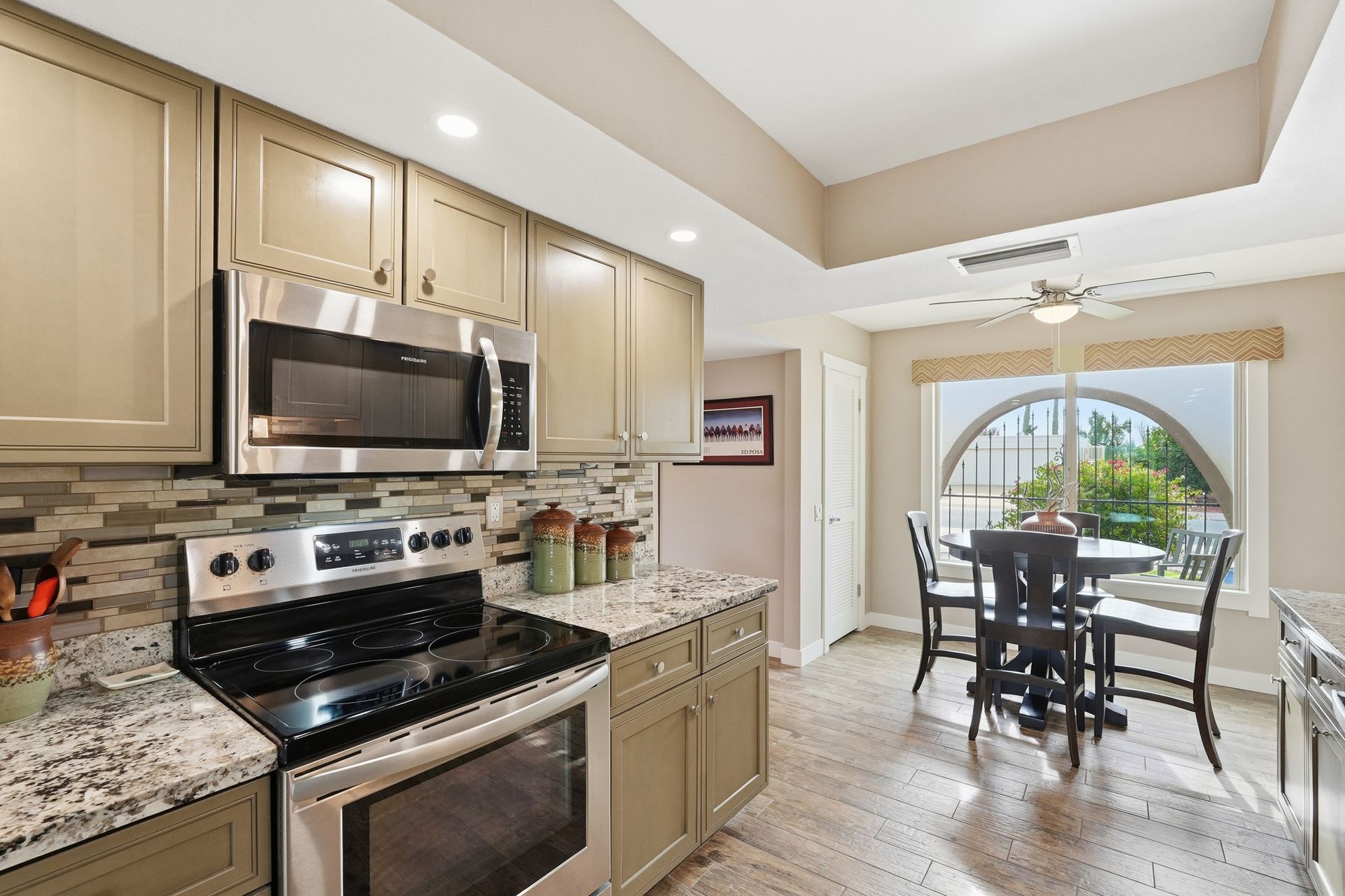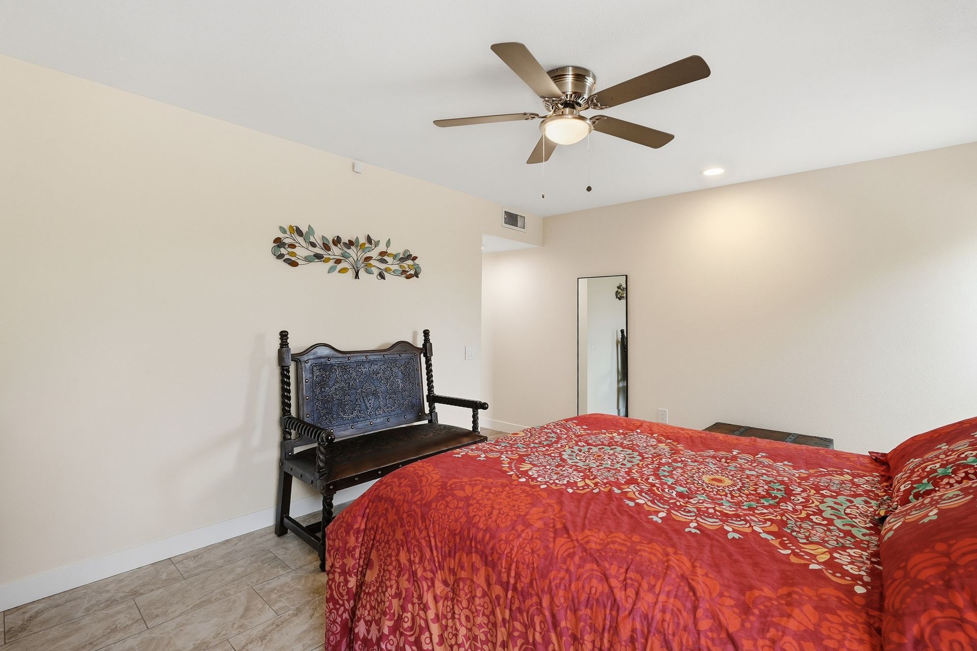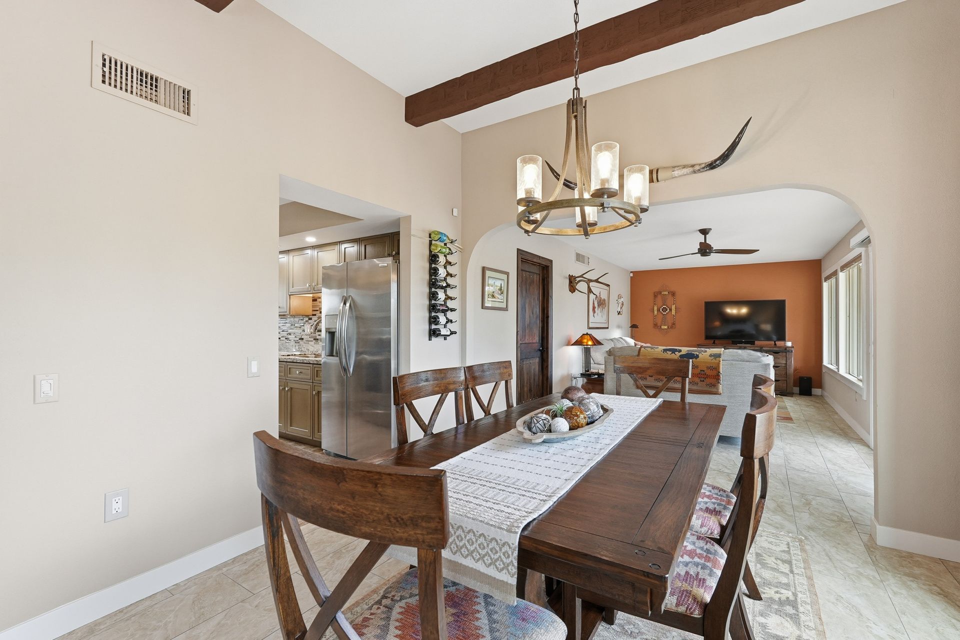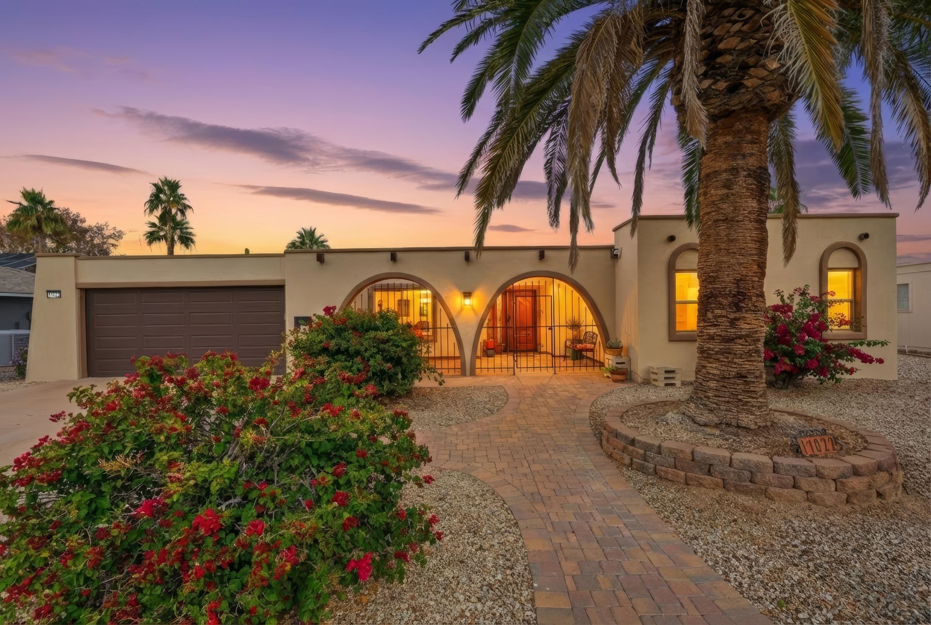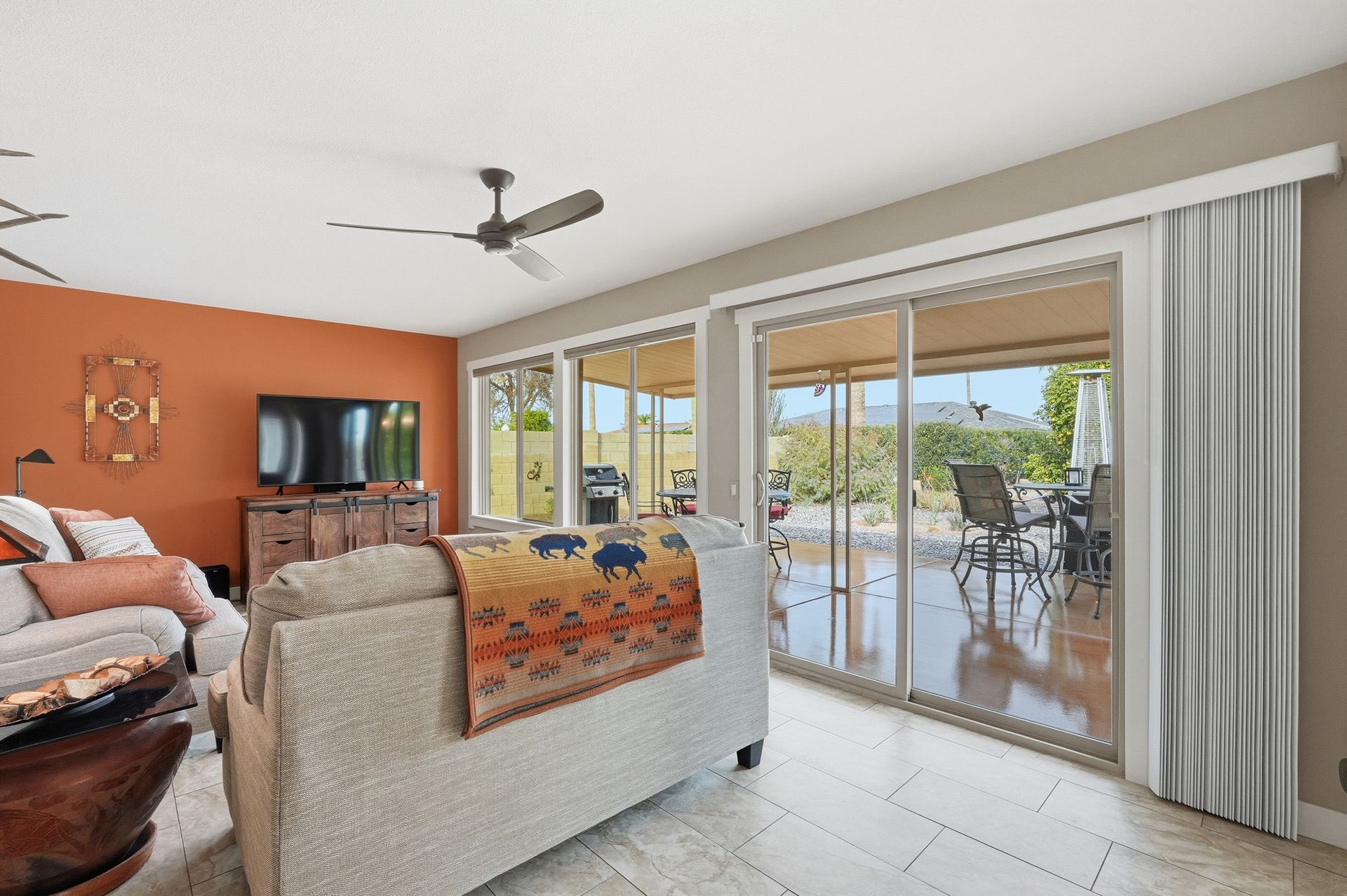 This immaculately maintained two-bedroom, two-bath home boasts approximately 1,600 square feet of living space with an extended garage/workshop on a large private lot. The interior features custom curtains and blinds, and new interior paint applied in 2021. This home has been tastefully updated throughout, including a new garage door, custom front lighting, and a custom front door and interior door. The primary bedroom and bath have been thoughtfully designed with dual sinks and a tile and stone walk-in shower. The additional bedroom has a Murphy bed and a second updated bathroom for guests. The backyard is a true oasis, featuring a stamped concrete-covered patio that is perfect for outdoor relaxation and entertainment. The property also includes several fruit trees, including an Arizona Sweet Orange tree, a pomegranate tree, a pink grapefruit tree, and a variegated pink lemon tree, adding to the lush and natural ambiance. For added security and convenience, the home is equipped with an owned security system. Other updates include stainless steel appliances, recessed kitchen lighting, a new A/C unit installed in 2022, and a new roof in 2021, ensuring energy-efficiency and well-maintained comfort. This property offers a wonderful opportunity to enjoy a comfortable and updated living experience located near stores, hospitals, and much, much more. Sun City has seven recreation centers that include golf, recreation, swimming, sports, arts/crafts, and numerous clubs to keep you engaged year-round. Welcome Home!