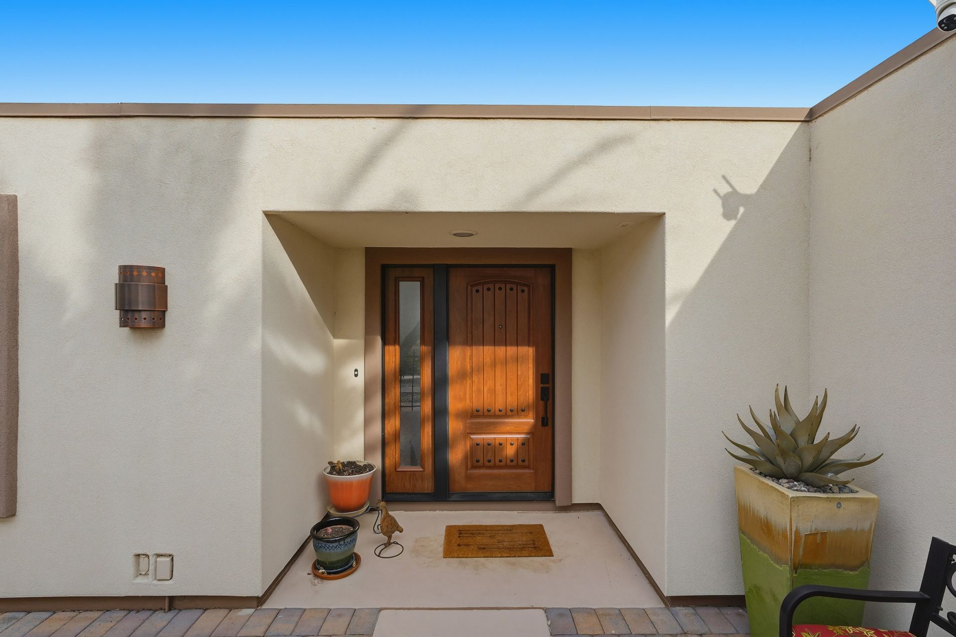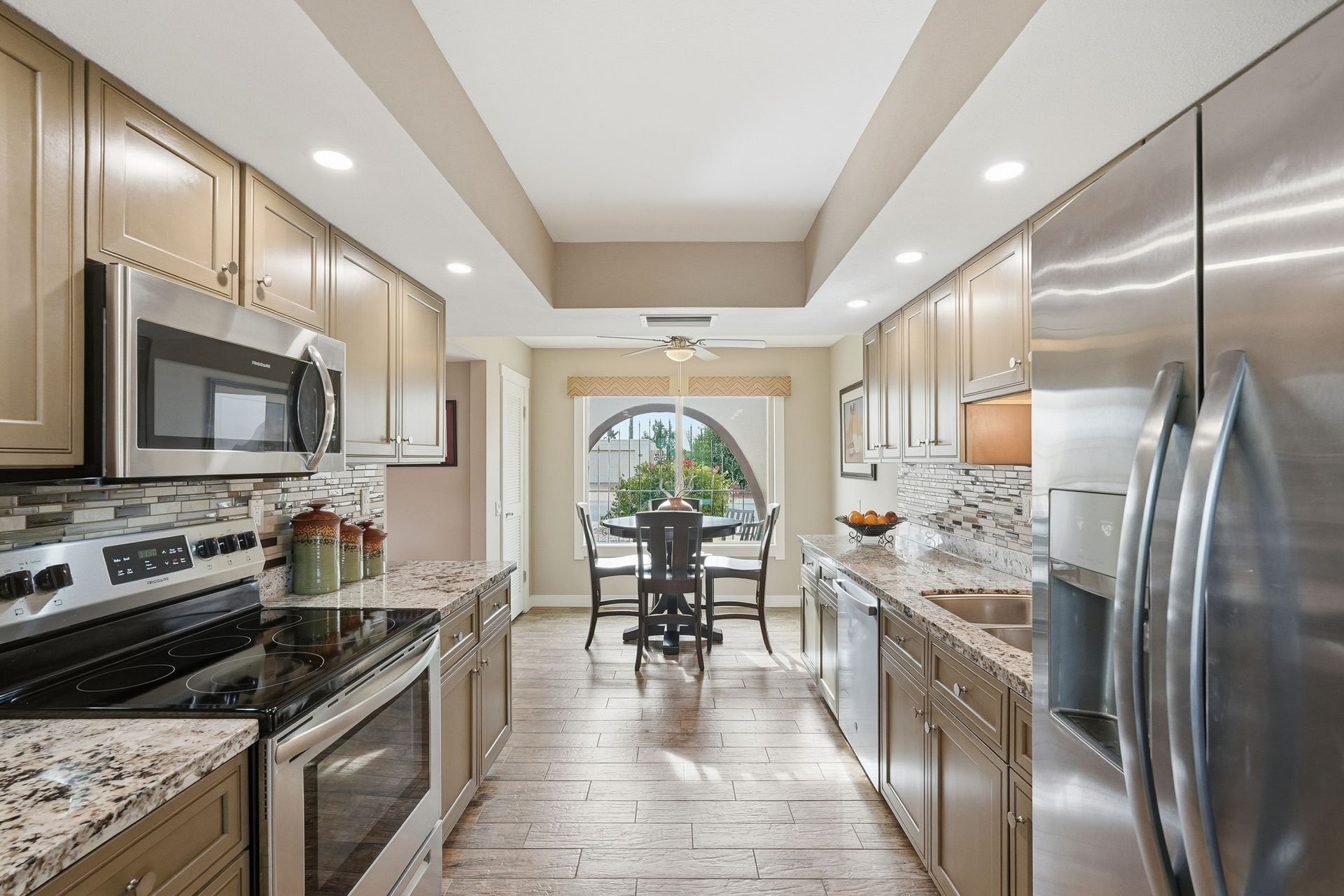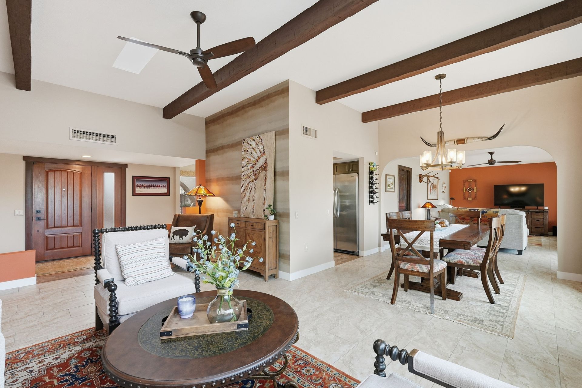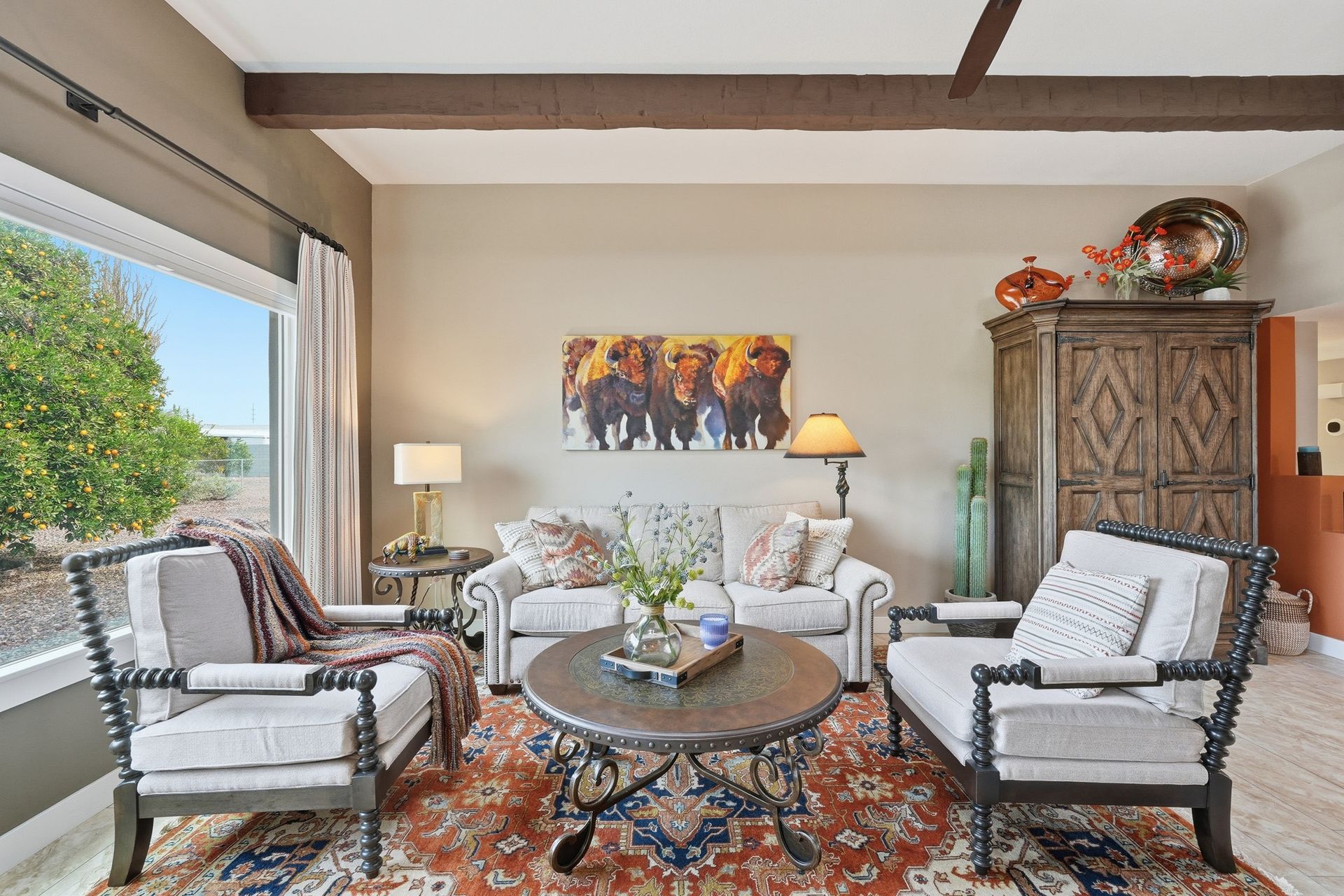 This immaculately maintained two-bedroom, two-bath home boasts approximately 1,600 square feet of living space with an extended garage/workshop on a large private lot. The interior features custom curtains and blinds, and new interior paint applied in 2021. This home has been tastefully updated throughout, including a new garage door, custom front lighting, and a custom front door and interior door. The primary bedroom and bath have been thoughtfully designed with dual sinks and a tile and stone walk-in shower. The additional bedroom has a Murphy bed and a second updated bathroom for guests. The backyard is a true oasis, featuring a stamped concrete-covered patio that is perfect for outdoor relaxation and entertainment. The property also includes several fruit trees, including an Arizona Sweet Orange tree, a pomegranate tree, a pink grapefruit tree, and a variegated pink lemon tree, adding to the lush and natural ambiance. For added security and convenience, the home is equipped with an owned security system. Other updates include stainless steel appliances, recessed kitchen lighting, a new A/C unit installed in 2022, and a new roof in 2021, ensuring energy-efficiency and well-maintained comfort. This property offers a wonderful opportunity to enjoy a comfortable and updated living experience located near stores, hospitals, and much, much more. Sun City has seven recreation centers that include golf, recreation, swimming, sports, arts/crafts, and numerous clubs to keep you engaged year-round. Welcome Home!
