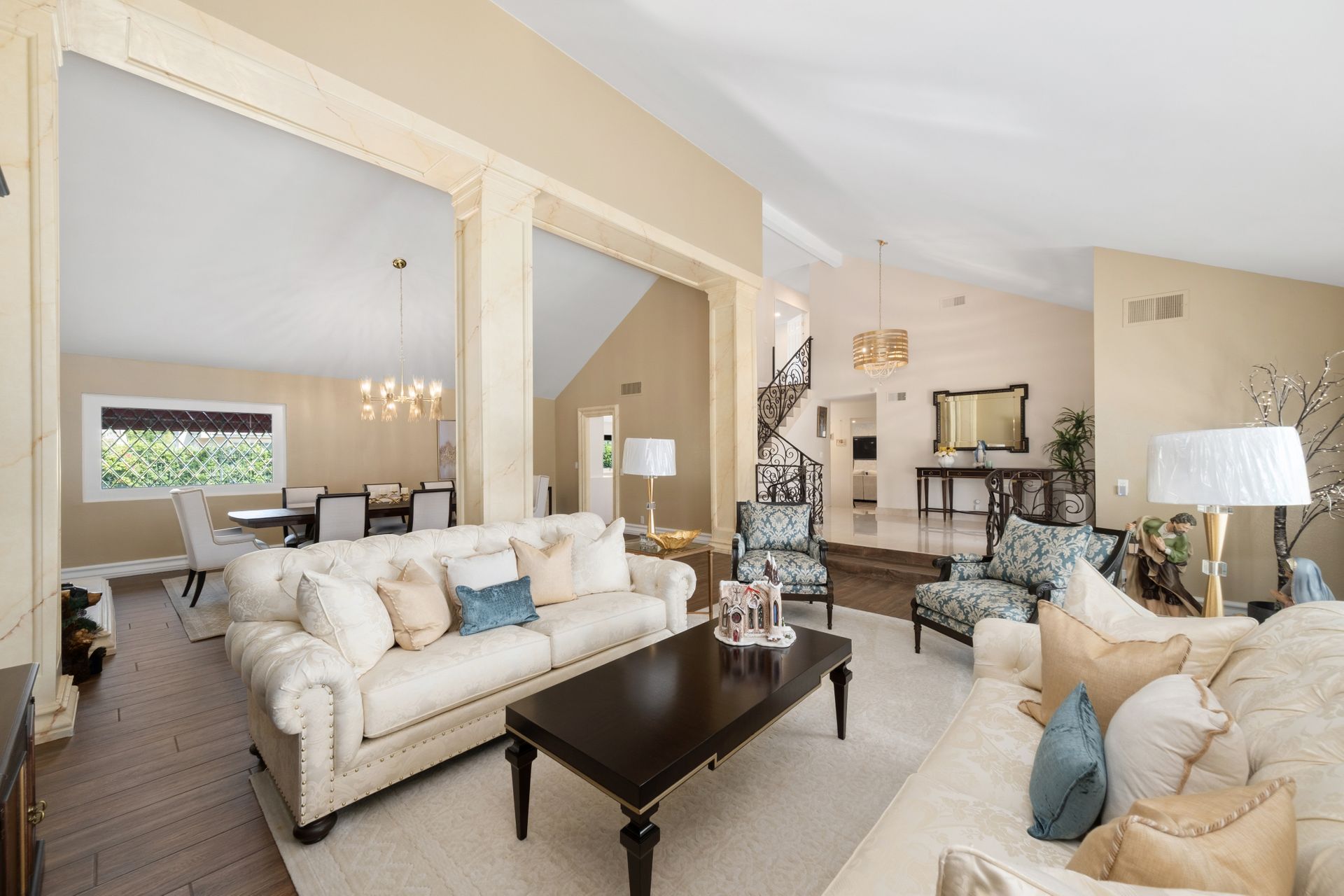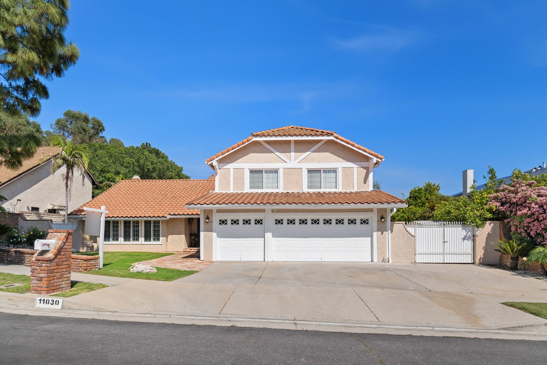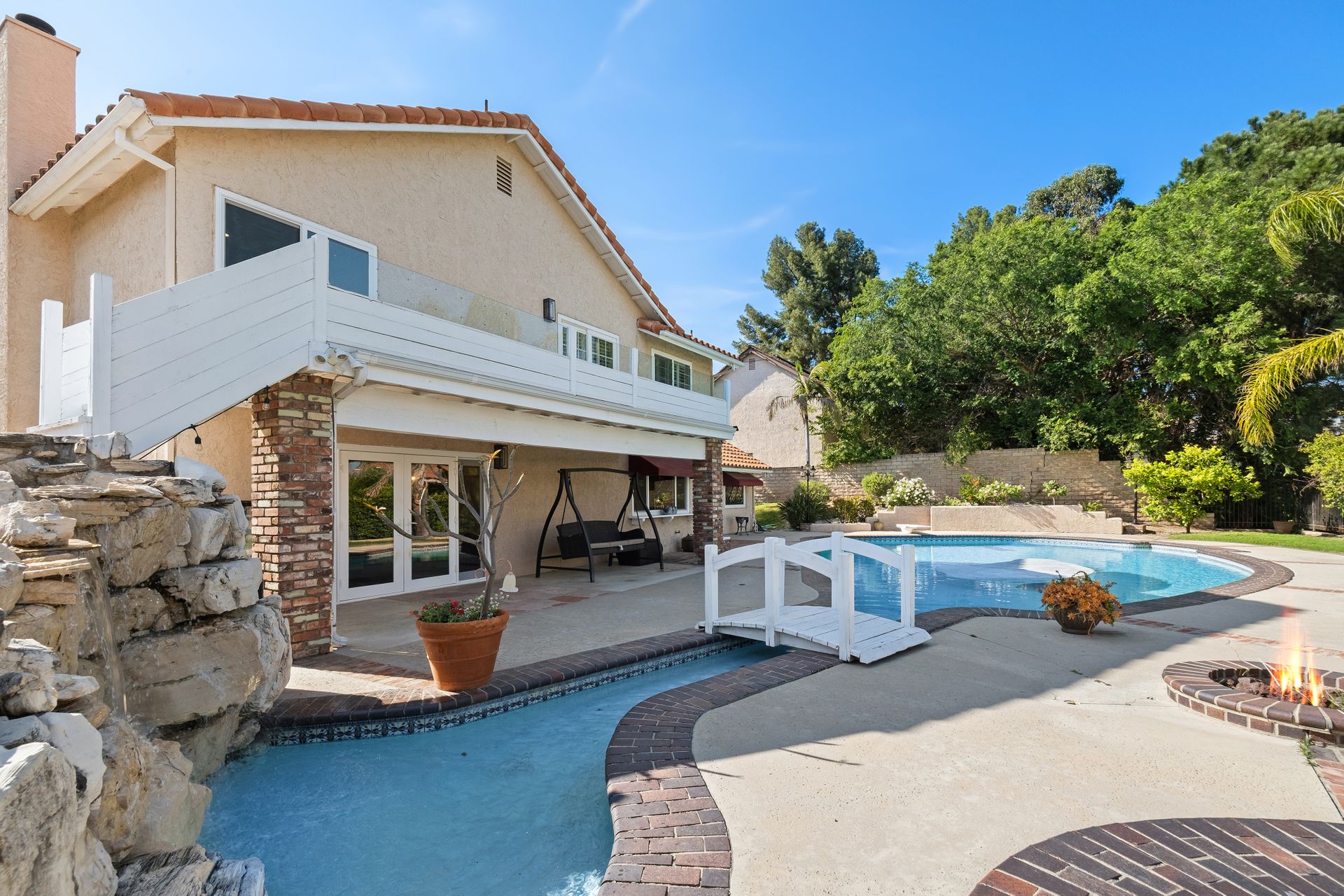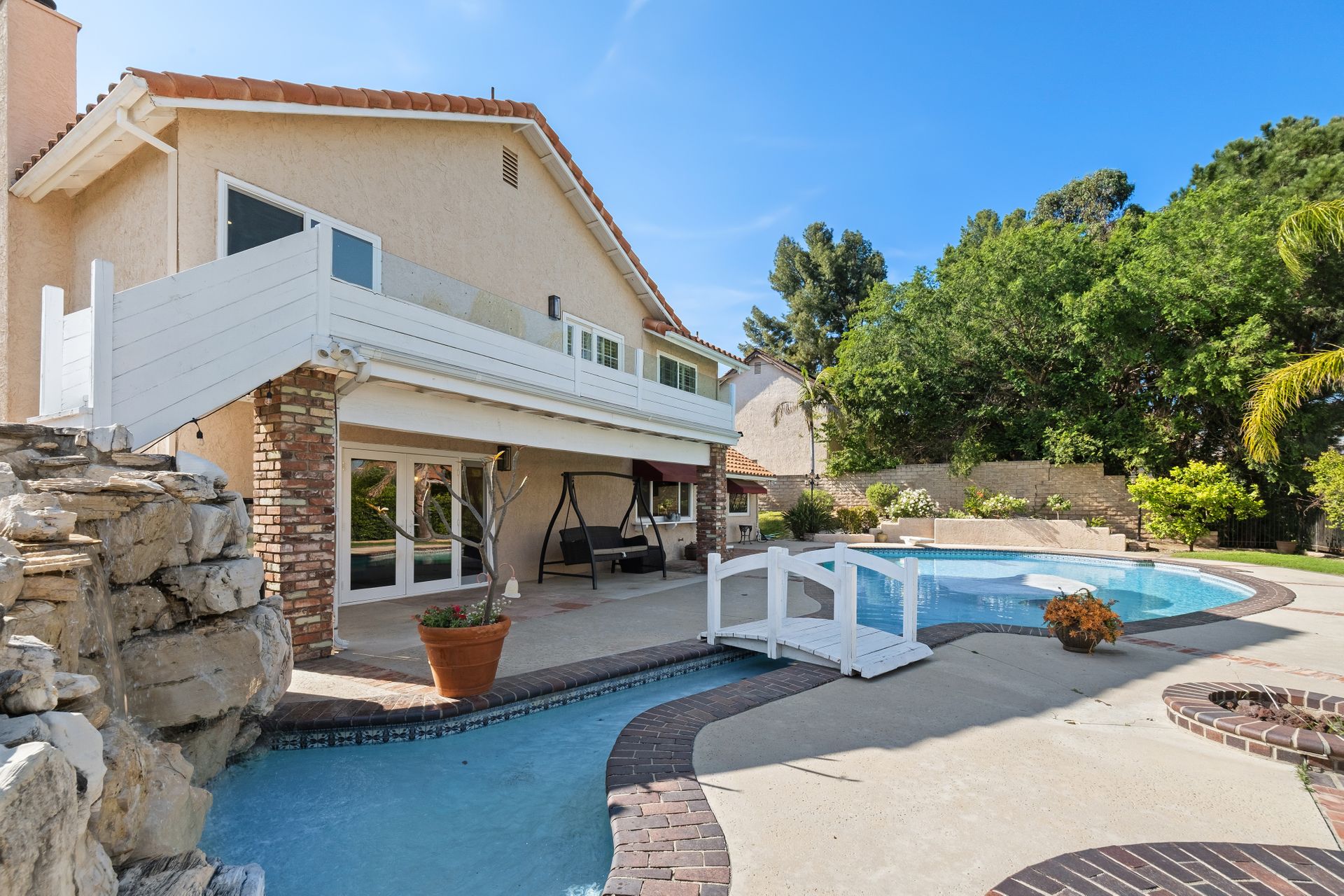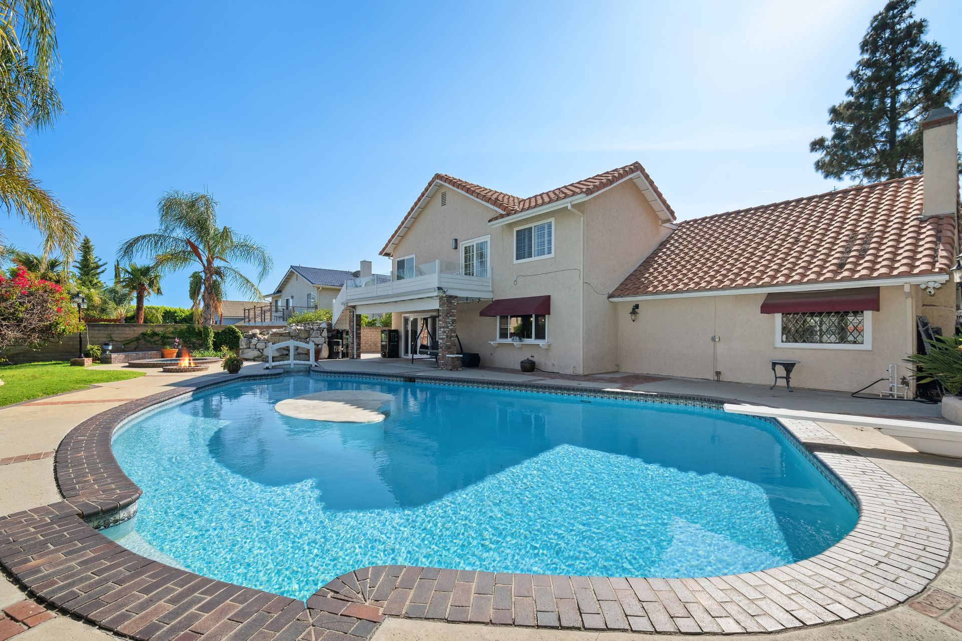 Enter through the elegant double-door entry and be greeted by a striking wrought iron staircase and an excellent floor plan featuring three spacious living areas: living room, formal dining room, and a bright family room with marble-topped wet bar, and a wine cooler. French doors lead you to the private entertainer’s backyard with a pool, spa, and fire pit.