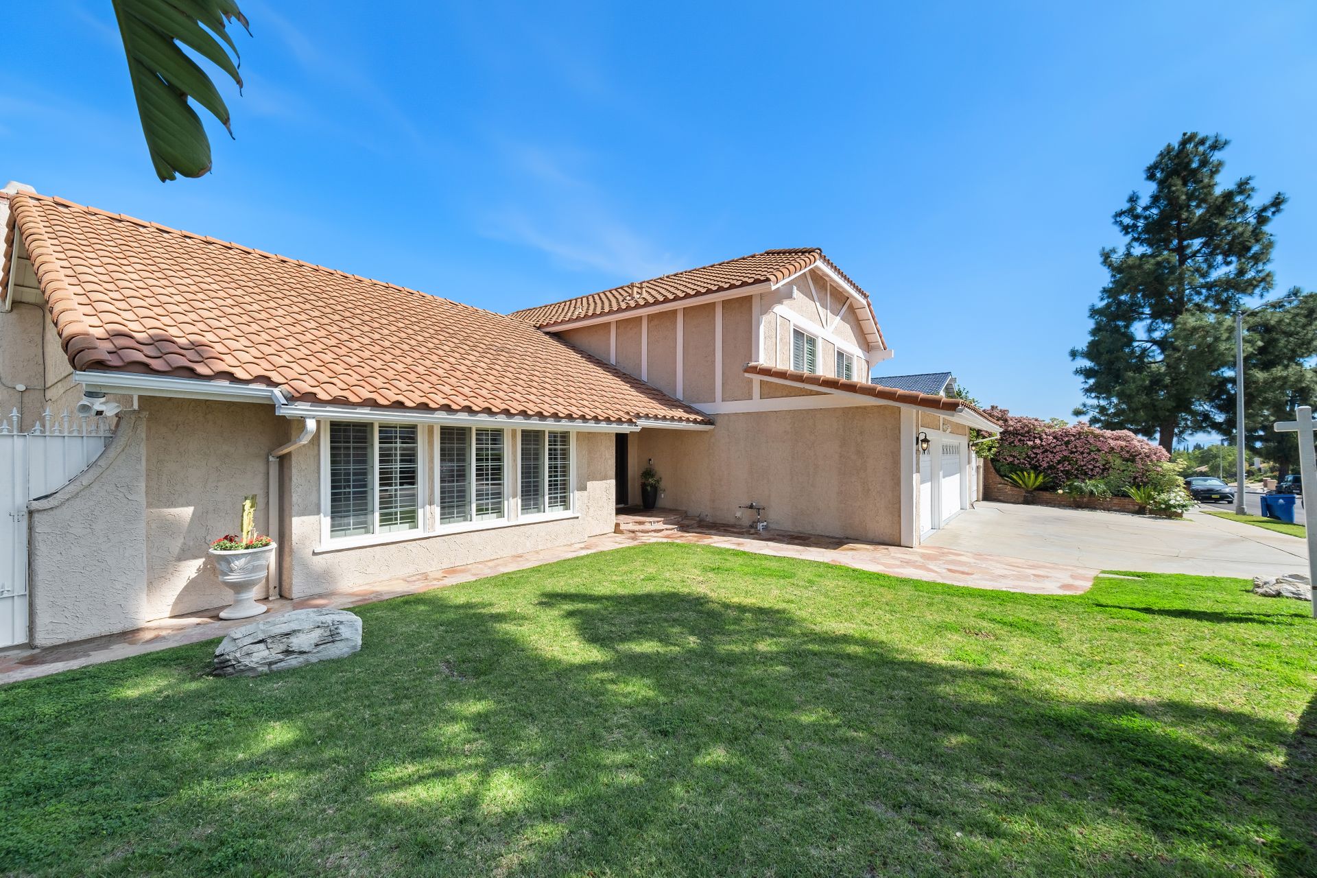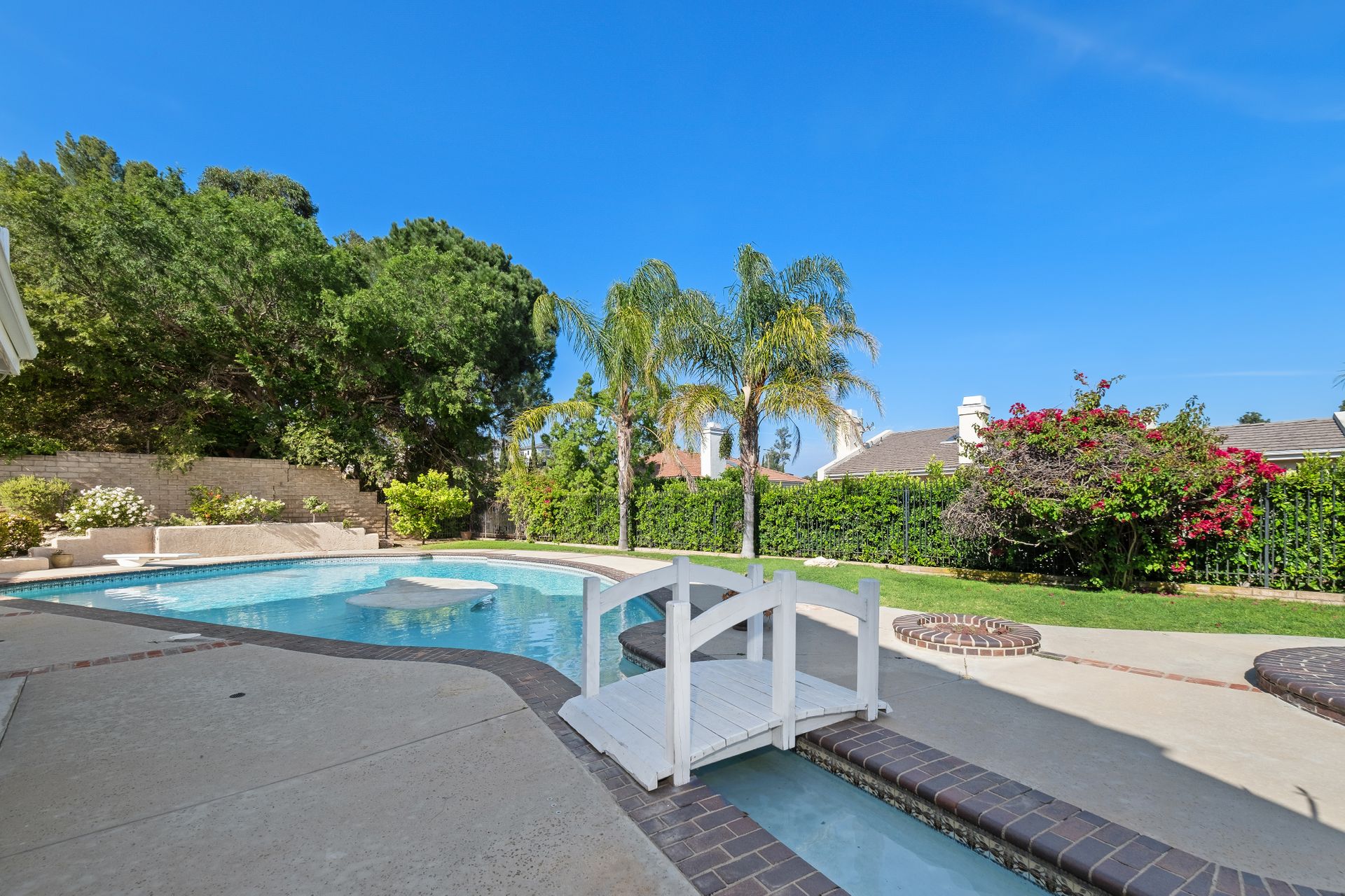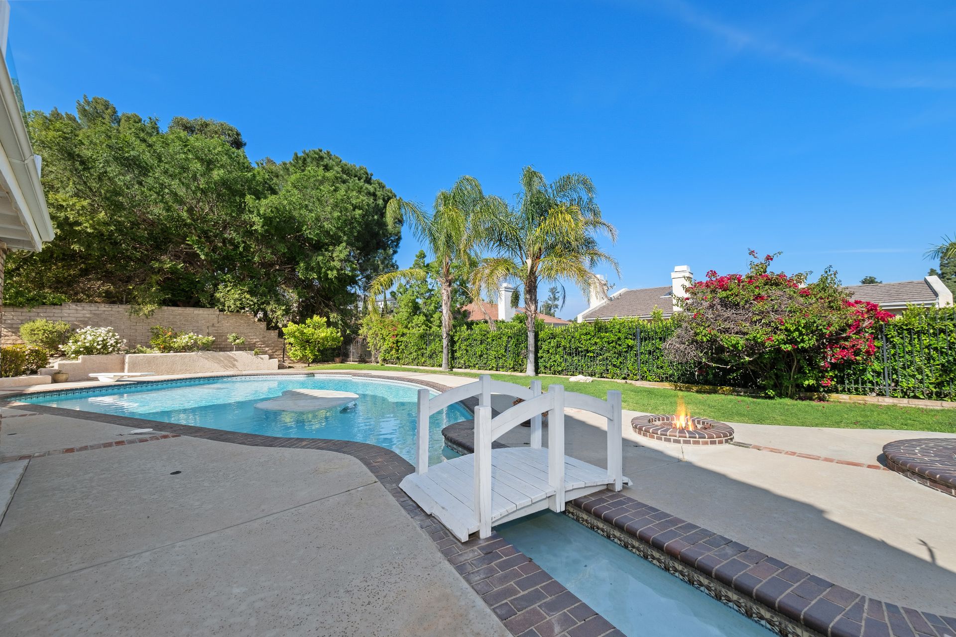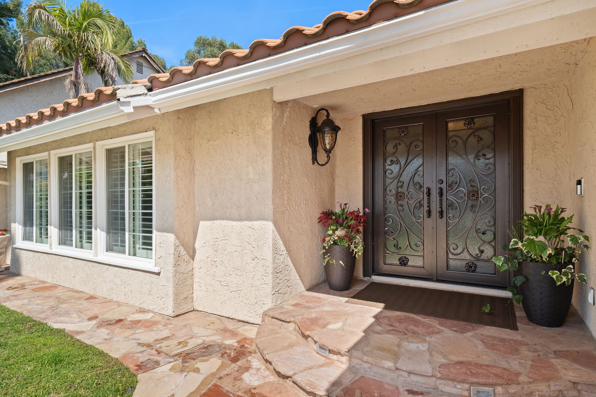 Enter through the elegant double-door entry and be greeted by a striking wrought iron staircase and an excellent floor plan featuring three spacious living areas: living room, formal dining room, and a bright family room with marble-topped wet bar, and a wine cooler. French doors lead you to the private entertainer’s backyard with a pool, spa, and fire pit.
