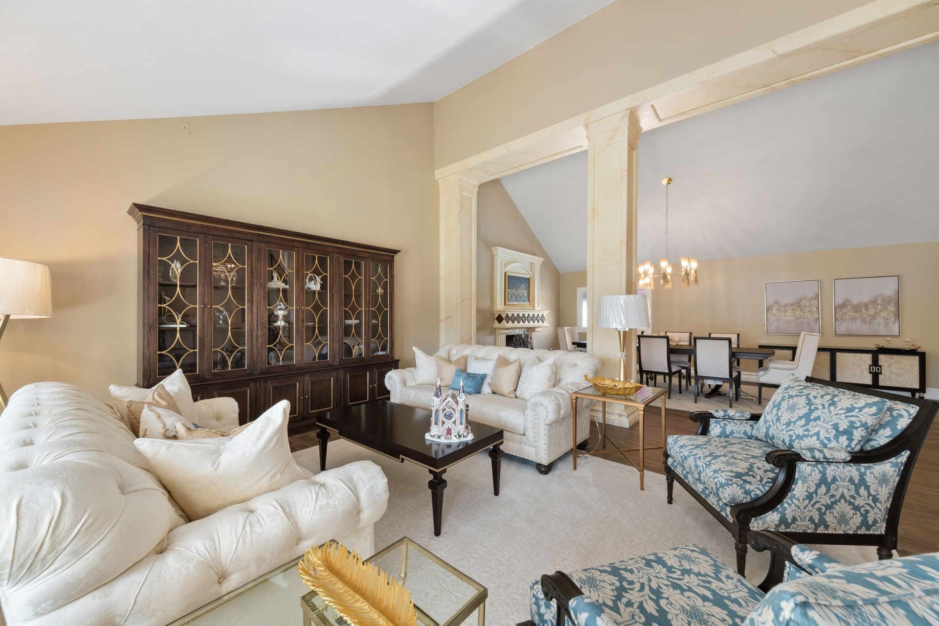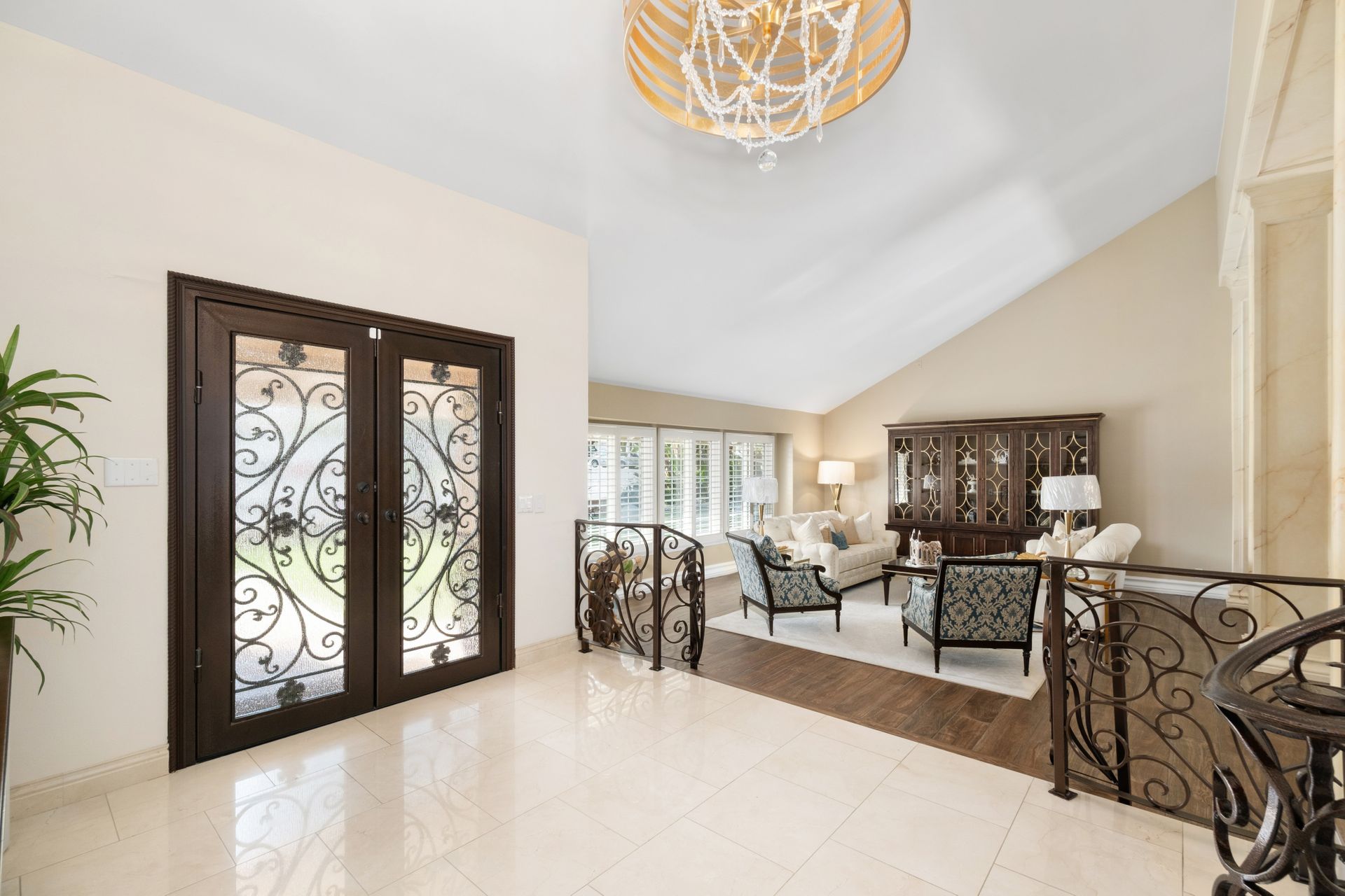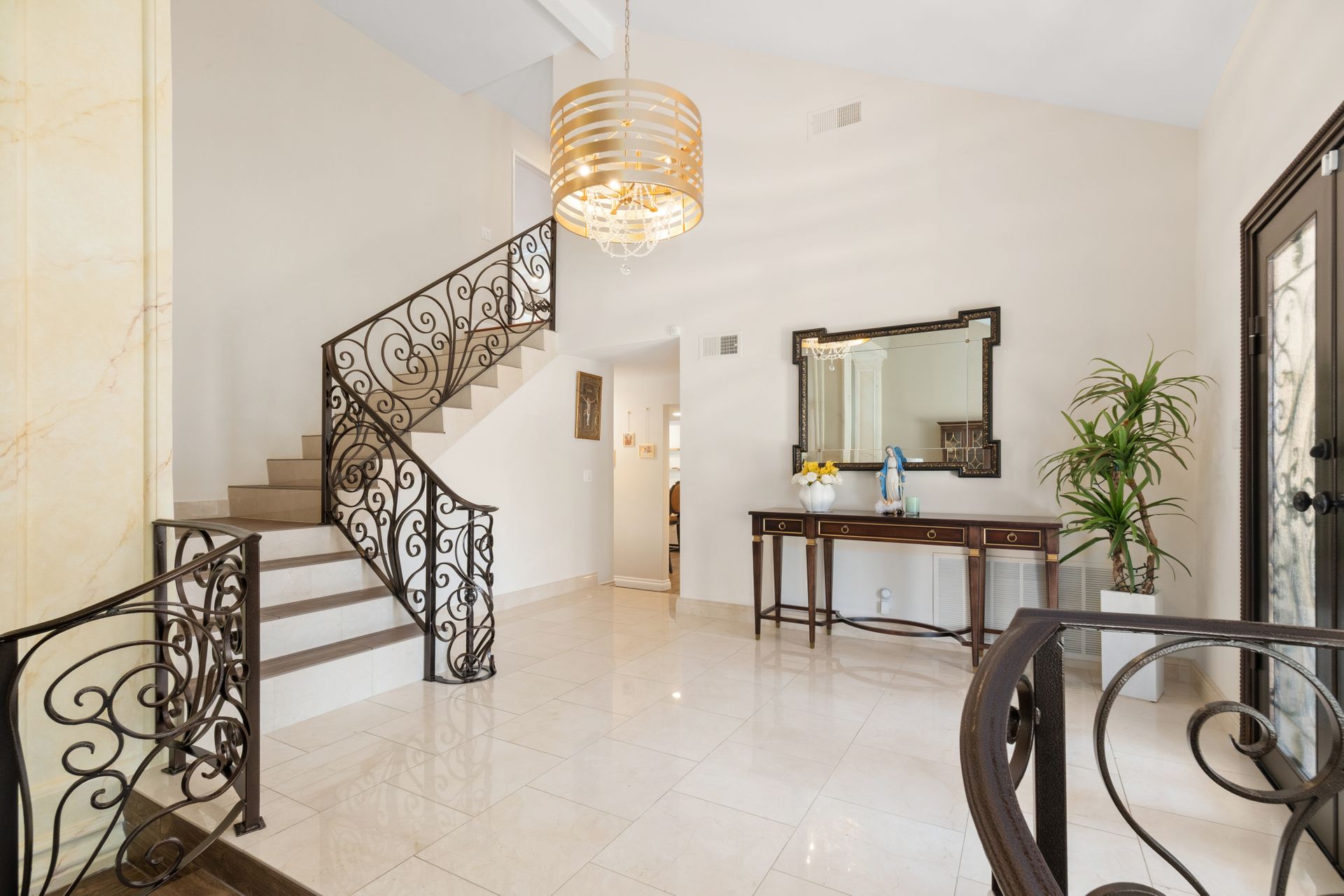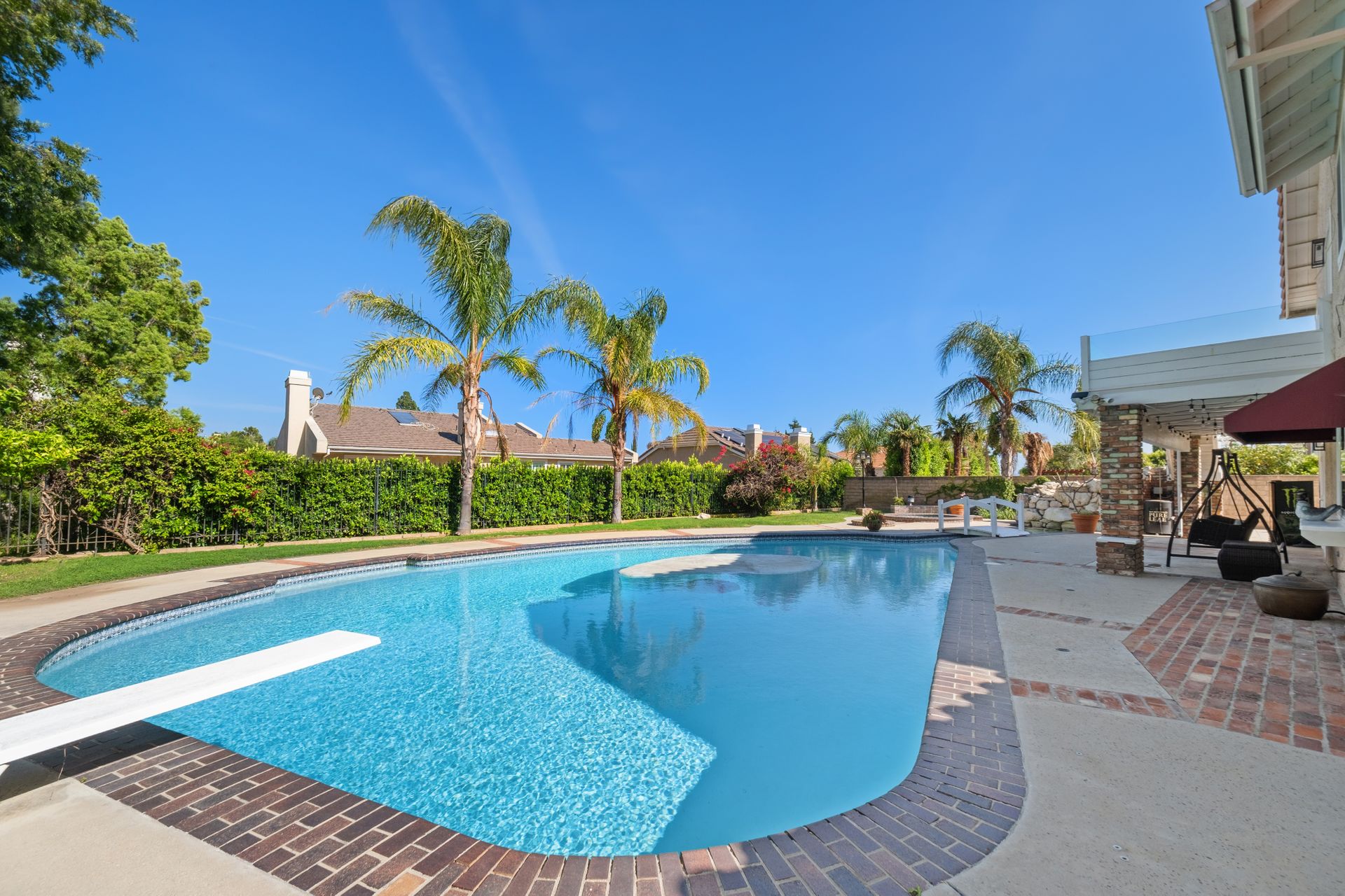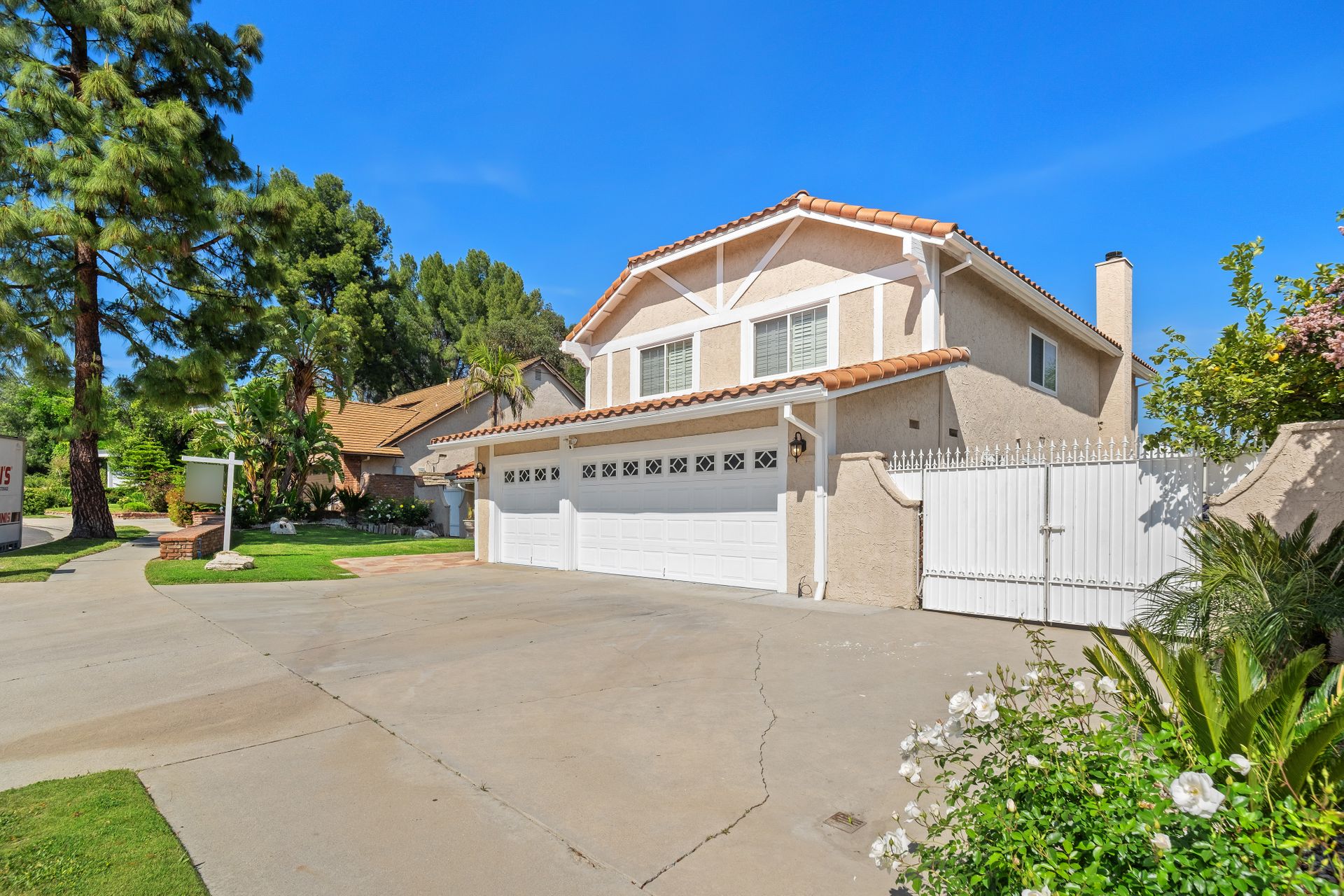Enter through the elegant double-door entry and be greeted by a striking wrought iron staircase and an excellent floor plan featuring three spacious living areas: living room, formal dining room, and a bright family room with marble-topped wet bar, and a wine cooler. French doors lead you to the private entertainer’s backyard with a pool, spa, and fire pit.