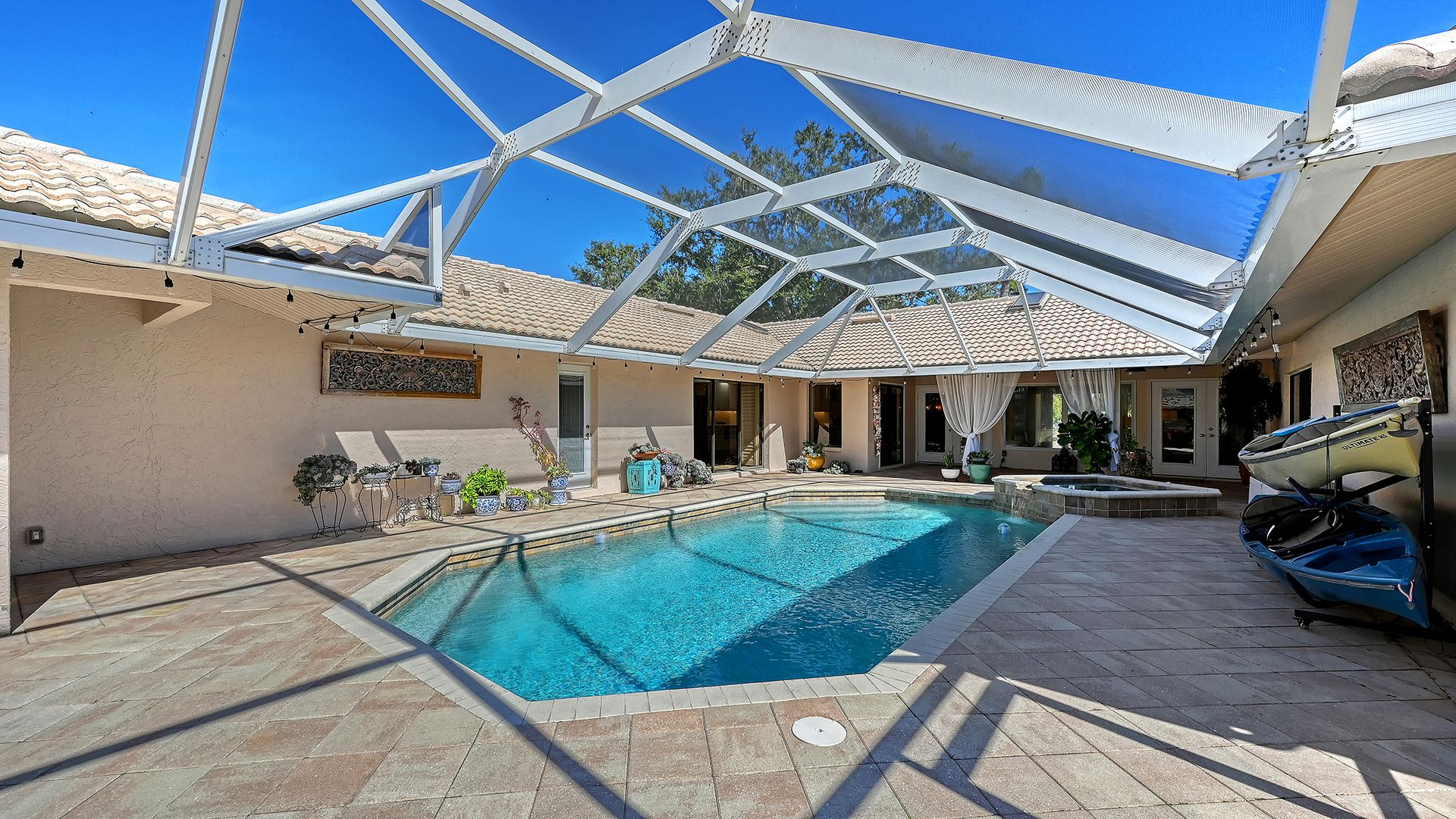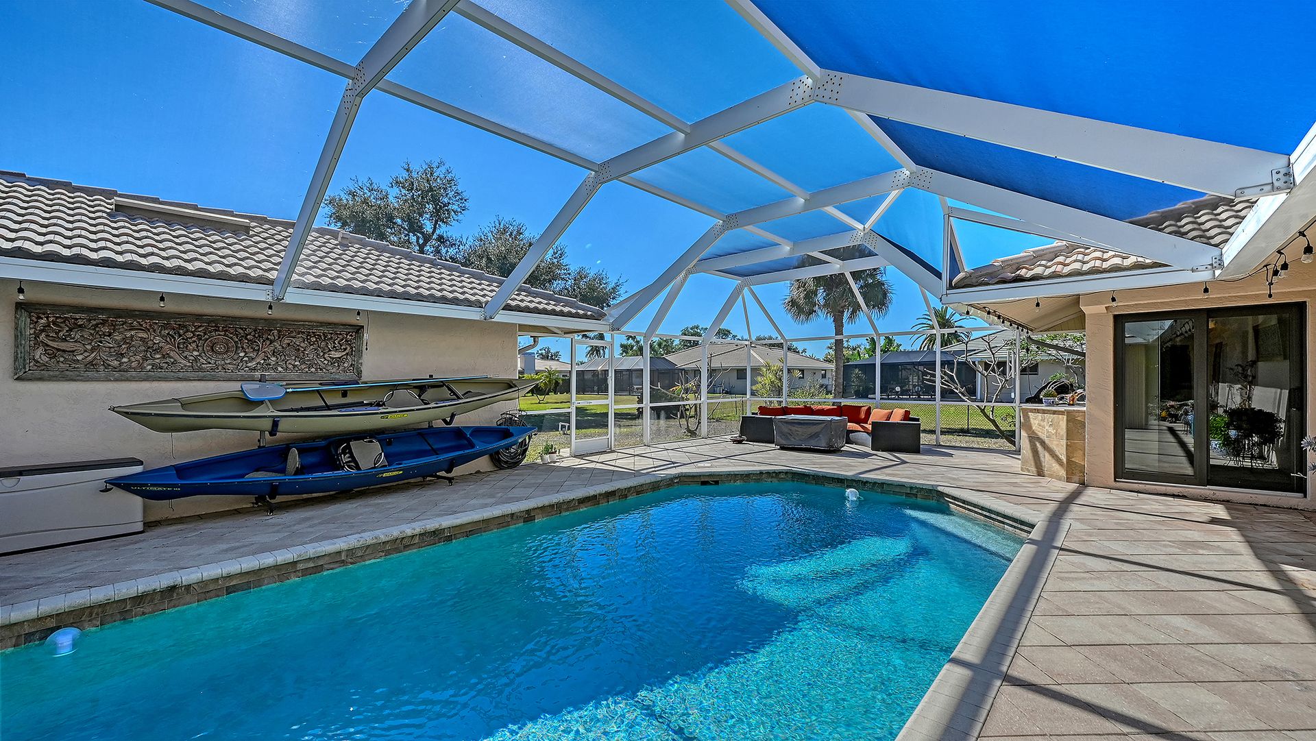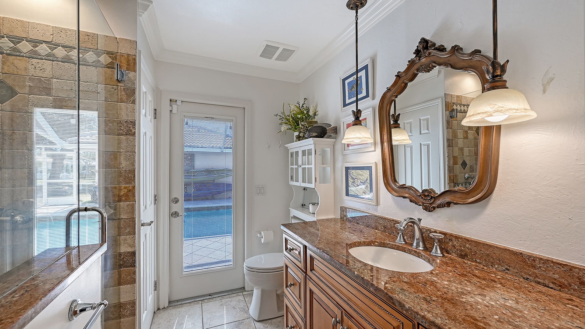 Step into refined coastal living in this beautiful residence with OVER $115,000 IN UPGRADES, in COVETED Sorrento Woods, where elegant interiors and exceptional community amenities create a truly elevated lifestyle. This four bedroom, three bathroom home includes an office, pool and boasts open concept living and the guest suite offers options of MULTI-GENERATIONAL LIVING too. A stunning 2024 custom kitchen anchors the home with quartz countertops, pot filler, double ovens, wine fridge, and designer lighting—ideally positioned between the formal dining room and the spacious family room with sliders to the lanai. The formal living room impresses with a tray ceiling, crown molding, plantation shutters, French doors, and an in wall sound system. The primary suite offers a serene retreat with custom built-ins, lanai access, and a spa inspired ensuite wrapped in granite, featuring a rain shower, wavy cut glass doors, built in shelving, bidet, and skylight. A second primary/guest suite with its own ensuite and skylight provides ideal multigenerational flexibility. Guest bedrooms include custom closets, crown molding, and plantation shutters, while the cabana bath offers pool access, granite counters, and a rain shower. Additional highlights include cherry hardwood flooring in the foyer, hardwood in the dining room, recessed lighting throughout, a custom cabinet office, a spacious laundry room with utility sink and wood flooring, and a plywood reinforced attic offering exceptional storage. The screened lanai and resurfaced pool create a private outdoor oasis perfect for entertaining. Sorrento Woods elevates the lifestyle with a PRIVATE COMMUNITY BOAT RAMP and day dock on a scenic canal—placing the Gulf and Intracoastal Waterway just minutes away. Low HOA, NO CDD, and a central location close to the new SMH Venice Hospital, Nokomis and Venice Beaches, Legacy Trail, shopping, dining, and A rated schools make this an unmatched opportunity in Sarasota County.