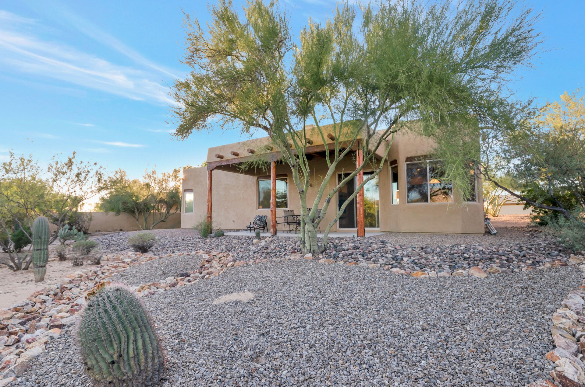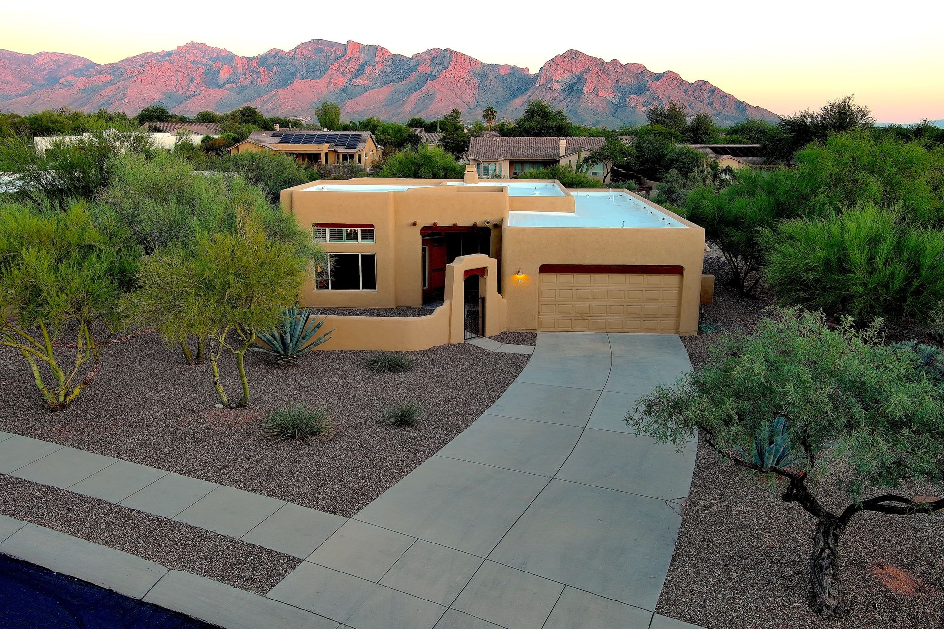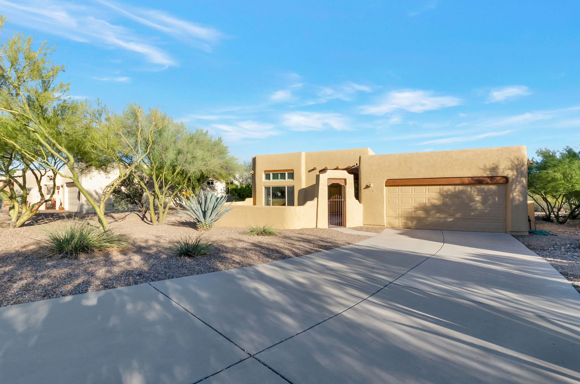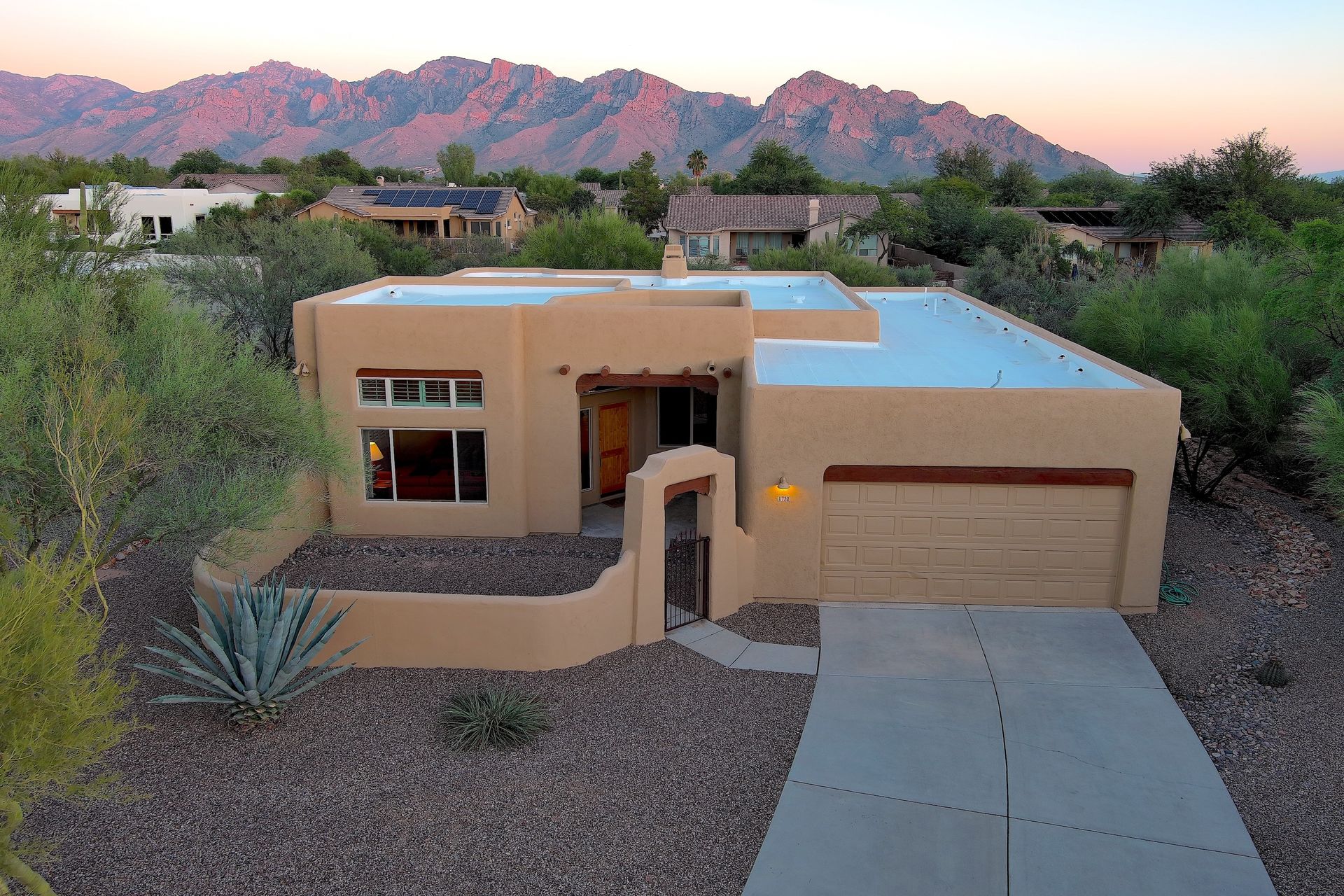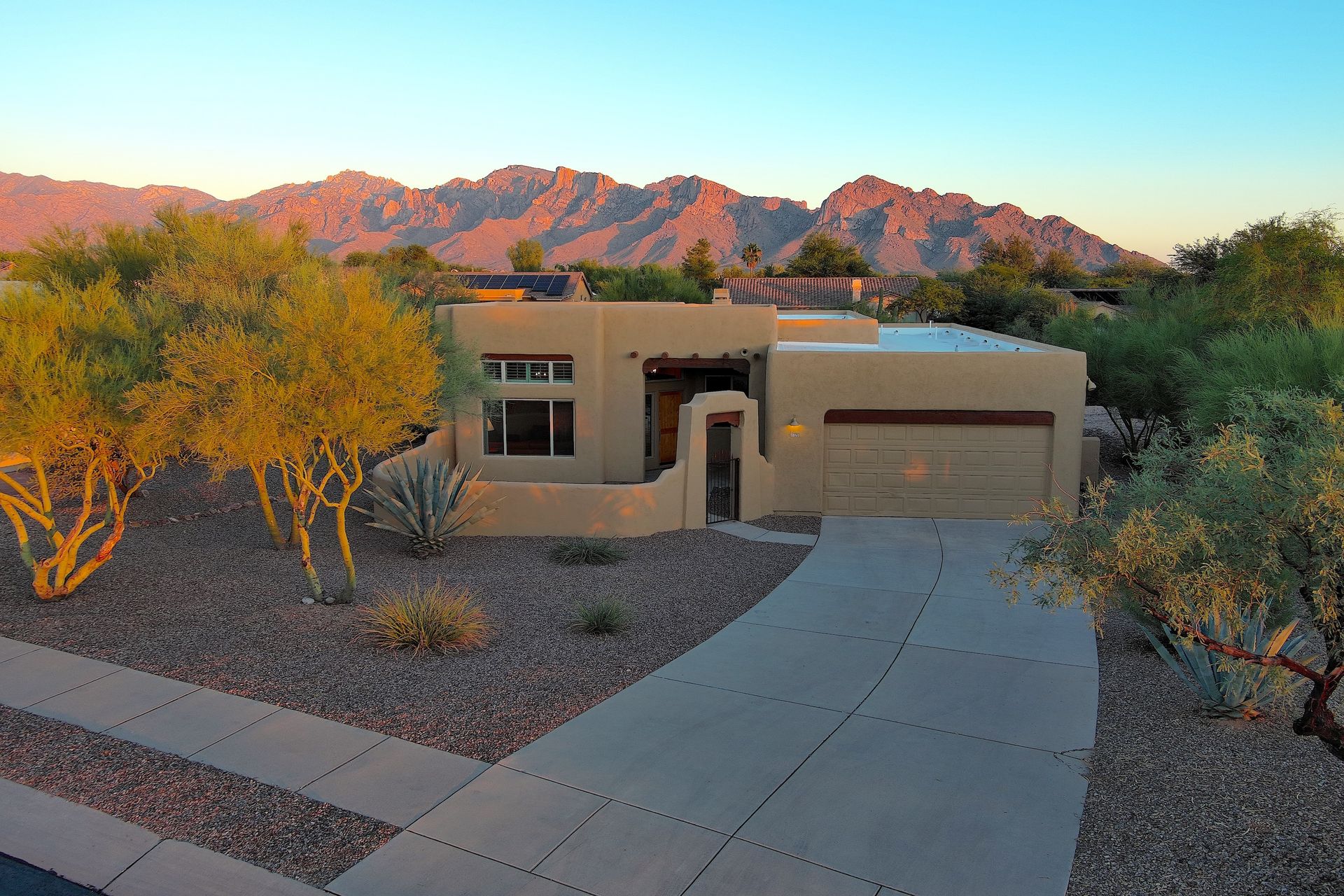 Welcome to Oro Valley (Tucson), Arizona living as it was designed to be enjoyed. This exquisite 4 Bed/2 Bath Tucson Spanish Pueblo Styled home sits on .35 acres of natural desert landscape. You will beam with pride knowing you own a TJ Bednar Custom Built Home. Enjoy a private driveway, gated front courtyard with rustic iron features, and groomed Palo Verde trees. Delight in custom timber beam vigas as you enter into the 12' ceiling family room with a custom pine door. Savor earth-tone diamond-laid tile, expansive kitchen with remodeled eat-in granite counters, new upper/lower cabinets, sink, and new GE appliances—microwave, oven, gas stovetop, hood vent, and dishwasher. Warm kiva beehive gas fireplace. Newer water heater and newer HVAC system. New exterior paint and wood stain. Bathroom upgrades. Take in the majestic Catalina Mountain views from your expansive backyard patio. True desert oasis. This is HOME!