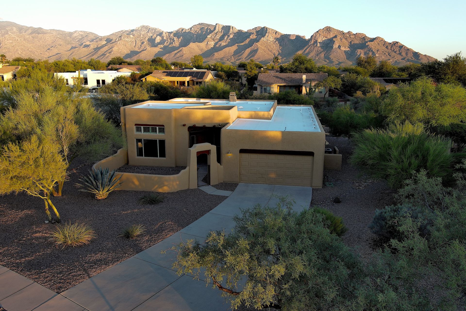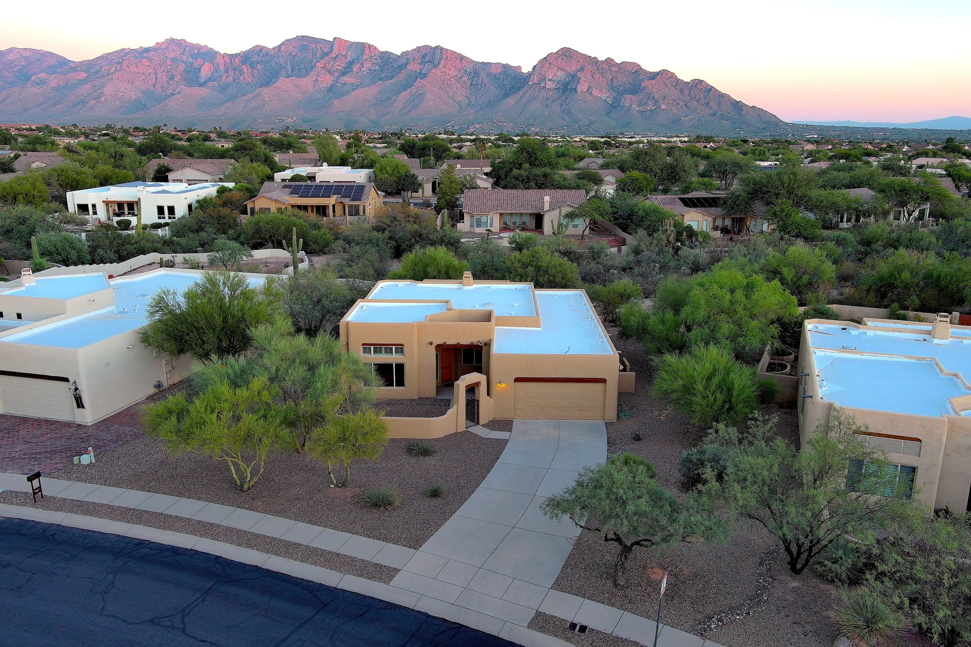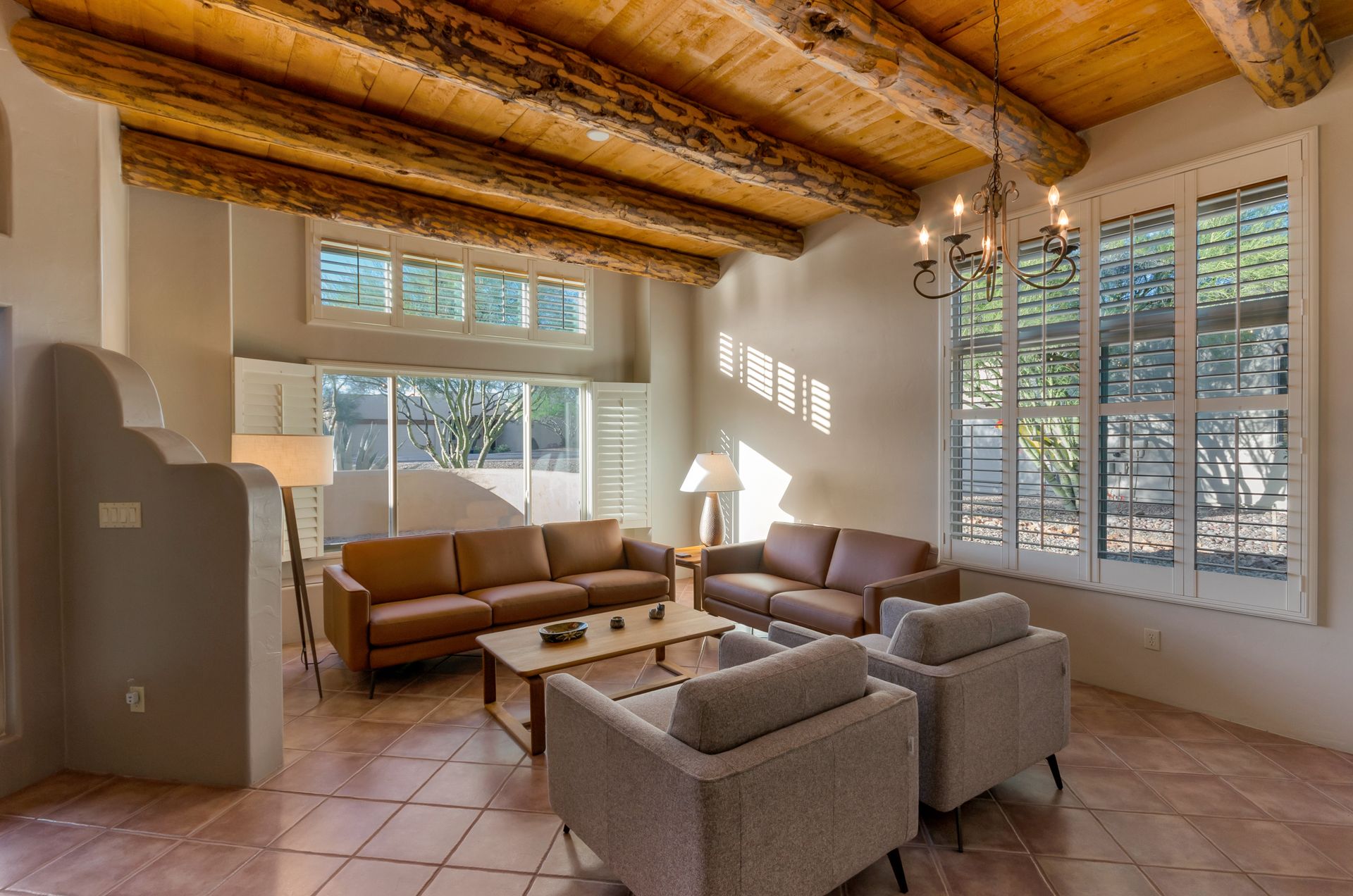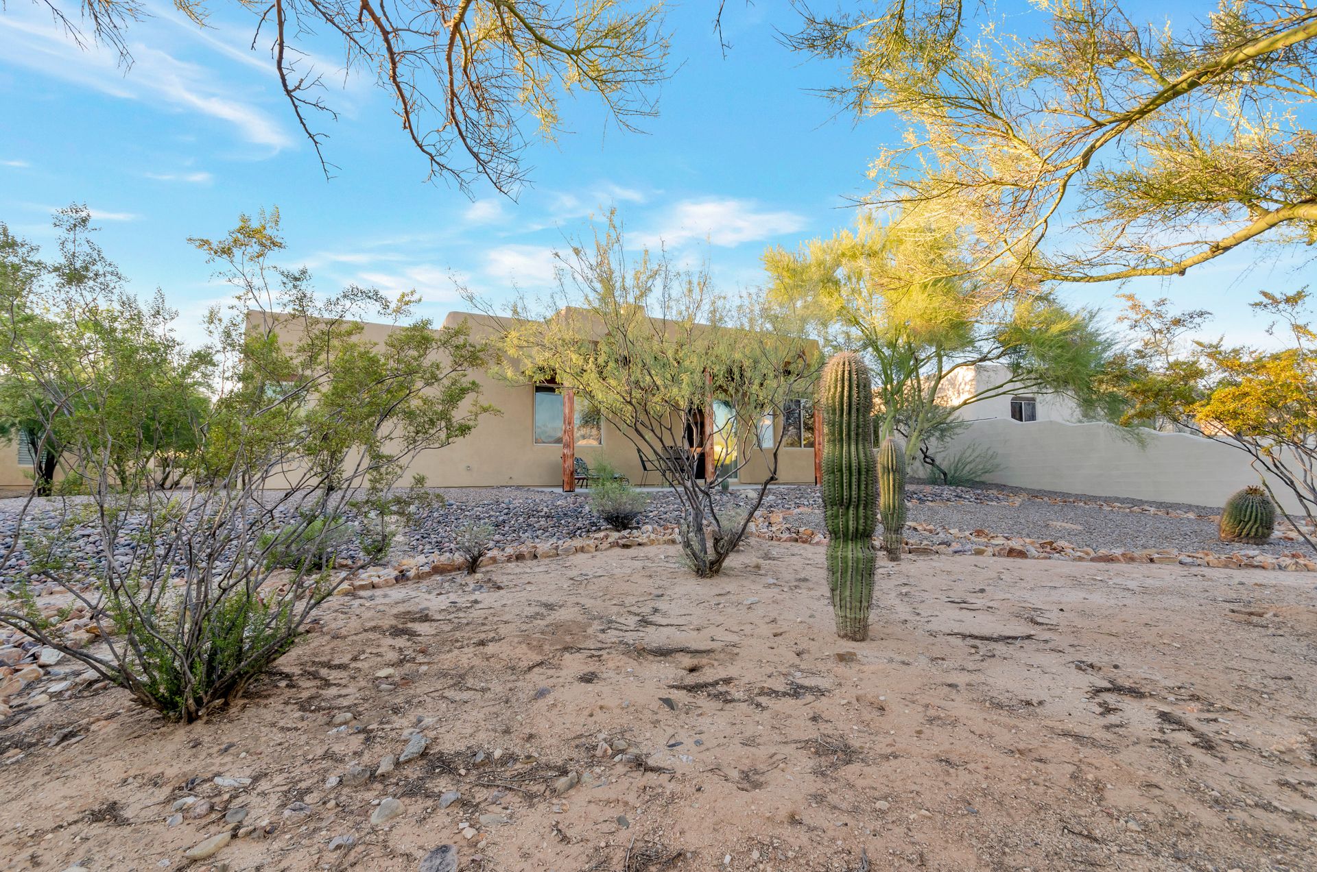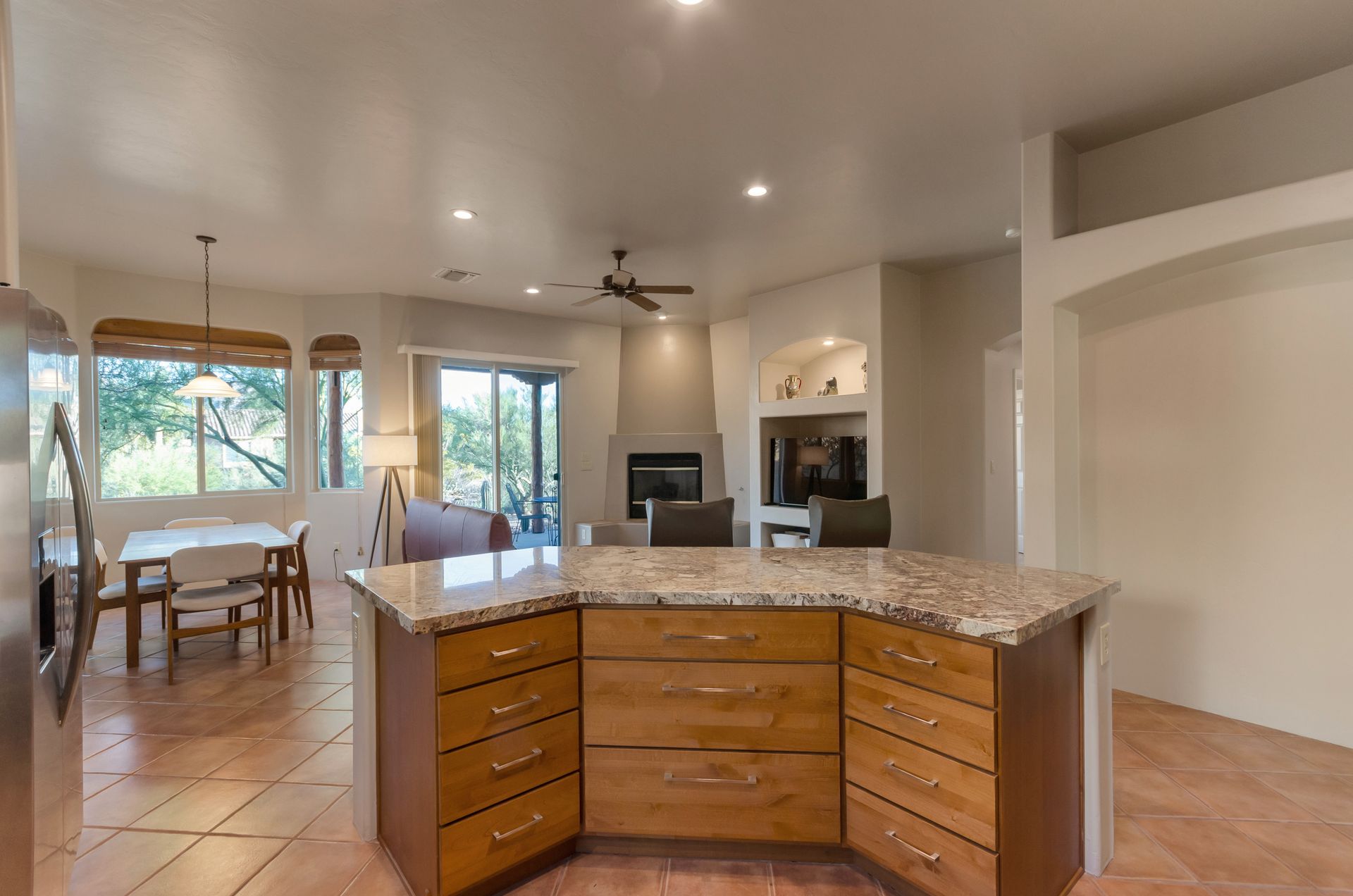 Welcome to Oro Valley (Tucson), Arizona living as it was designed to be enjoyed. This exquisite 4 Bed/2 Bath Tucson Spanish Pueblo Styled home sits on .35 acres of natural desert landscape. You will beam with pride knowing you own a TJ Bednar Custom Built Home. Enjoy a private driveway, gated front courtyard with rustic iron features, and groomed Palo Verde trees. Delight in custom timber beam vigas as you enter into the 12' ceiling family room with a custom pine door. Savor earth-tone diamond-laid tile, expansive kitchen with remodeled eat-in granite counters, new upper/lower cabinets, sink, and new GE appliances—microwave, oven, gas stovetop, hood vent, and dishwasher. Warm kiva beehive gas fireplace. Newer water heater and newer HVAC system. New exterior paint and wood stain. Bathroom upgrades. Take in the majestic Catalina Mountain views from your expansive backyard patio. True desert oasis. This is HOME!
