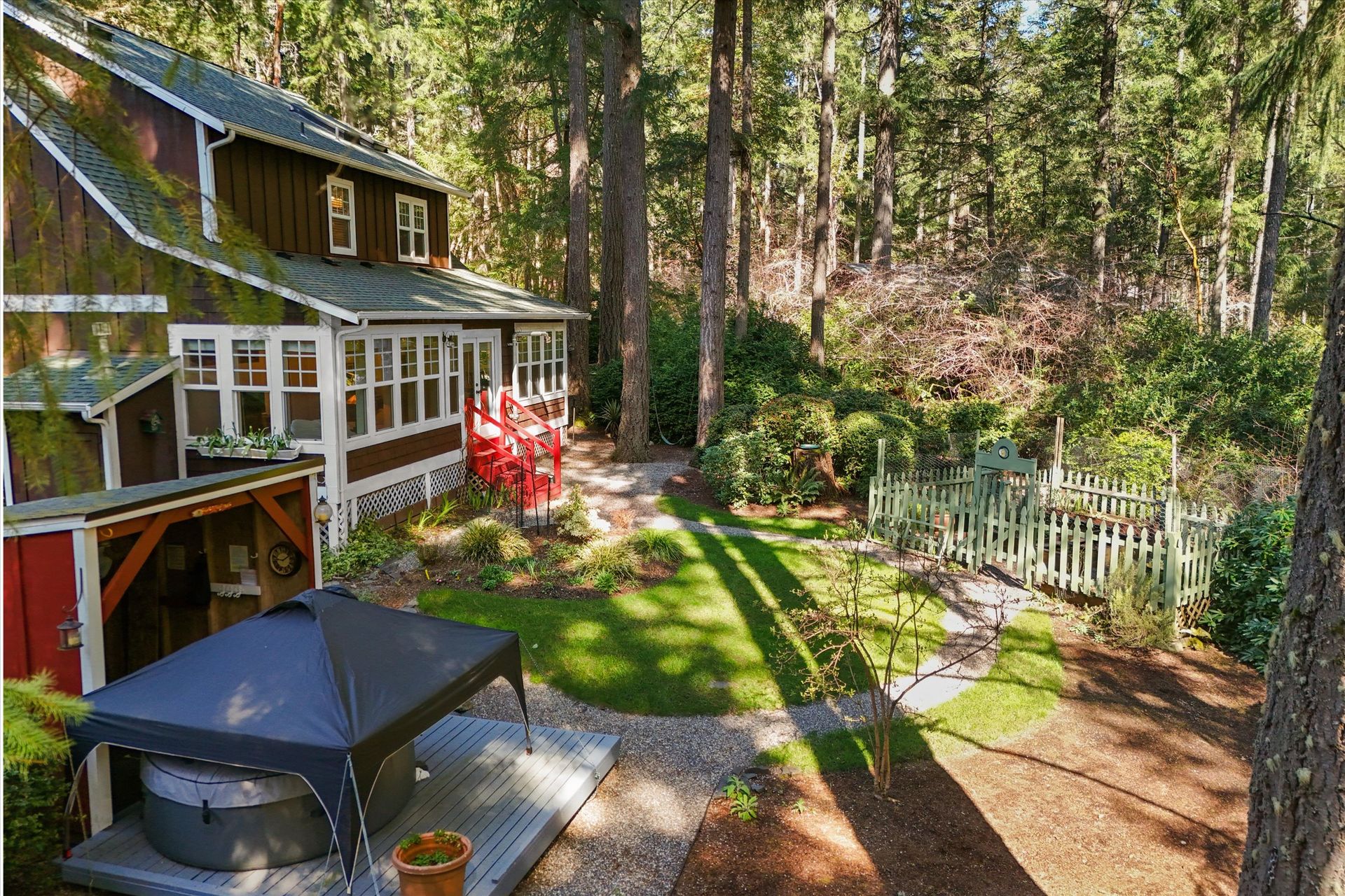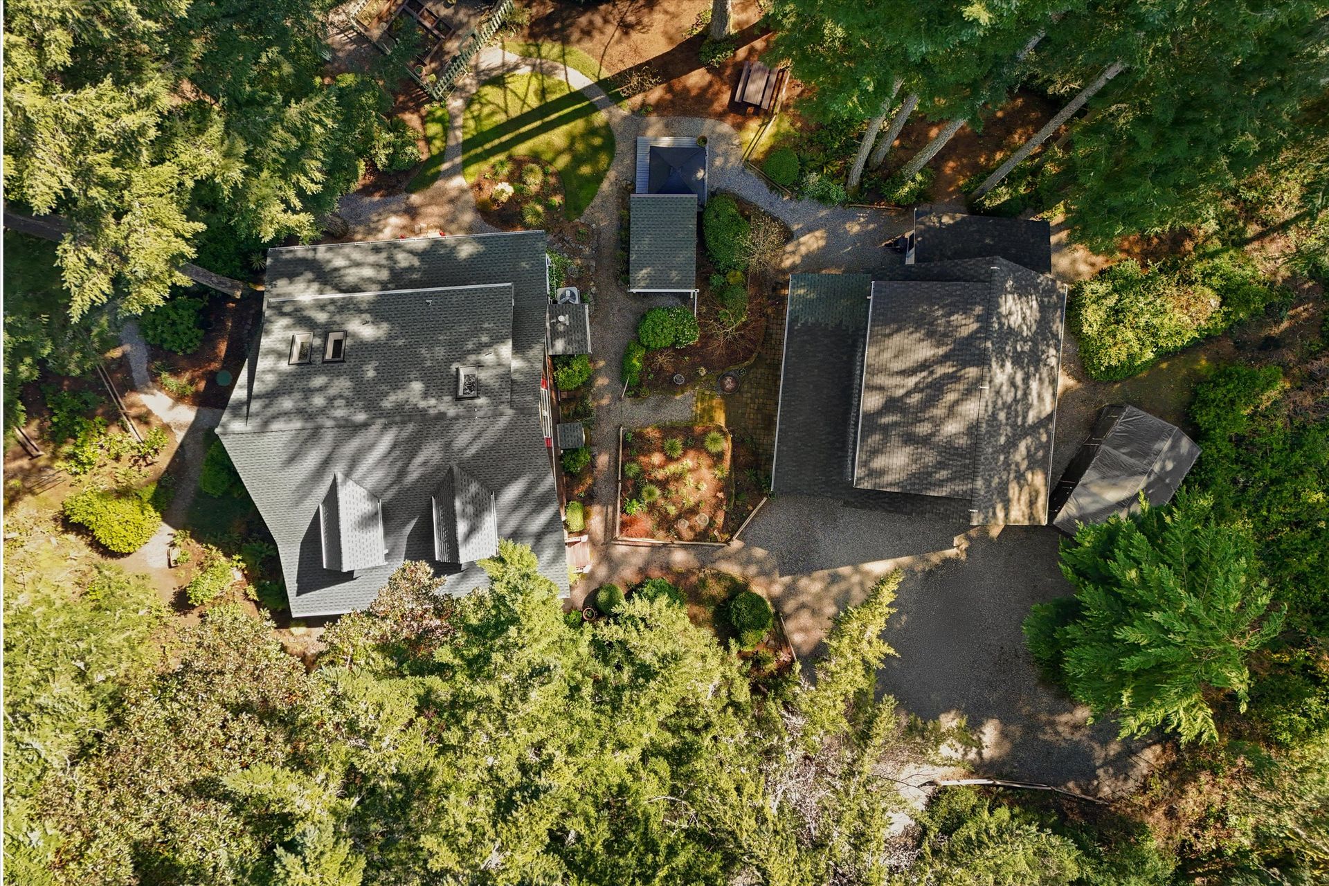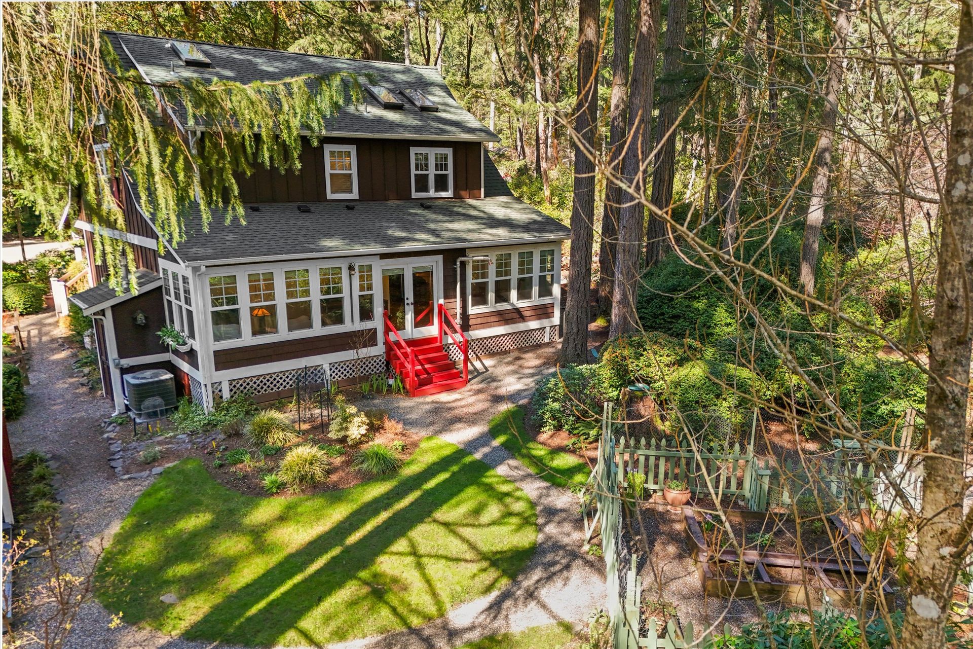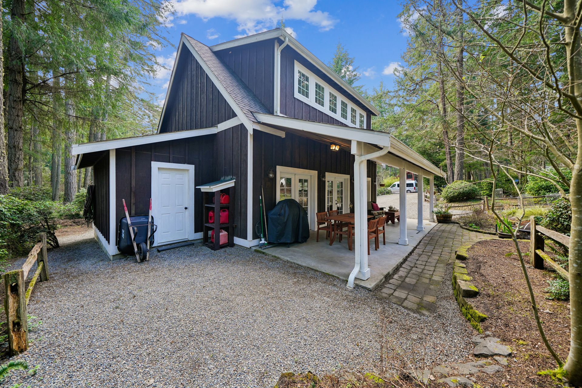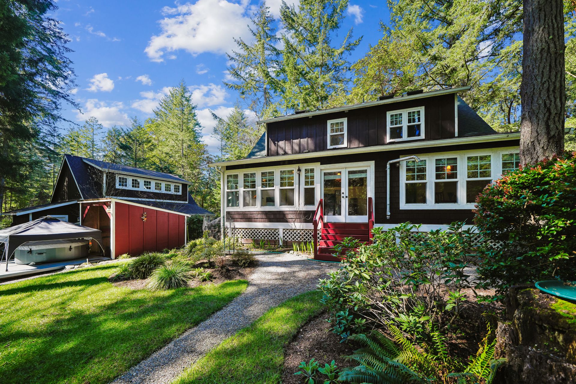 Storybook charm meets island serenity in this Cape Cod Craftsman on Anderson Island. Set on a spacious double lot, this three bed, one and three-quarter bath home offers a rare blend of character, functionality, and quality. The grounds are truly something special—meticulously landscaped to evoke an English garden, creating a peaceful, private retreat where wildlife abounds. A detached two-car garage adds incredible versatility with 258 square feet of loft space for use as an art studio, office, or creative space, along with additional rec area below. French doors lead out to a covered patio/carport for outdoor living, plus two additional outbuildings for shop or storage space. Inside, you'll find a warm and inviting layout with two bedrooms on the main level and an updated full bath. The living area features hardwood floors and a stunning stone gas fireplace, providing convenience and warmth. A light-filled sunroom offers flexible living—ideal for a reading nook, dining area, or just a quiet corner to relax. Upstairs, find a spacious primary and ensuite and loft. Recent updates provide peace of mind, including a newer heat pump, a newer roof, and updated kitchen and bathrooms. As part of the Riviera HOA, enjoy access to a nine-hole executive golf course, restaurant, saltwater marina, parks, tennis and bocce ball courts, and two freshwater lakes. All this is just a scenic 20-minute ferry ride from Steilacoom. Whether you're seeking a full-time residence or a tranquil getaway, this pristine island home is ready to welcome you home!