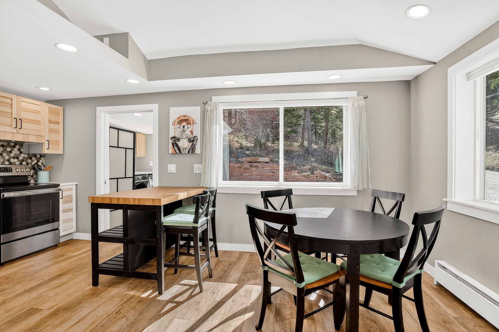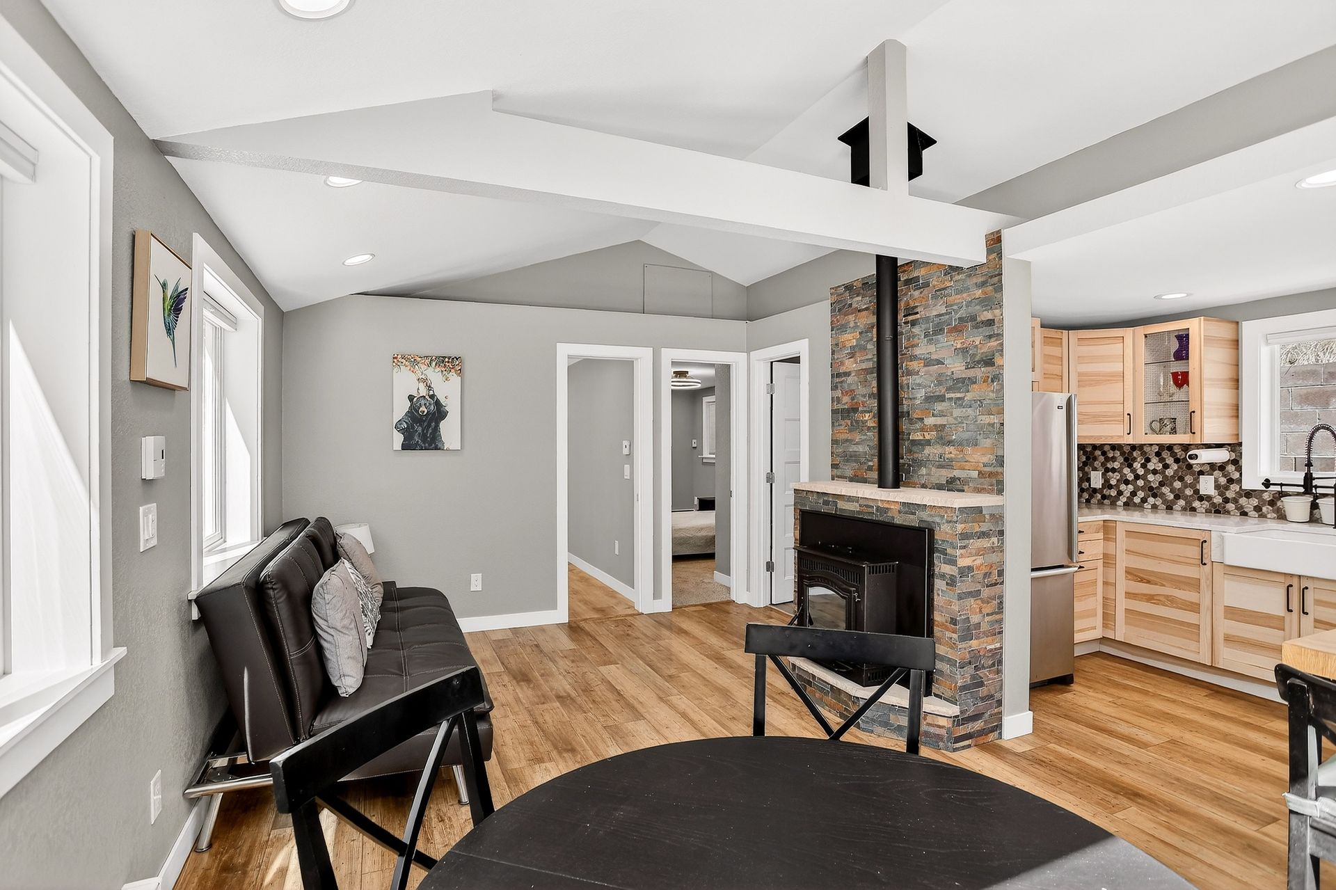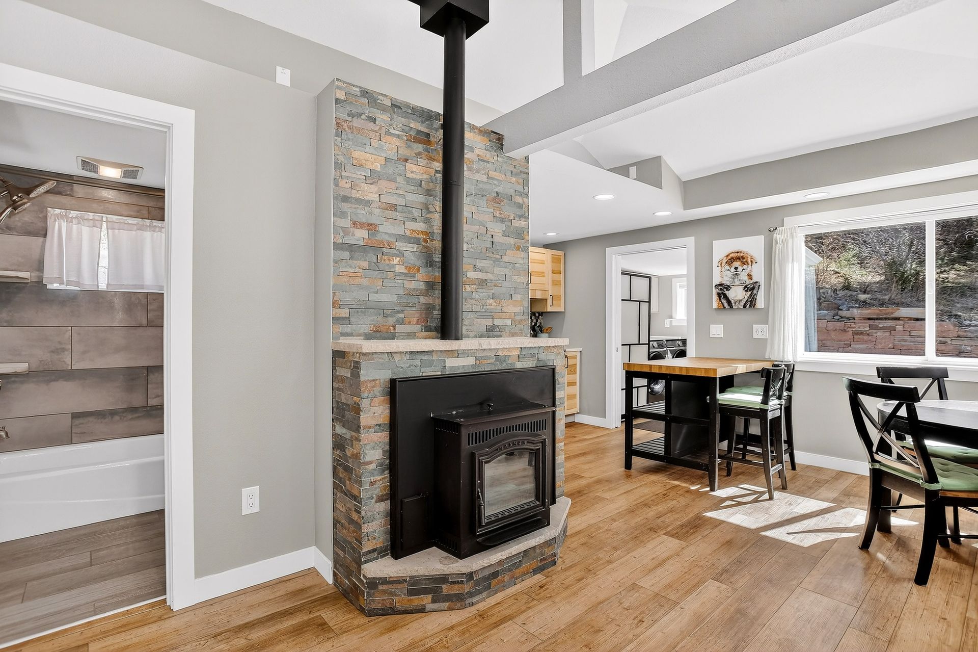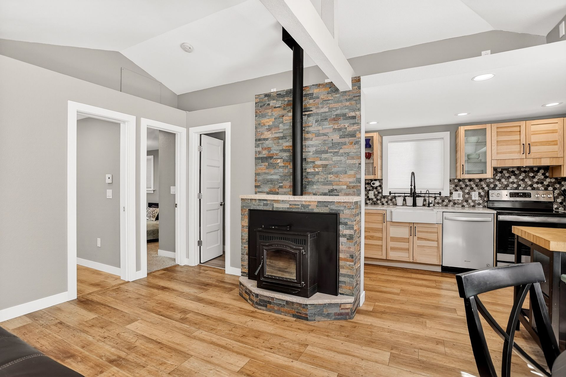 The home is bright and inviting with abundant natural light and a clean, functional layout. Heating is both flexible and efficient, with zoned electric baseboard in each room and a thermostat-controlled pellet stove anchoring the main living area.