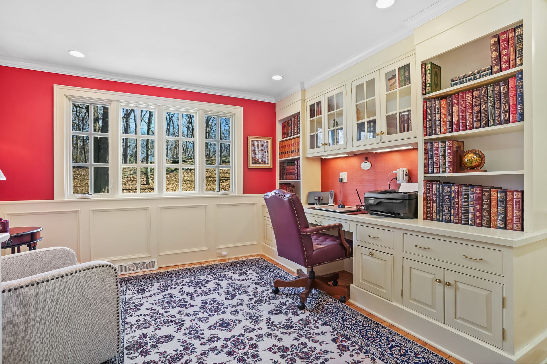 Work from Home: Lavorgna designed main level office features wainscoting and built-ins that keep you organized. Main level bedroom and full bath with step in shower ideal for guests or multi-generational needs.