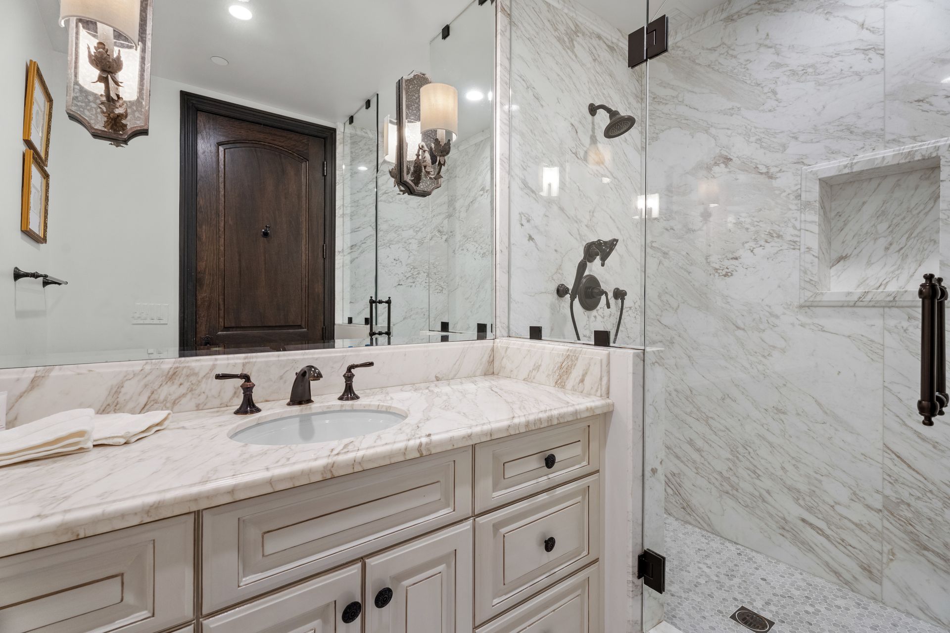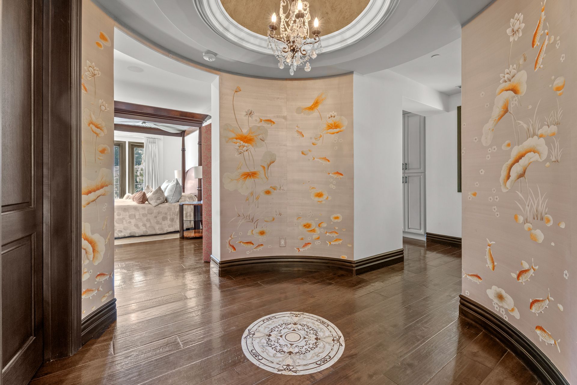 A dramatic two-story entry makes an immediate statement, centered around a 30-foot grand rotunda with a sweeping marble staircase and custom ironwork. Natural light pours through the space, illuminating curated materials throughout, including stone, marble, rich hardwood, and bespoke millwork.