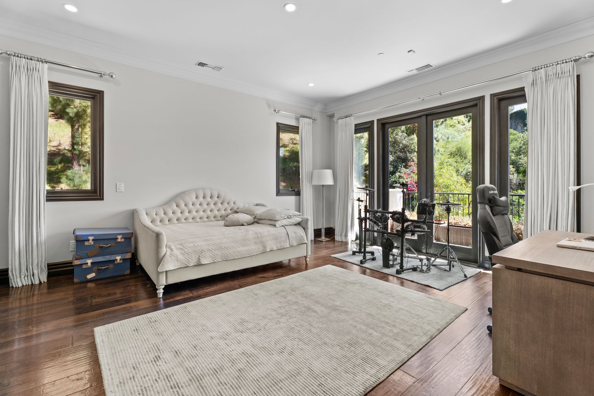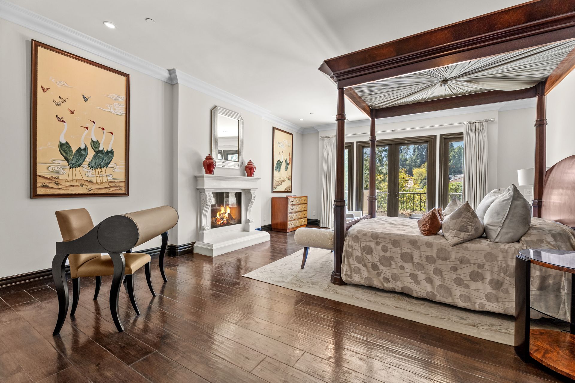 Spanning approximately 12,340 square feet, the residence offers six bedrooms and eight bathrooms, with five bedrooms on the second floor, most en-suite. The primary suite is a true retreat, featuring multiple walk-in closets, a spa-level bath with steam shower and soaking tub, and private balconies overlooking lush canyon greenery.