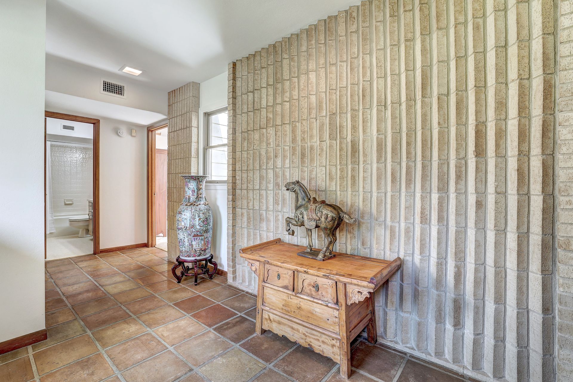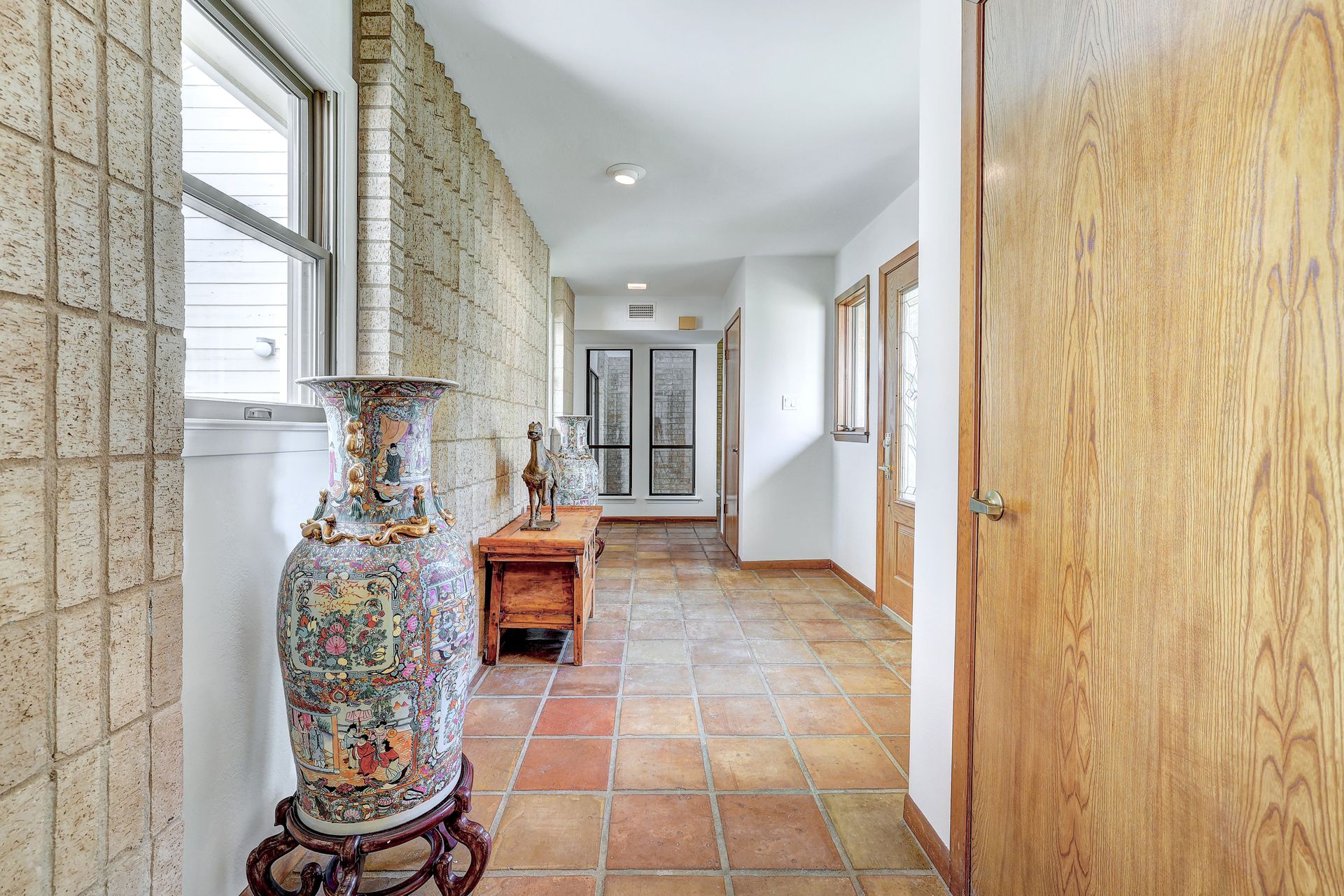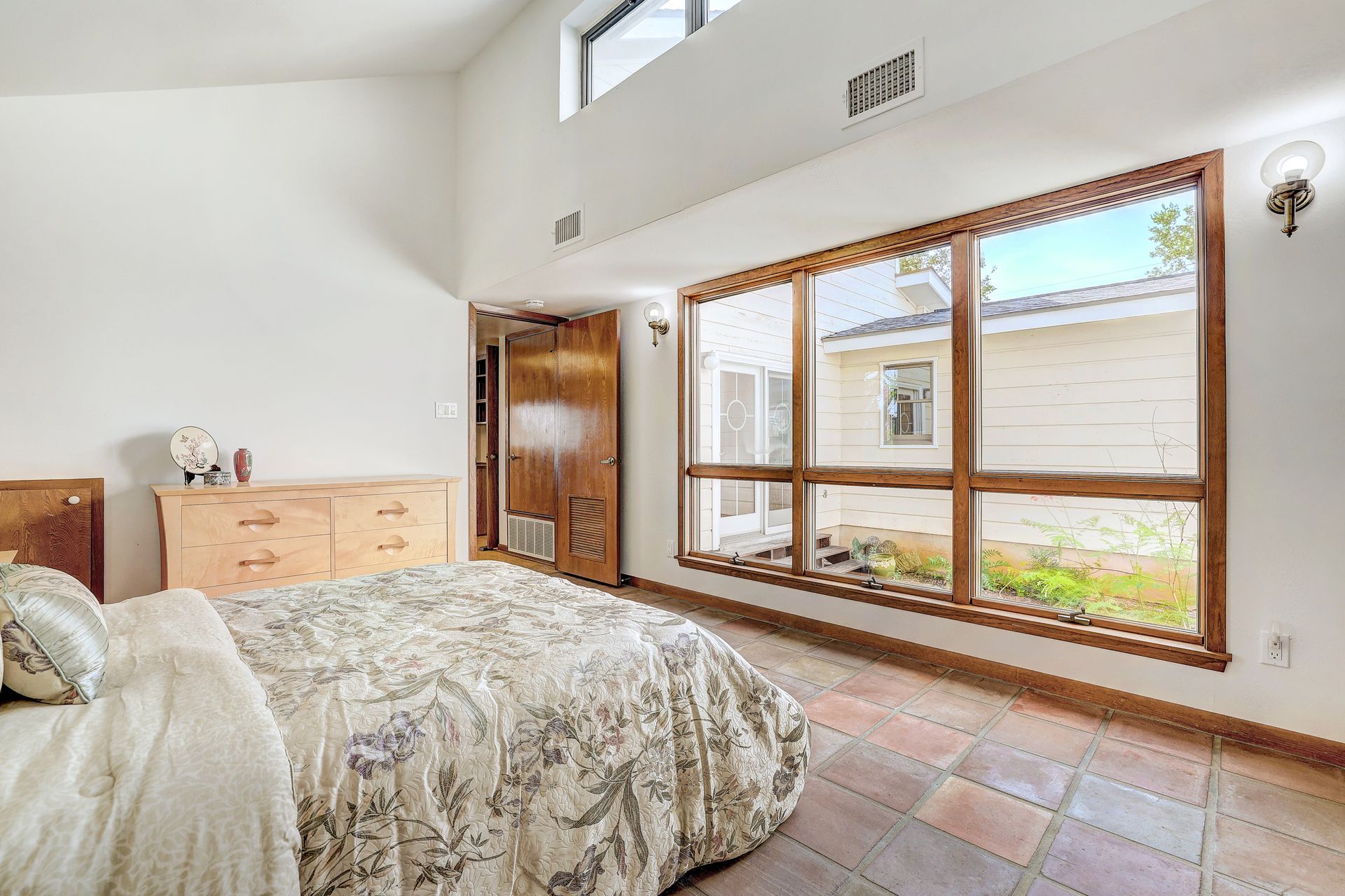 At the heart of the property sits a custom mid-century modern stone home, oriented perfectly to catch the morning sun. This 1,917 sq ft residence features 3 bedrooms, 2 bathrooms, and striking architectural details throughout, including two interior atriums that bring natural light and the outdoors into the living space.