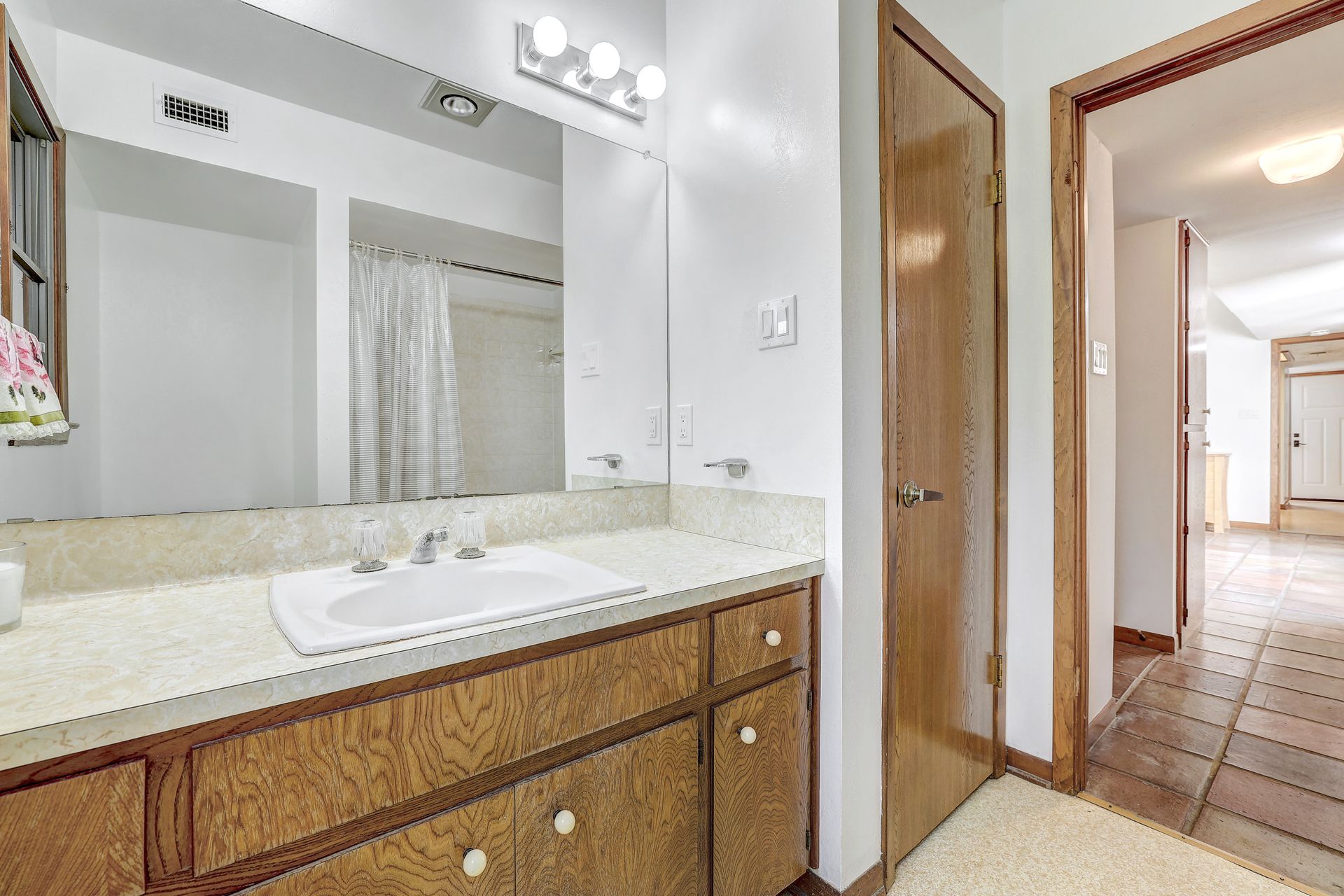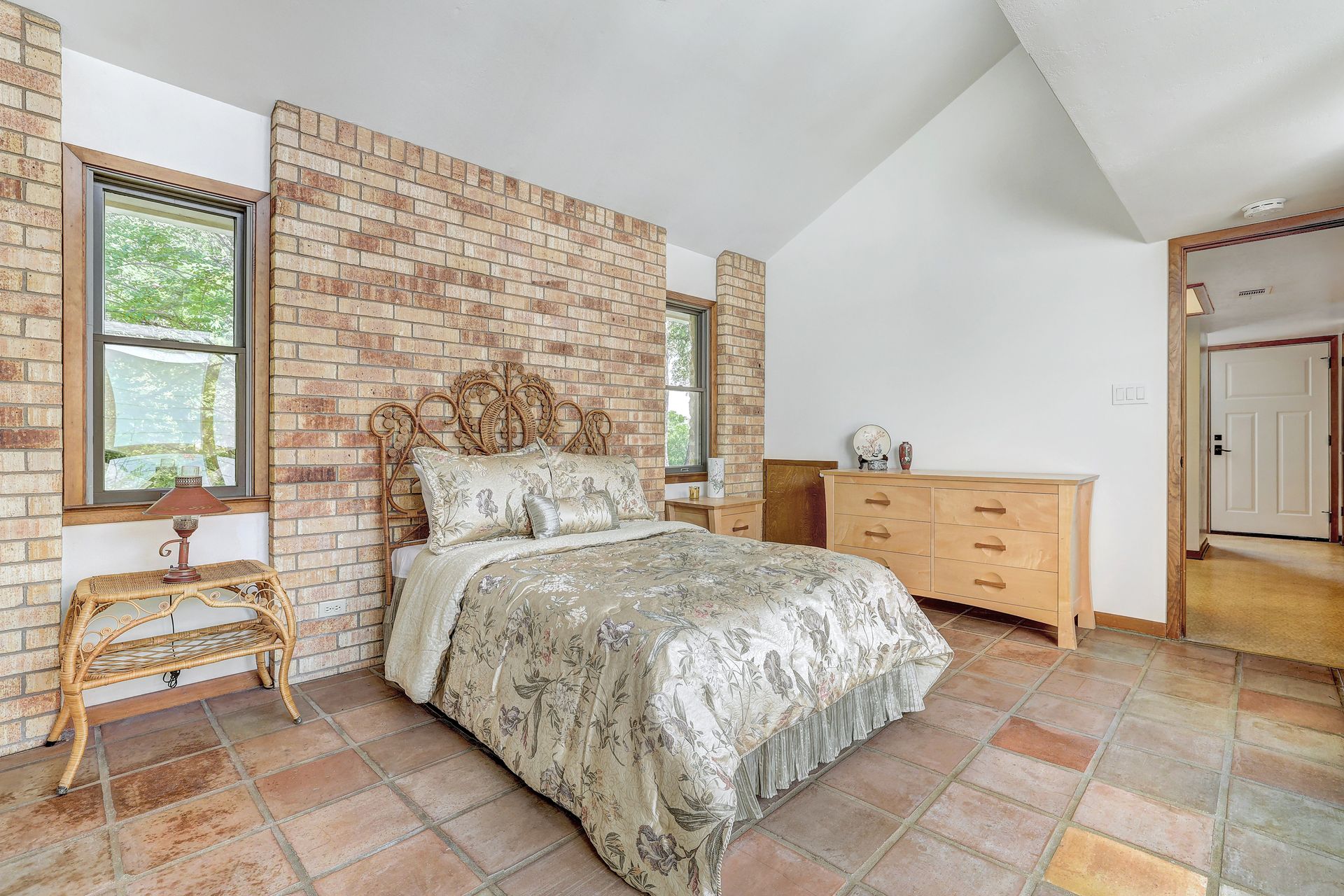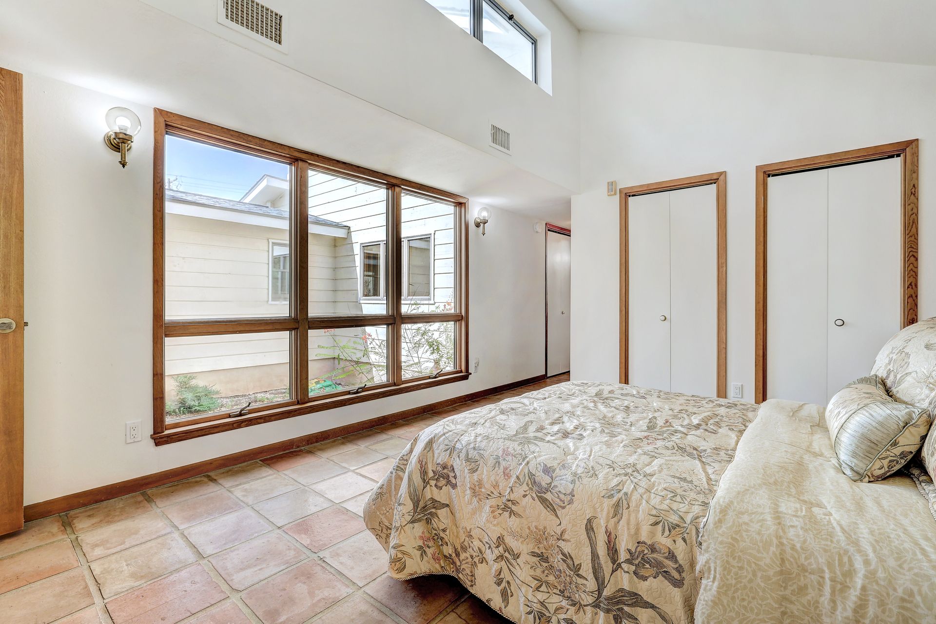 At the heart of the property sits a custom mid-century modern stone home, oriented perfectly to catch the morning sun. This 1,917 sq ft residence features 3 bedrooms, 2 bathrooms, and striking architectural details throughout, including two interior atriums that bring natural light and the outdoors into the living space.
