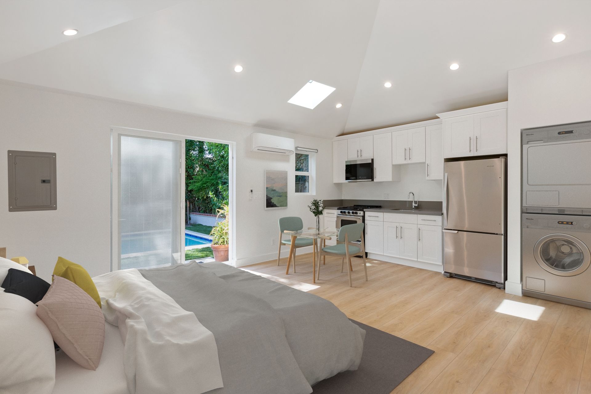 Work from Home!! Newly built detached guest hse, ADU, fully equipped /studio. South of Ventura Blvd in the "Silver triangle" area of Studio City at the foothills of Fryman Cyn hiking trails and Tree People. Walk a few steps to your own brand new, fully equipped studio work space w/separate entrance, full kitchen, bath, large closet & stackable washer/dryer. Designed for use as an OFFICE, granny apartment or gym. The main house features 4 bd, master w/en-suite bath; and bedroom/bonus, rm. w/half bath downstairs; 2 bd. & shared full bath upstairs, French drs leading to an exquisite backyard oasis including a large, UV protection, covered brick patio looking out over the pool, spa, & lawn. Updated kit. w/new stainless steel appl., including washer & dryer, marble counters. There are crown mouldings & wood flrs. throughout the home. The brand new permitted Studio is light, featuring Frch Drs, high ceil, full bath, and kith., lg. closet w/a view to the pool & its own covered patio. Walk to Sunday Farmer's market, CBS & Radford studios. On a beautiful lined street w/ $4 million+ homes. Top-ranked neighborhood school: “Just steps away from the highly rated Carpenter Community Charter (Great Schools 10/10)—a local gem for elementary education.” Honors & enrichment options: “Gifted students can thrive at Walter Reed Middle School within walking distance, featuring a prestigious Individualized Honors Program.” Public high school w/breadth of opportunities: “North Hollywood High - less than 2 miles away - offers robust academics, arts, & leadership programs.” Prestigious private alternatives: “Families who prefer private education have standout options nearby, including Campbell Hall, Harvard-Westlake, Oakwood School, Buckley, & Bridges Academy.” If financials are relevant, note Harvard-Westlake’s notable financial aid program. Easy traffic patterns using Laurel Cyn, Coldwater Cyn and Beverly Glen. Tree People hiking trails a walk away. In the most desirable location!