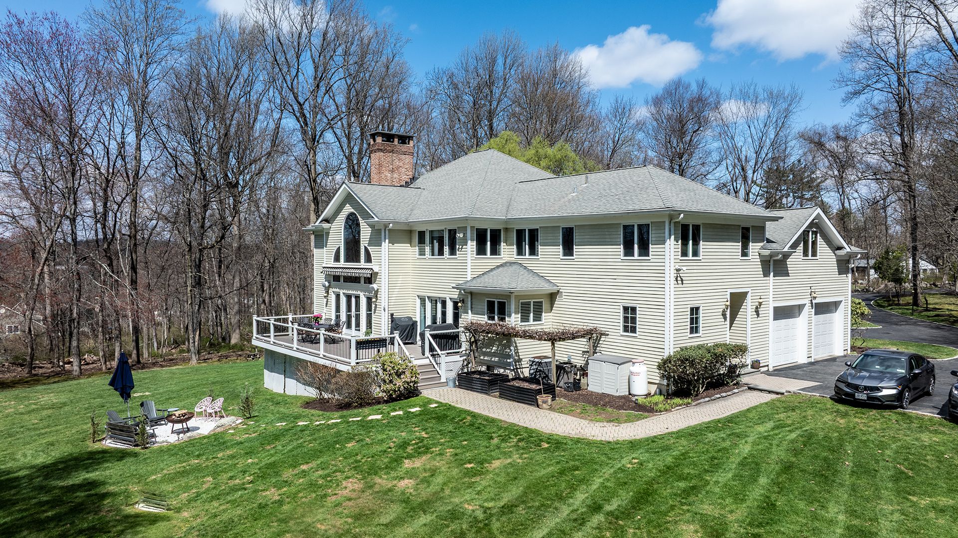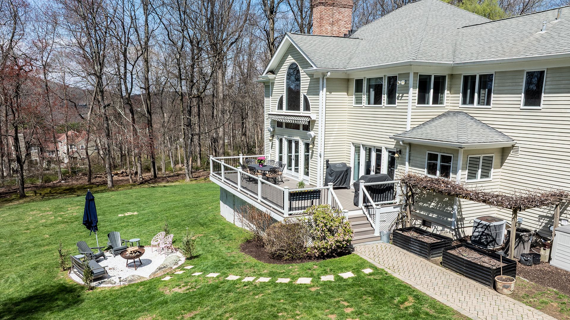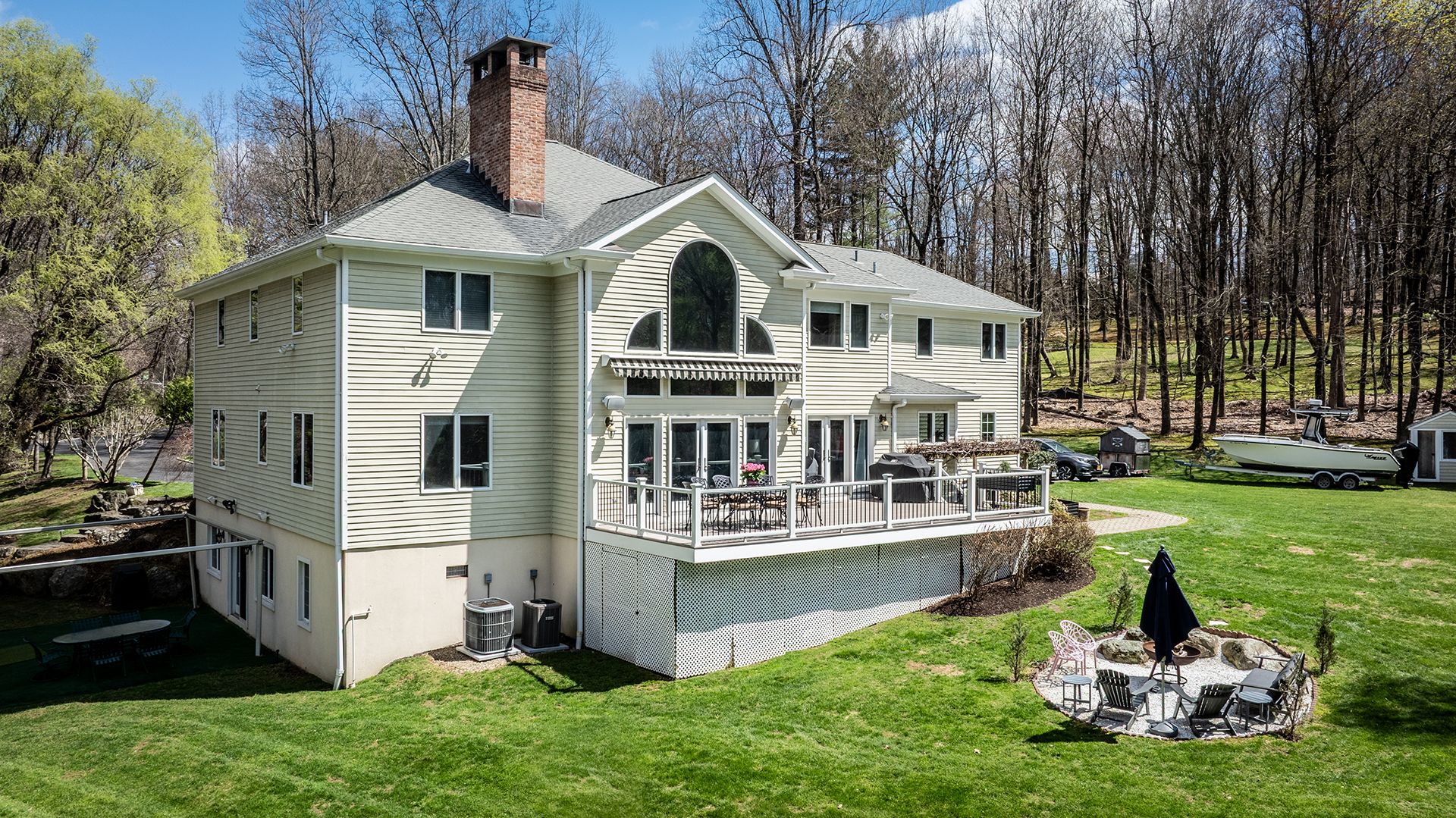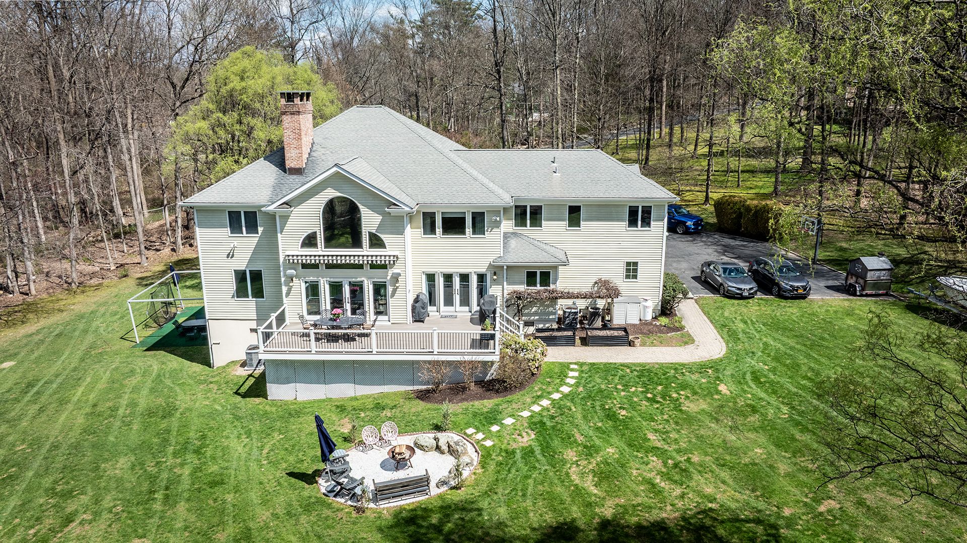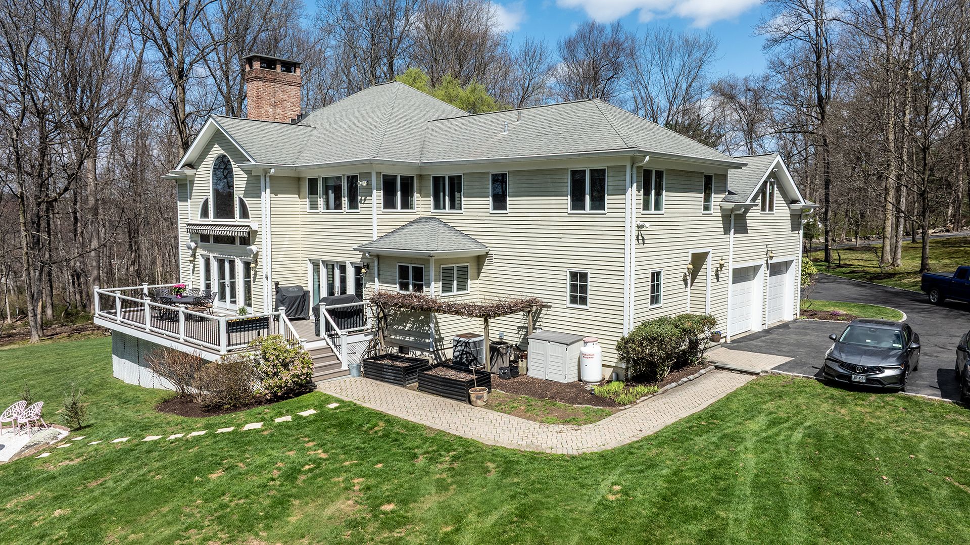 Additional highlights include two fireplaces, wired sound system, circular hot water system, updated well pump and filtration system, holding tank, 40-year roof, new deck, outdoor lighting, professionally landscaped grounds, and oversized attached two-car garage. Level backyard offers exceptional outdoor space. Minutes to town, shopping, dining, and train.