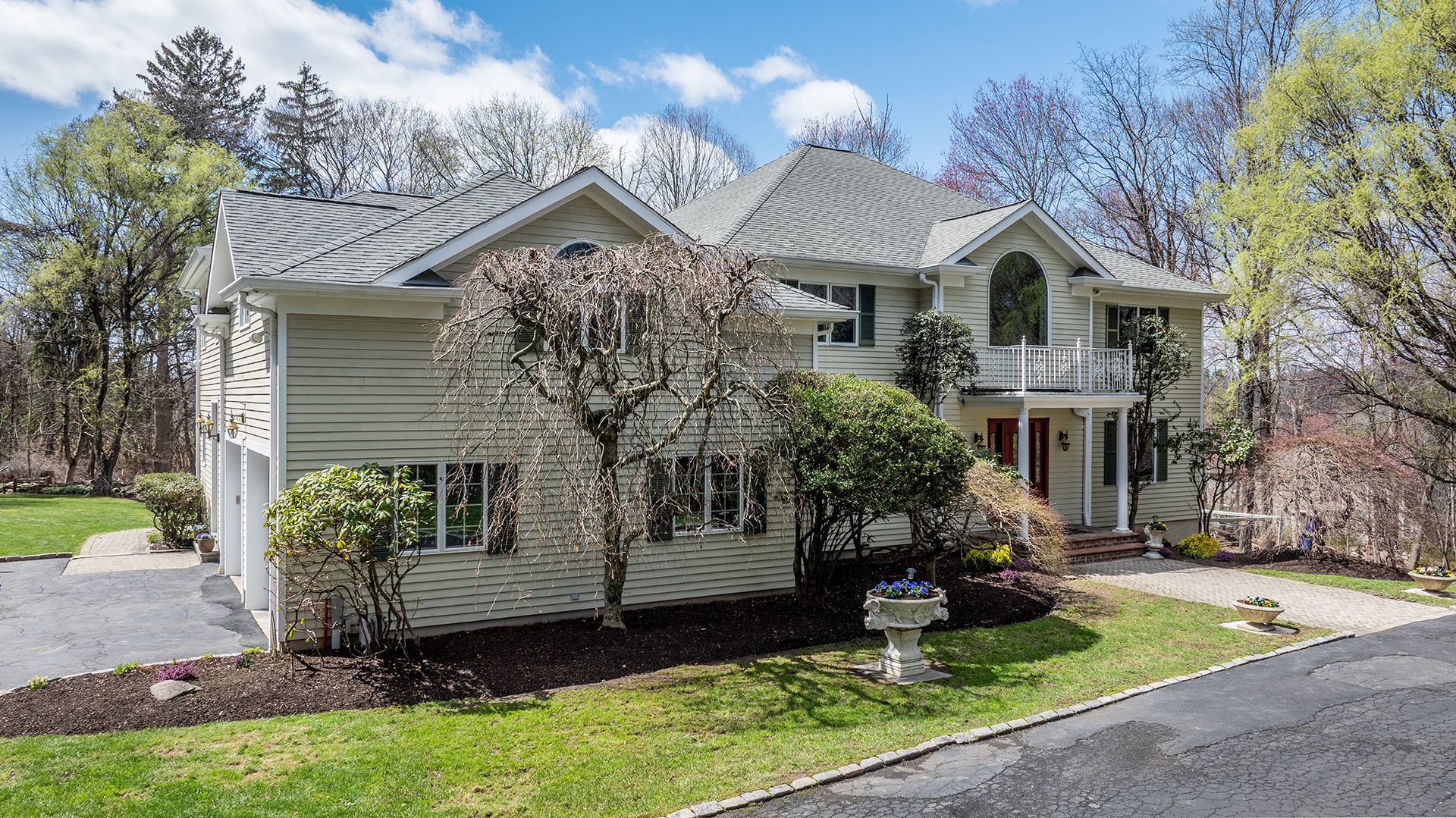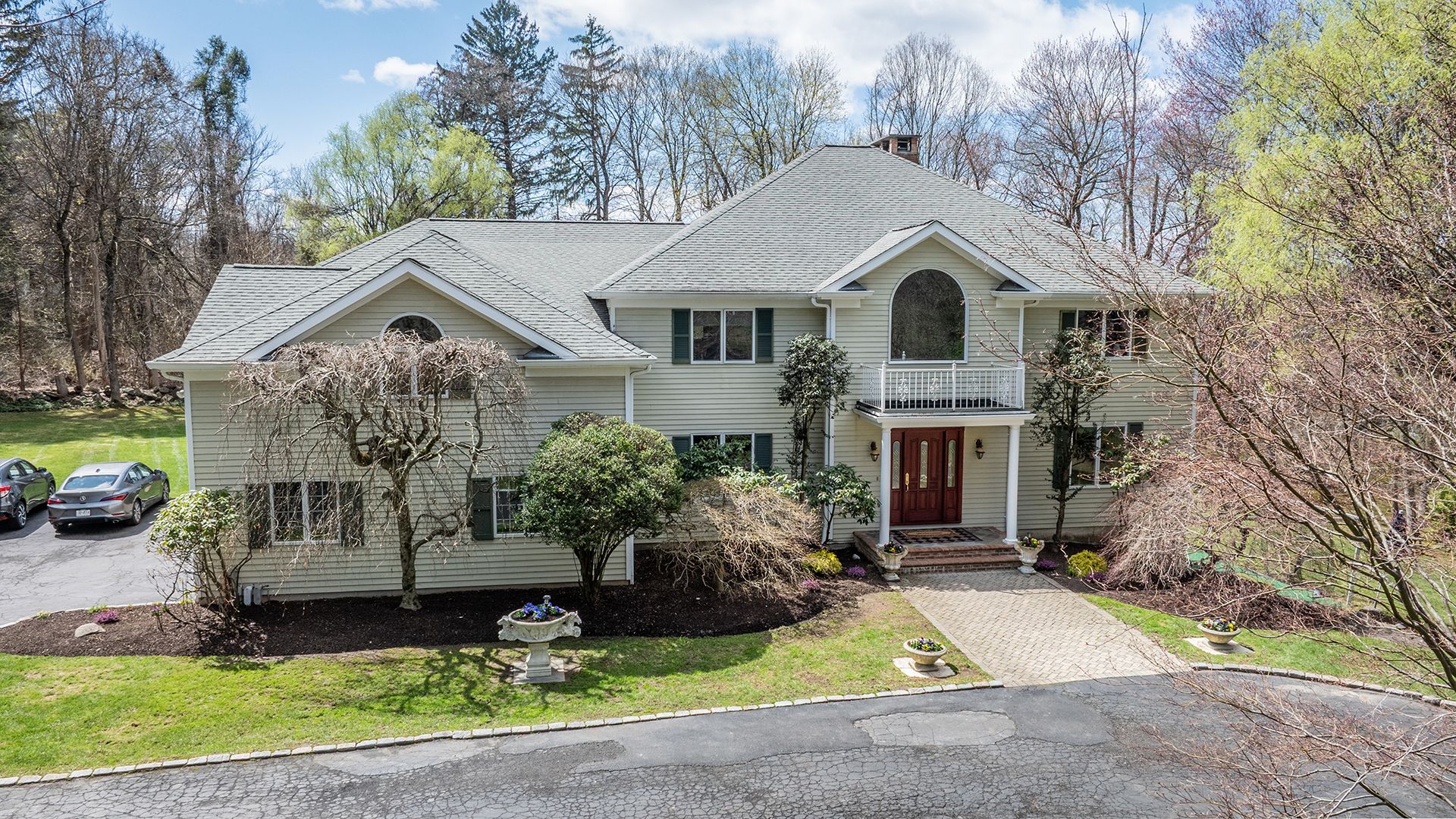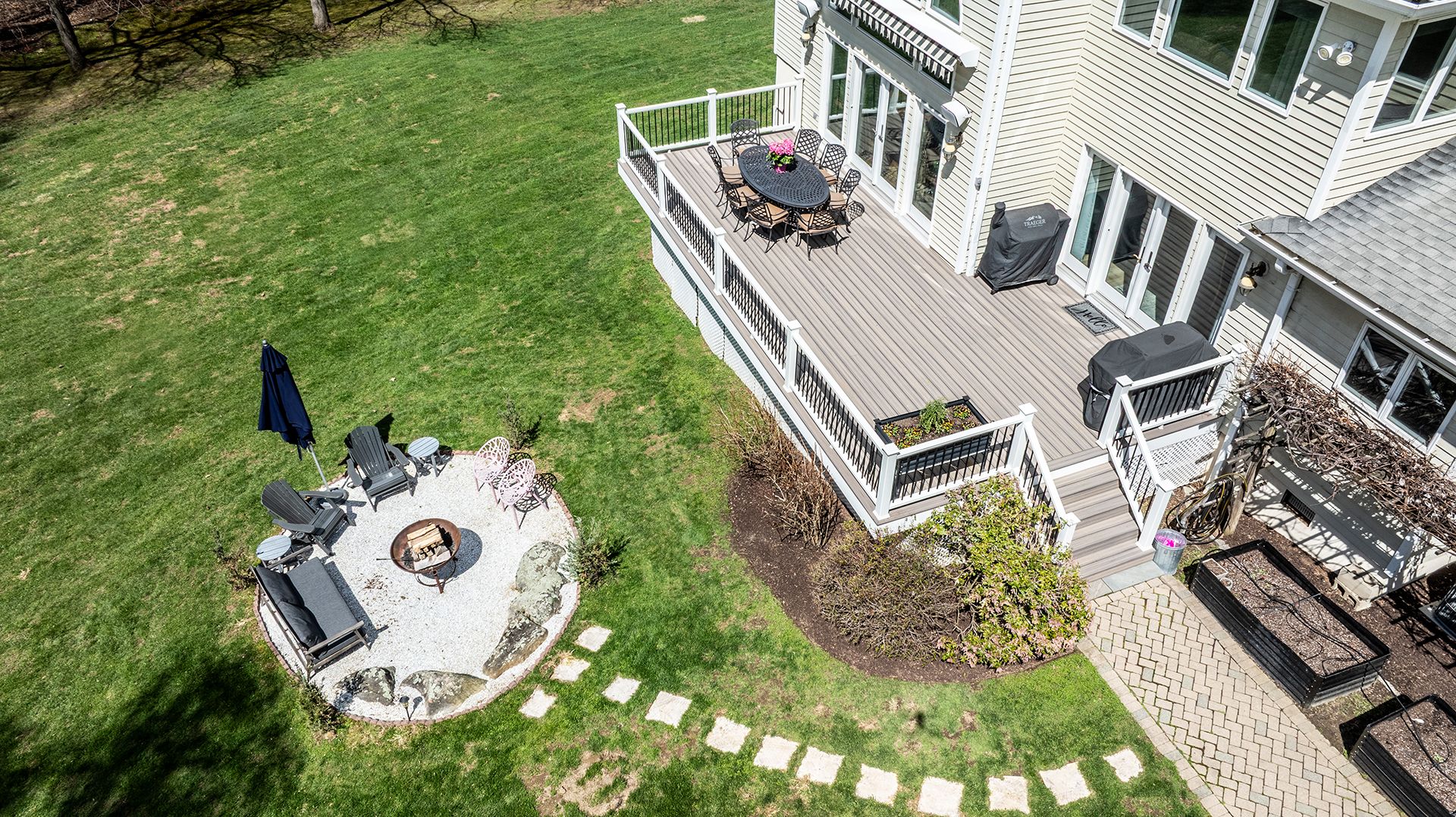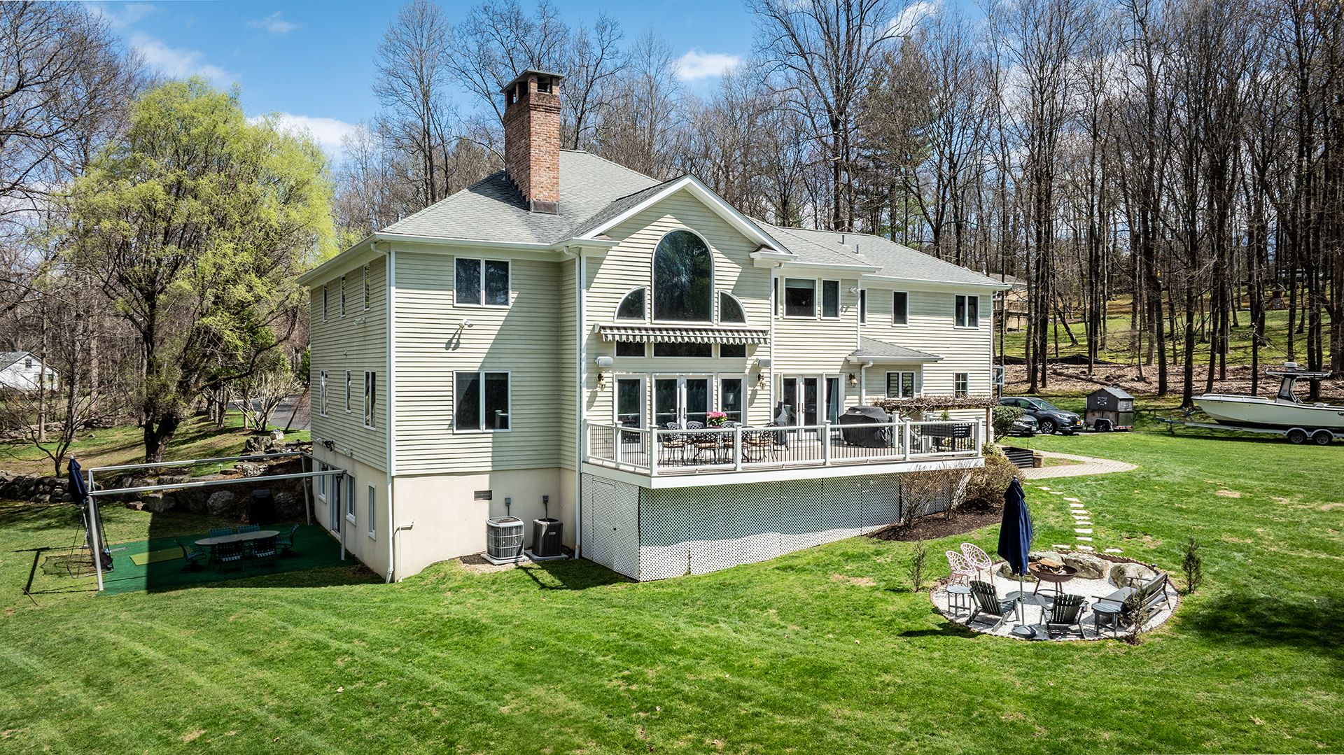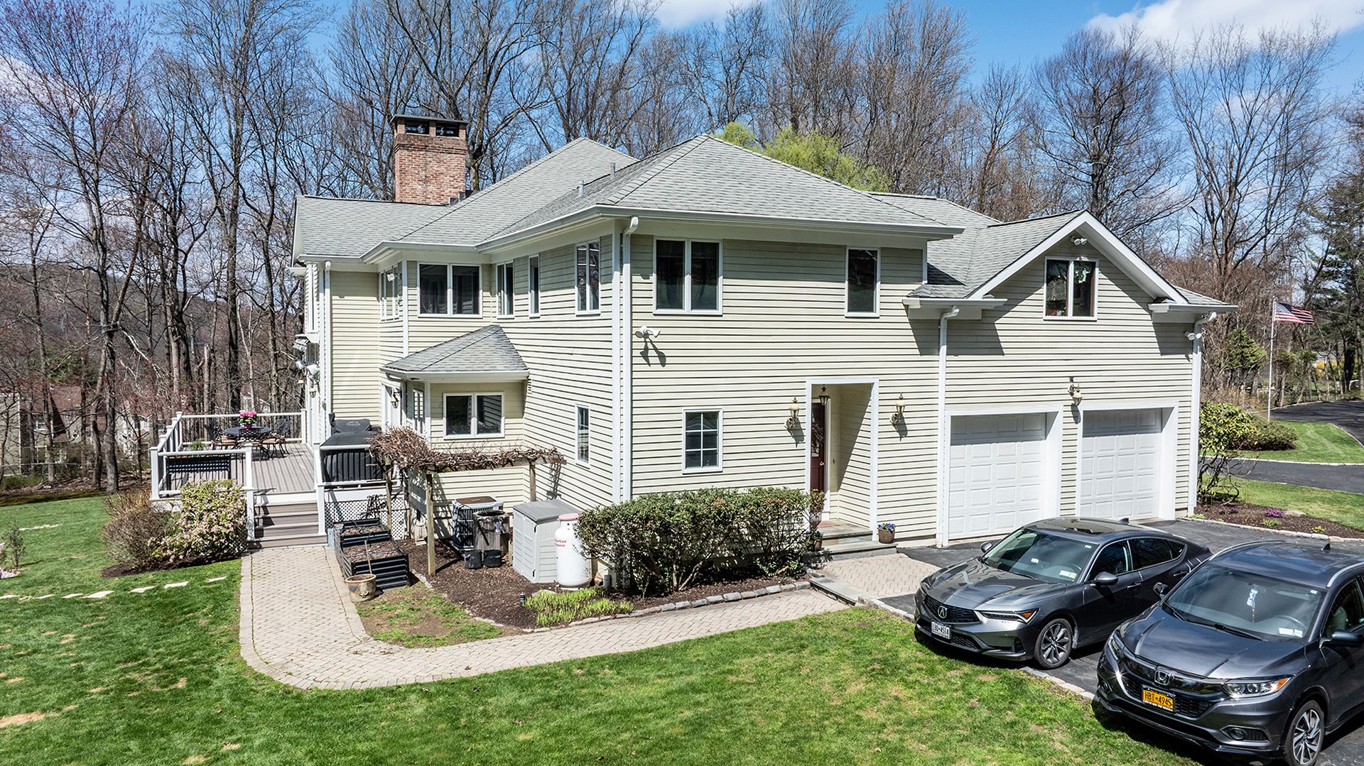 Additional highlights include two fireplaces, wired sound system, circular hot water system, updated well pump and filtration system, holding tank, 40-year roof, new deck, outdoor lighting, professionally landscaped grounds, and oversized attached two-car garage. Level backyard offers exceptional outdoor space. Minutes to town, shopping, dining, and train.