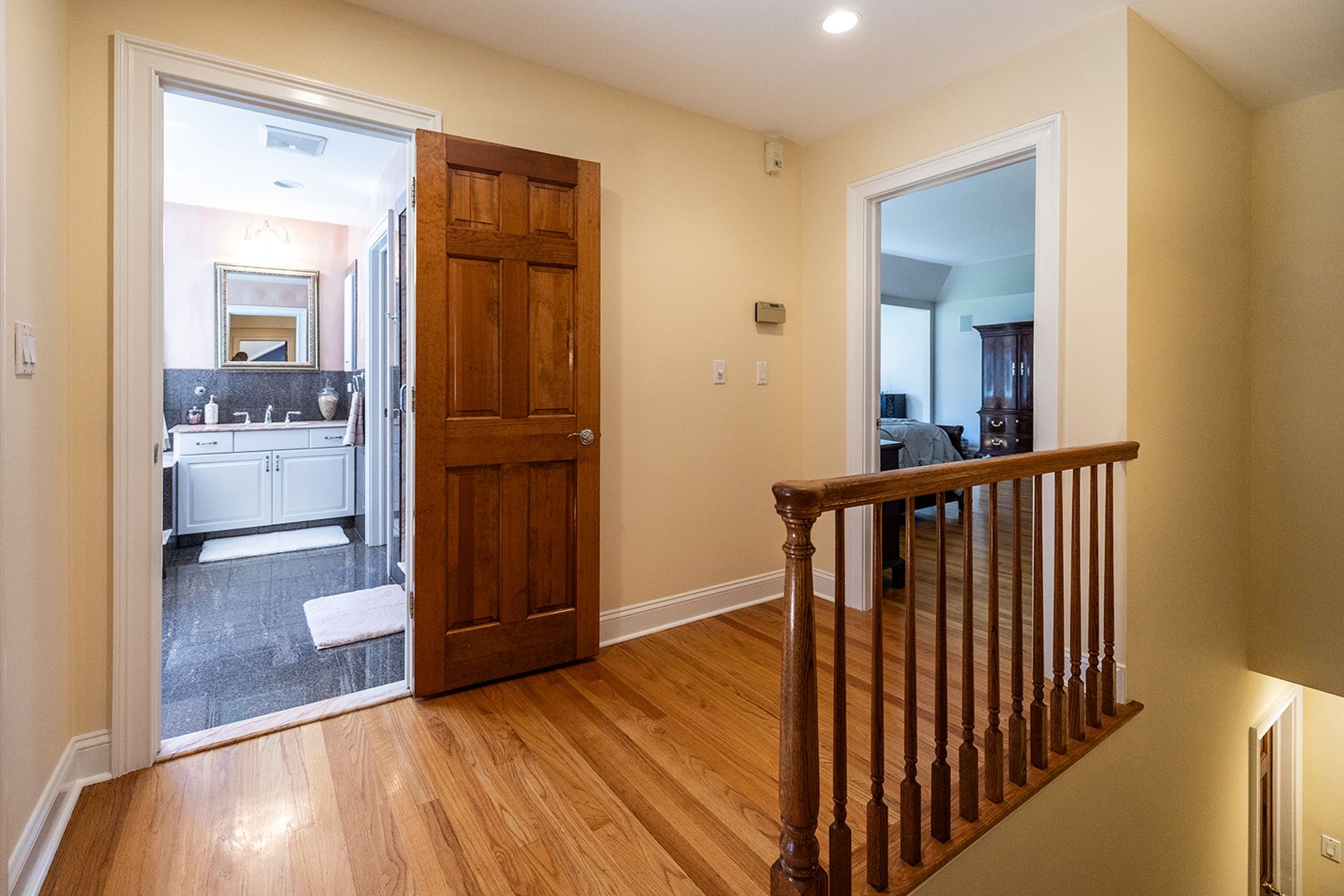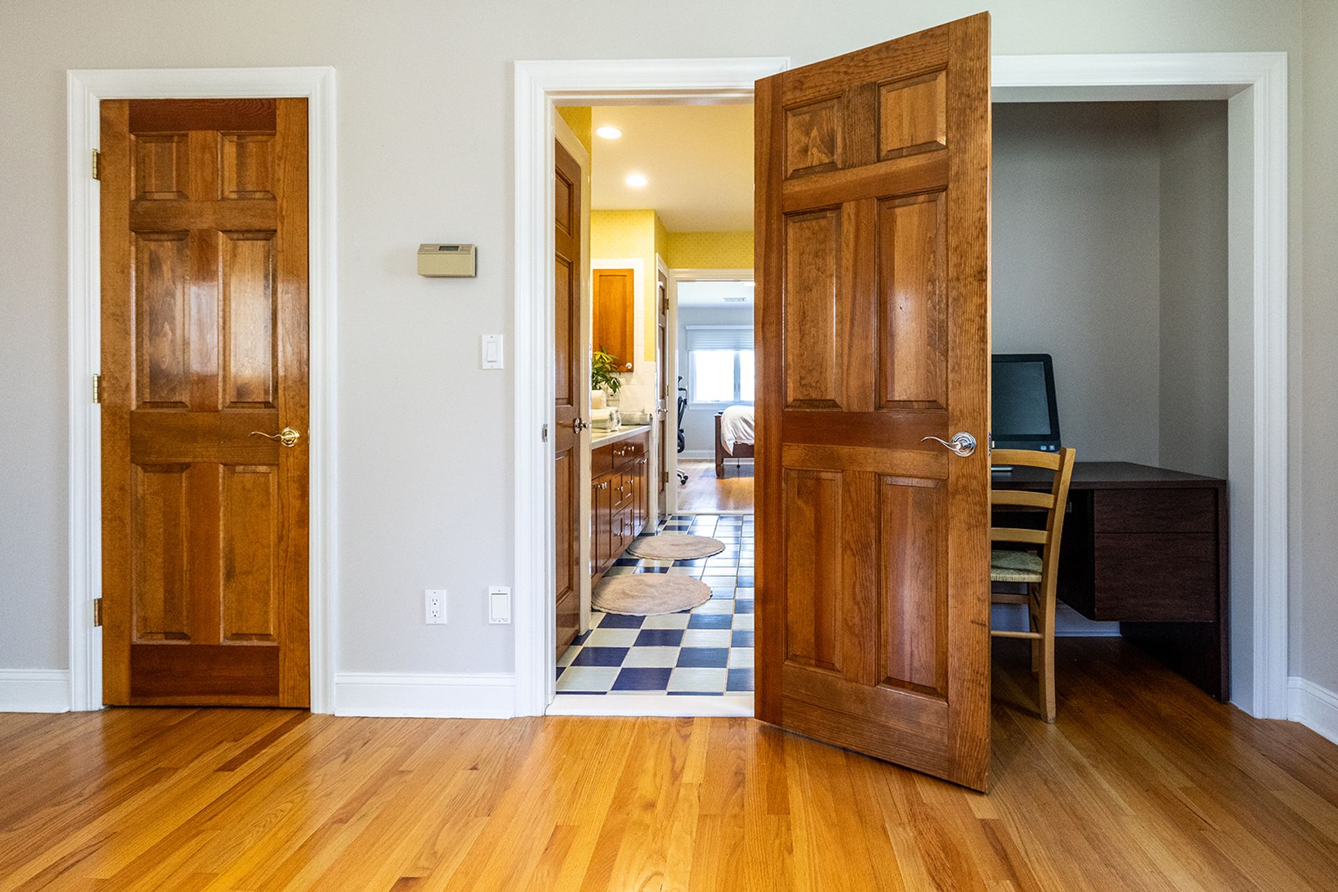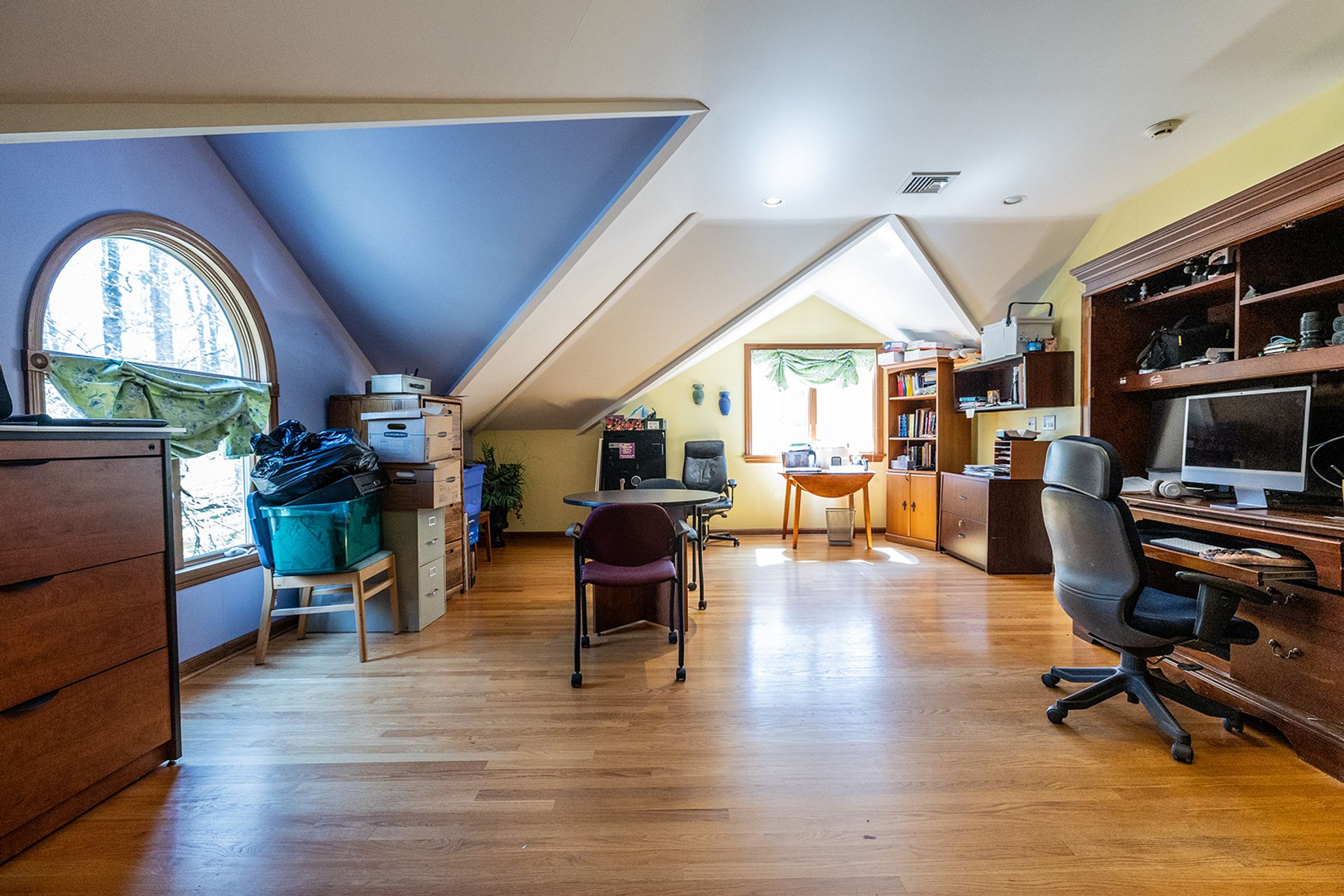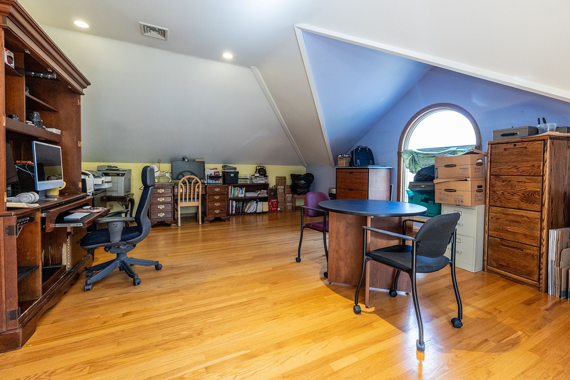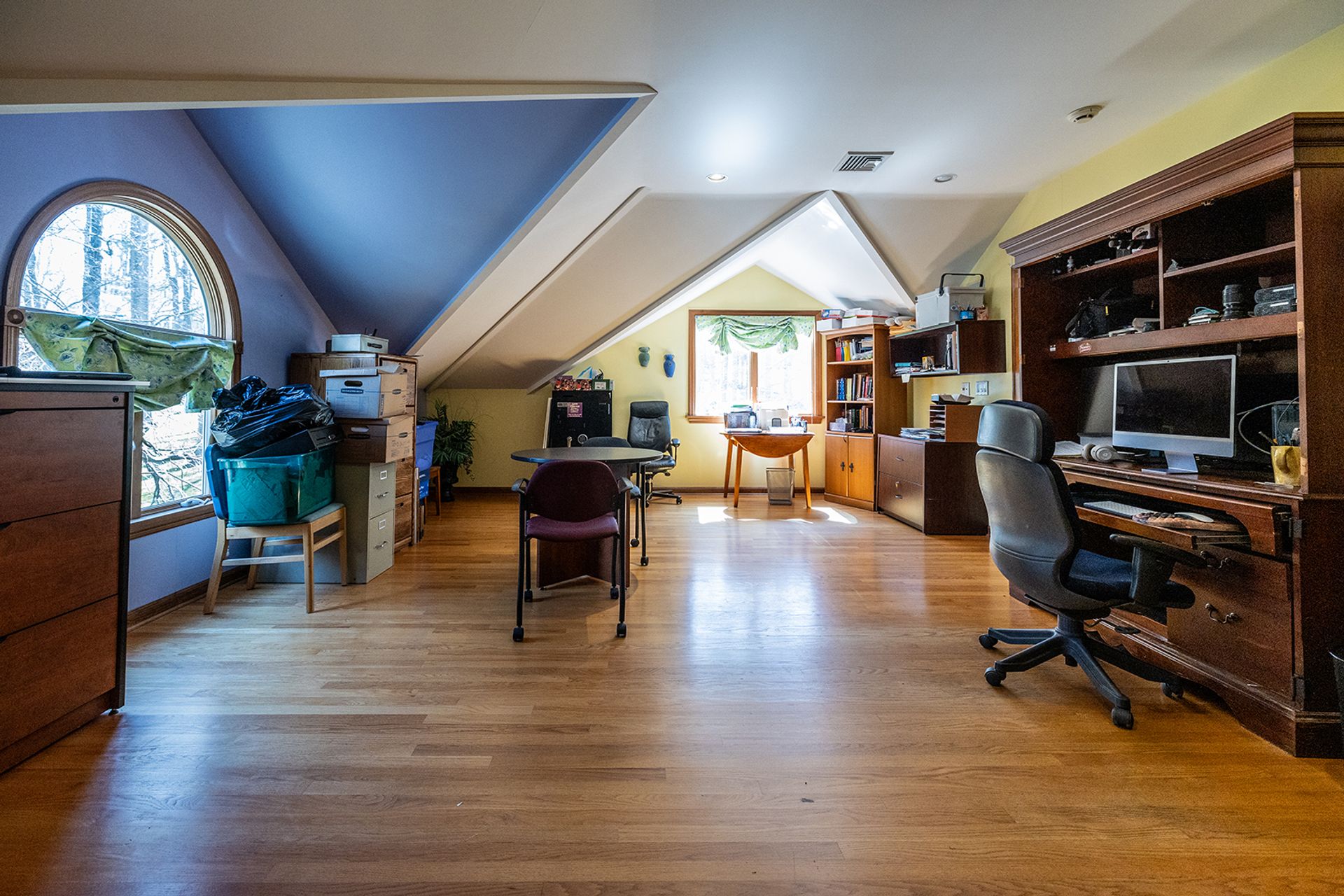 A first-floor bedroom, den or office with adjoining full bath provides ideal guest or work-from-home flexibility.