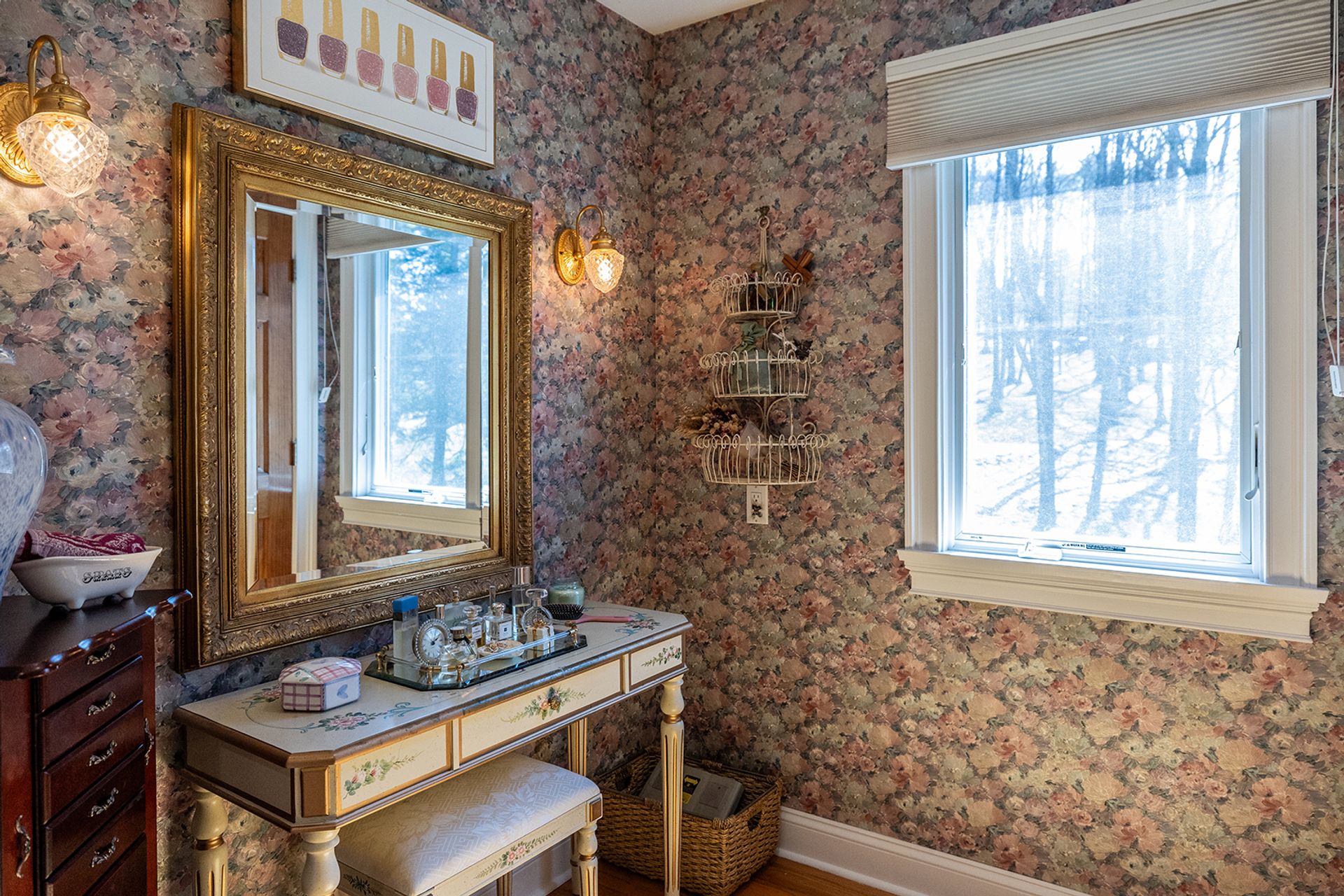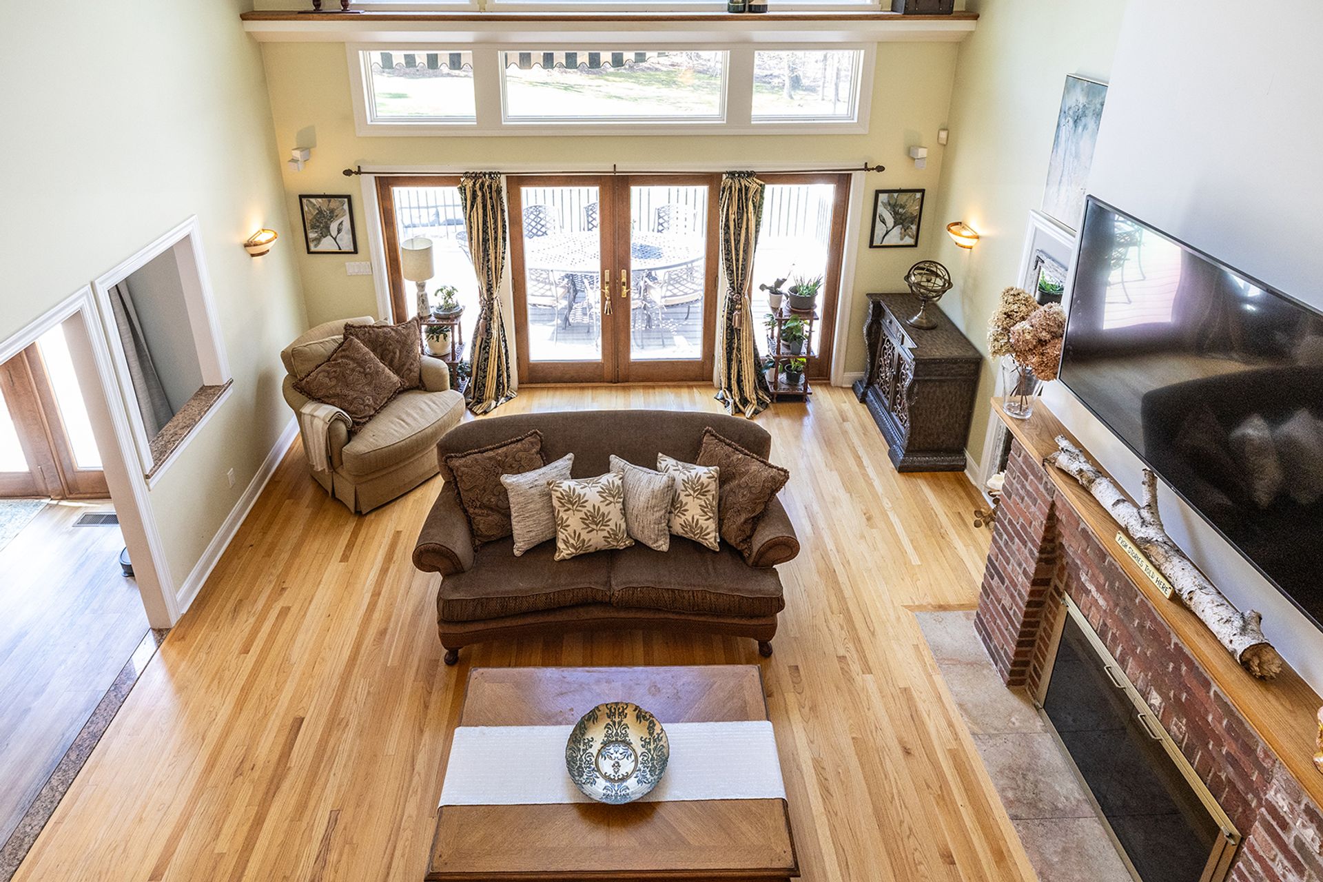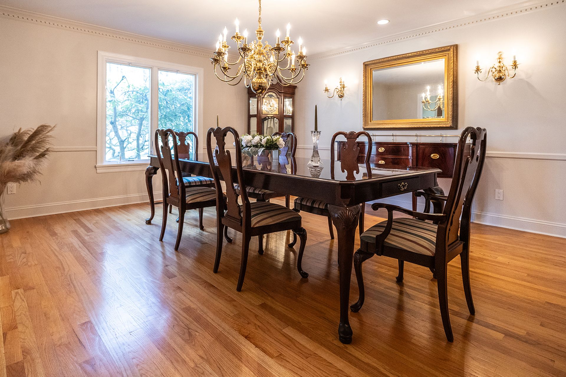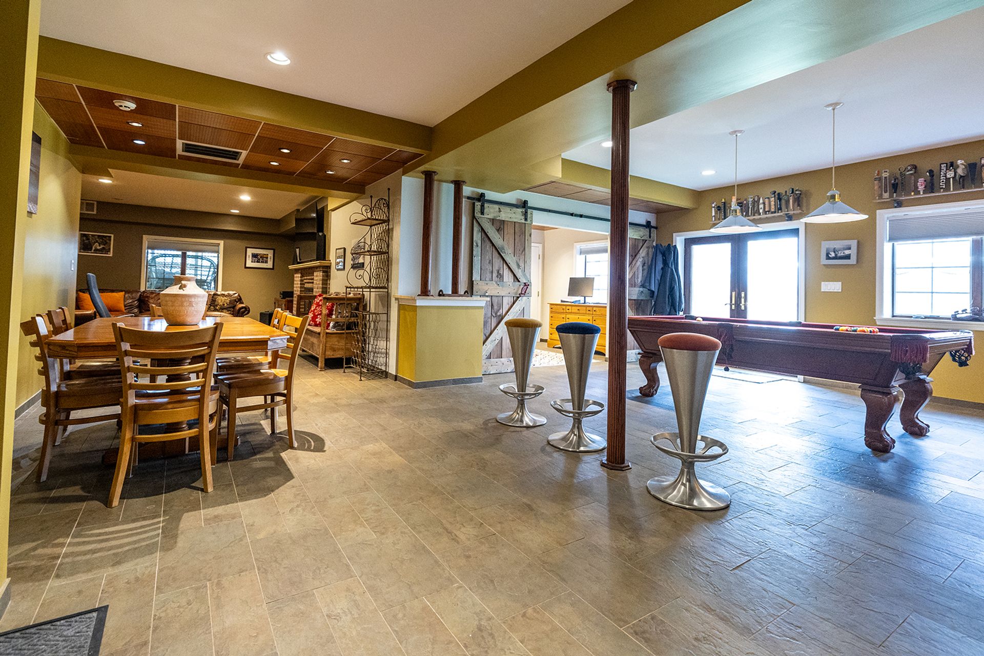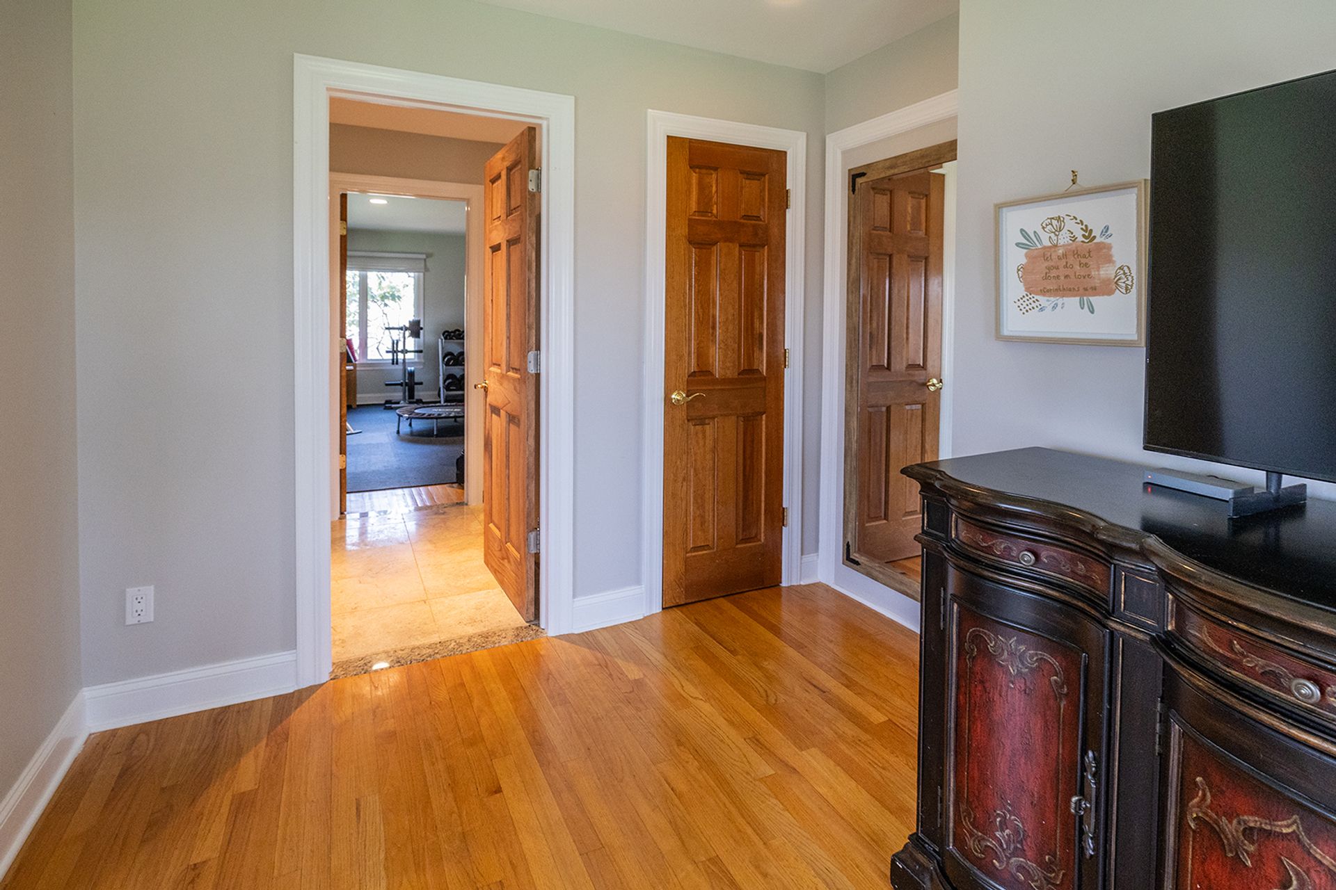 A first-floor bedroom, den or office with adjoining full bath provides ideal guest or work-from-home flexibility.