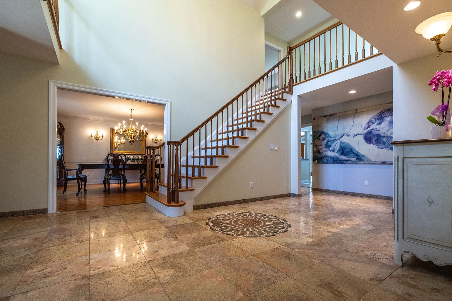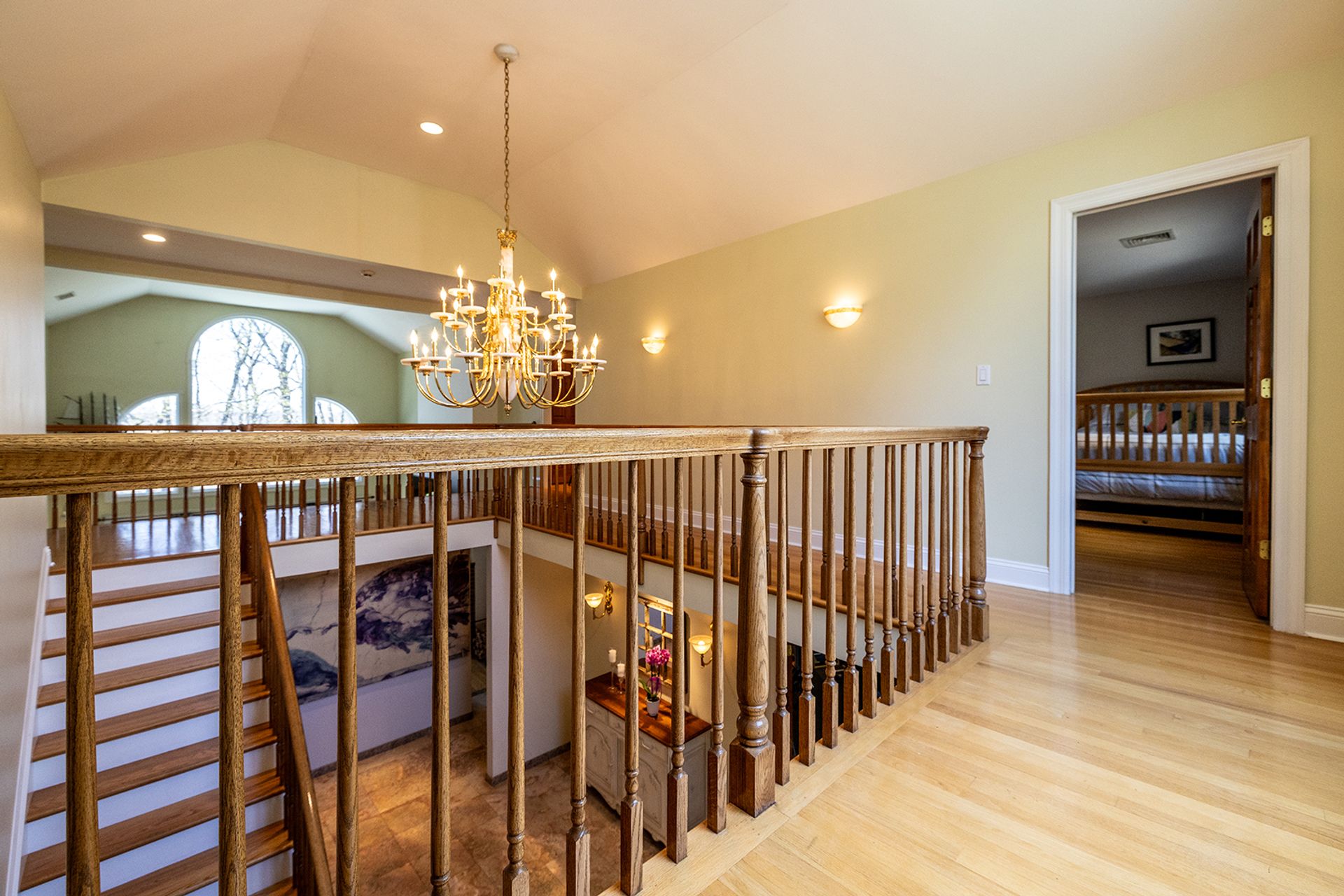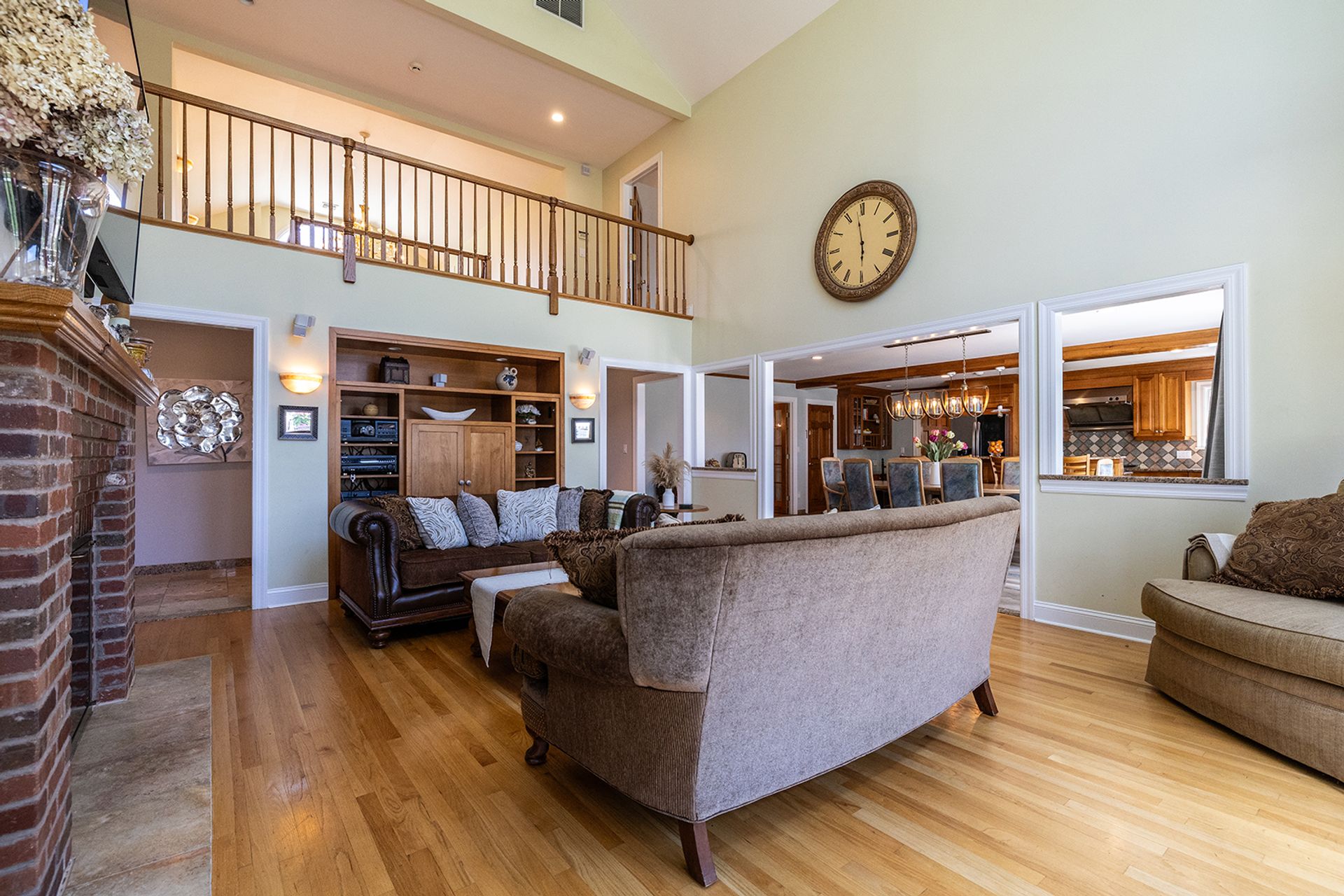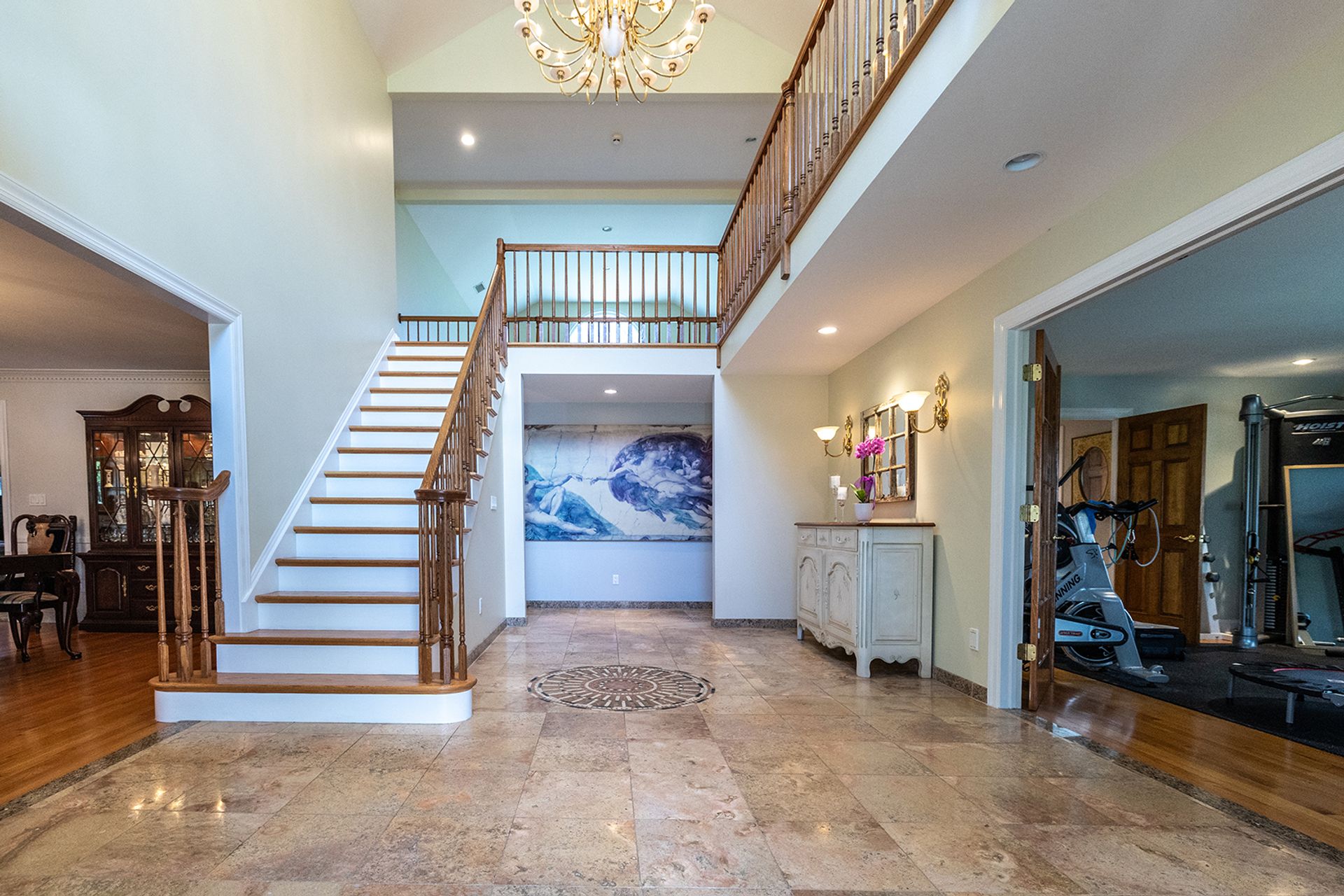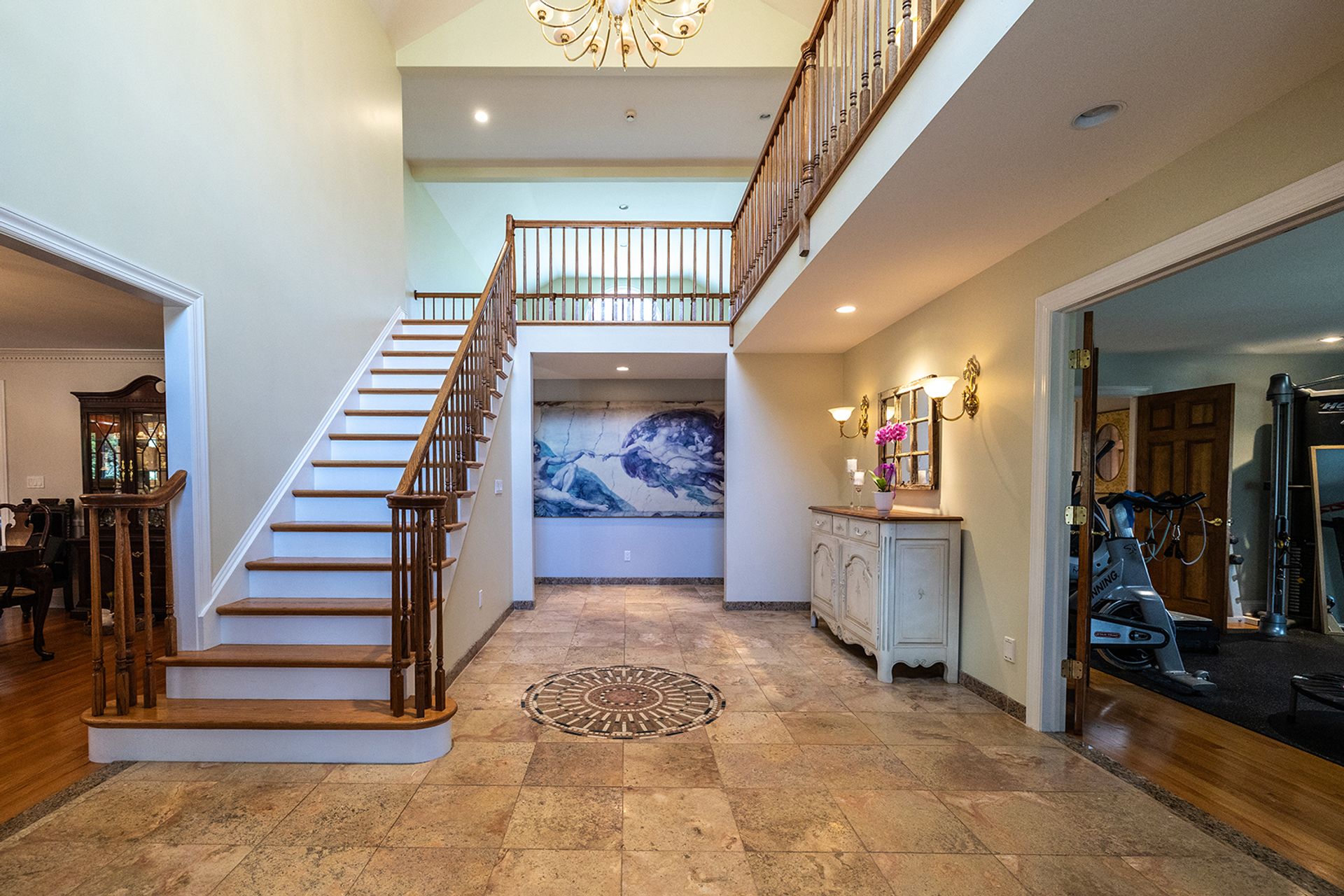 A dramatic two-story foyer with sweeping staircase and wraparound catwalk introduces the gracious interior, flanked by formal dining room and gym or living room. The oversized chef’s kitchen features a six-burner commercial-grade gas stove top and electric oven combo with warming station, expansive center island with prep sink and breakfast bar, dedicated work station, walk-in pantry, mudroom entrance, laundry area, and extensive custom cabinetry with built-ins. The adjoining family room is anchored by a wood-burning fireplace and dramatic two-story wall of windows that fills the space with natural light.