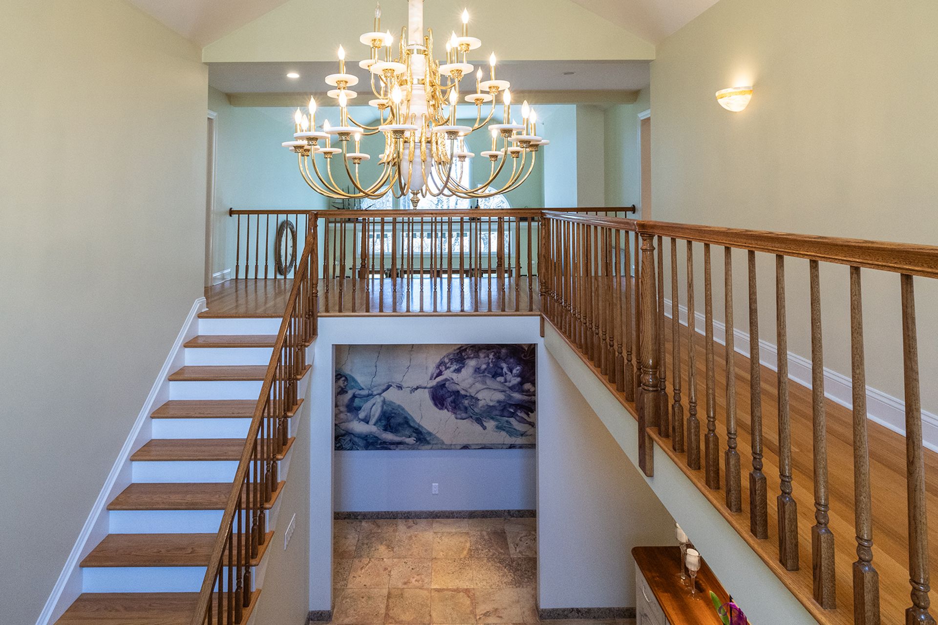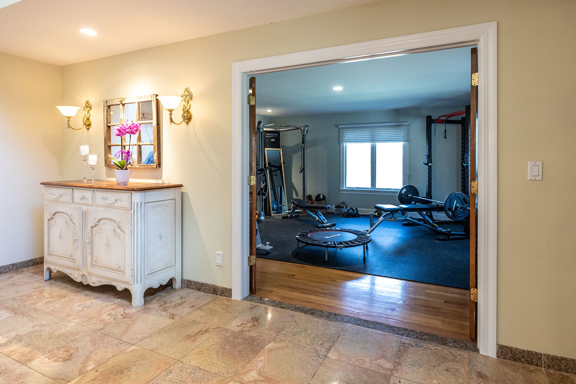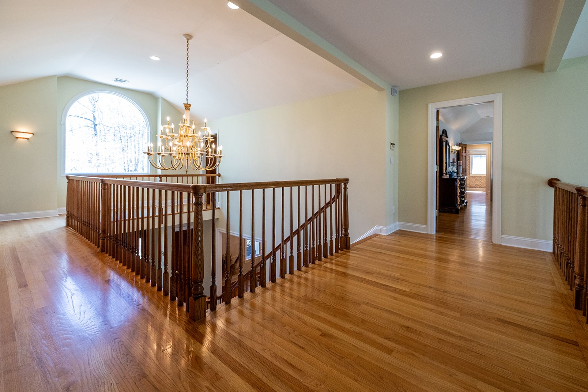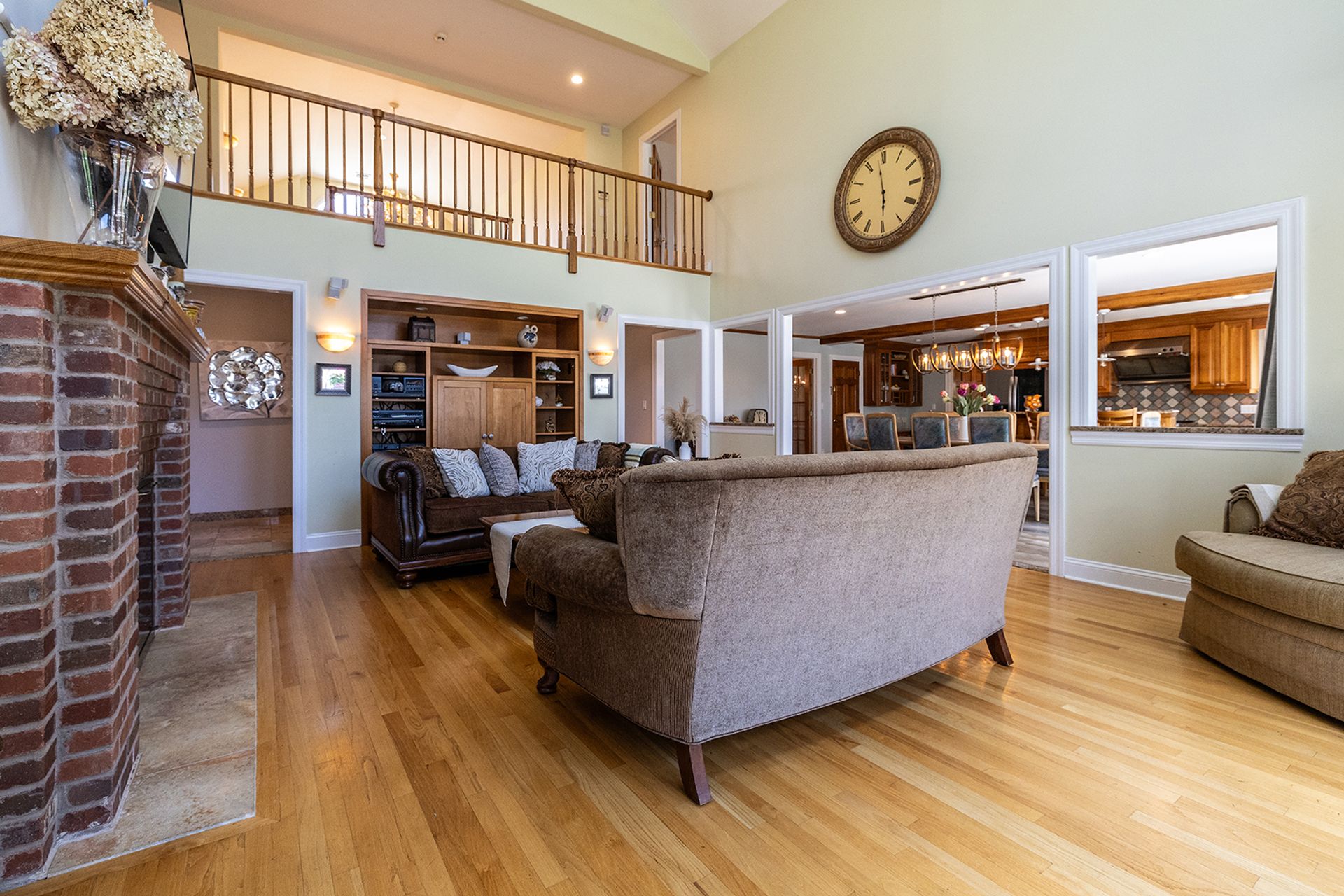 A dramatic two-story foyer with sweeping staircase and wraparound catwalk introduces the gracious interior, flanked by formal dining room and gym or living room. The oversized chef’s kitchen features a six-burner commercial-grade gas stove top and electric oven combo with warming station, expansive center island with prep sink and breakfast bar, dedicated work station, walk-in pantry, mudroom entrance, laundry area, and extensive custom cabinetry with built-ins. The adjoining family room is anchored by a wood-burning fireplace and dramatic two-story wall of windows that fills the space with natural light.
