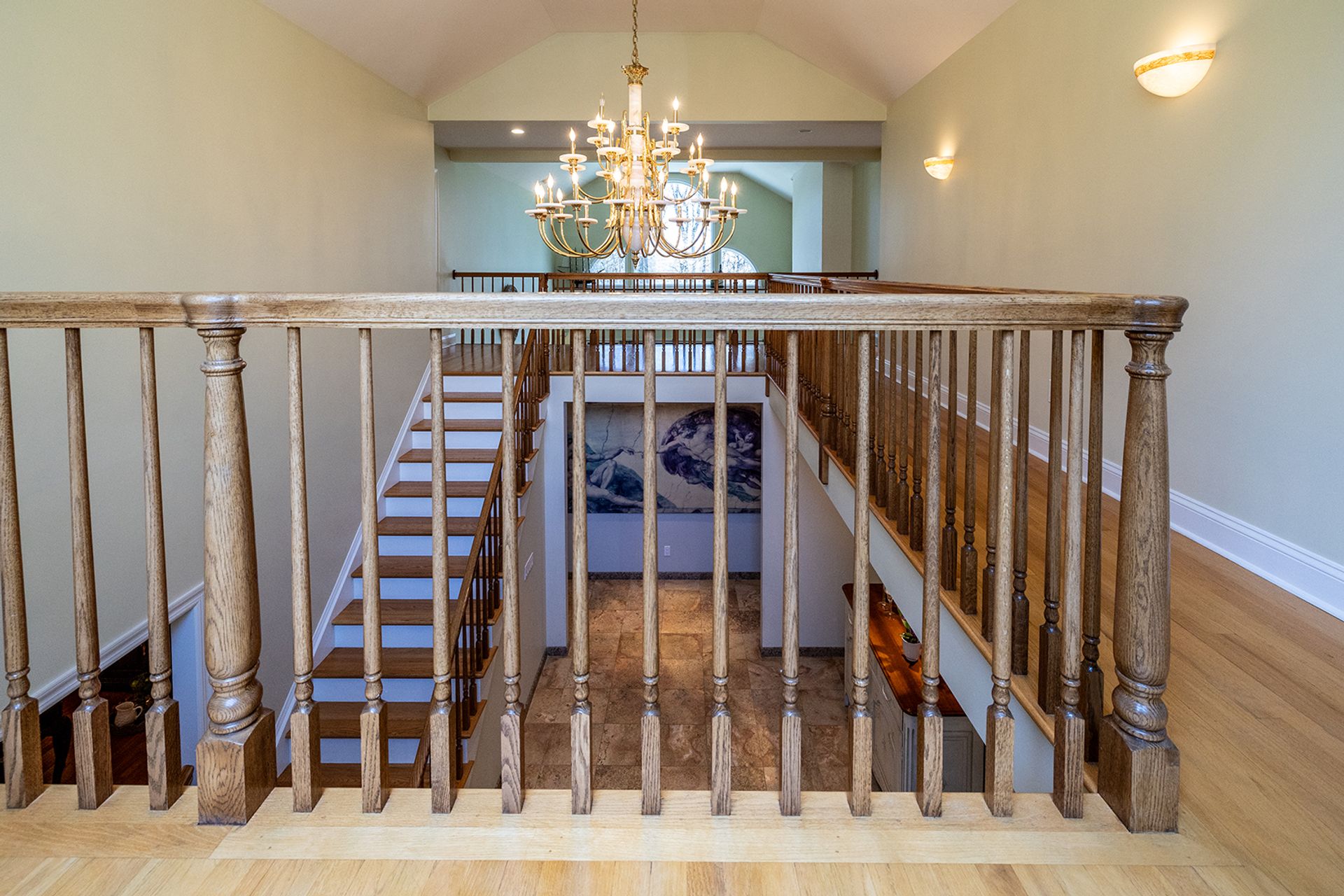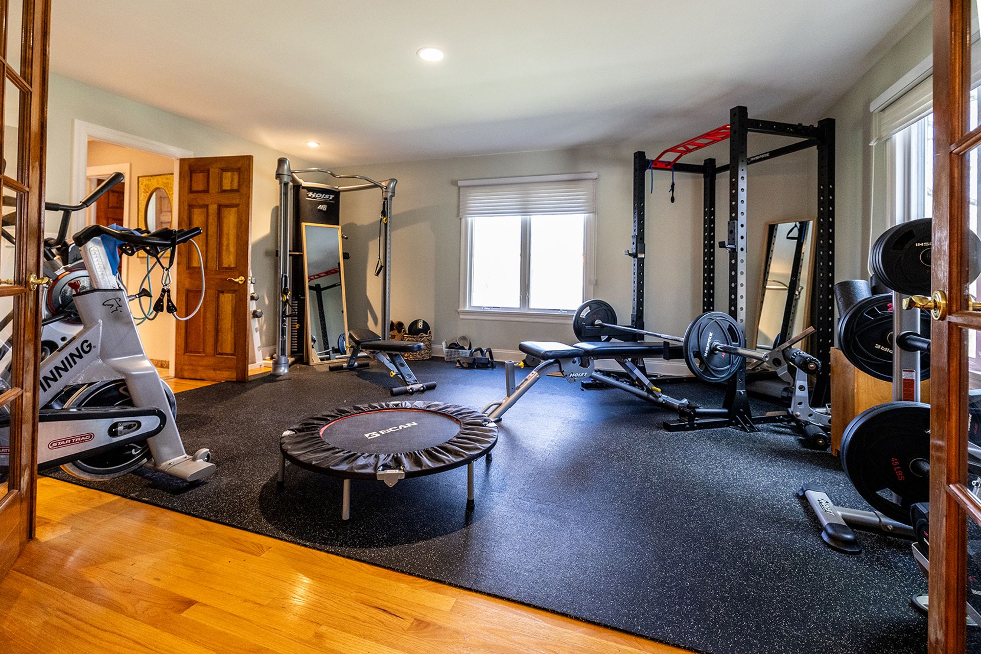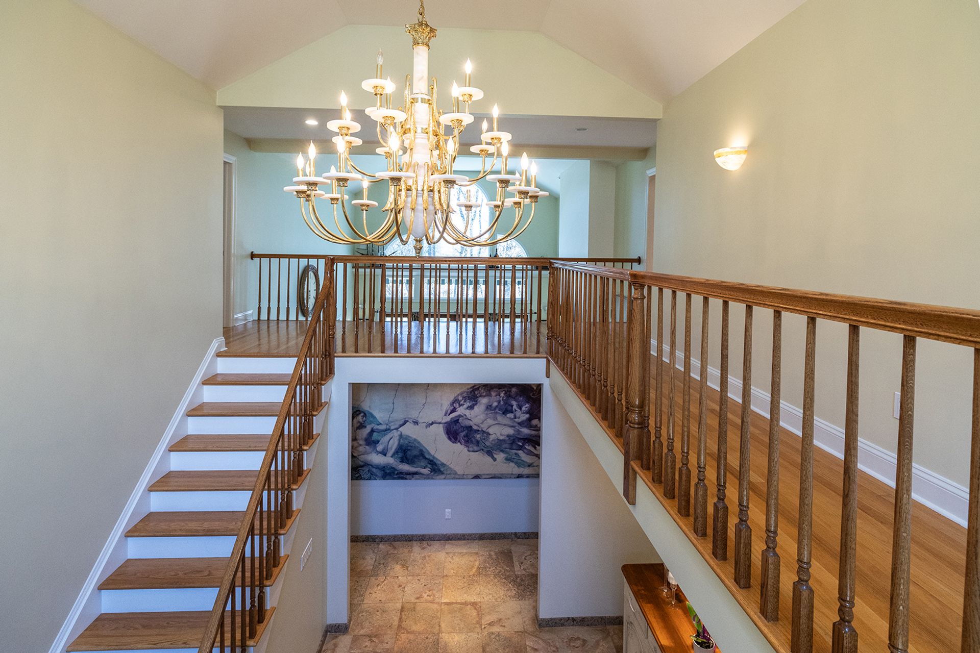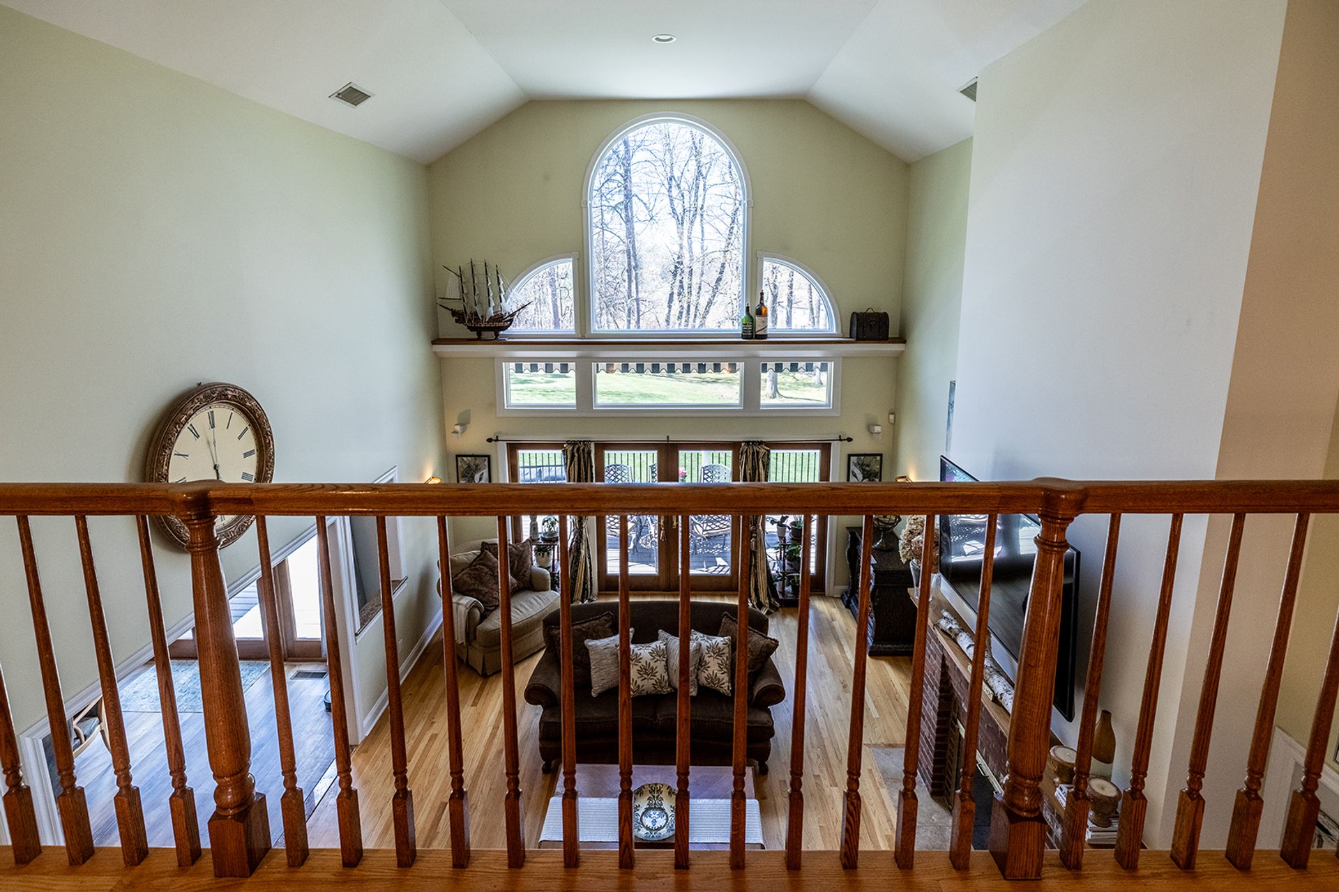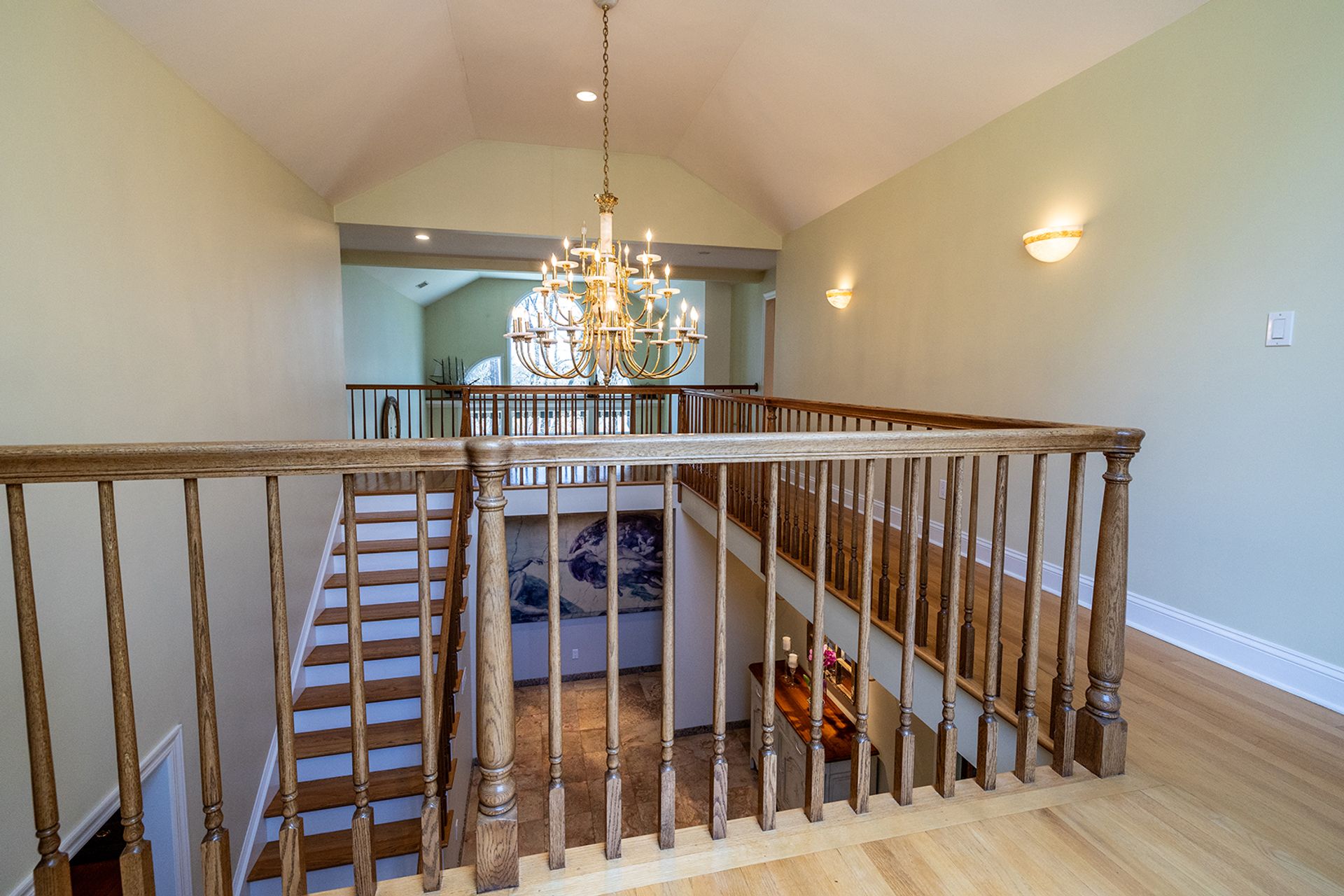 A dramatic two-story foyer with sweeping staircase and wraparound catwalk introduces the gracious interior, flanked by formal dining room and gym or living room. The oversized chef’s kitchen features a six-burner commercial-grade gas stove top and electric oven combo with warming station, expansive center island with prep sink and breakfast bar, dedicated work station, walk-in pantry, mudroom entrance, laundry area, and extensive custom cabinetry with built-ins. The adjoining family room is anchored by a wood-burning fireplace and dramatic two-story wall of windows that fills the space with natural light.
