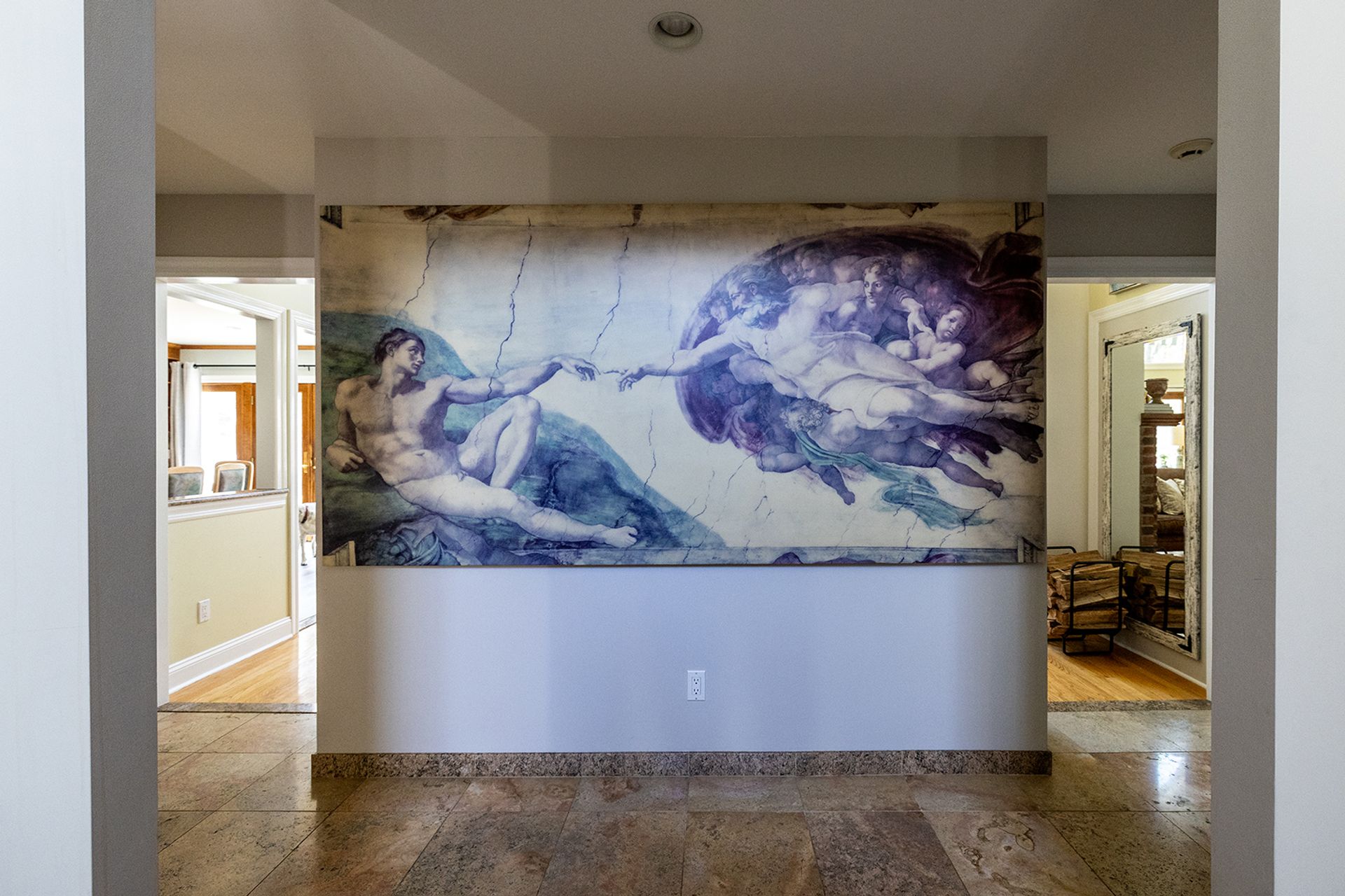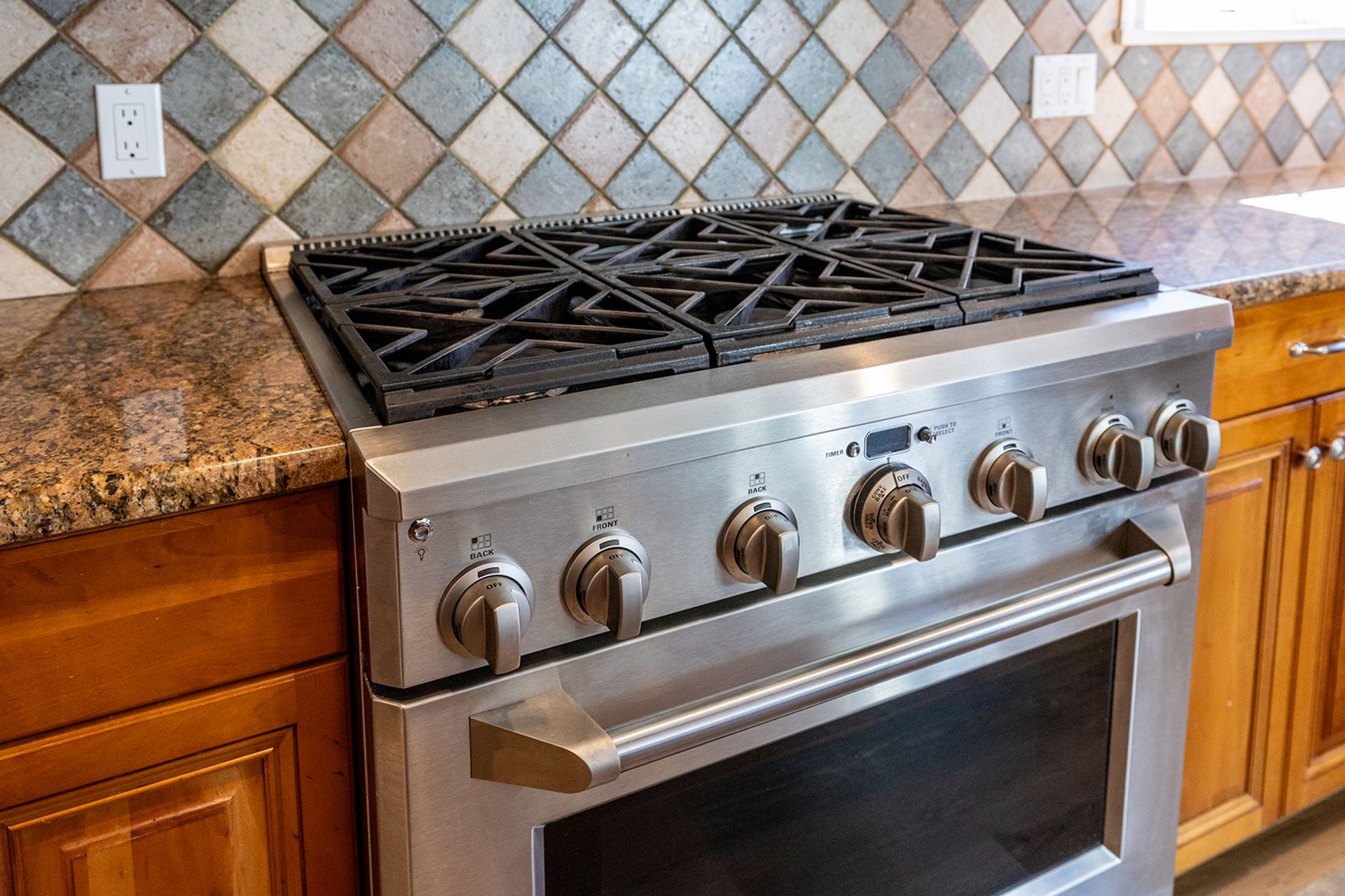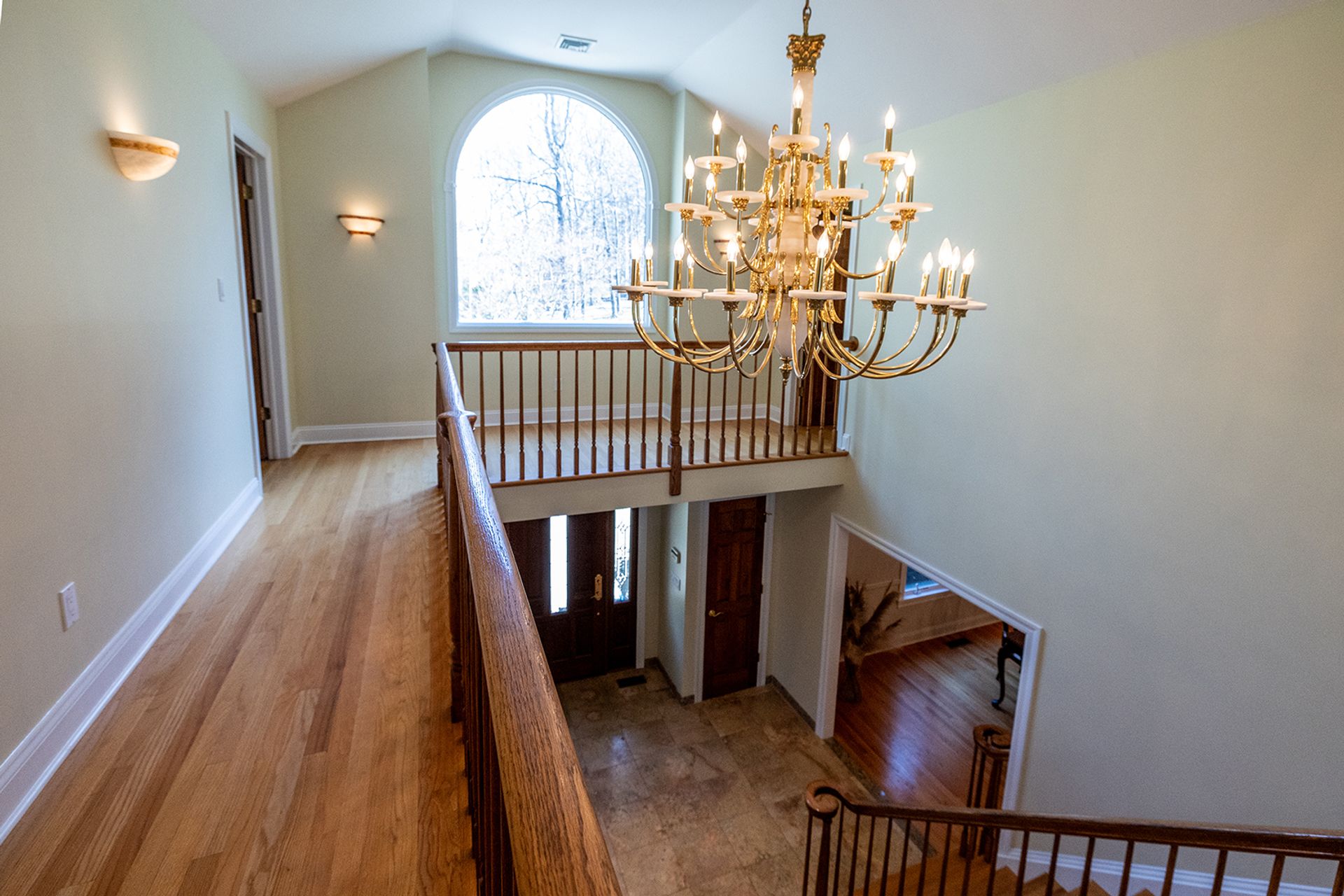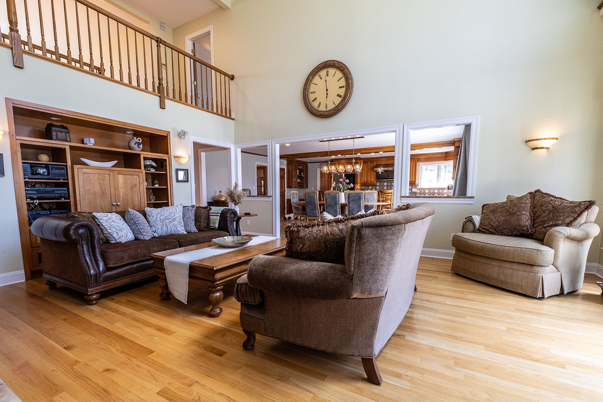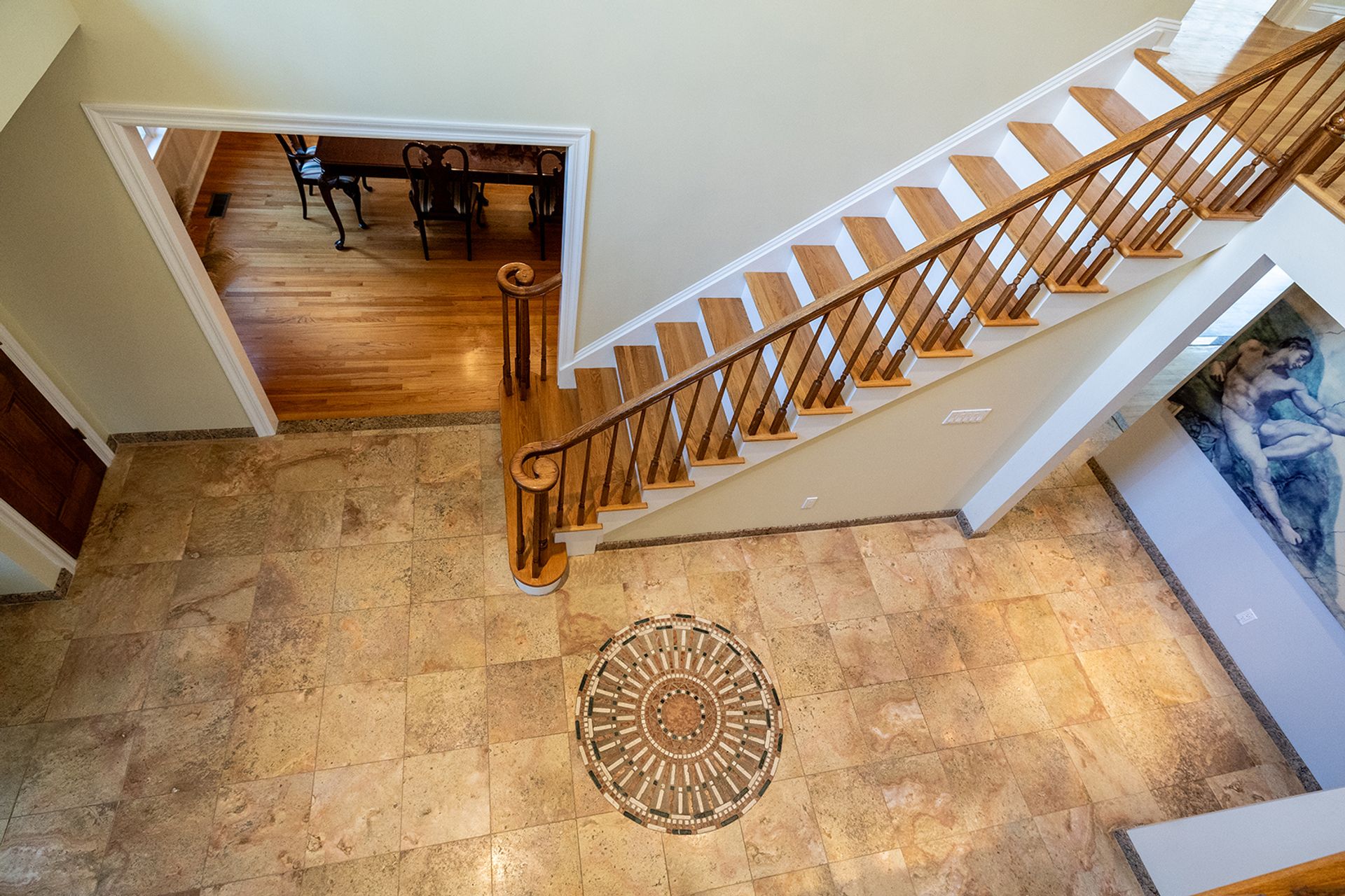 A dramatic two-story foyer with sweeping staircase and wraparound catwalk introduces the gracious interior, flanked by formal dining room and gym or living room. The oversized chef’s kitchen features a six-burner commercial-grade gas stove top and electric oven combo with warming station, expansive center island with prep sink and breakfast bar, dedicated work station, walk-in pantry, mudroom entrance, laundry area, and extensive custom cabinetry with built-ins. The adjoining family room is anchored by a wood-burning fireplace and dramatic two-story wall of windows that fills the space with natural light.