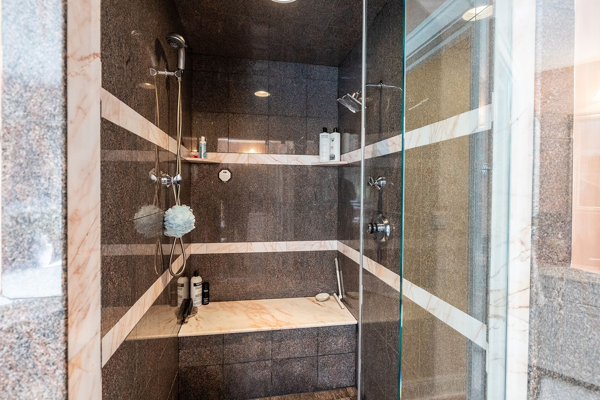 The second floor features an expansive primary suite with sitting area, tray ceiling, two walk-in closets, dressing area, private office or flex space, and spa-like bath with radiant heated floors, soaking tub, and steam shower. A private staircase offers direct kitchen access. Three additional bedrooms include one en-suite with walk-in closet and custom built-ins, plus two bedrooms connected by a shared bath with separate water closet.